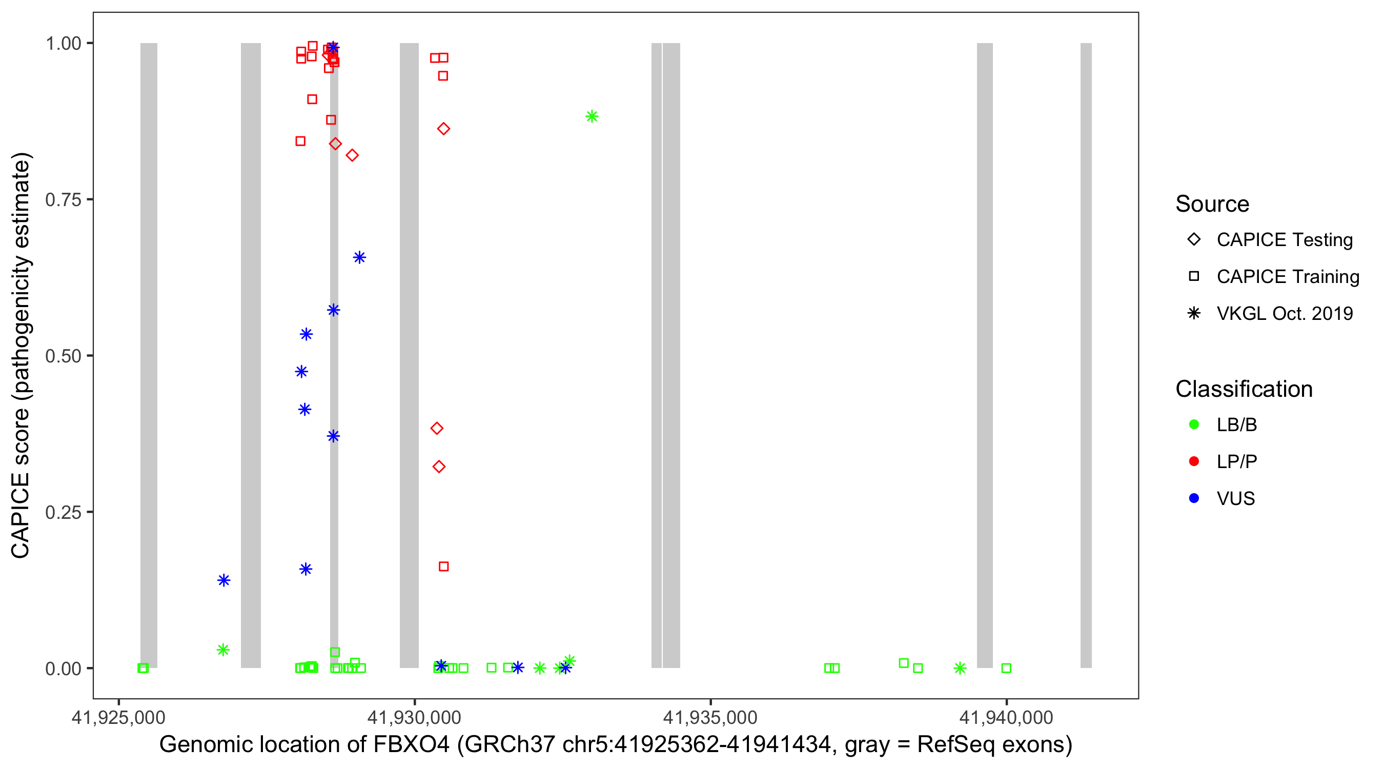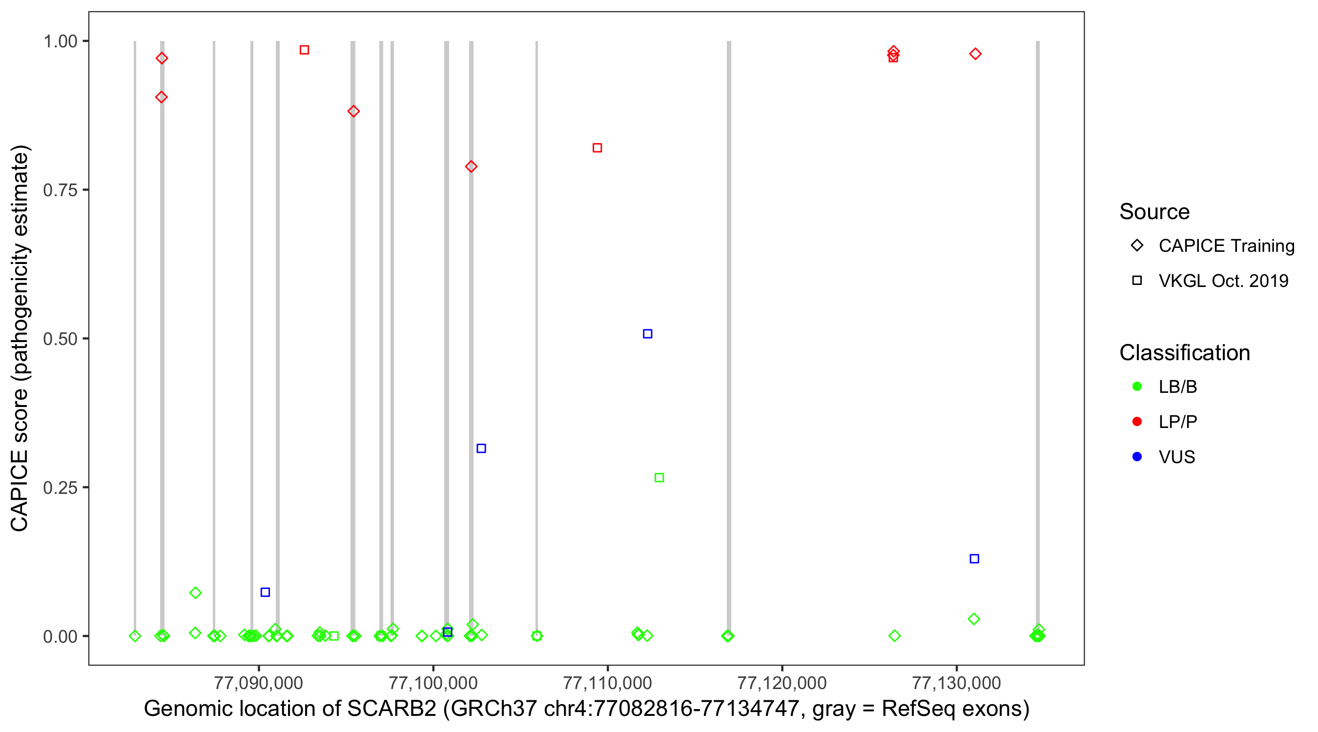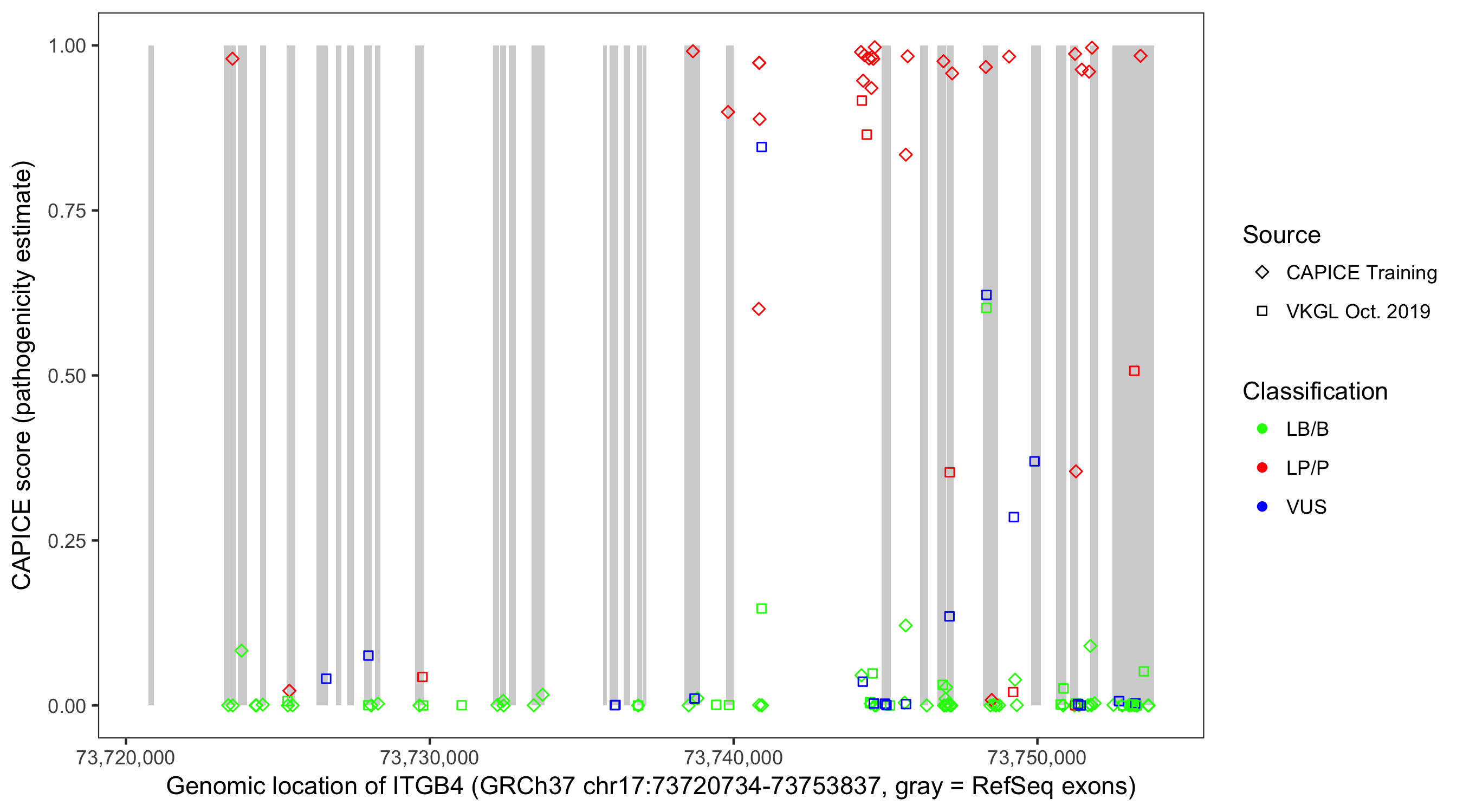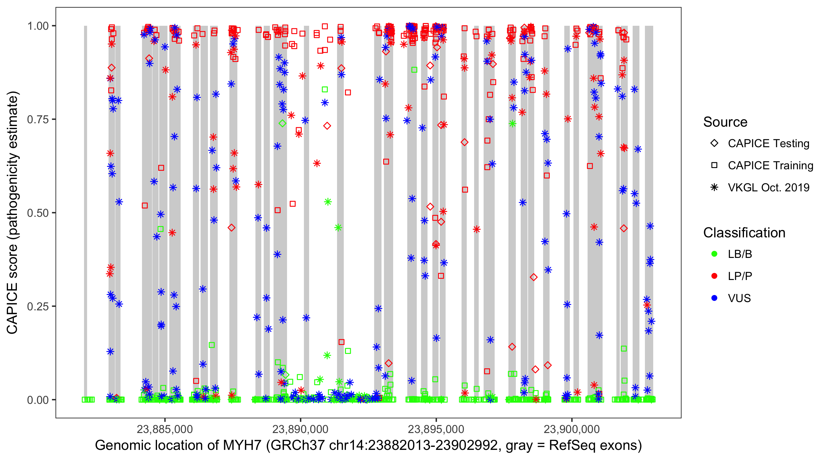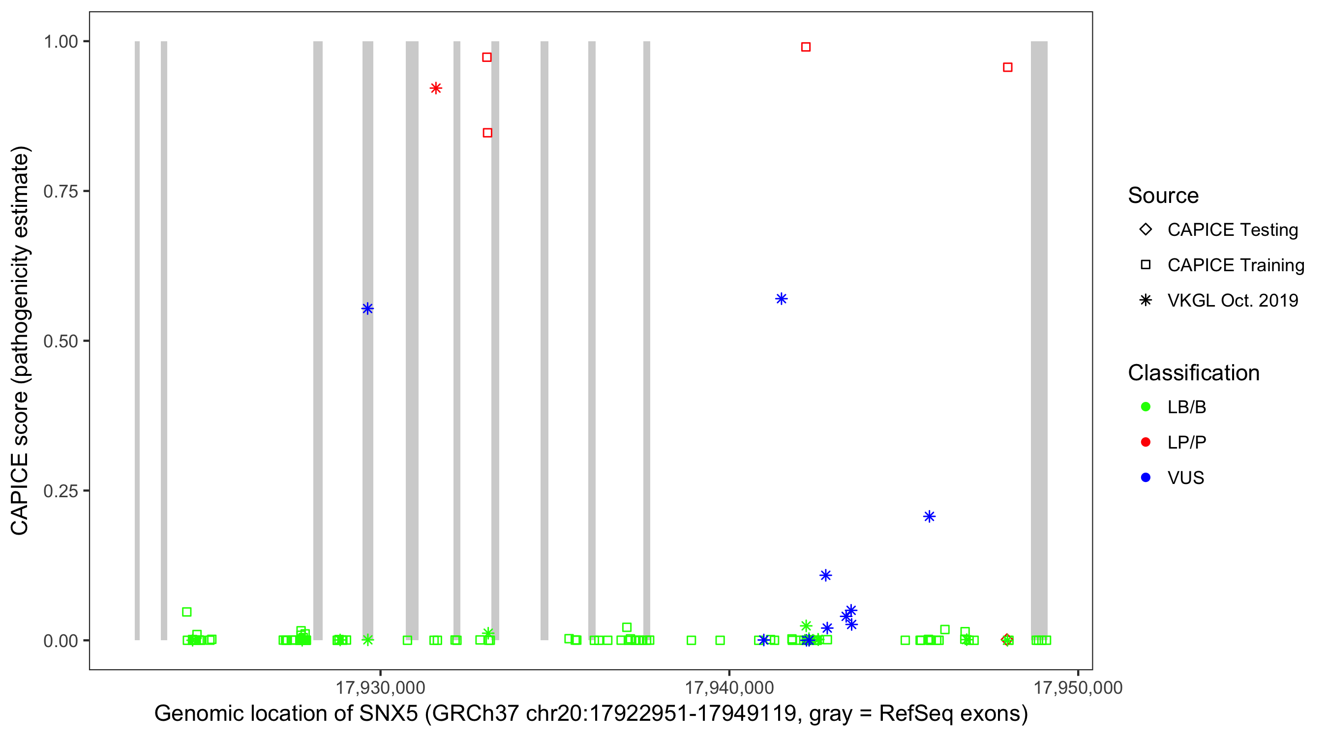 Shown are CAPICE train/test variants plus VKGL Oct 2019.