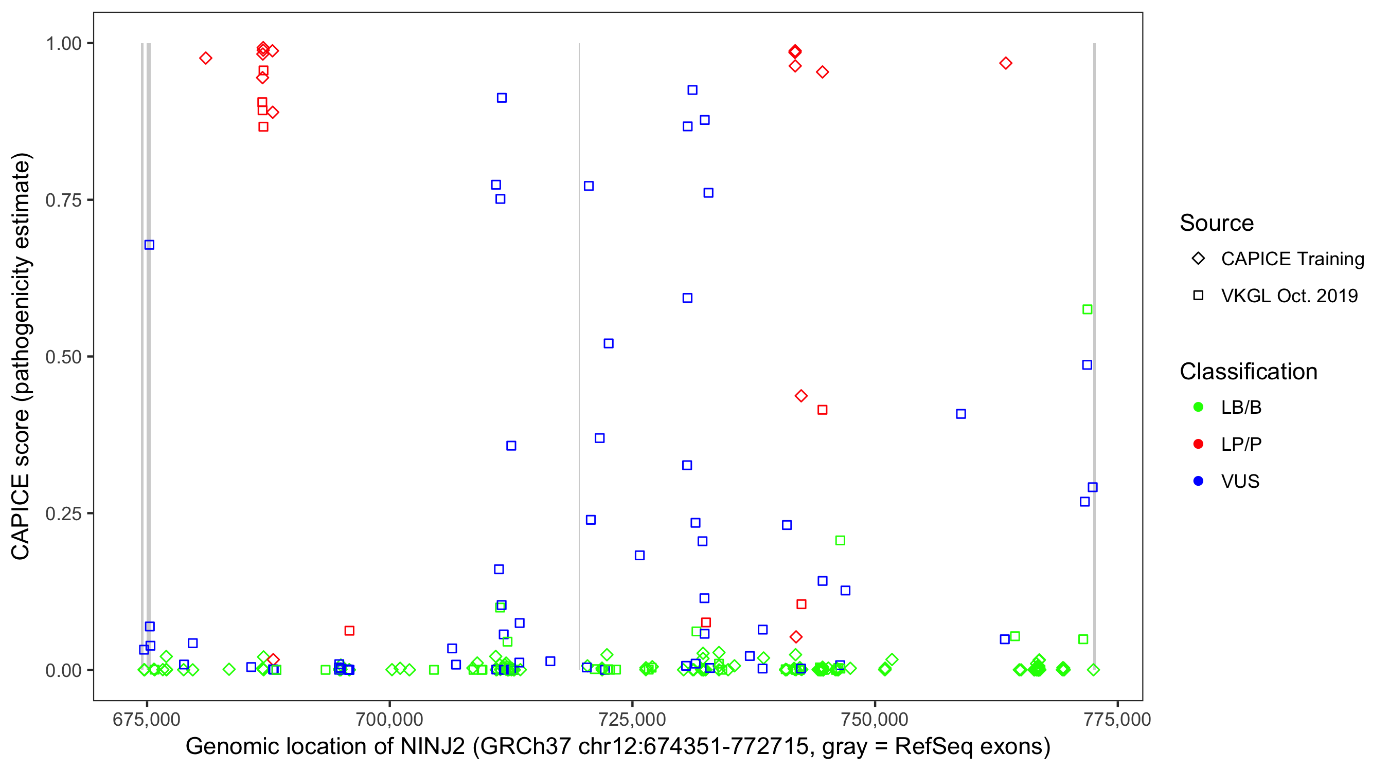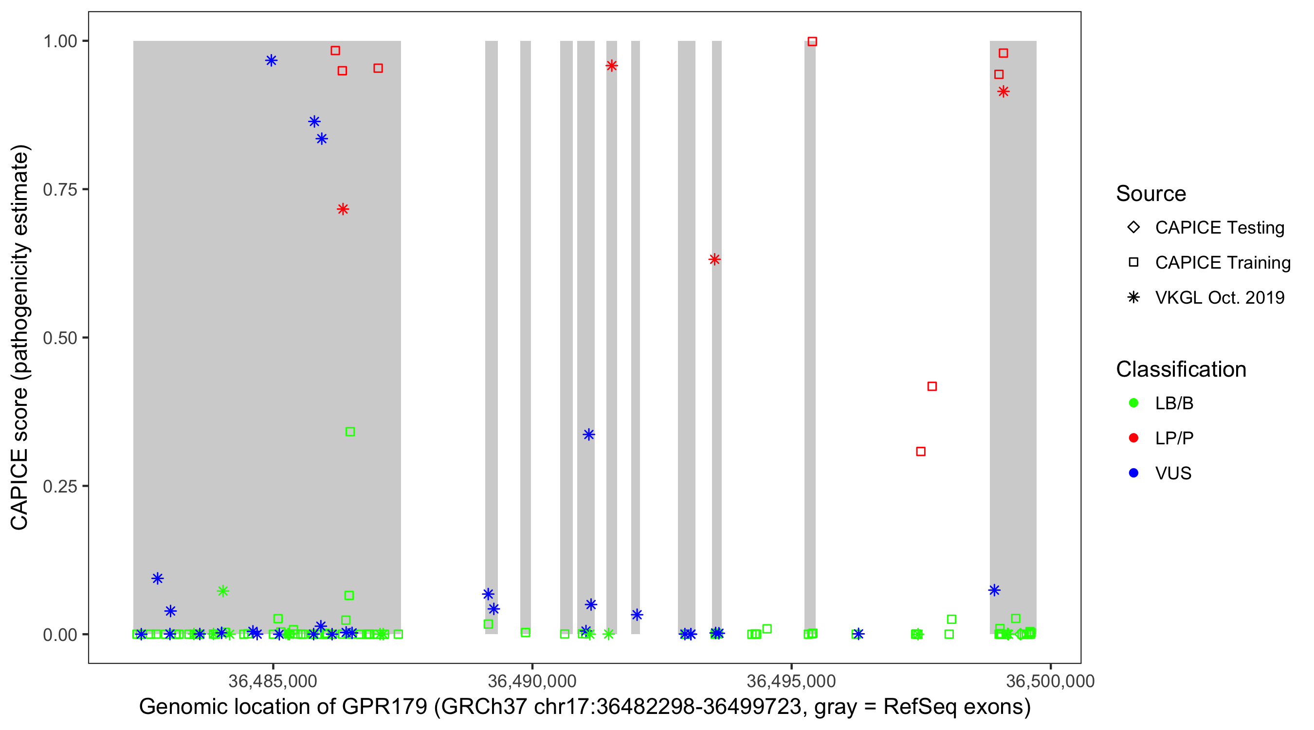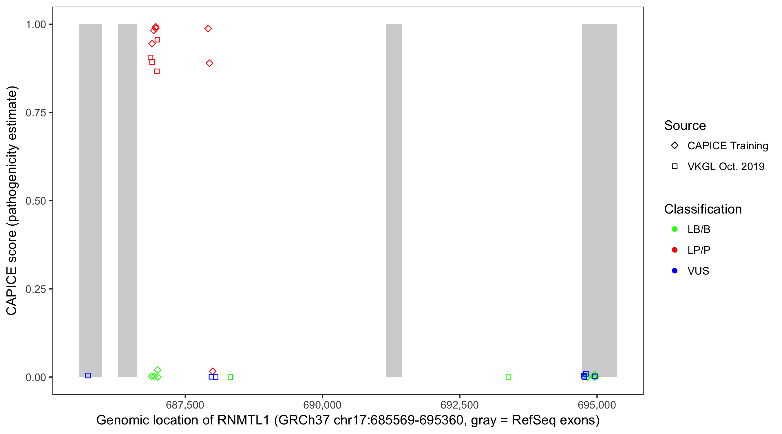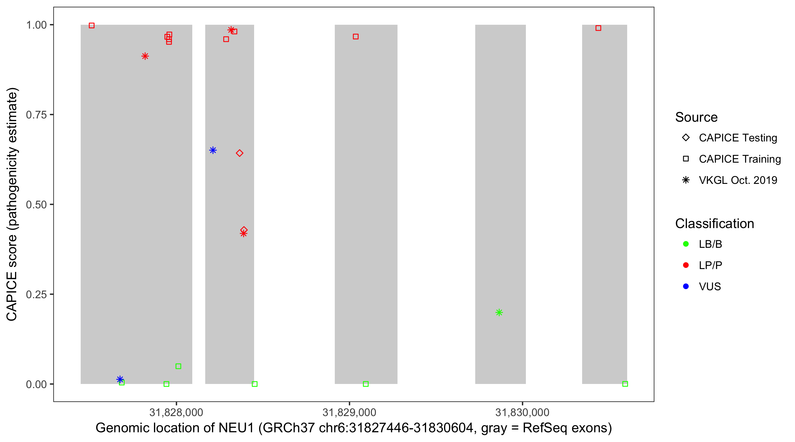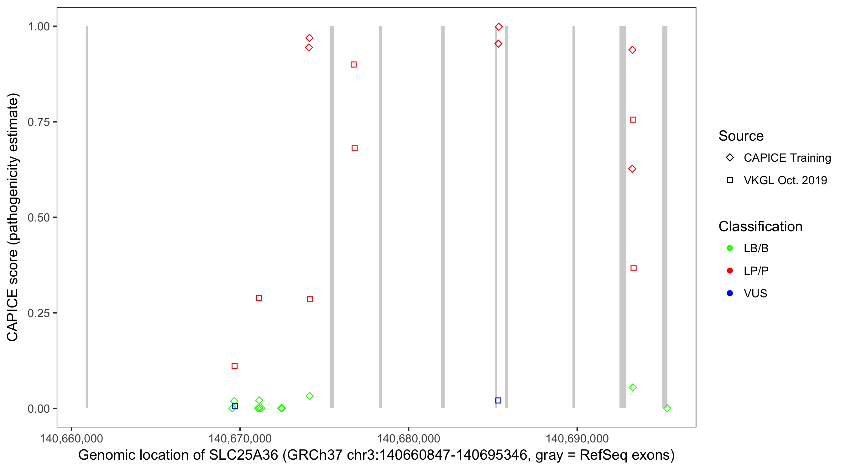 Shown are CAPICE train/test variants plus VKGL Oct 2019.