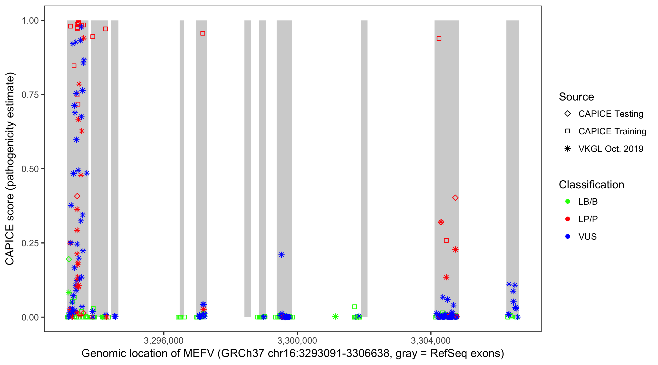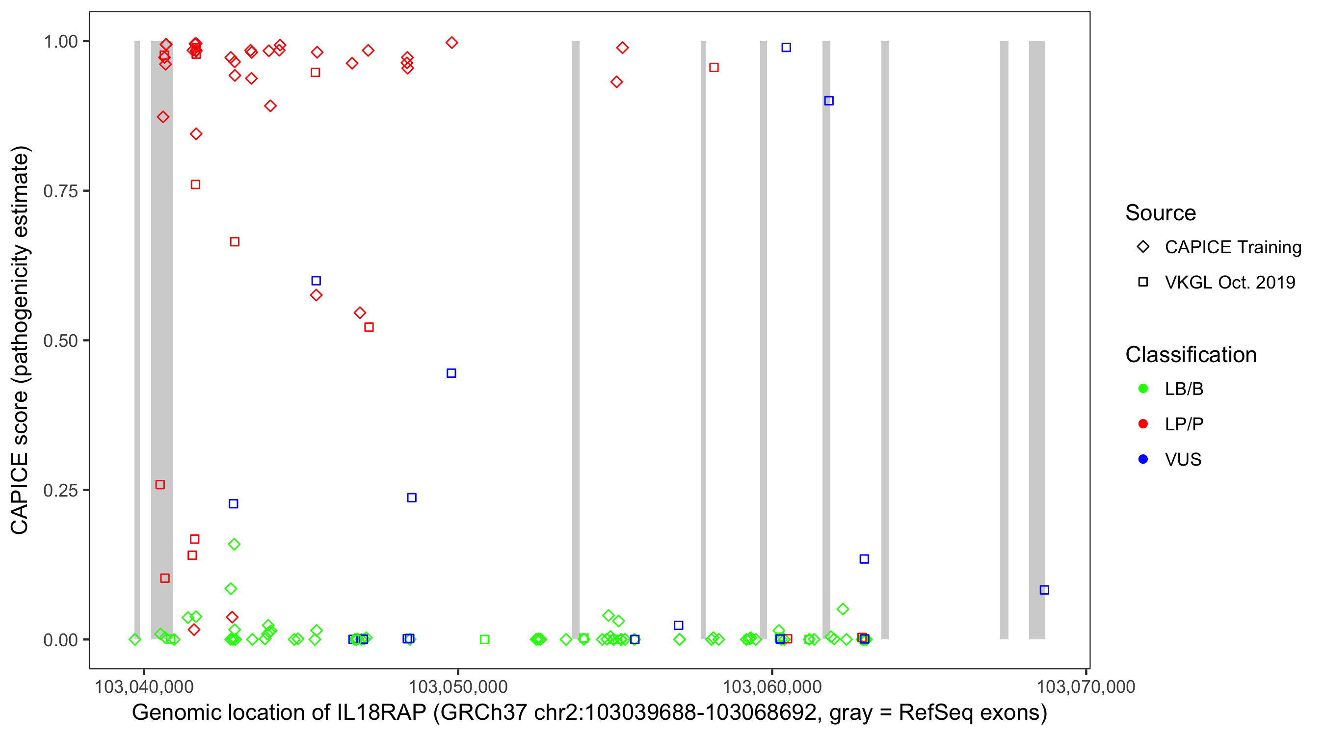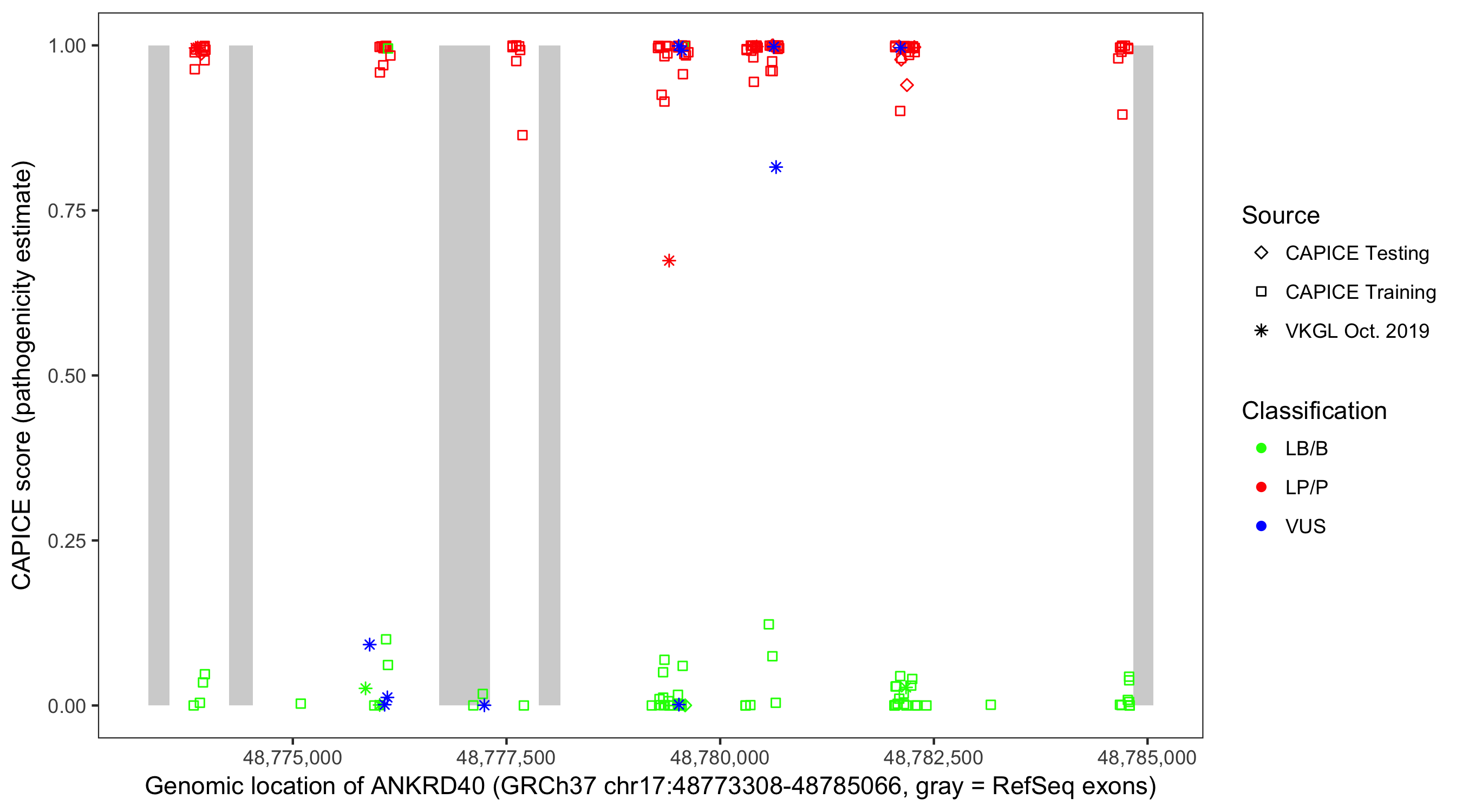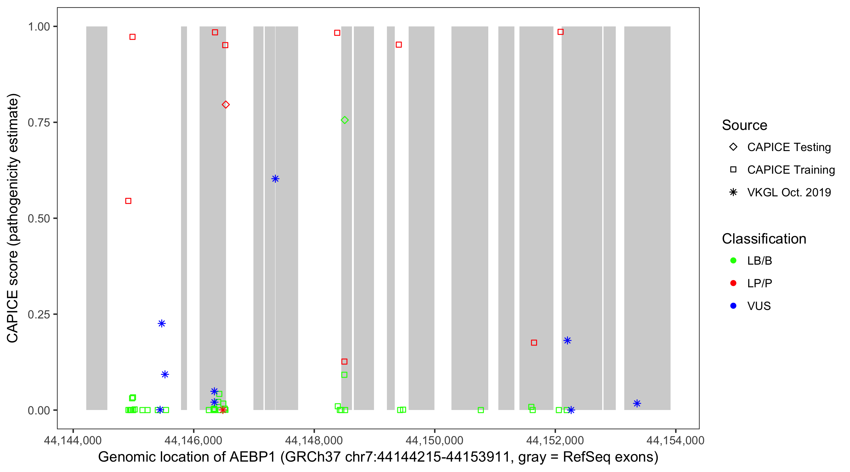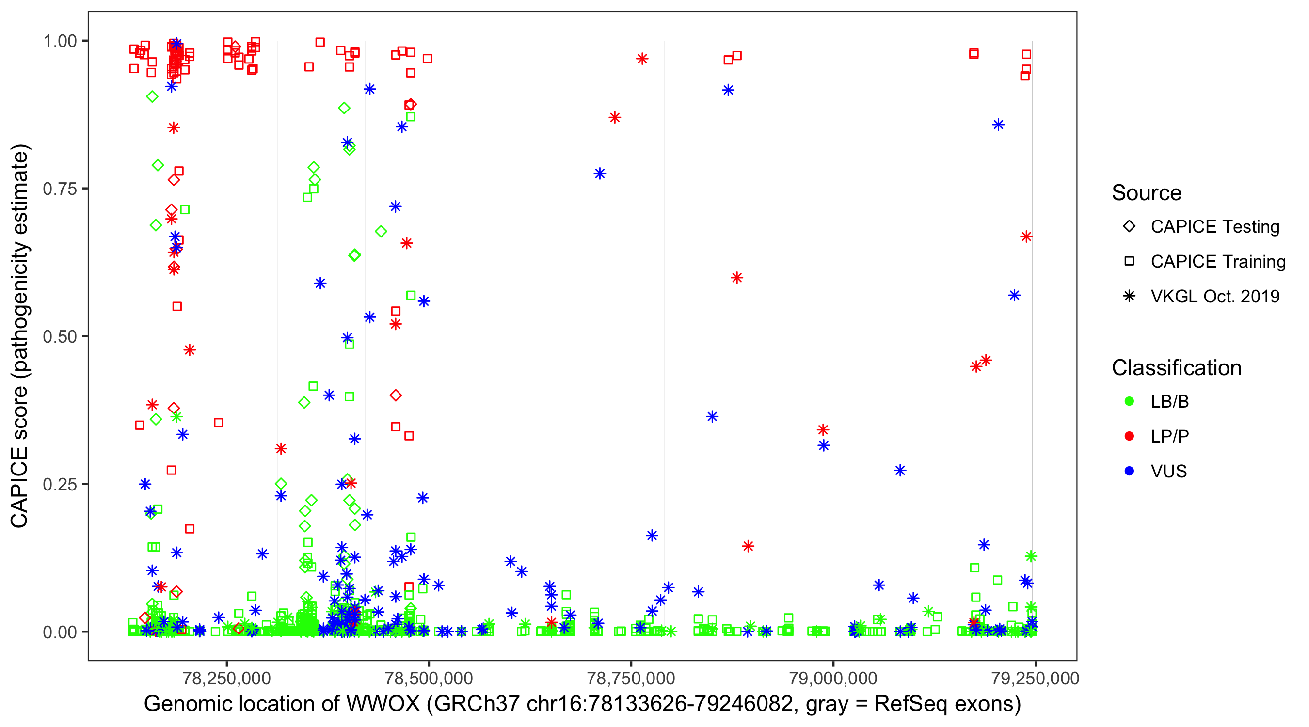 Shown are CAPICE train/test variants plus VKGL Oct 2019.