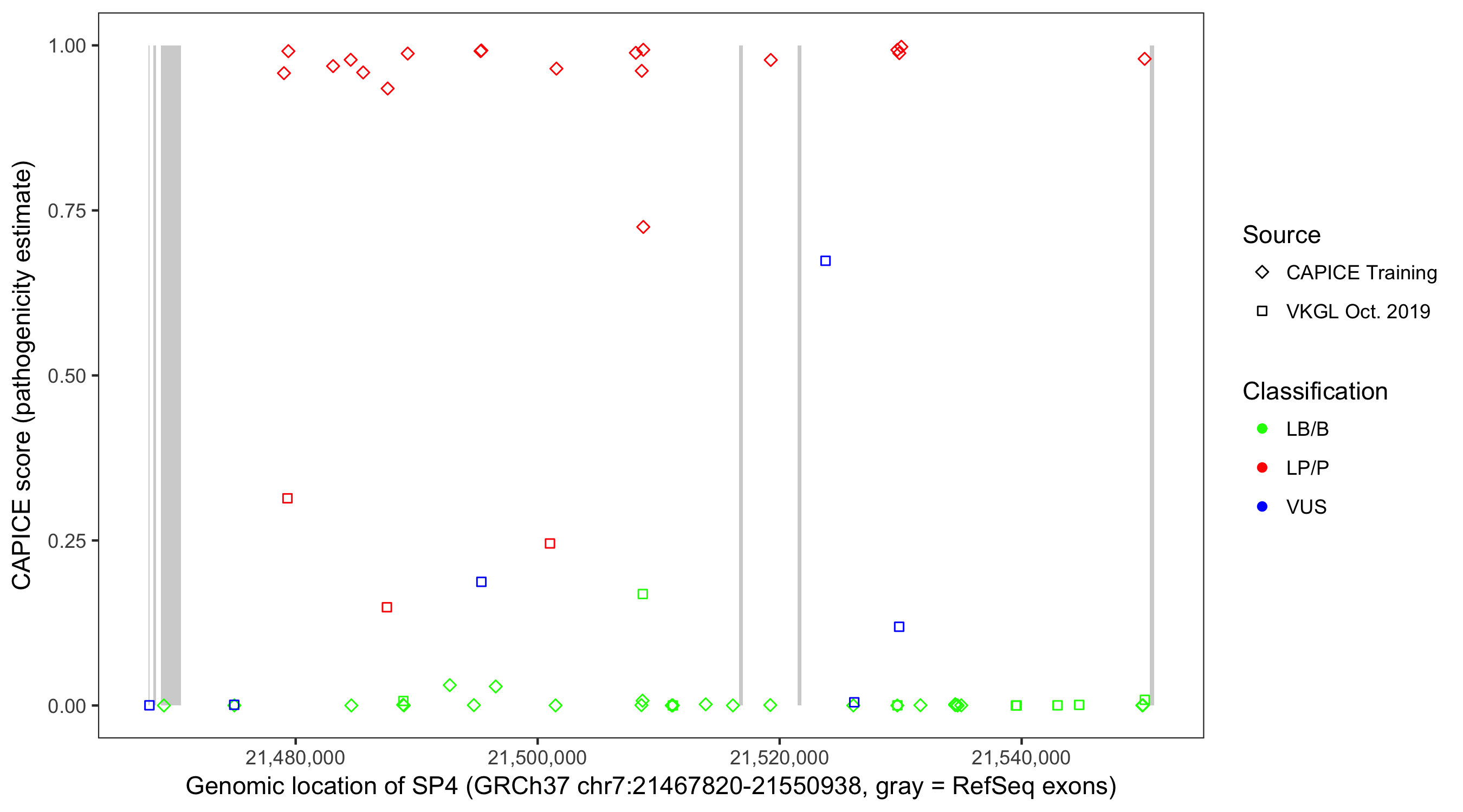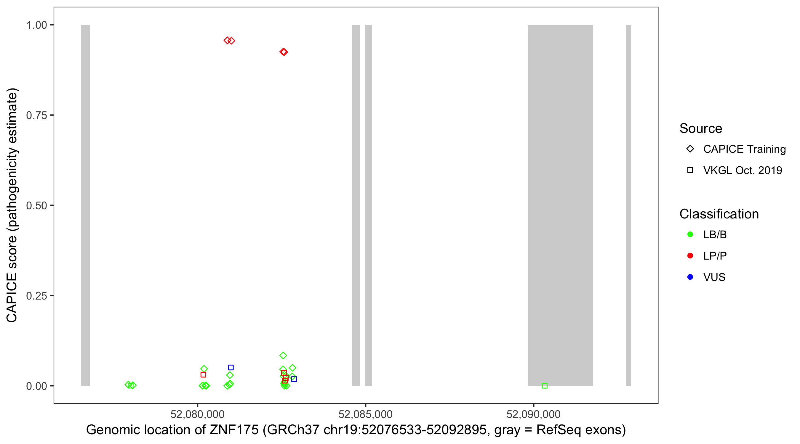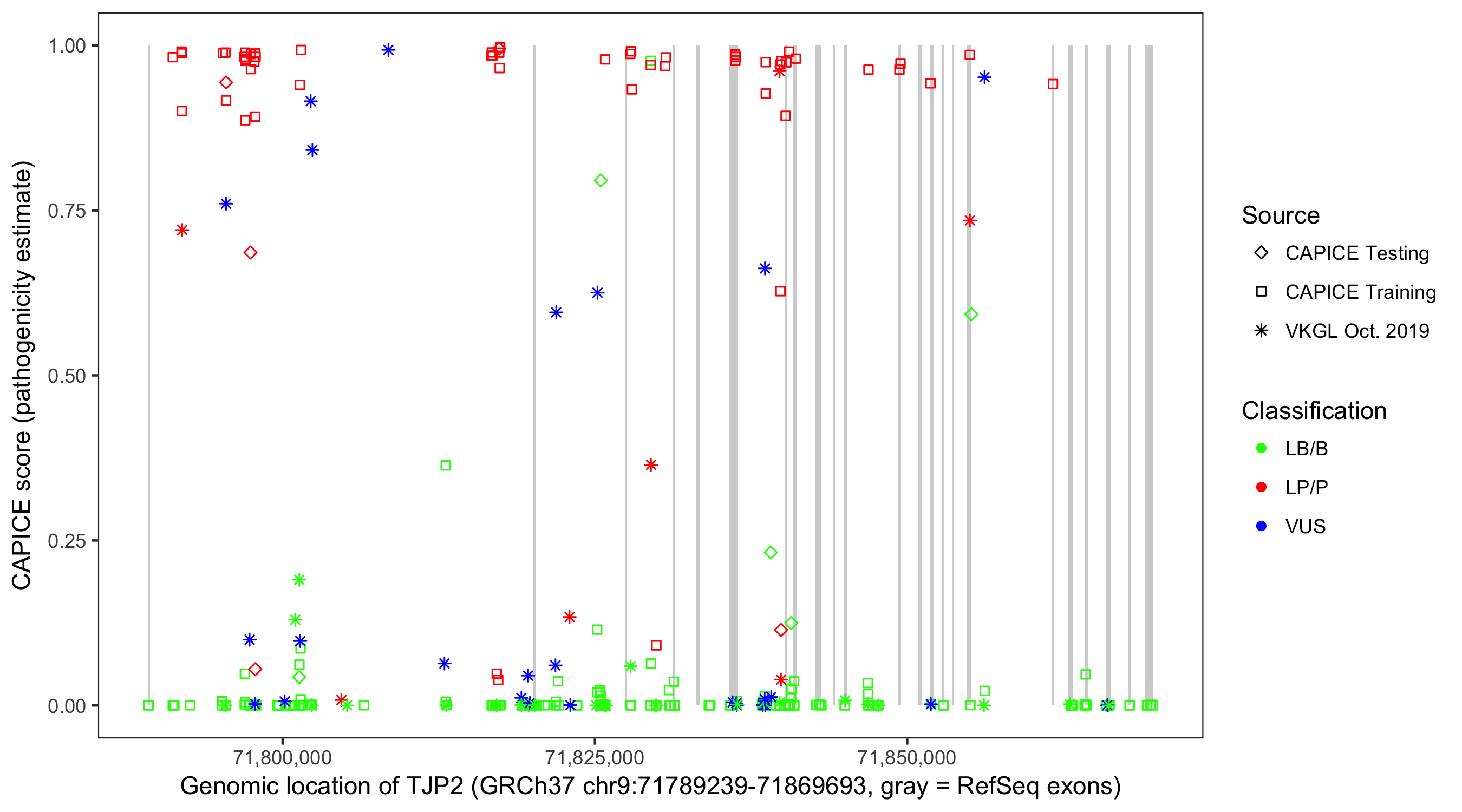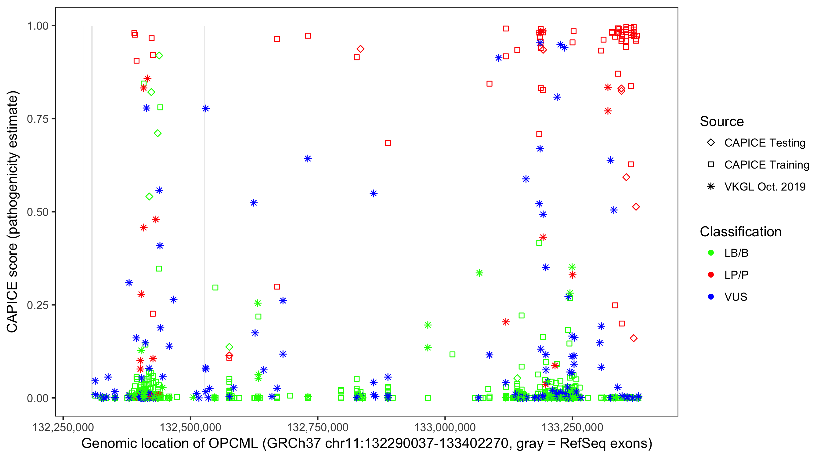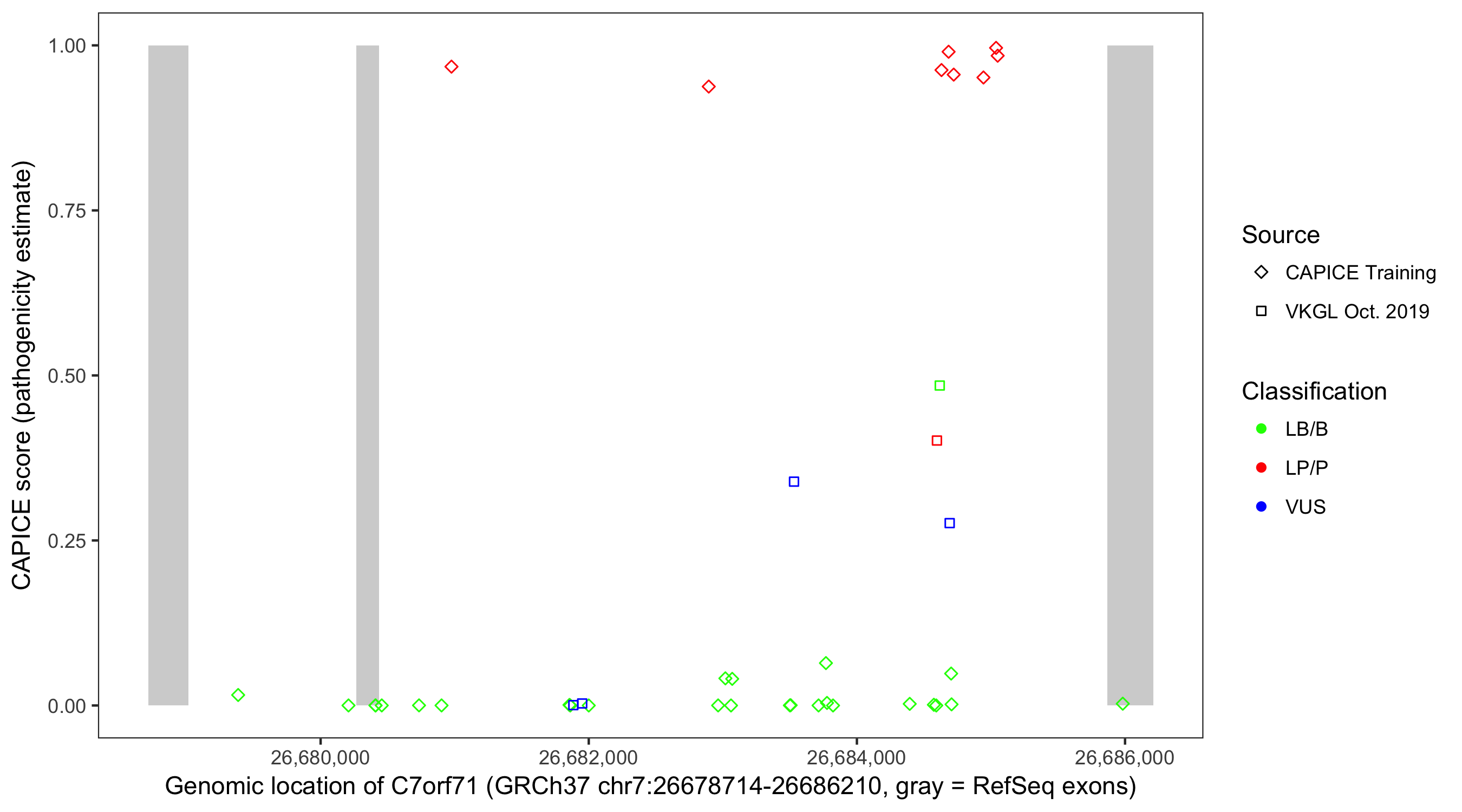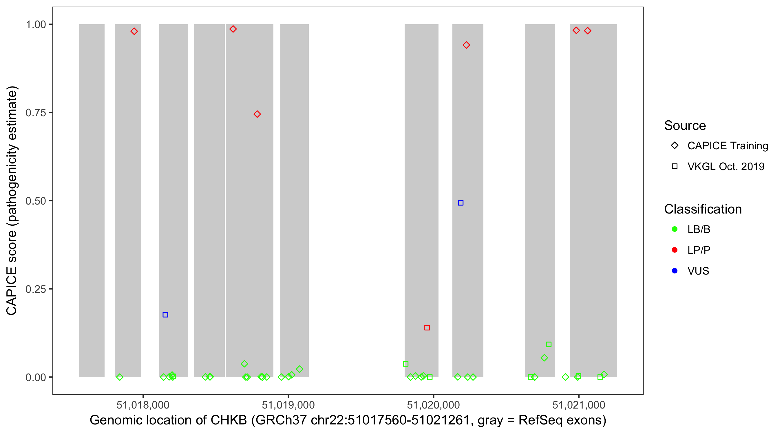 Shown are CAPICE train/test variants plus VKGL Oct 2019.
