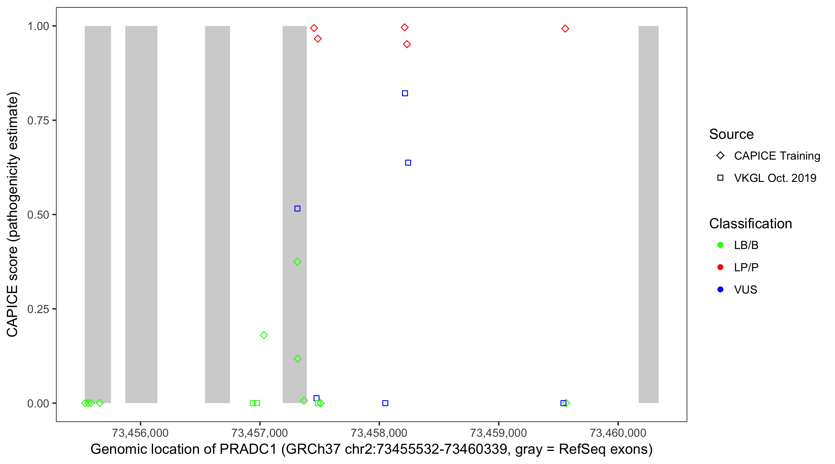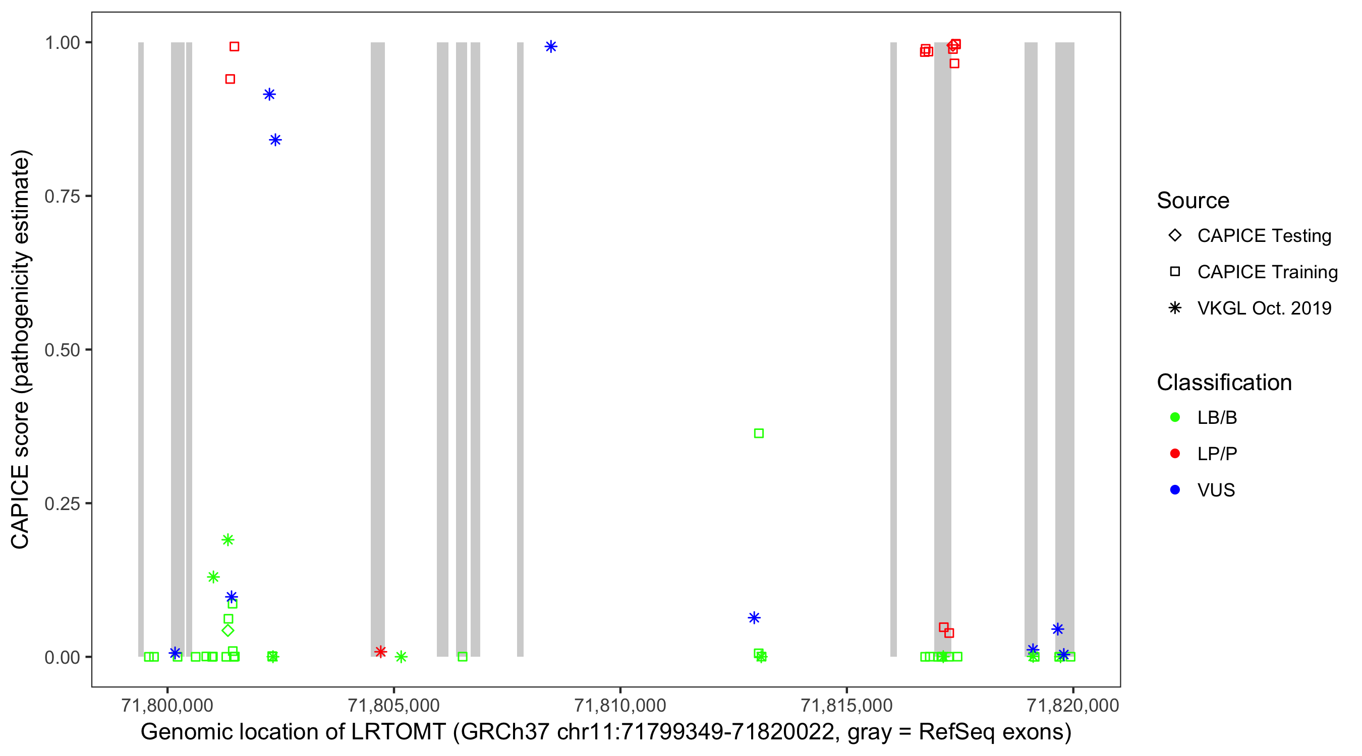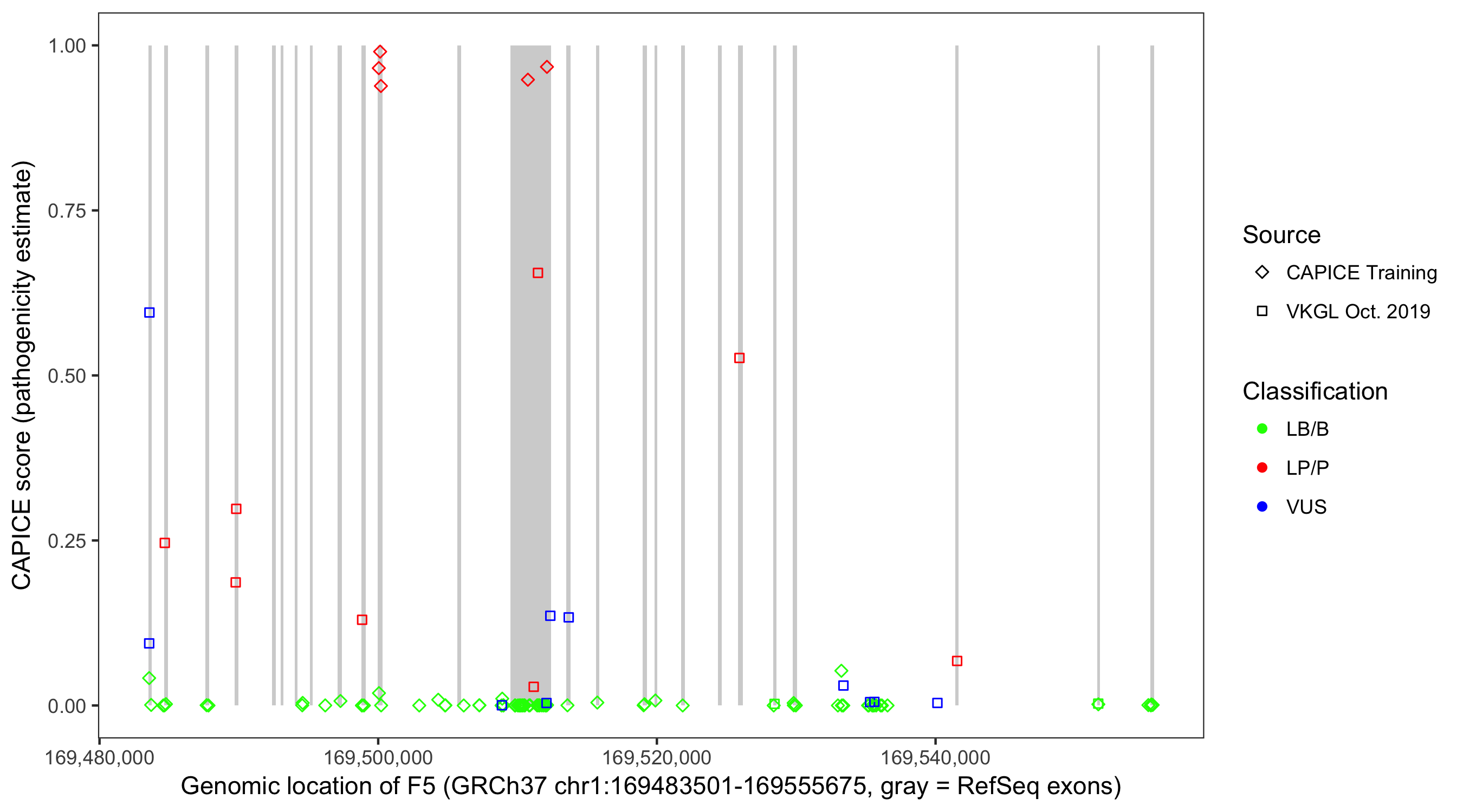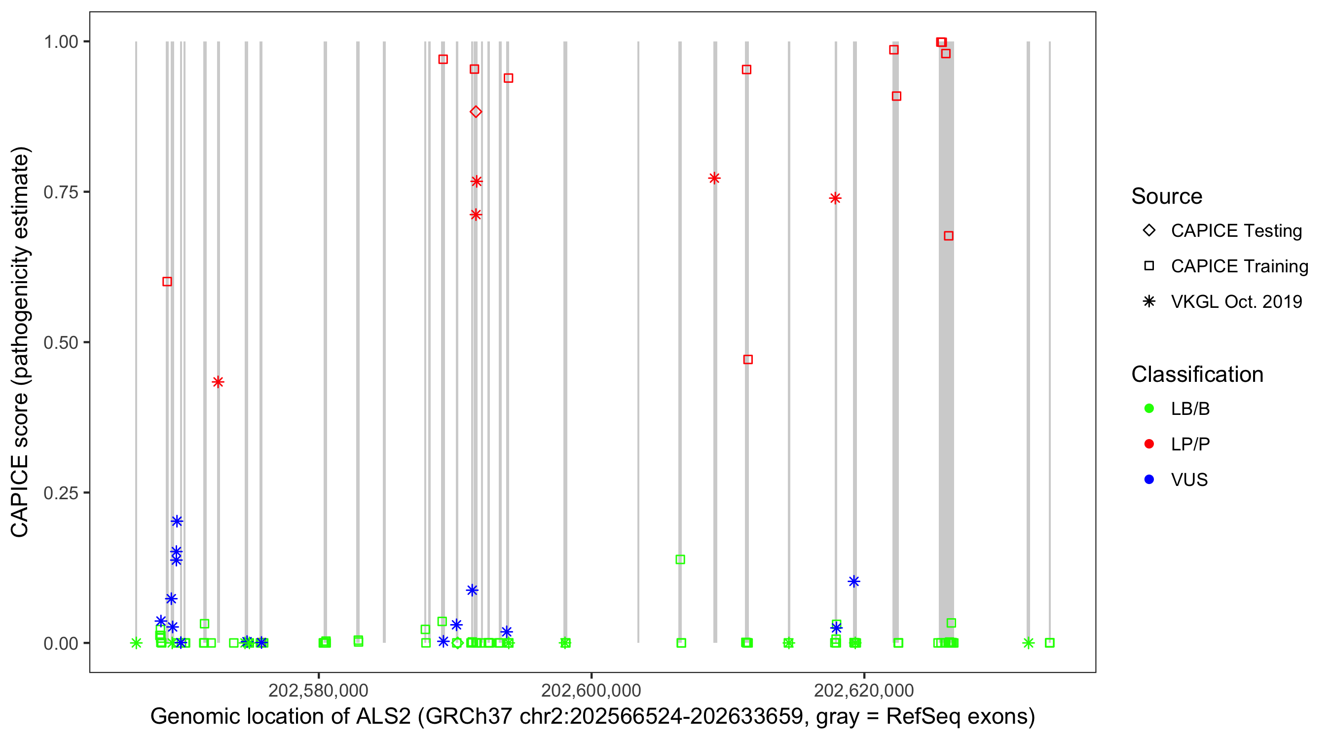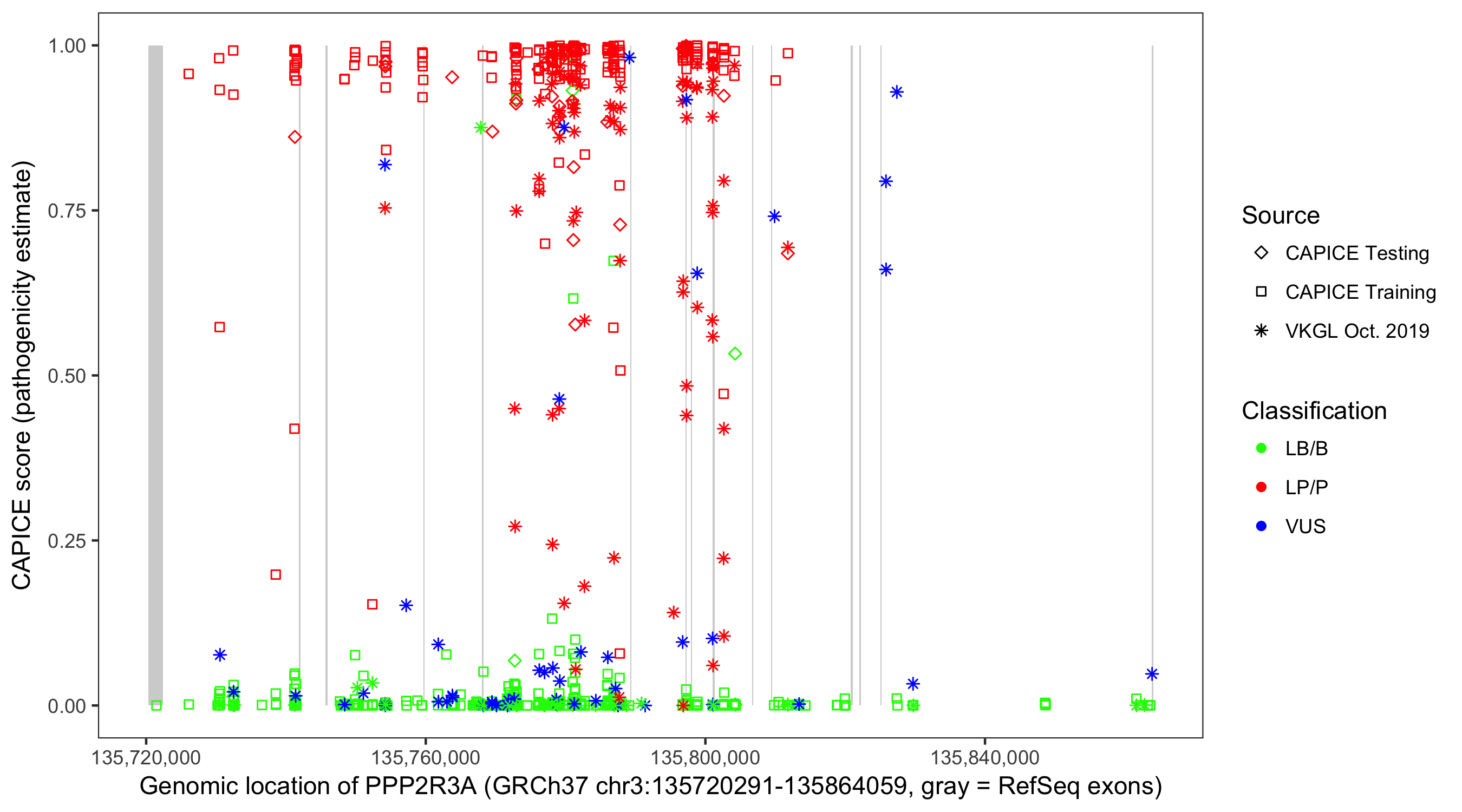 Shown are CAPICE train/test variants plus VKGL Oct 2019.