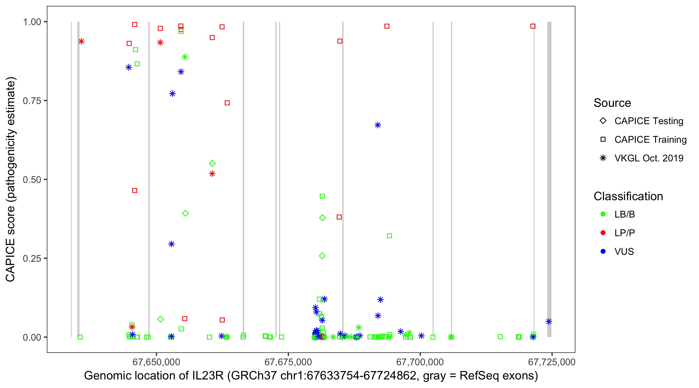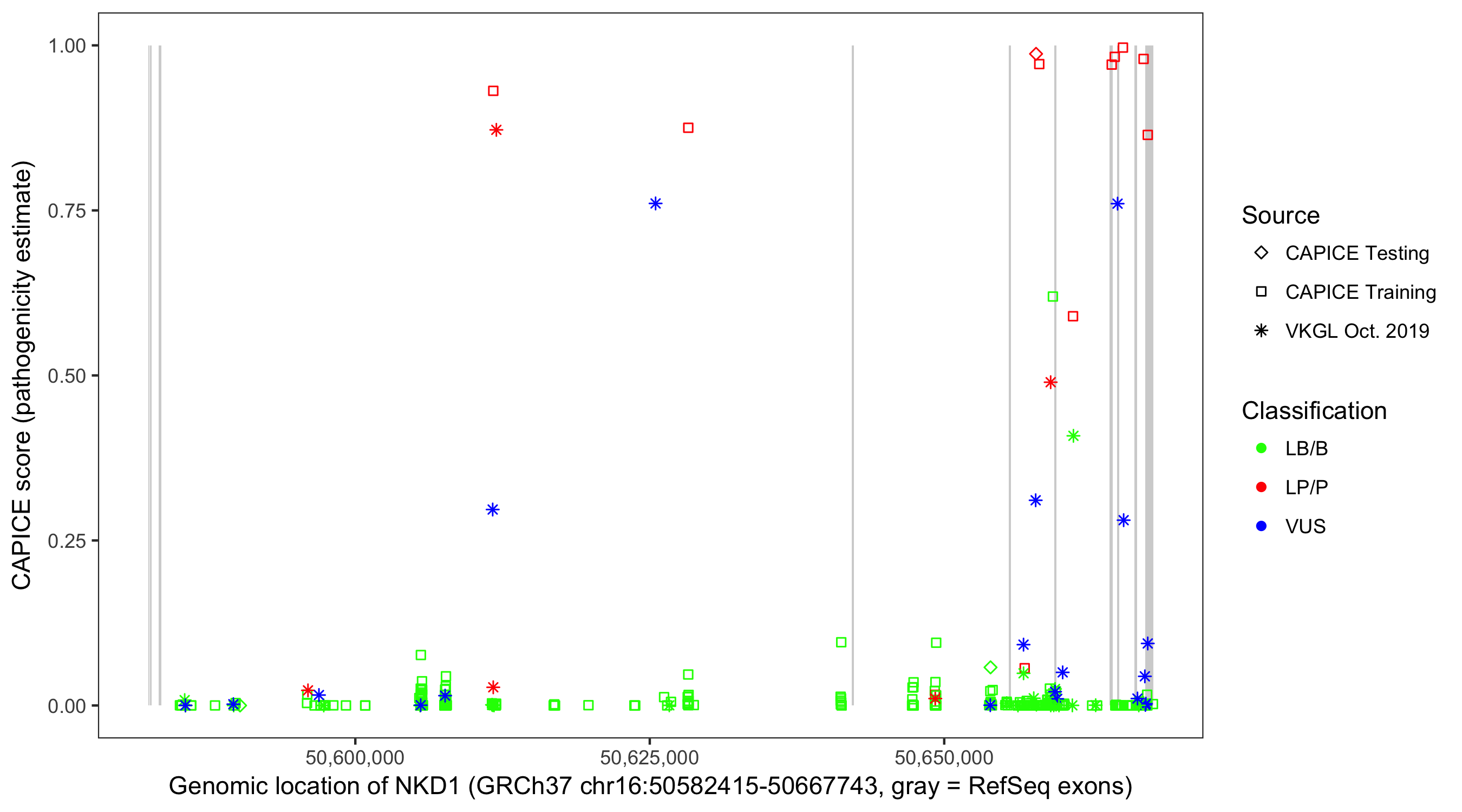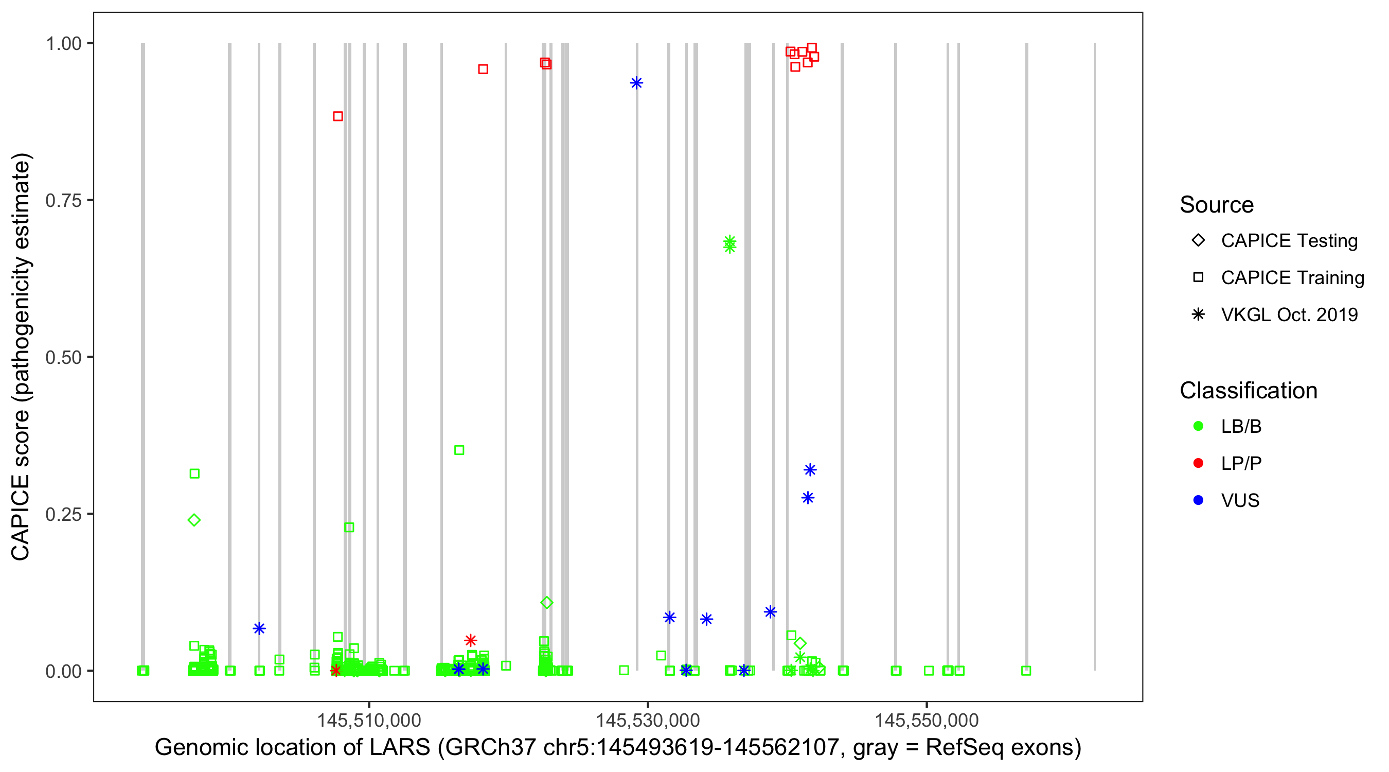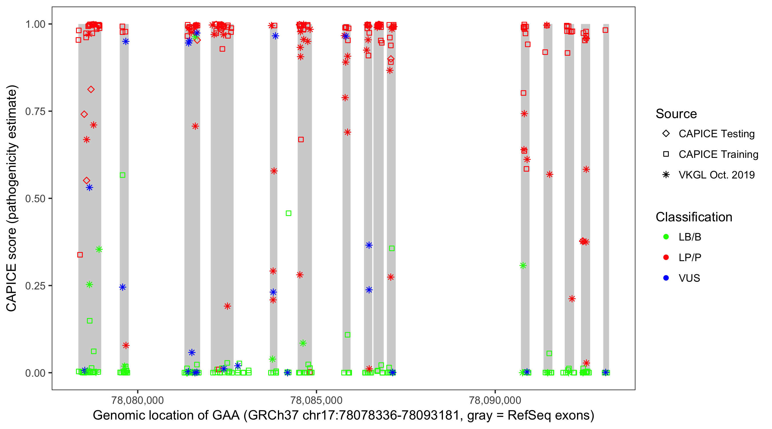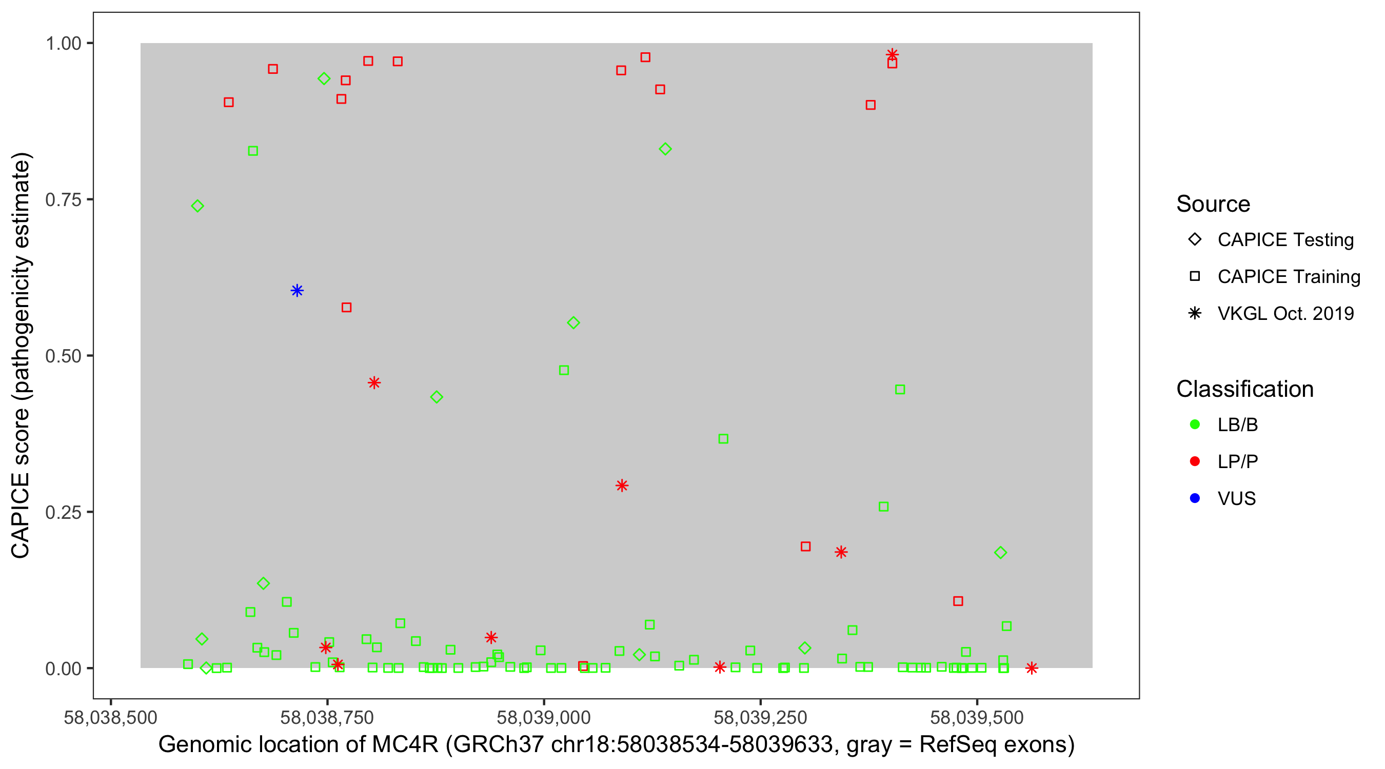 Shown are CAPICE train/test variants plus VKGL Oct 2019.