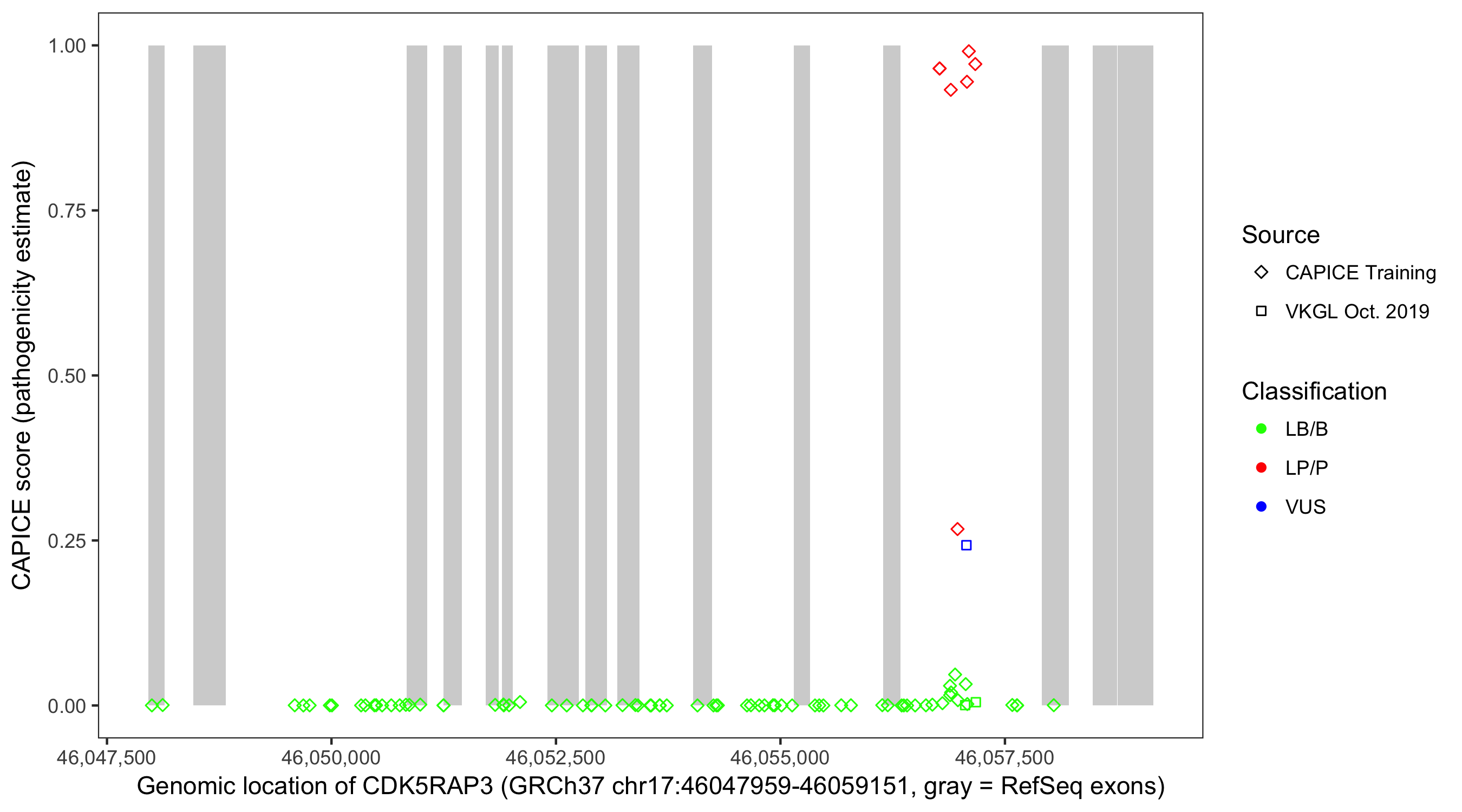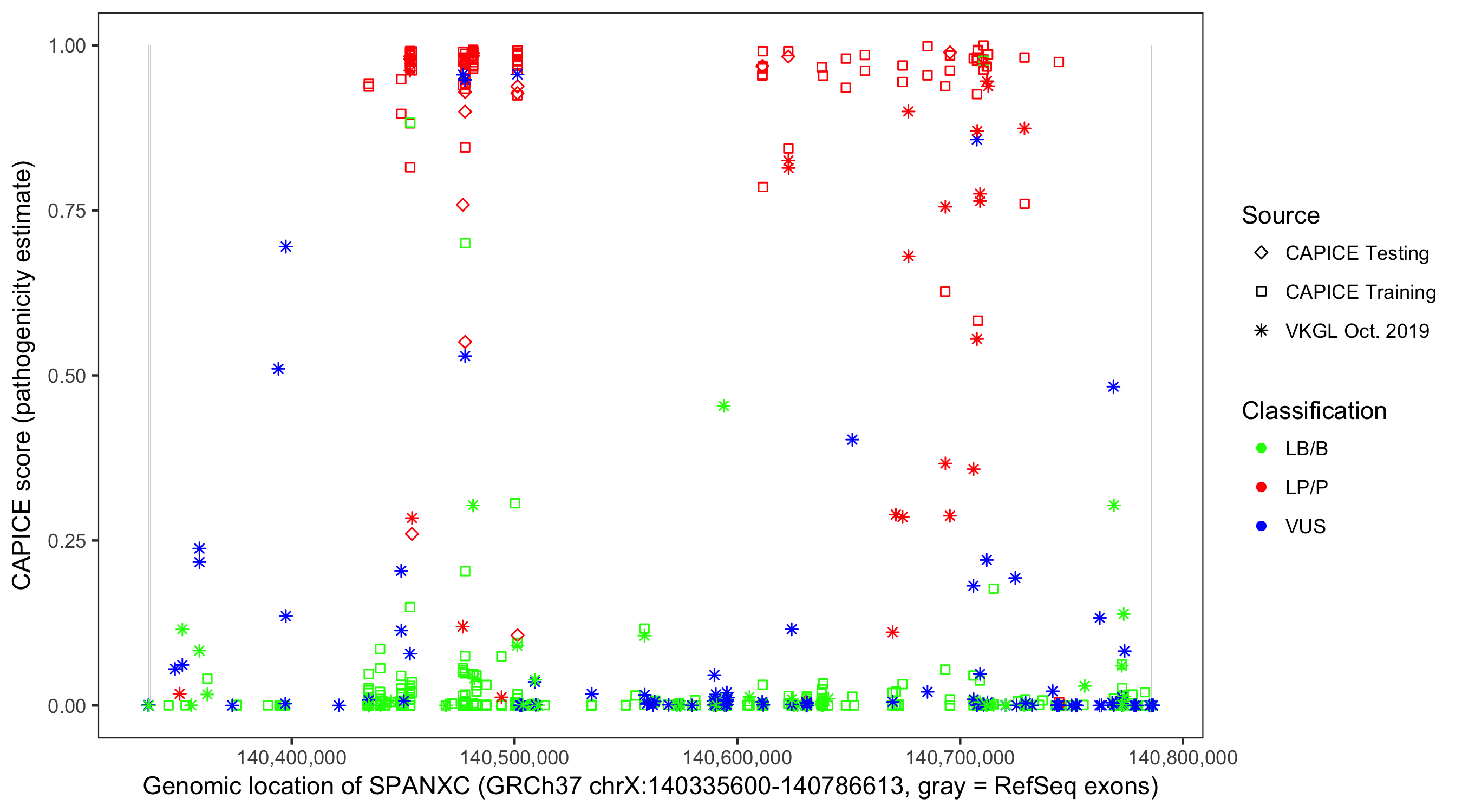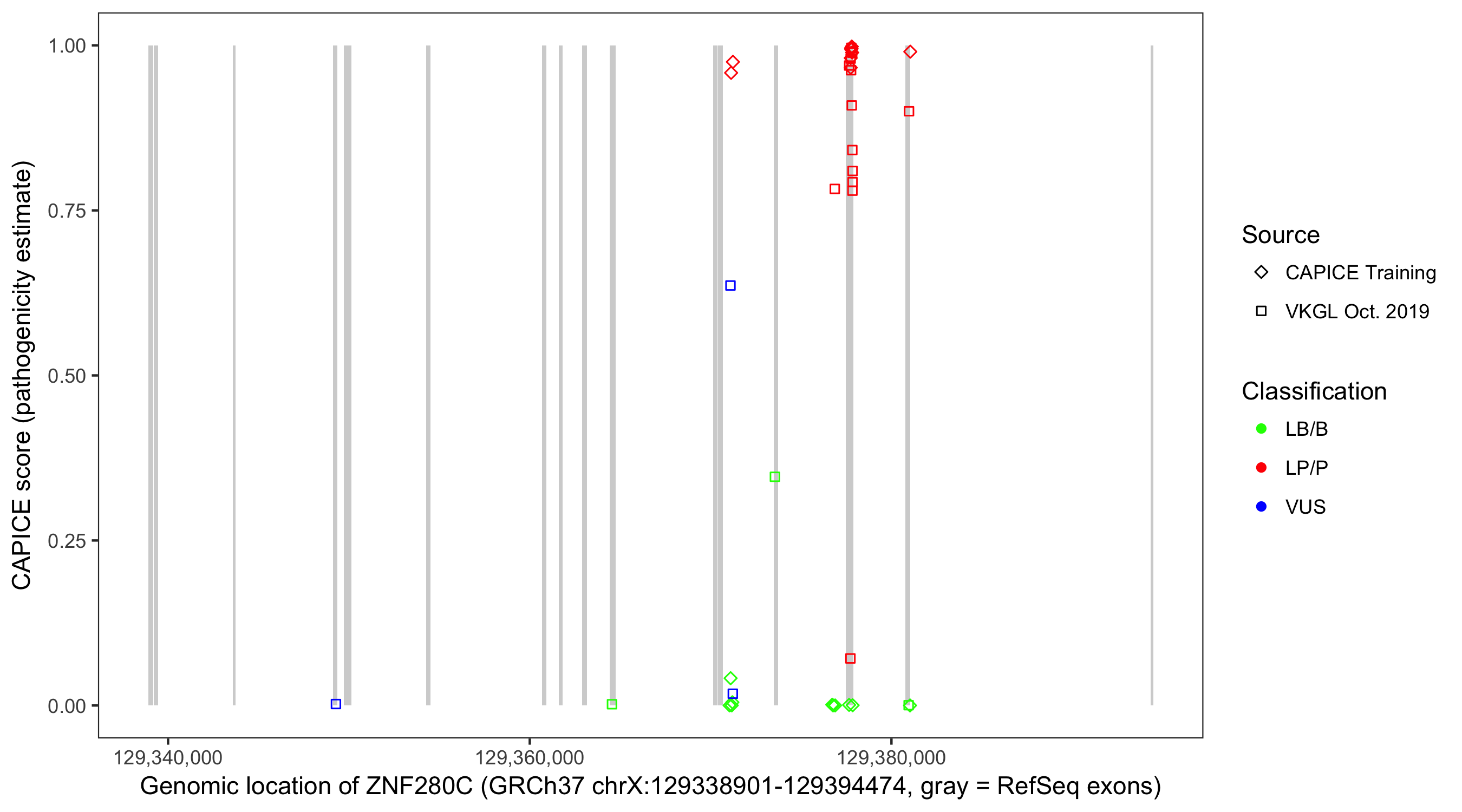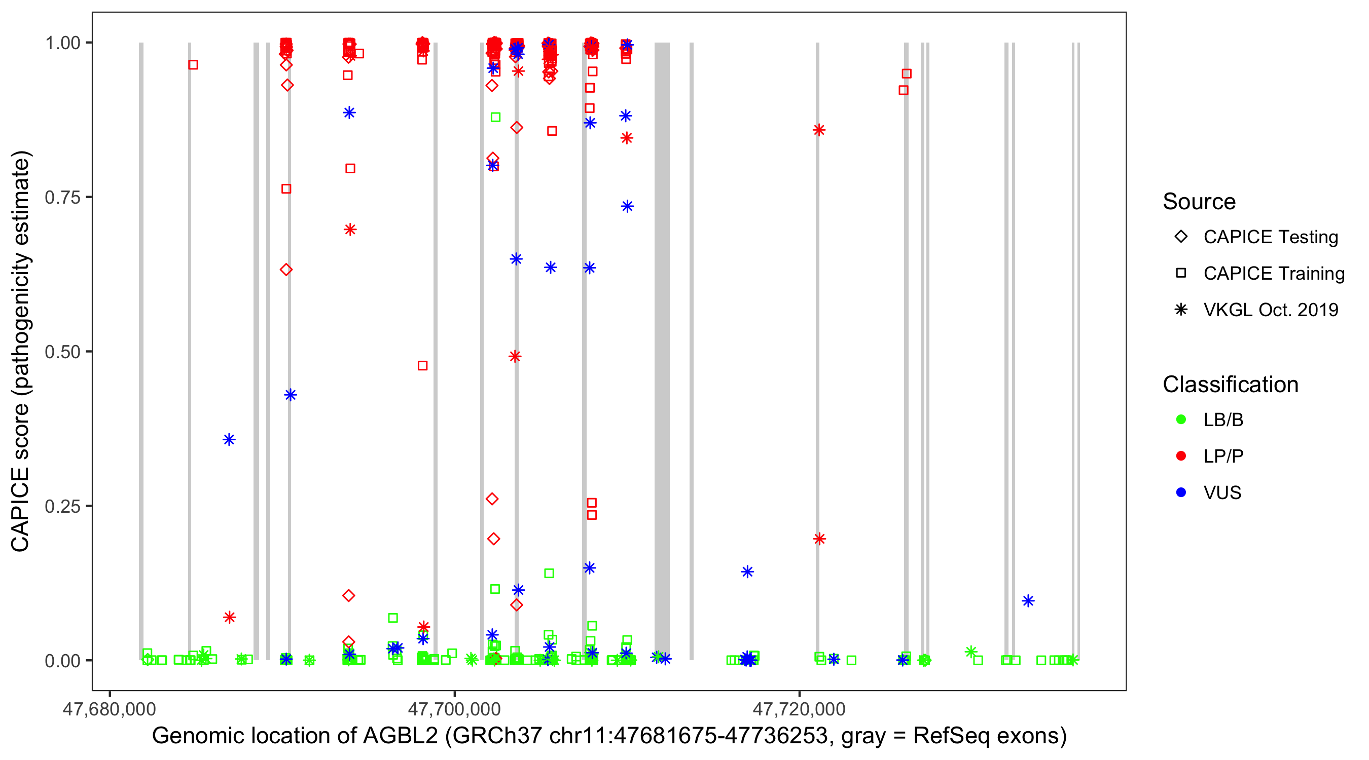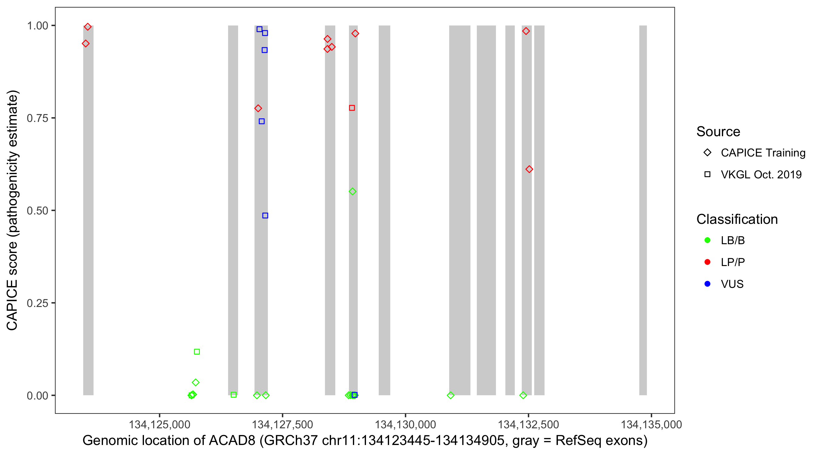 Shown are CAPICE train/test variants plus VKGL Oct 2019.