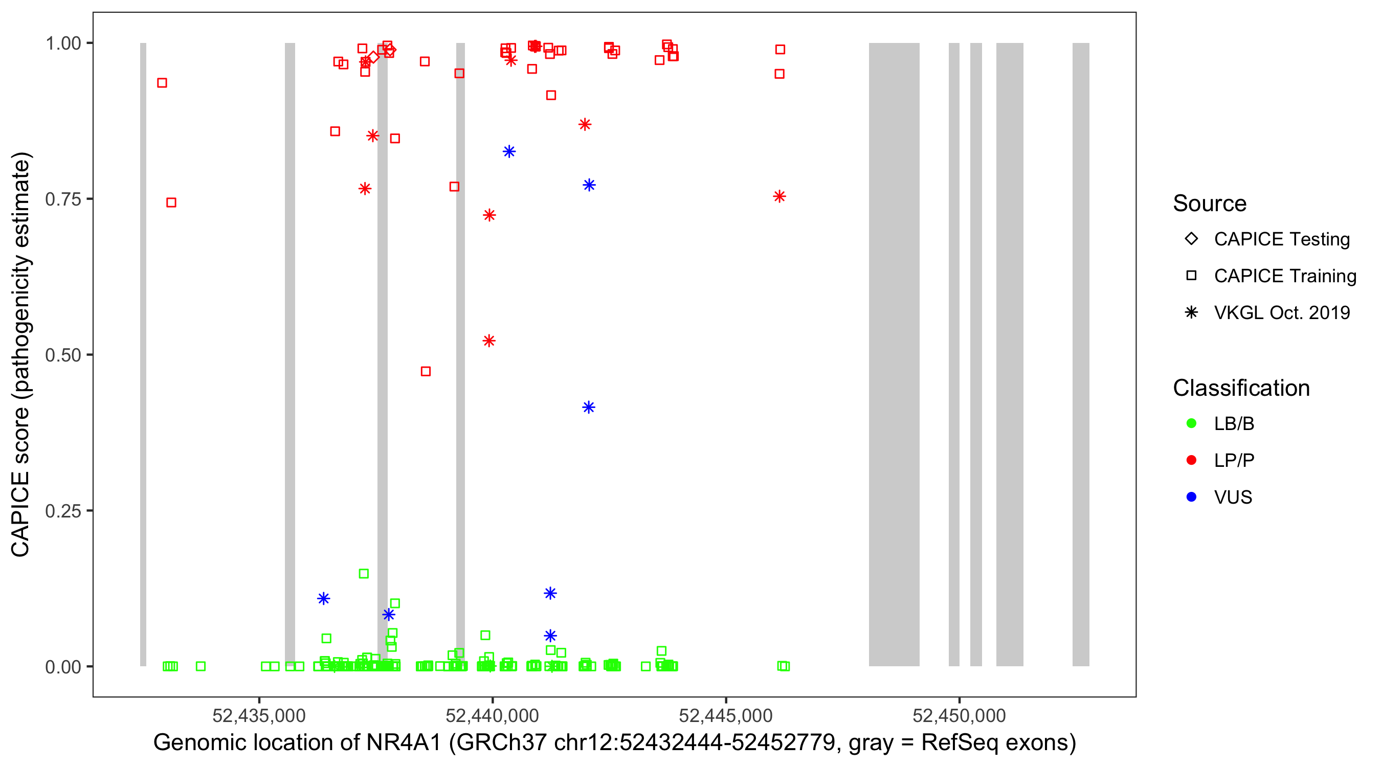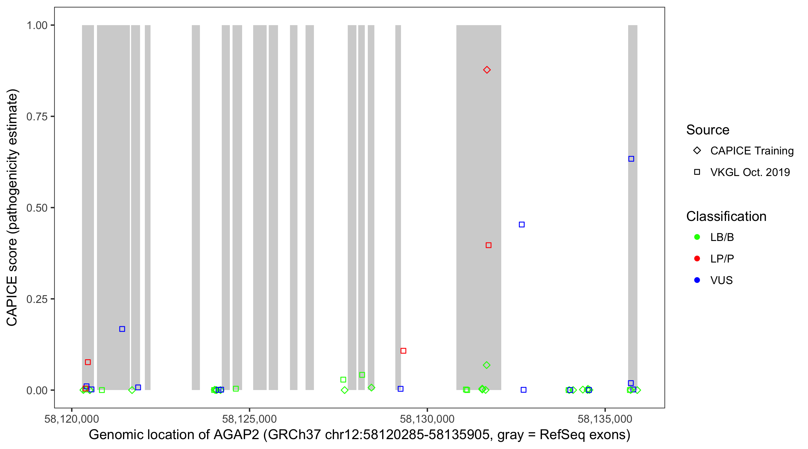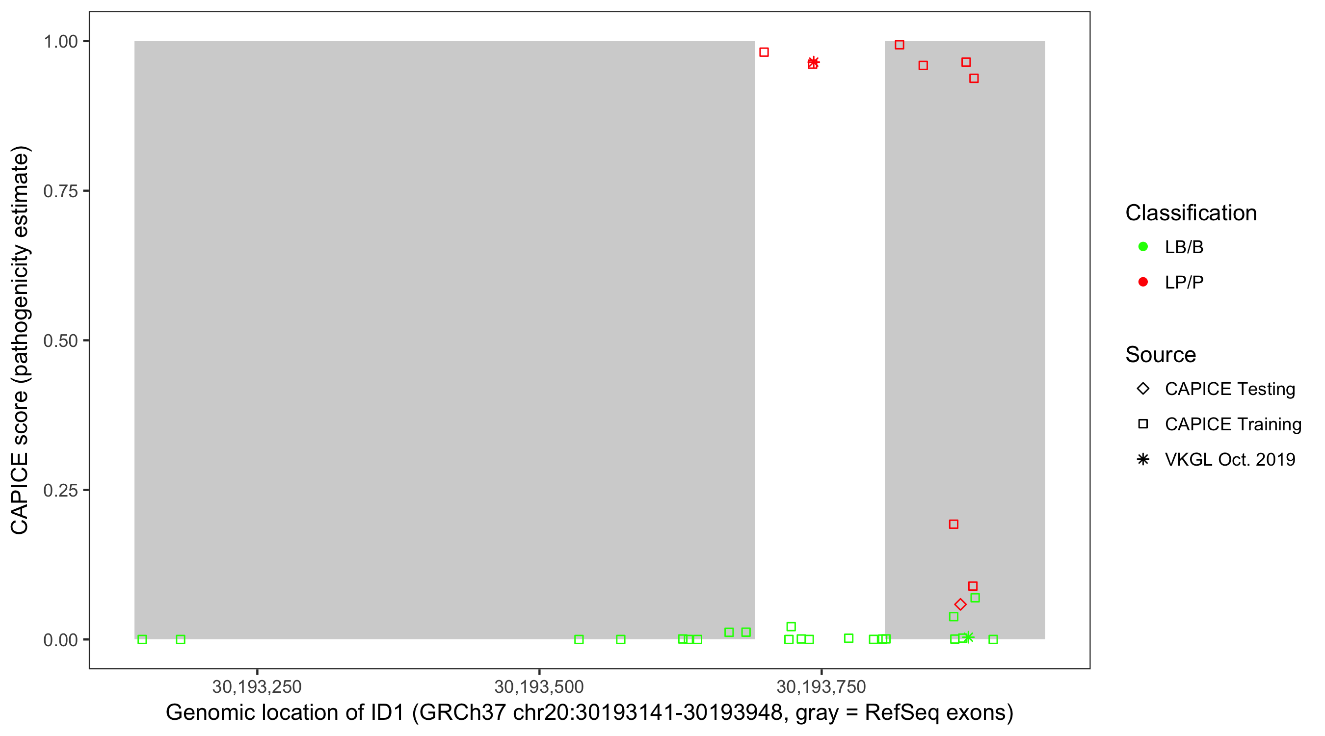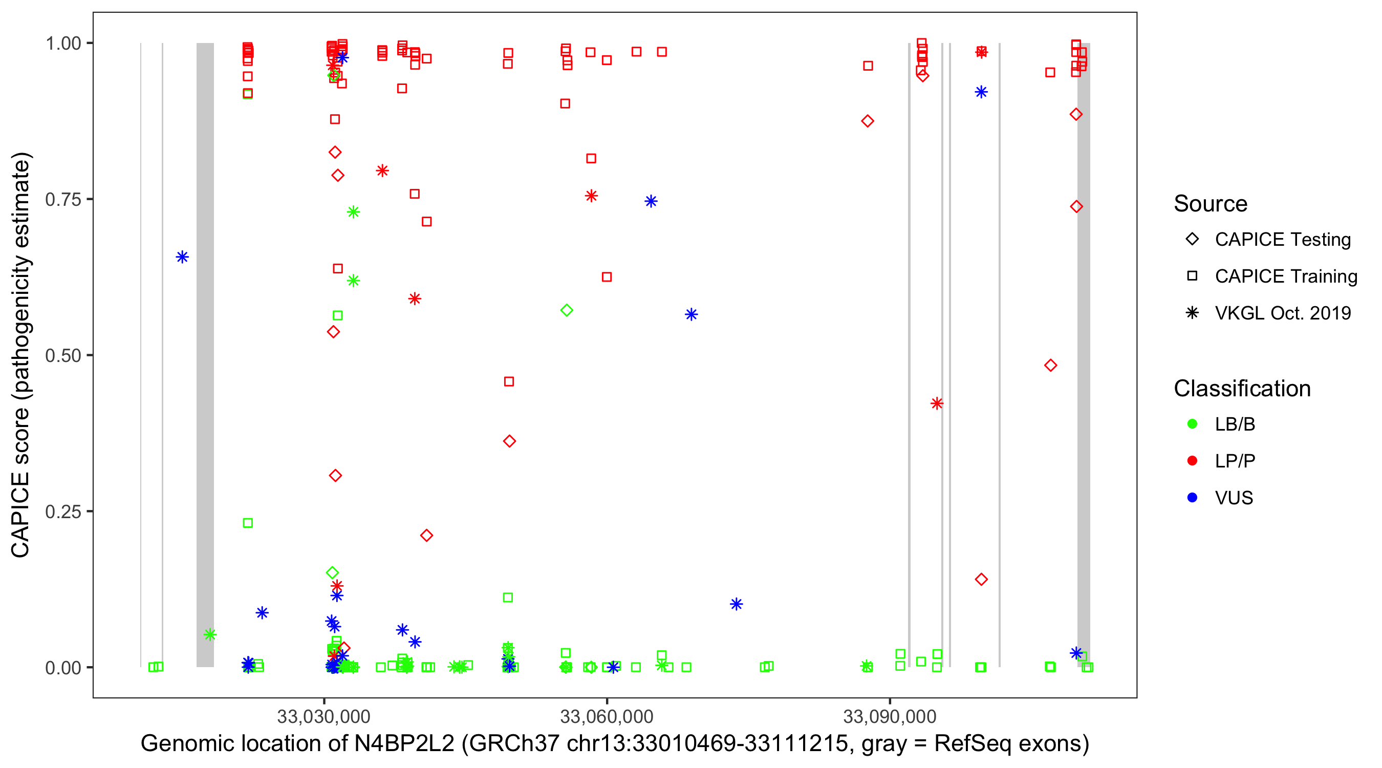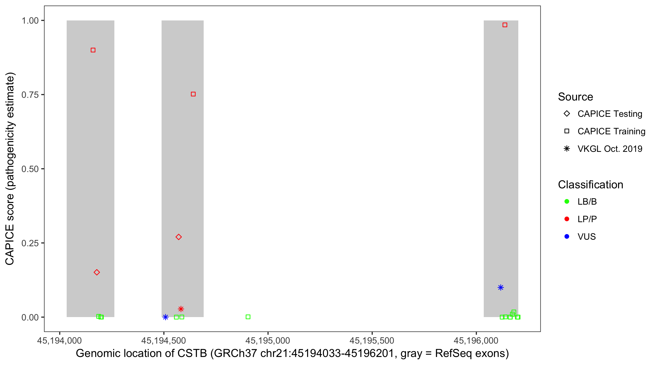 Shown are CAPICE train/test variants plus VKGL Oct 2019.