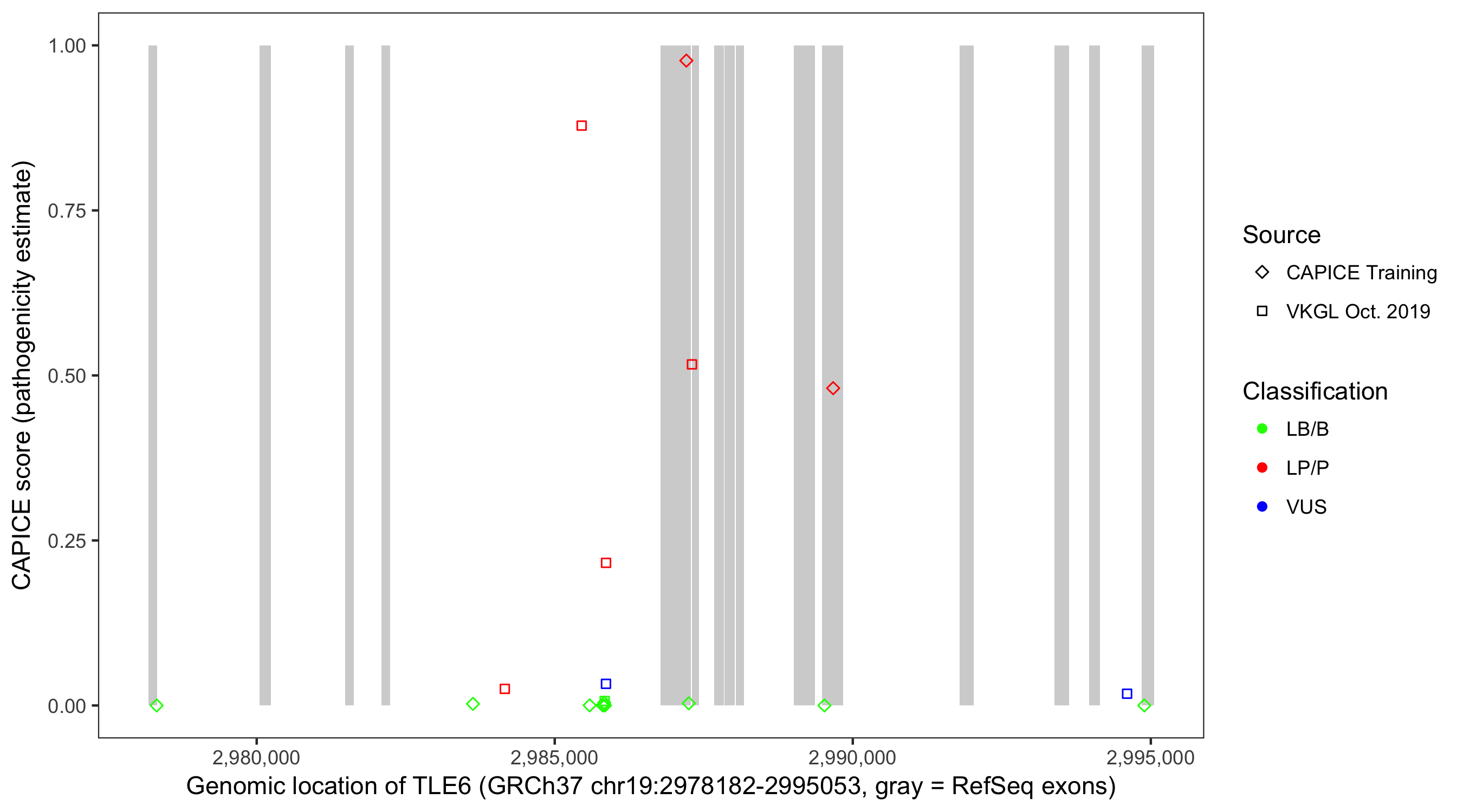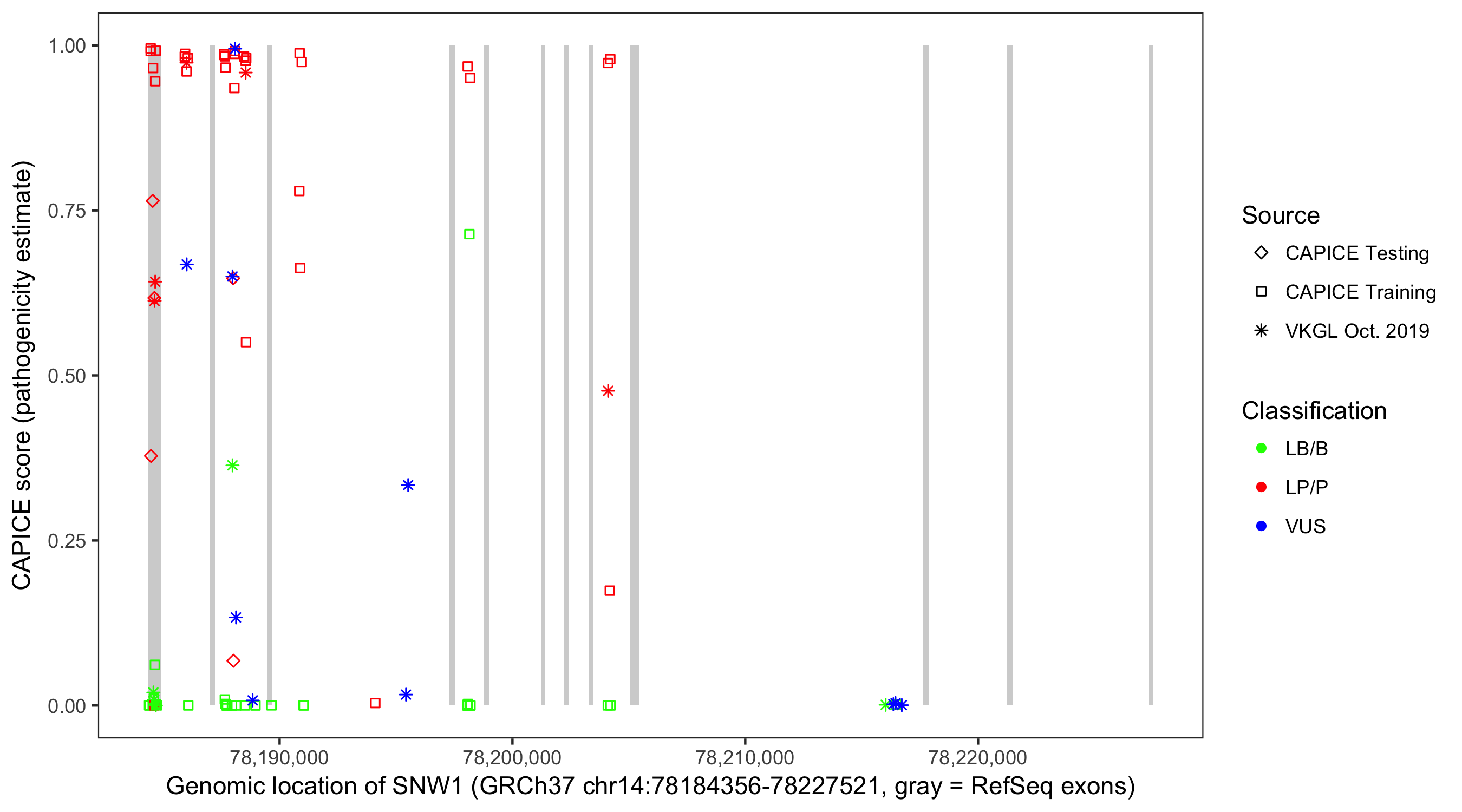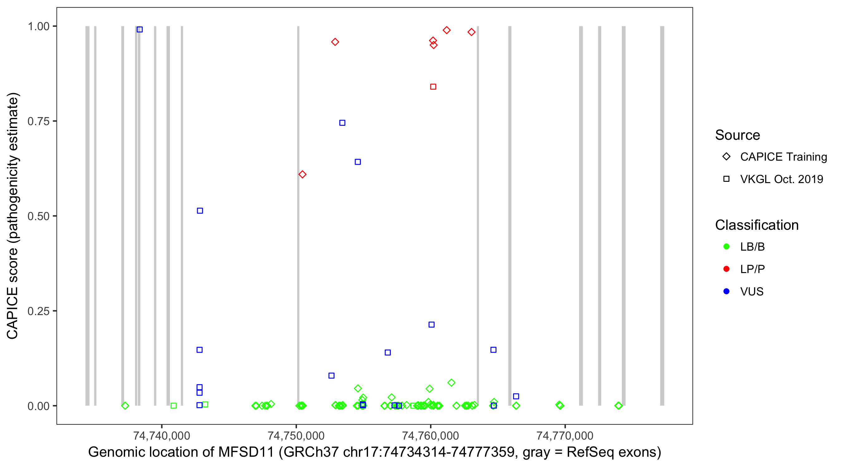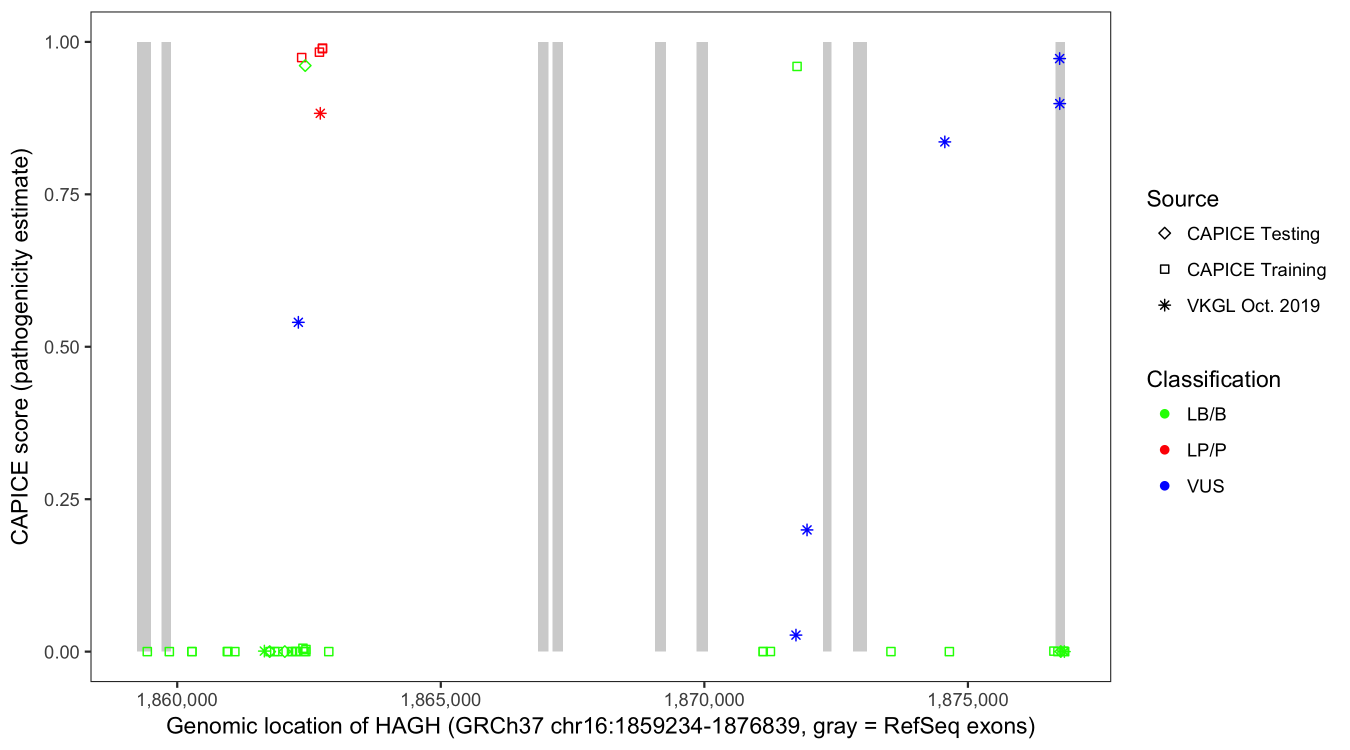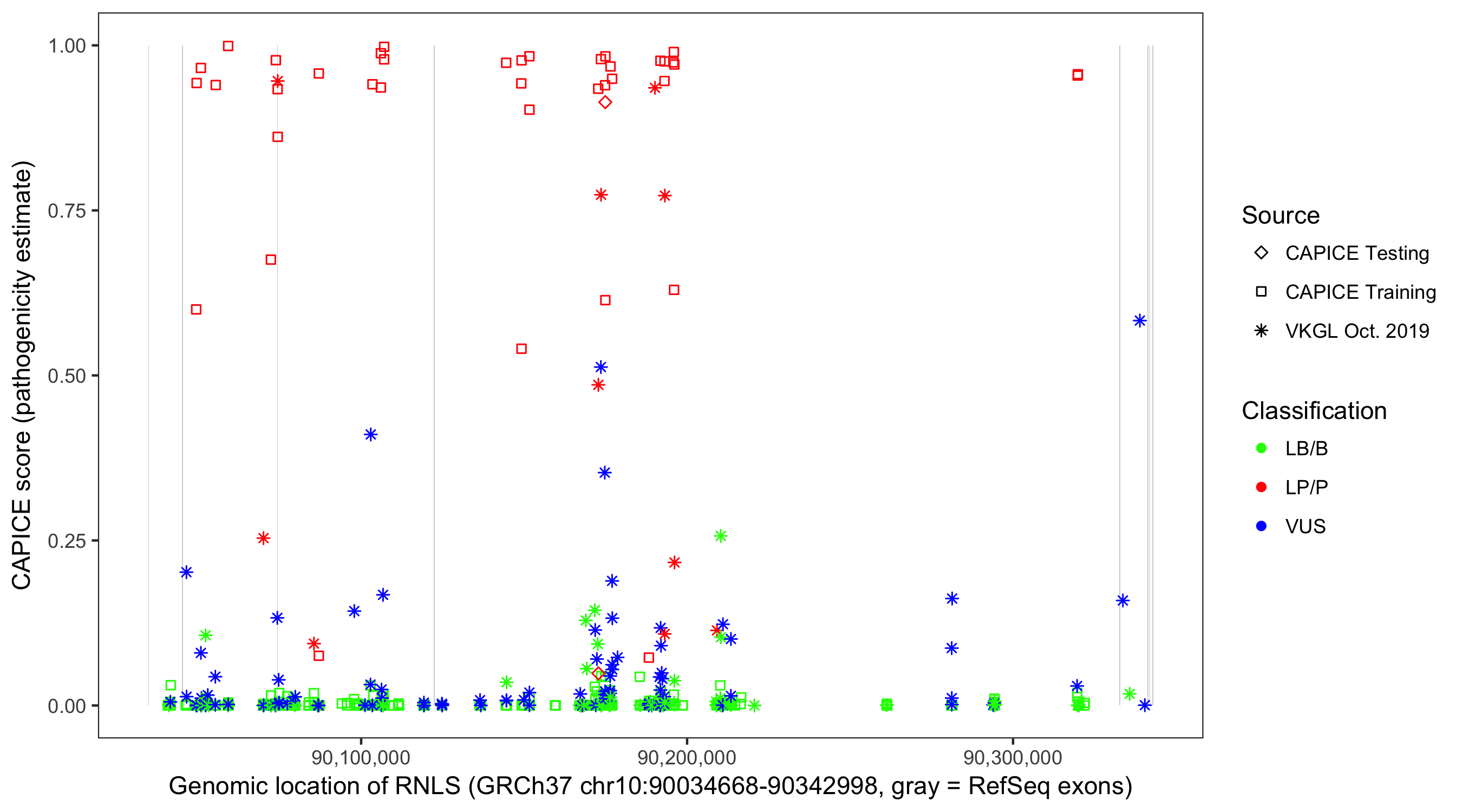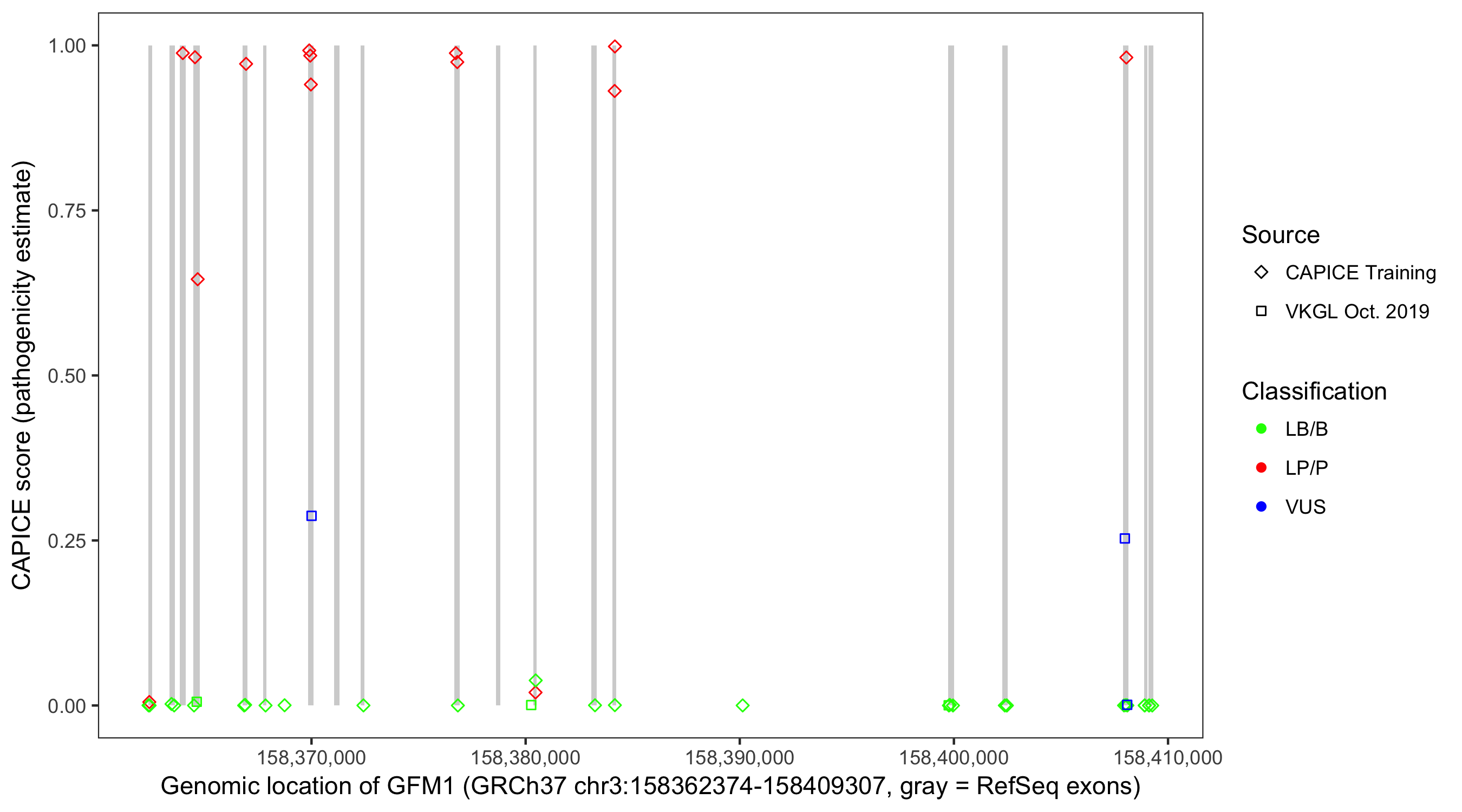 Shown are CAPICE train/test variants plus VKGL Oct 2019.