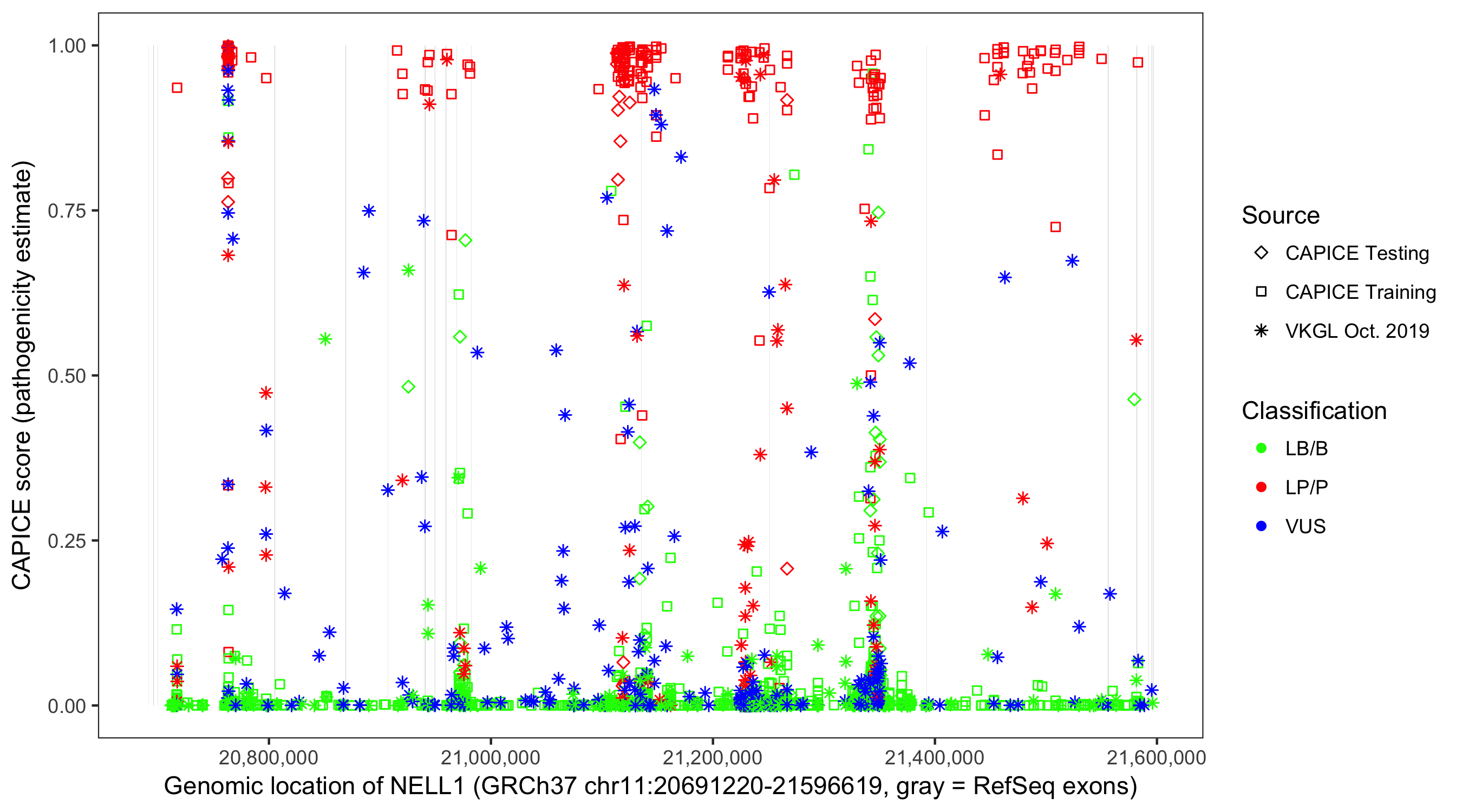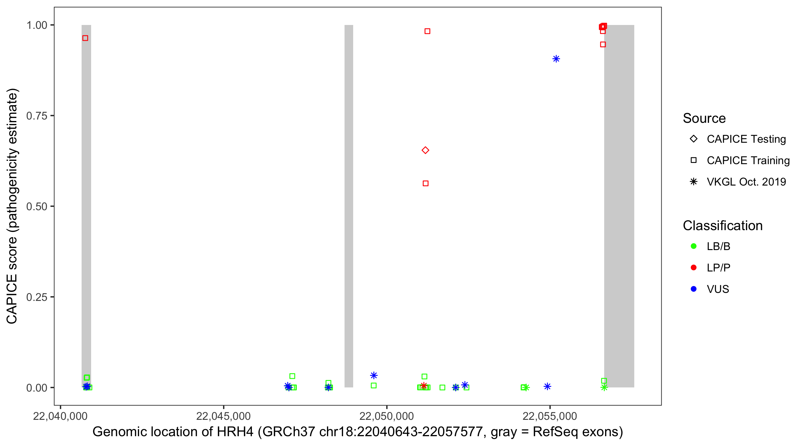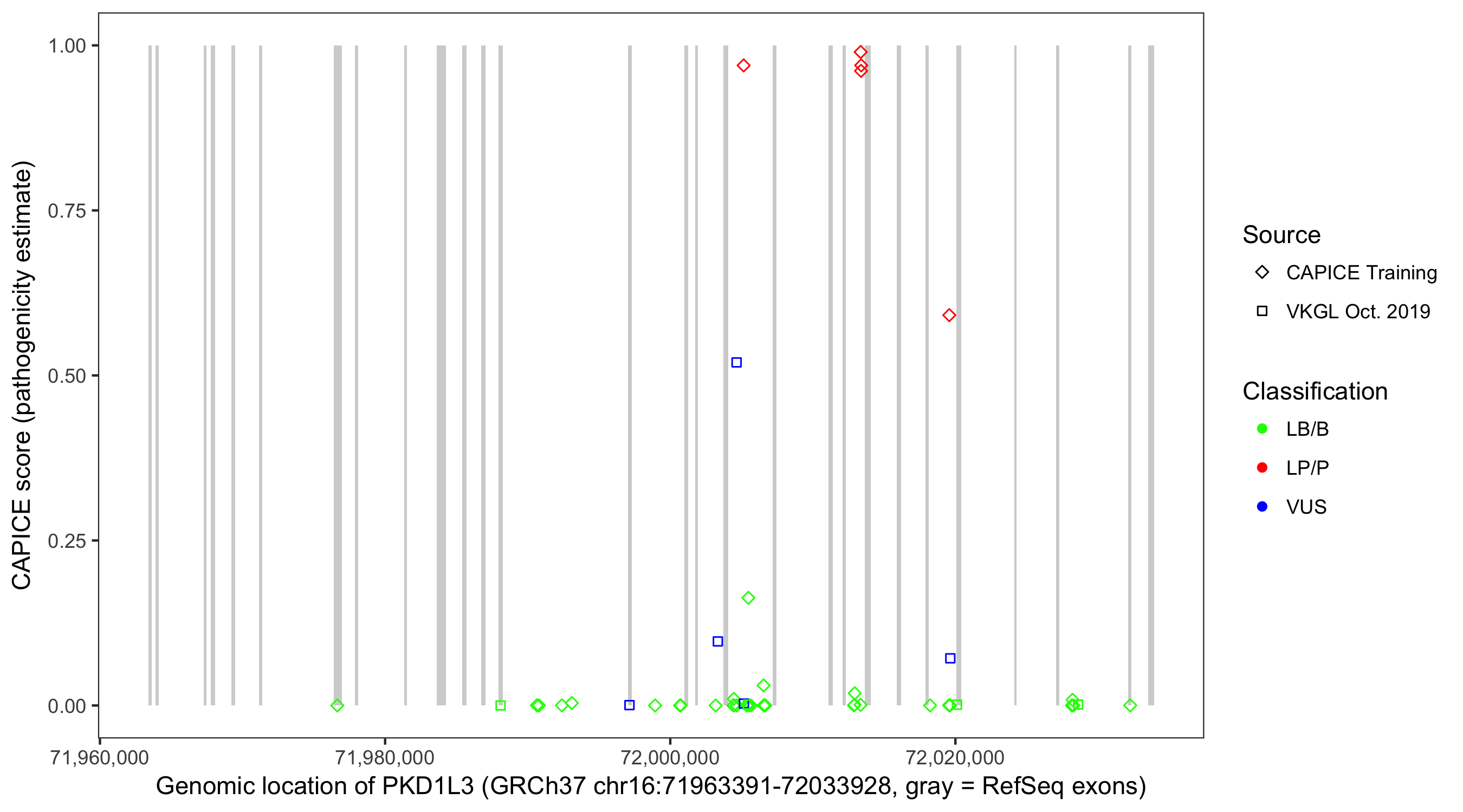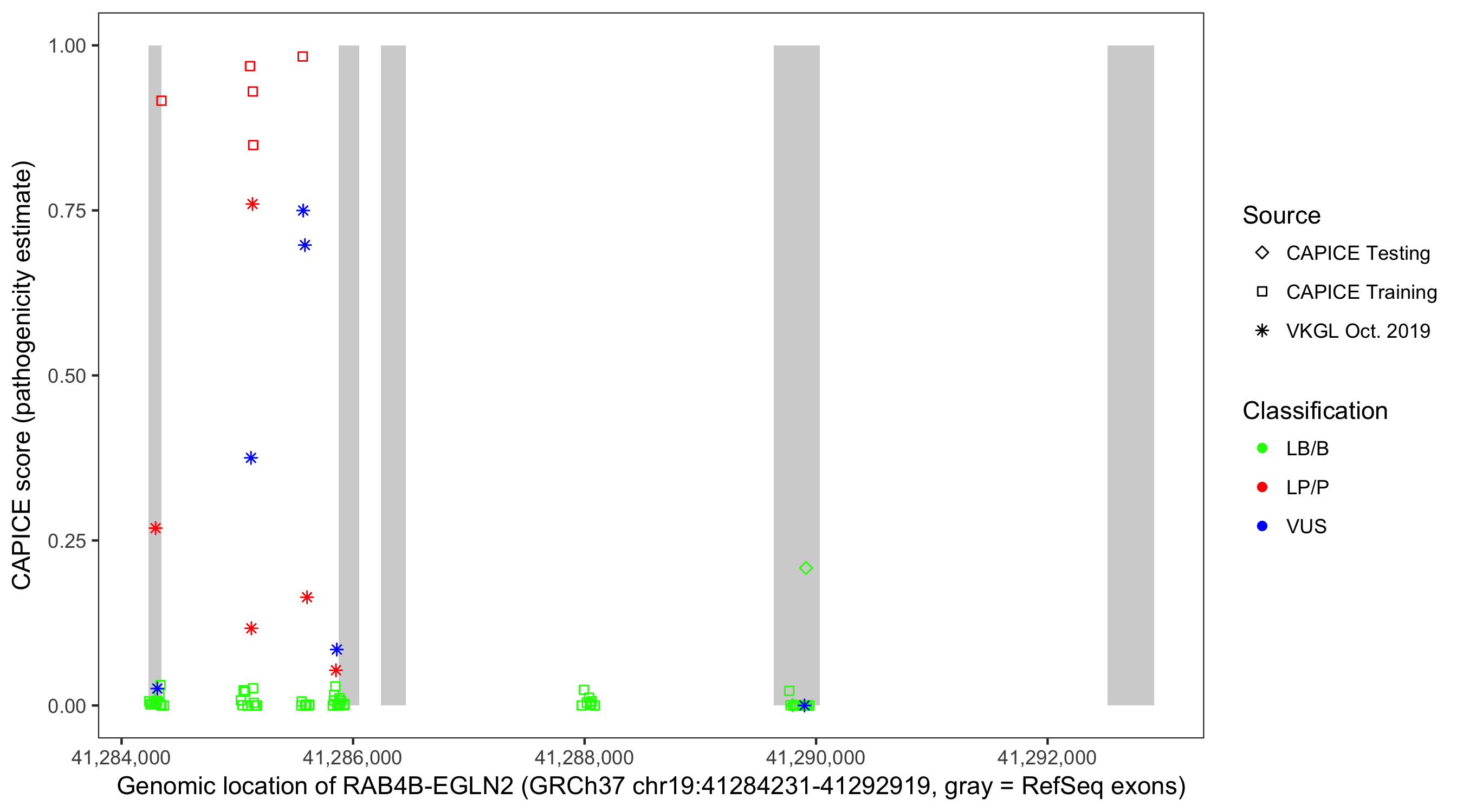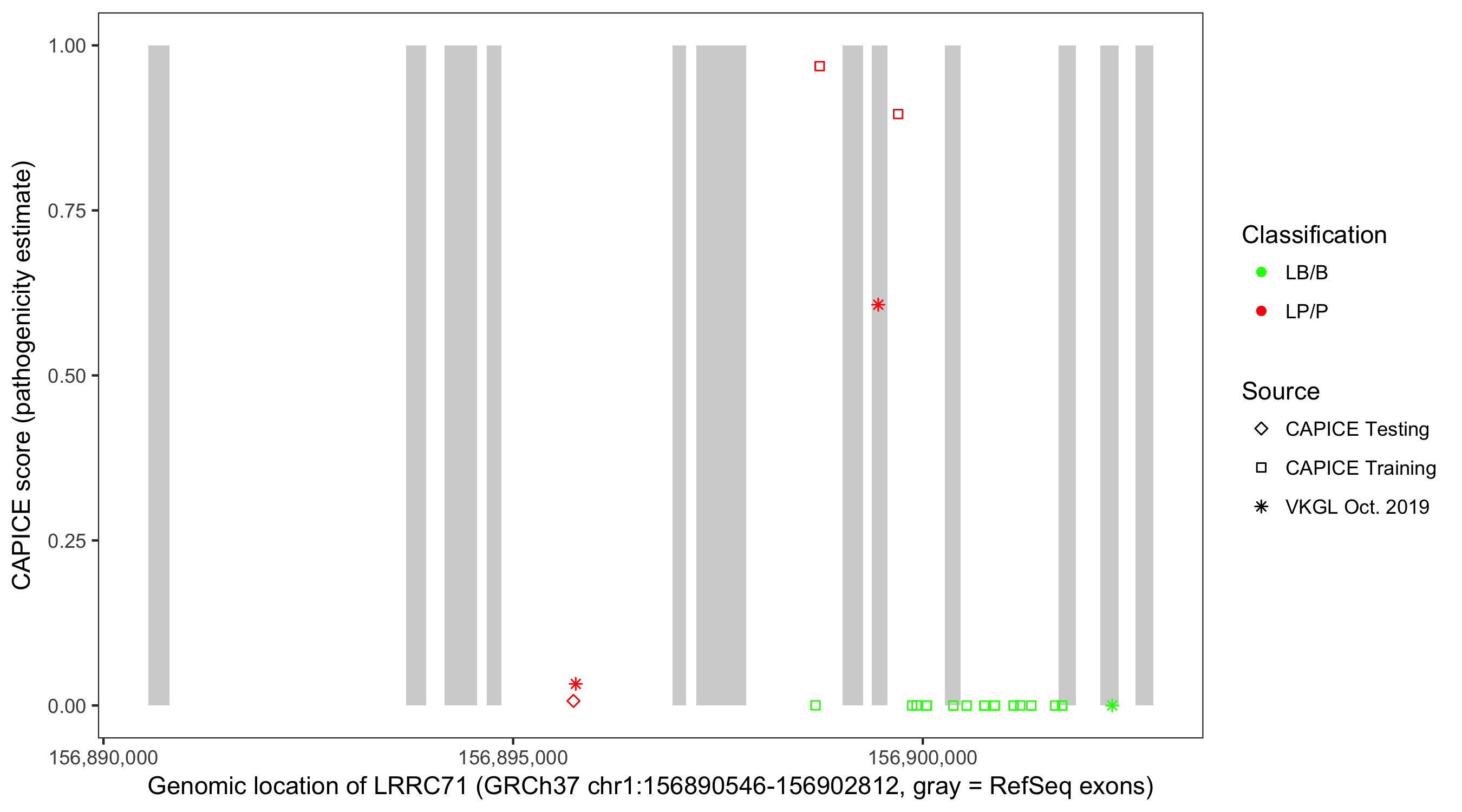 Shown are CAPICE train/test variants plus VKGL Oct 2019.
