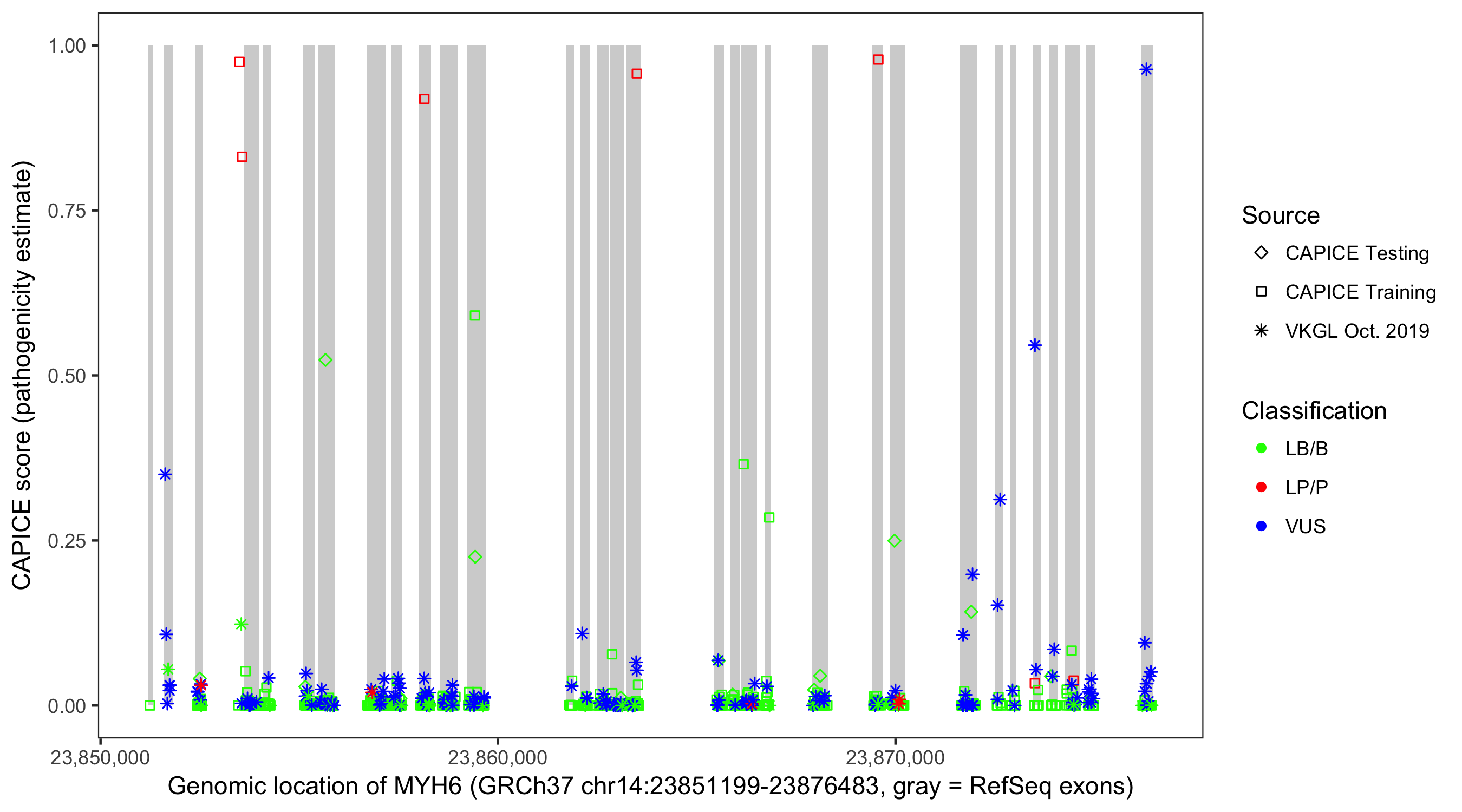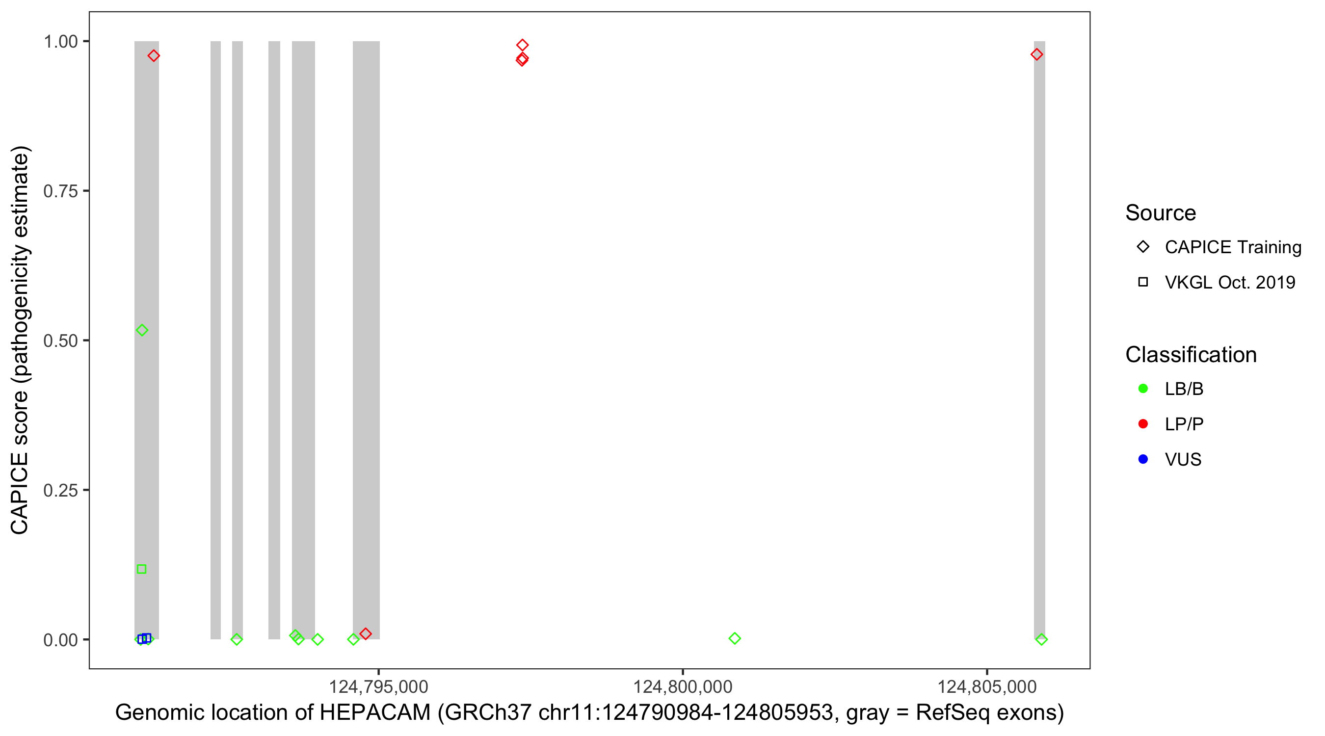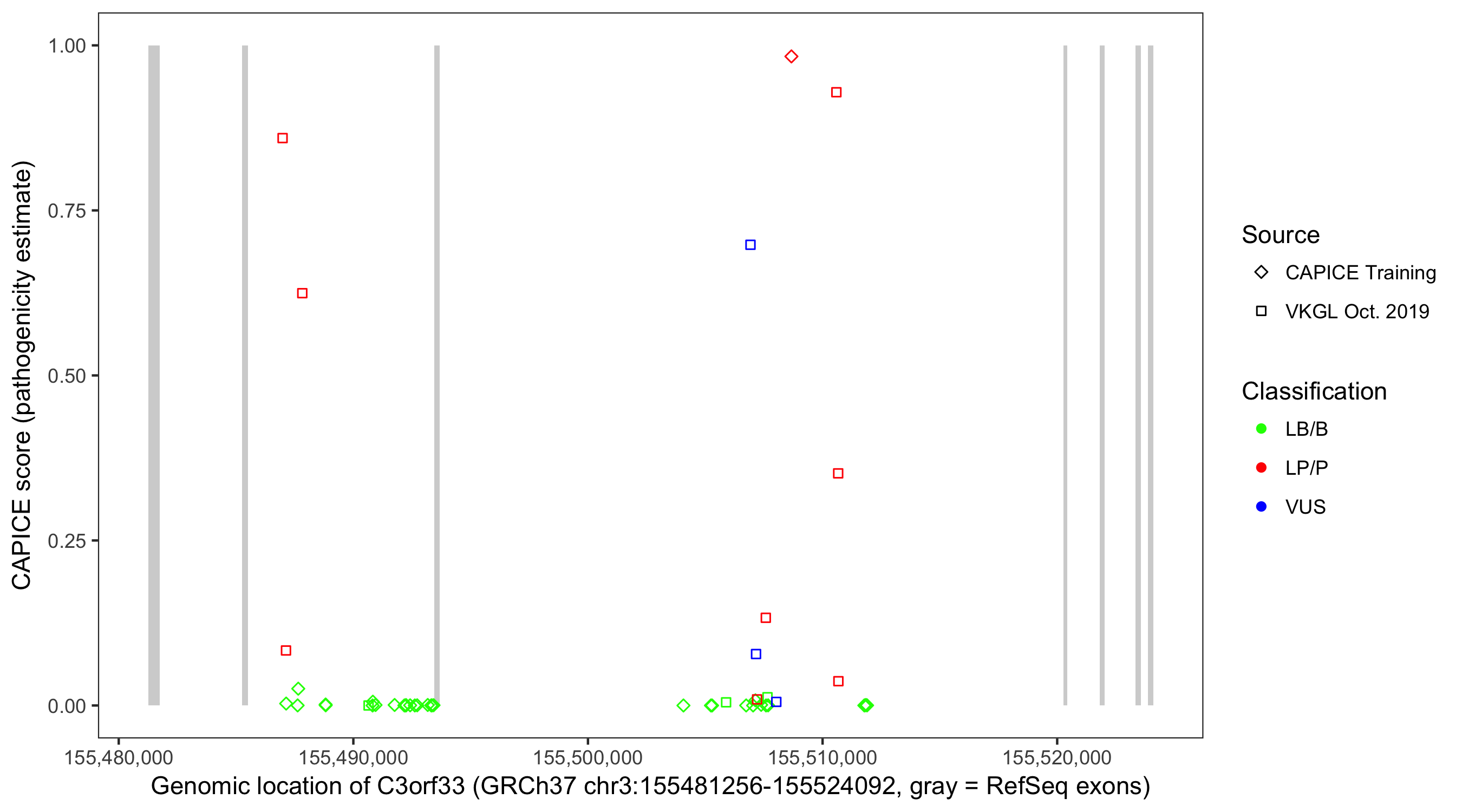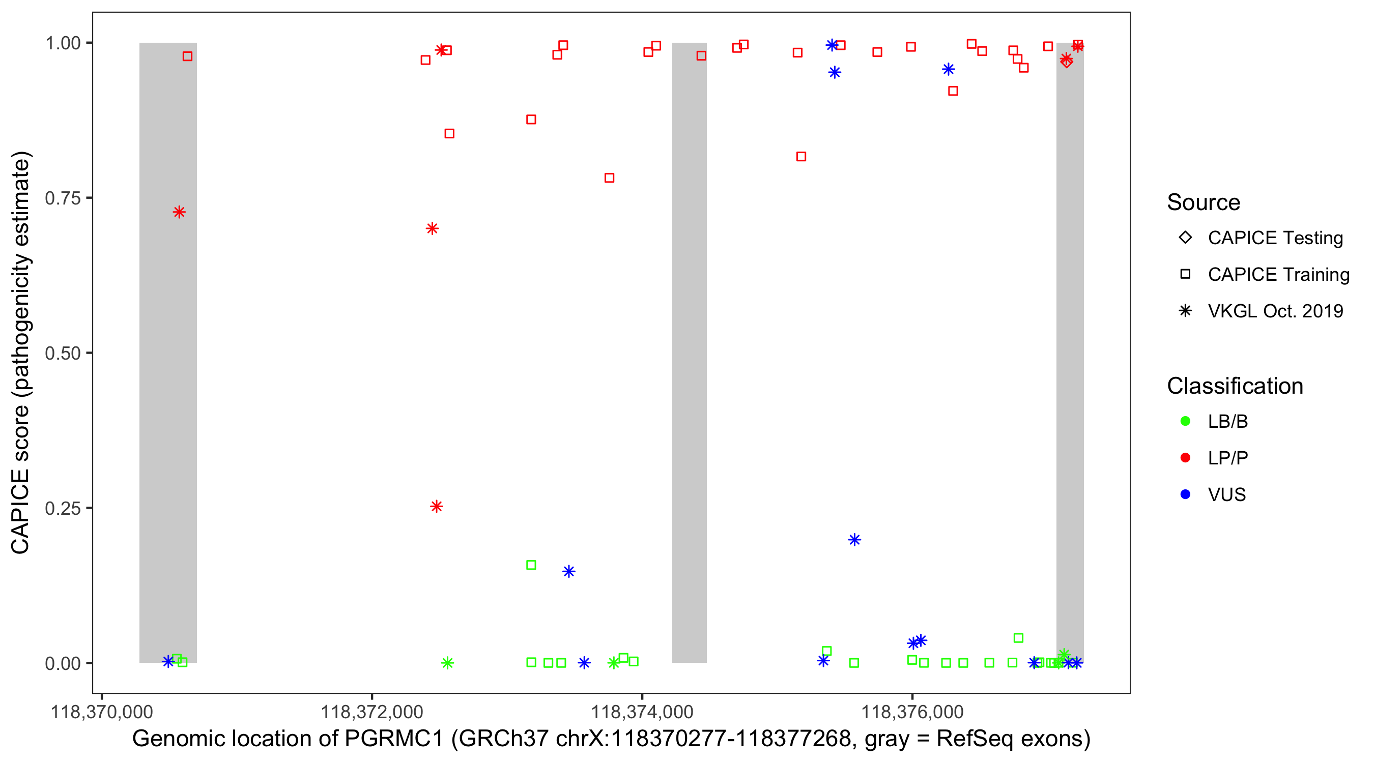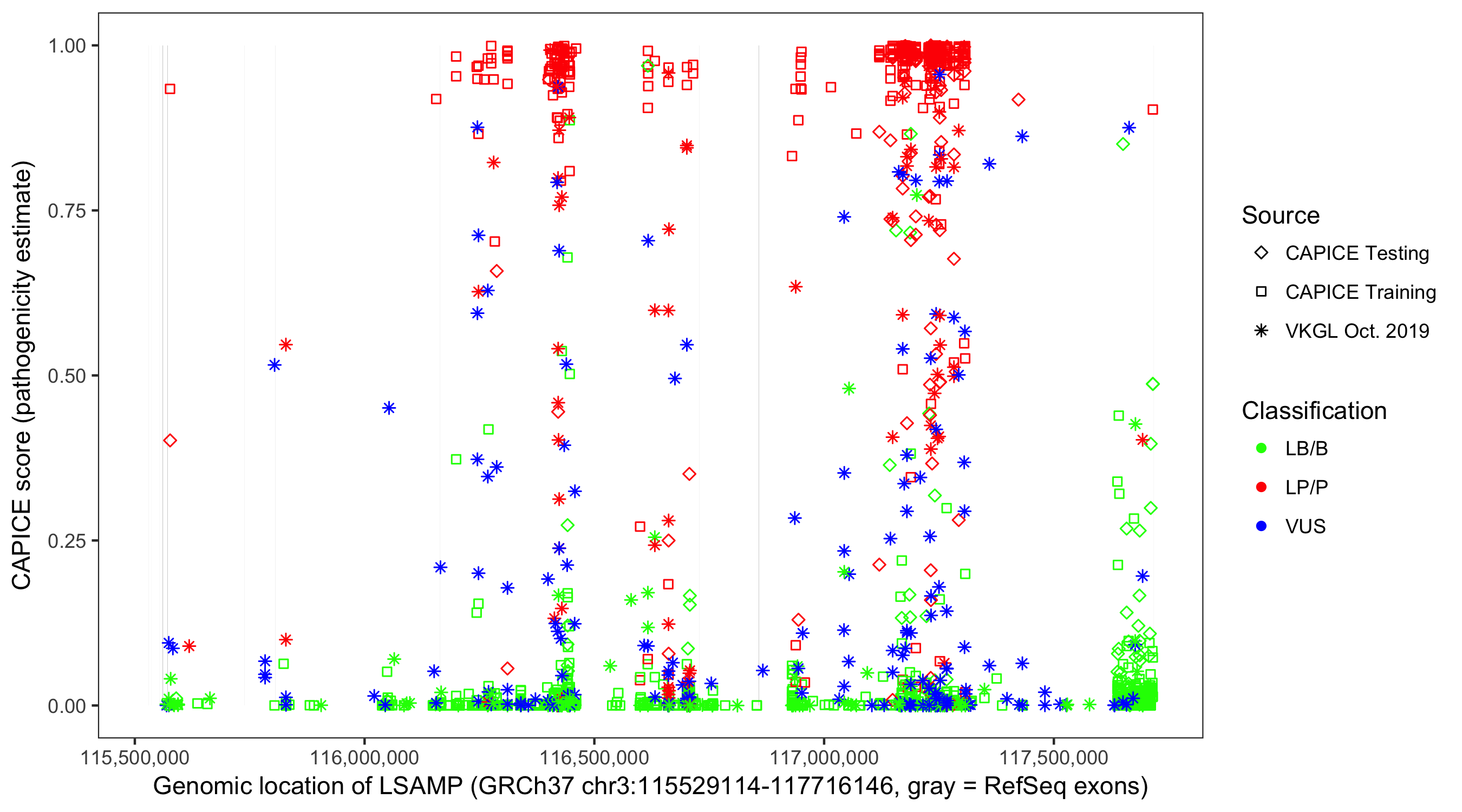 Shown are CAPICE train/test variants plus VKGL Oct 2019.