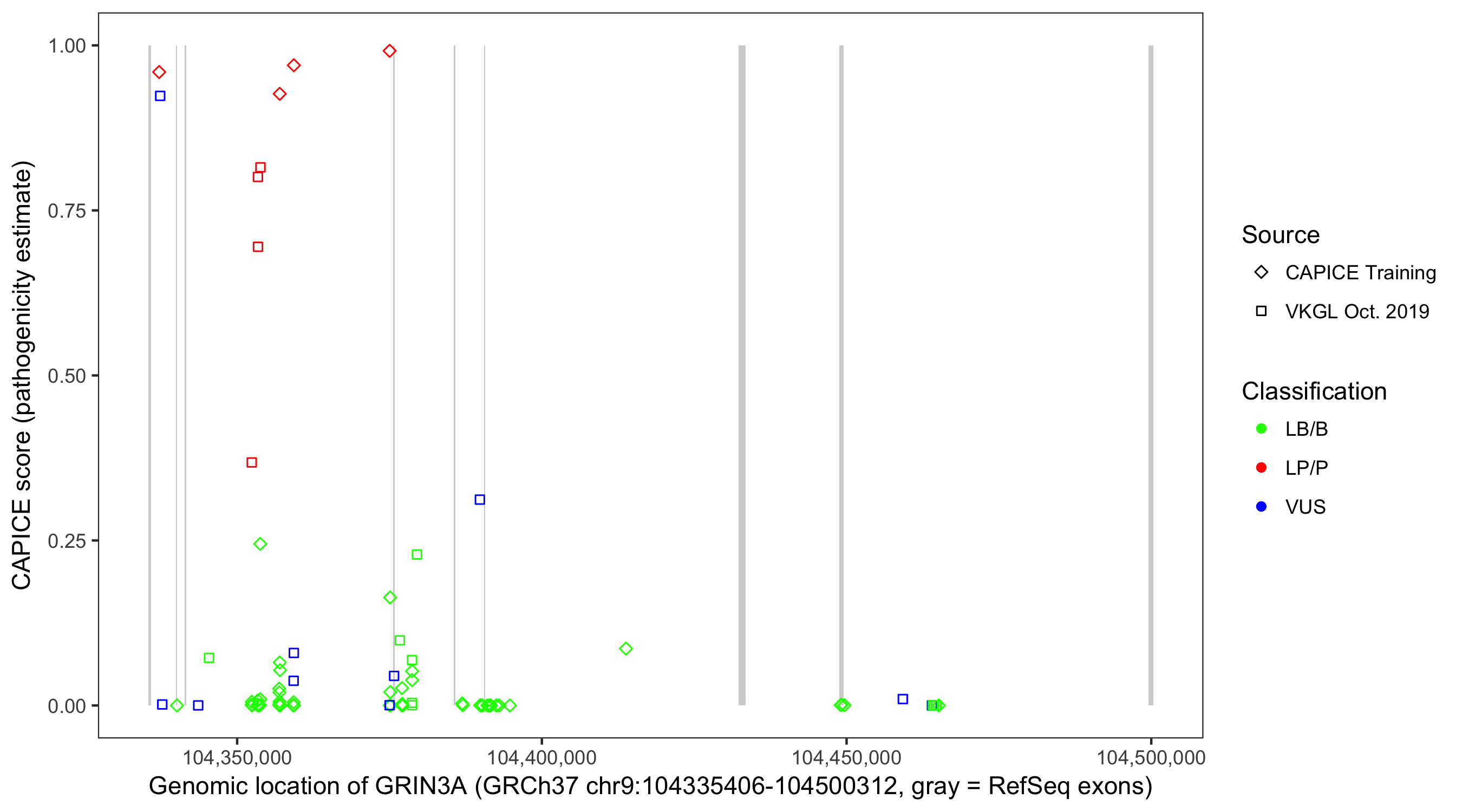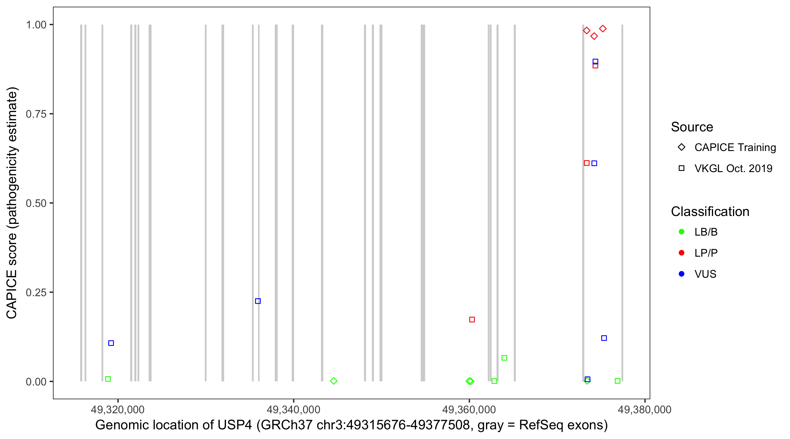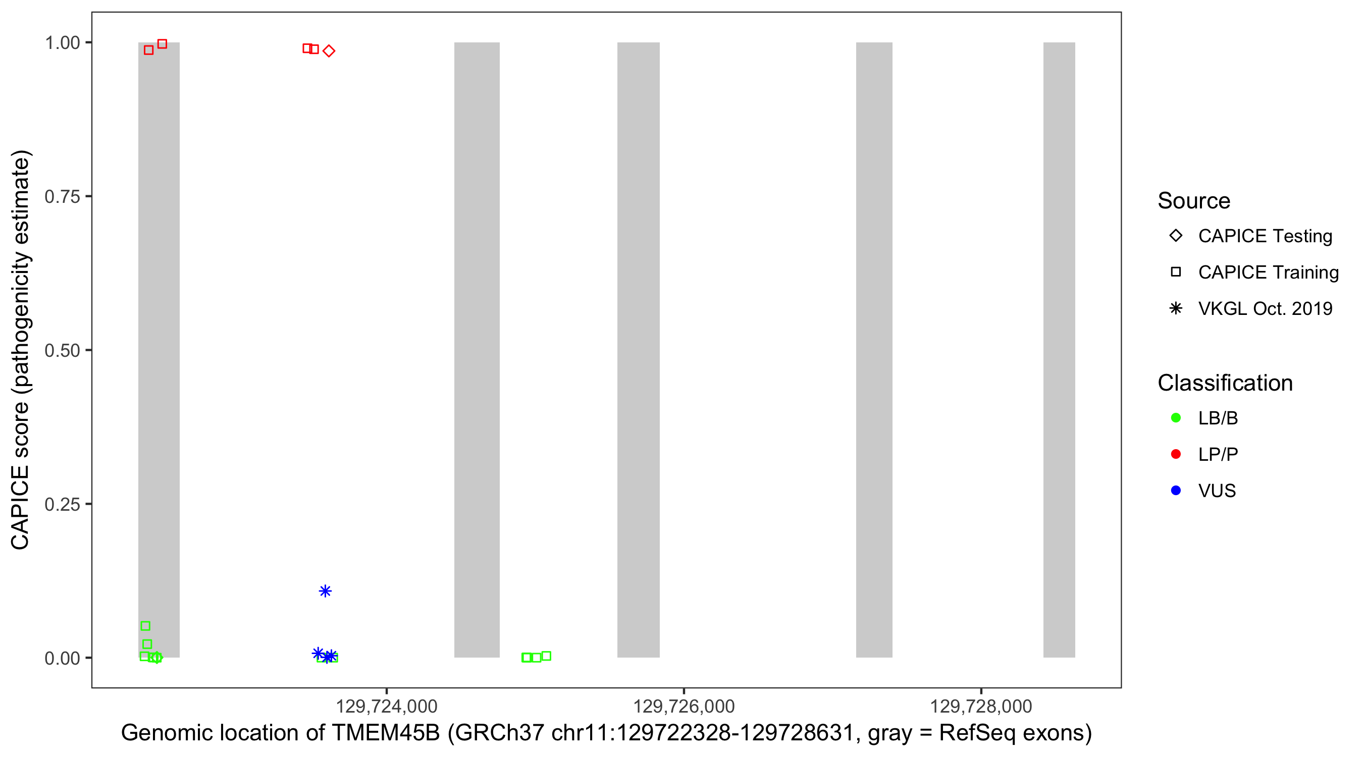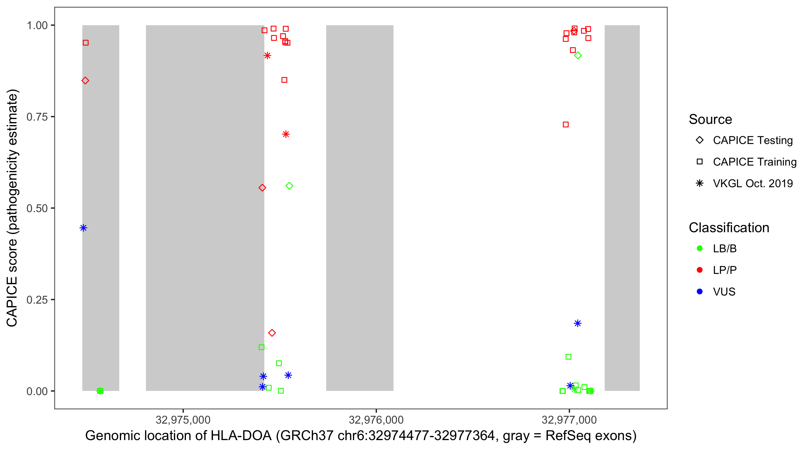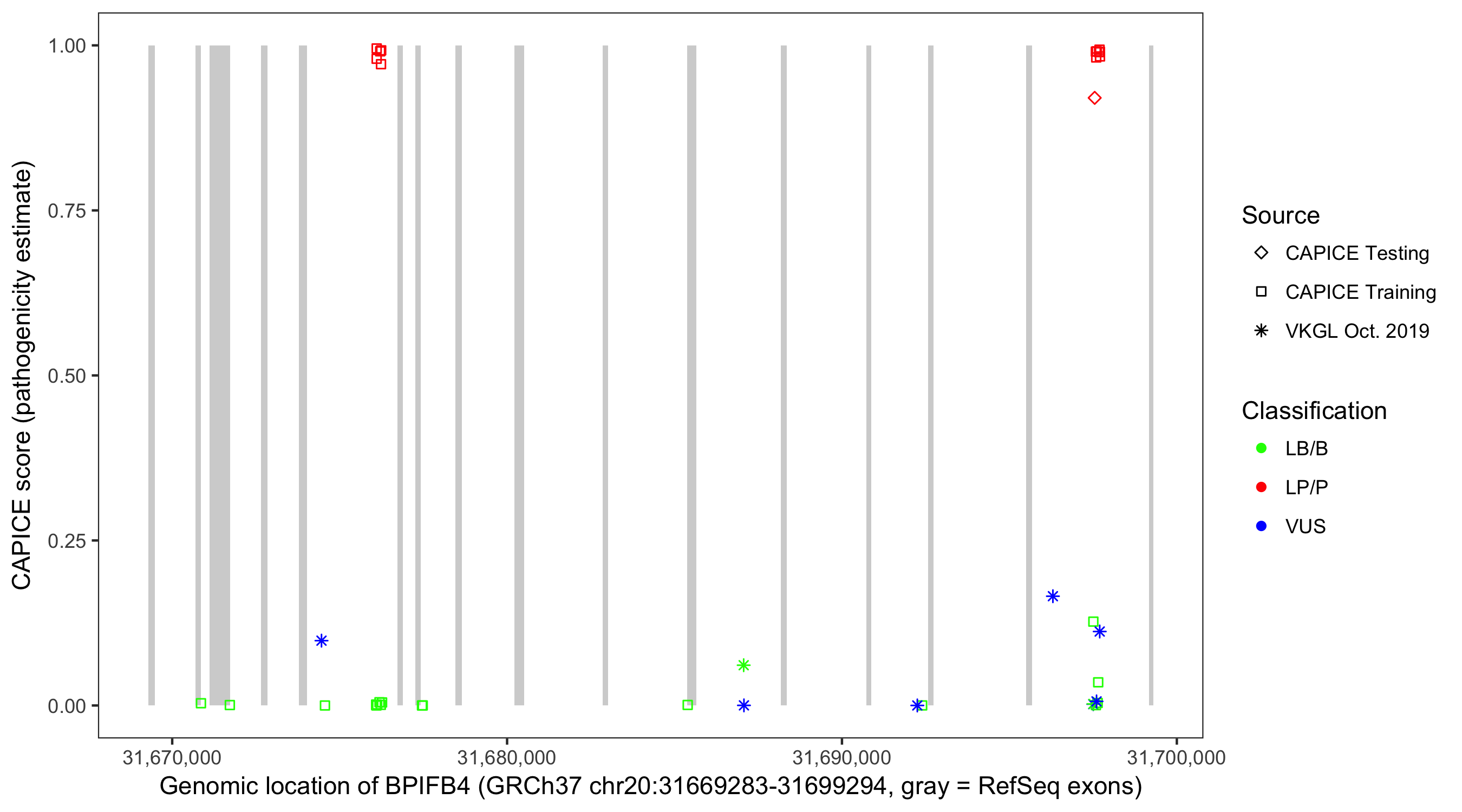 Shown are CAPICE train/test variants plus VKGL Oct 2019.