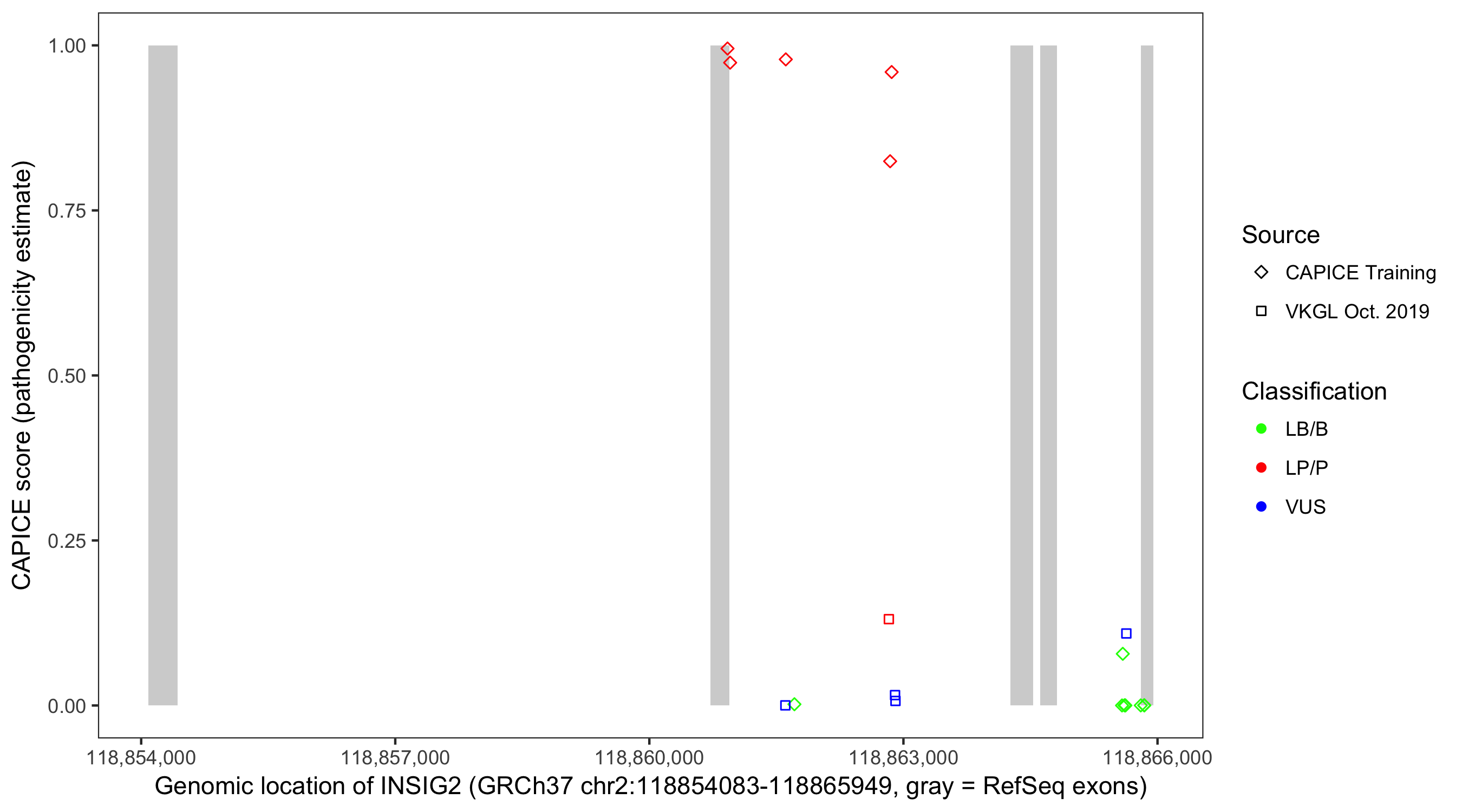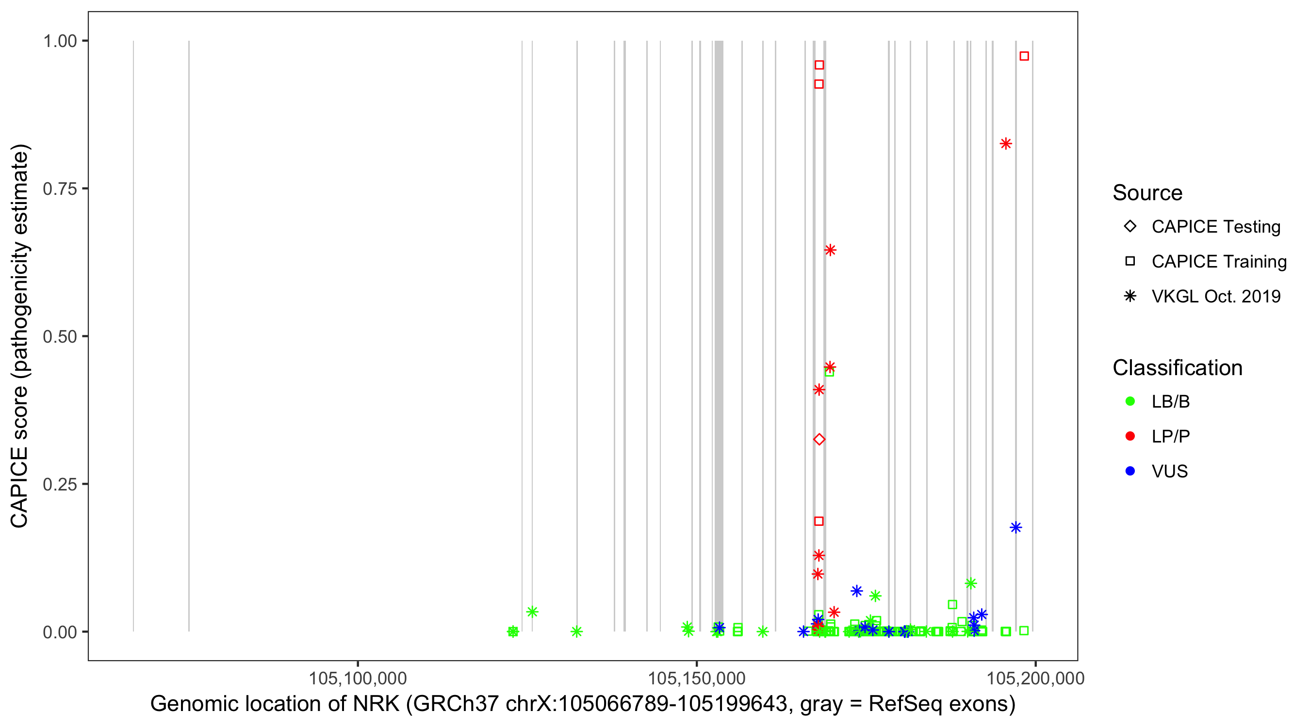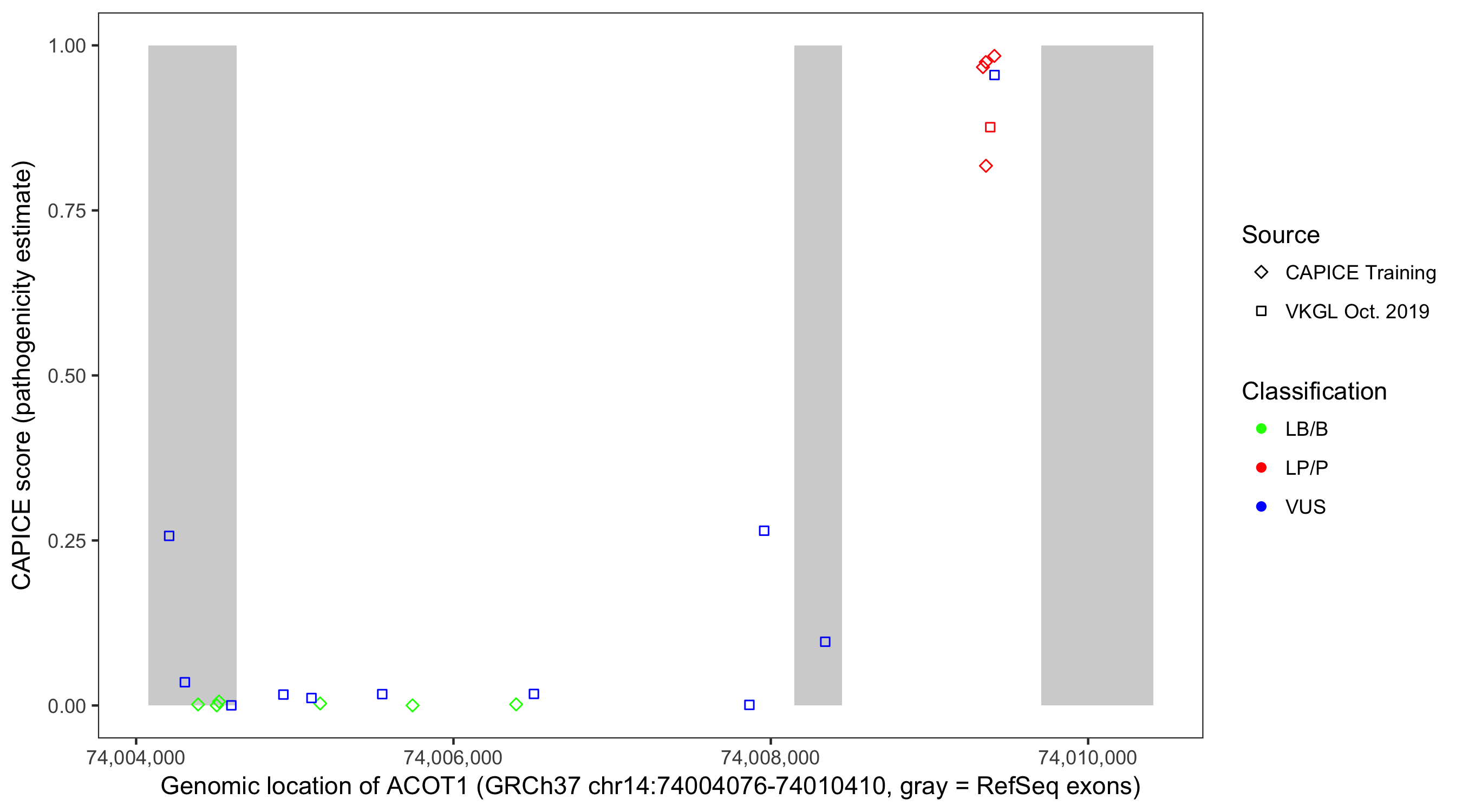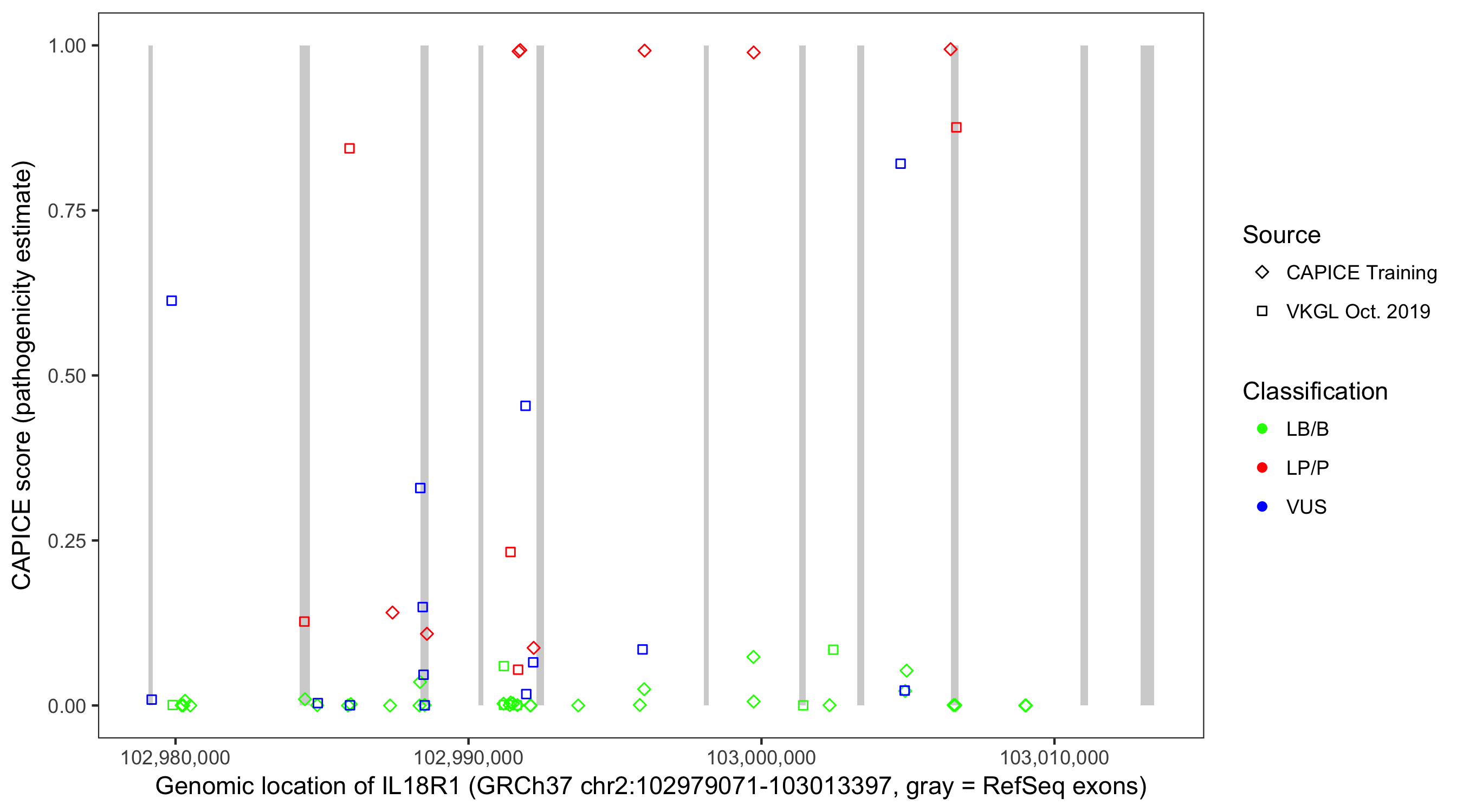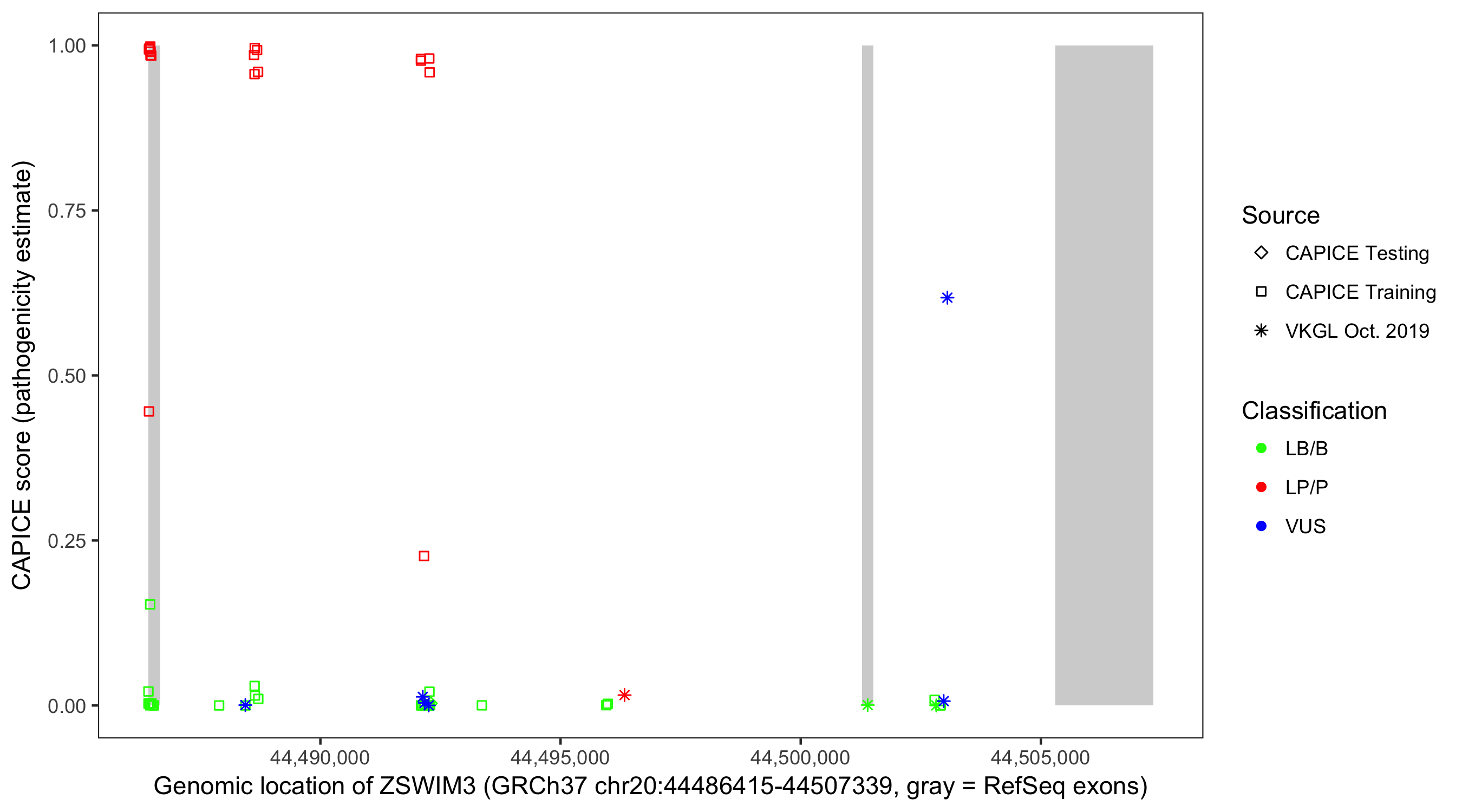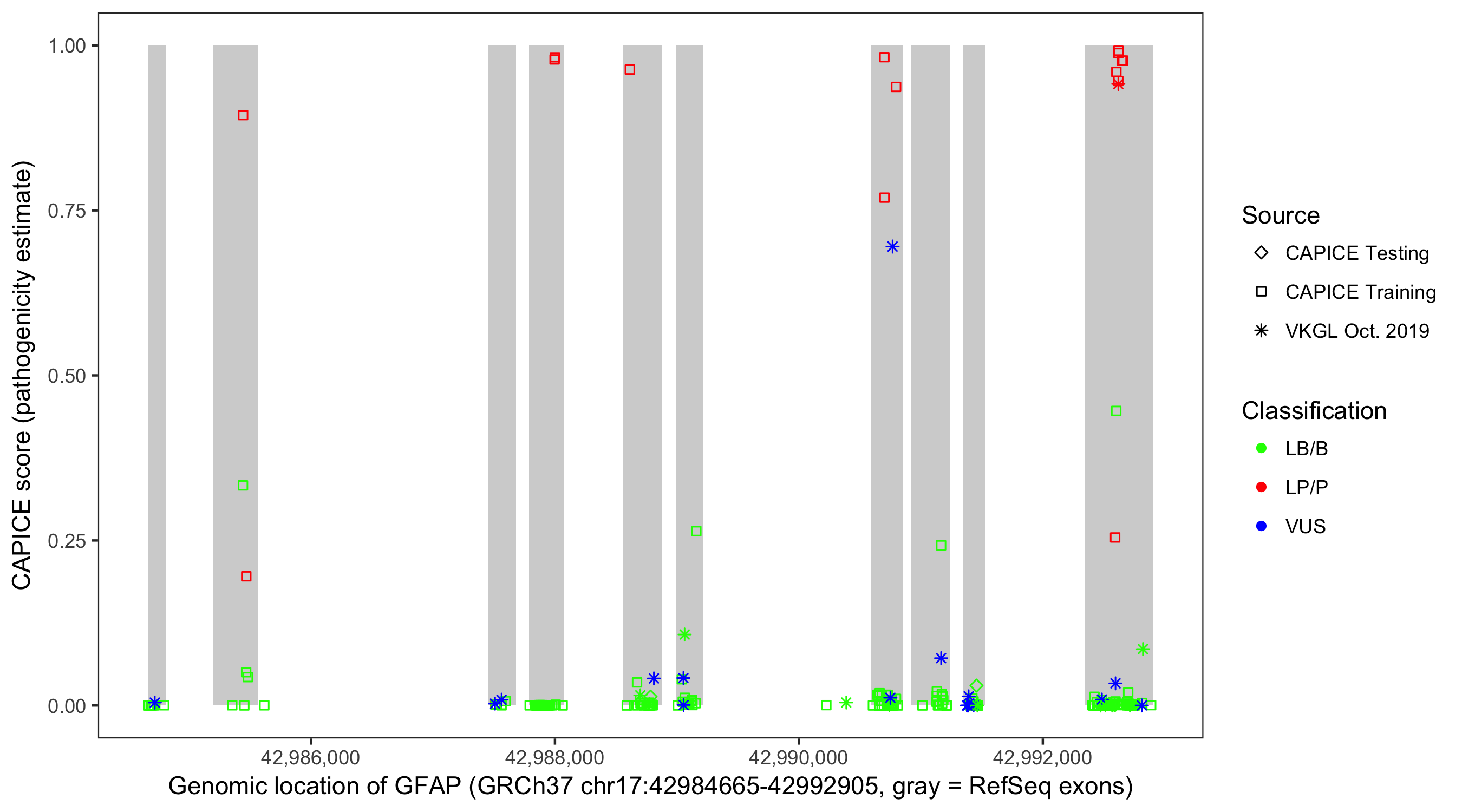 Shown are CAPICE train/test variants plus VKGL Oct 2019.