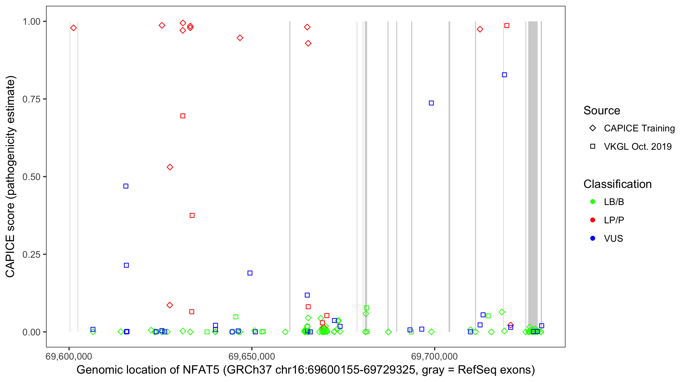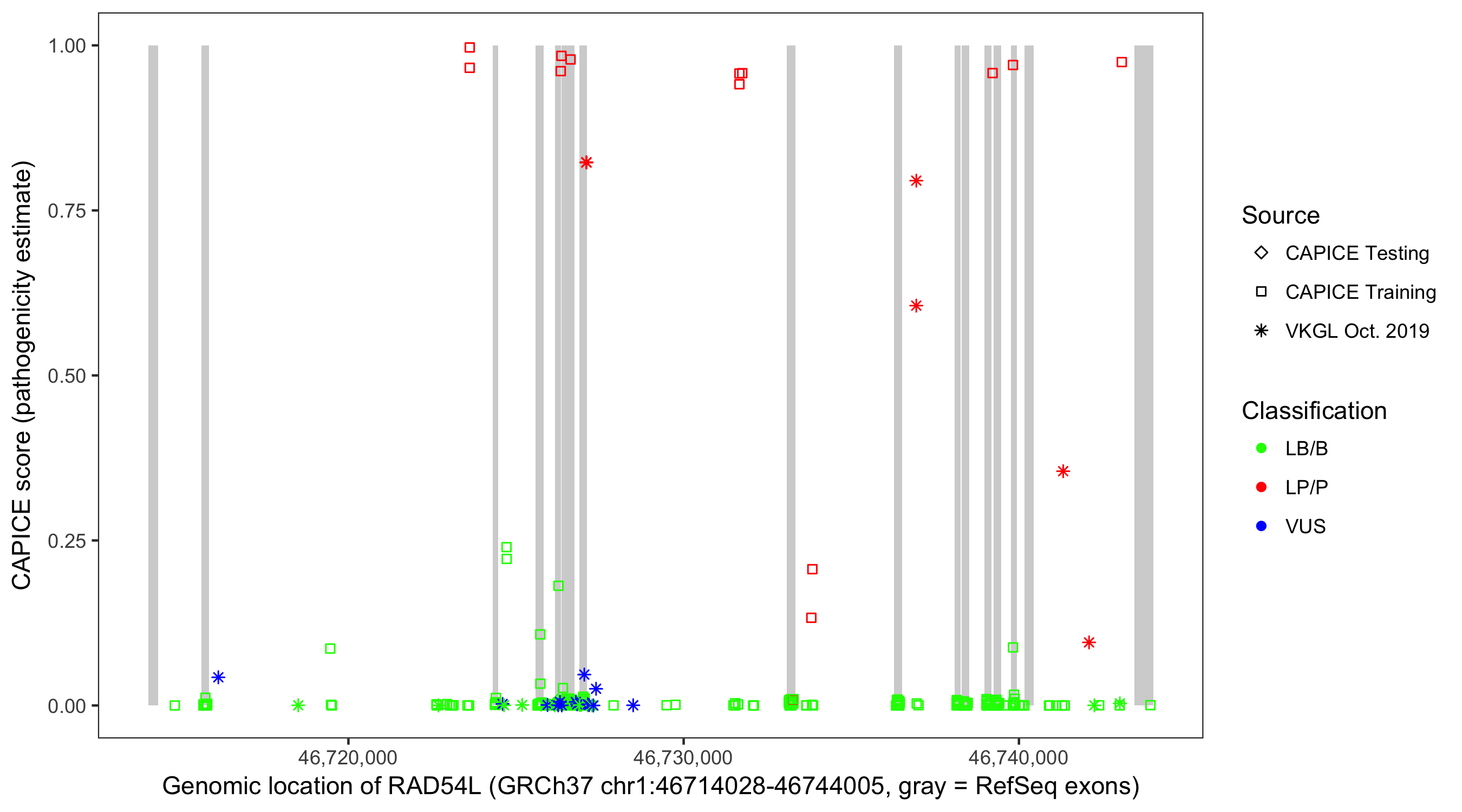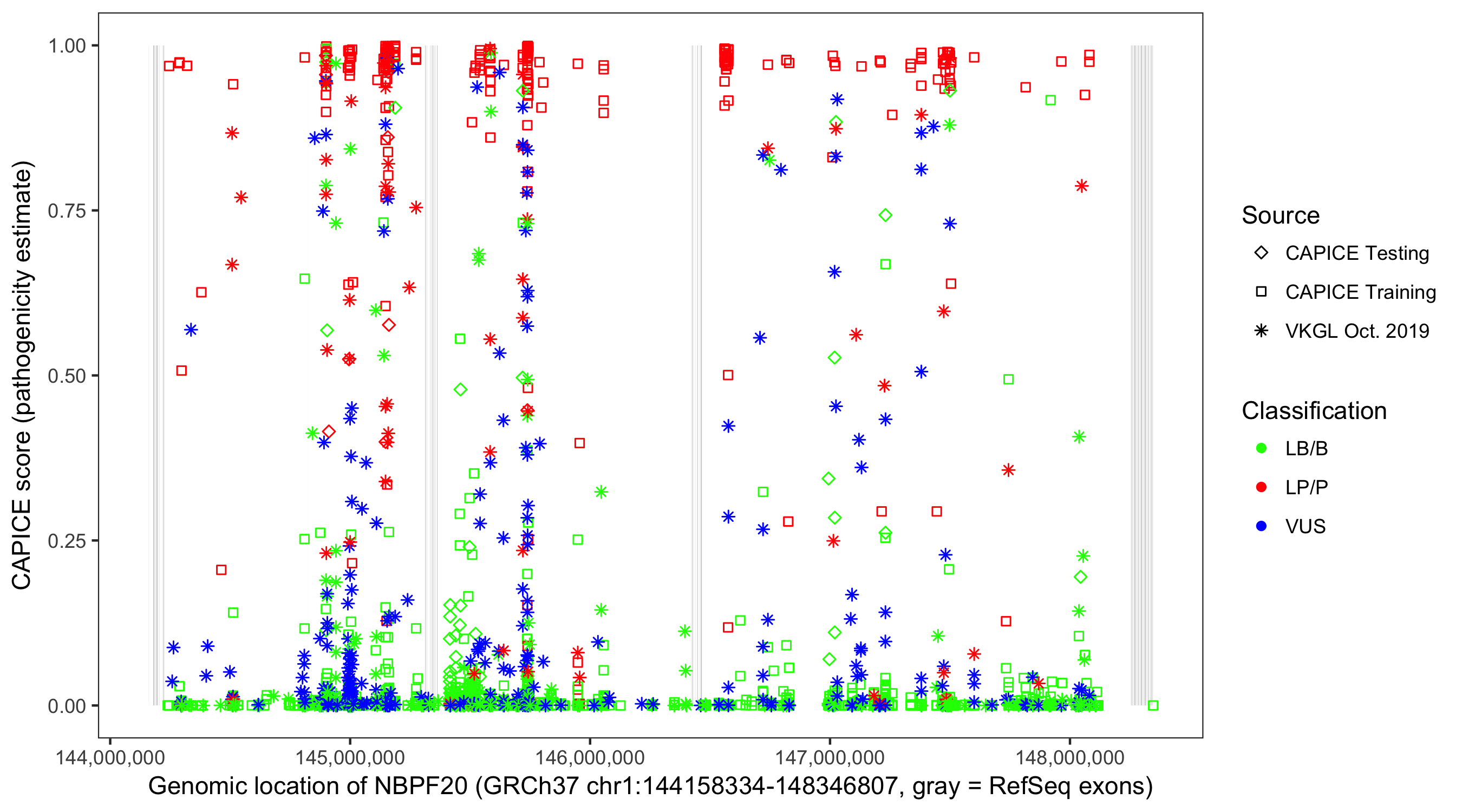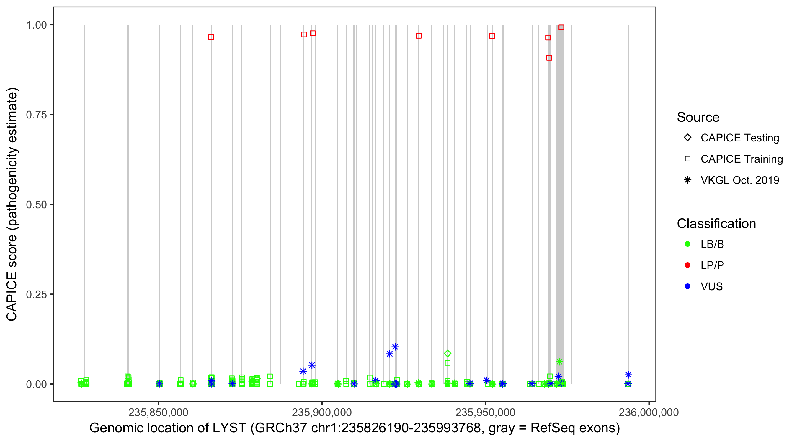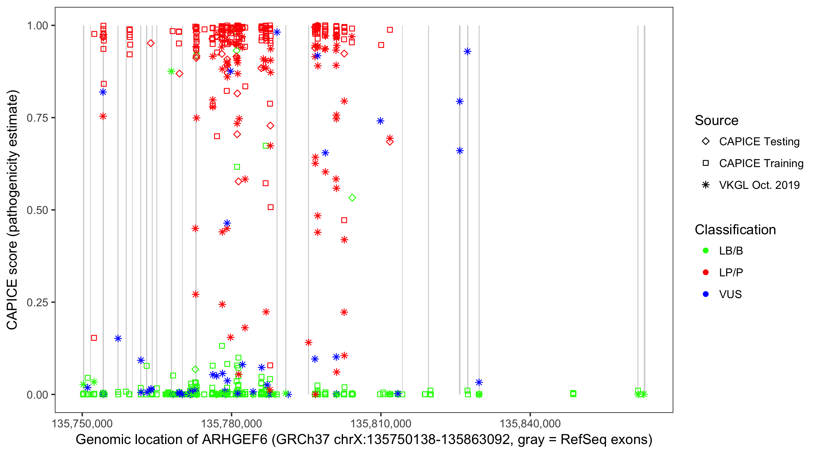 Shown are CAPICE train/test variants plus VKGL Oct 2019.