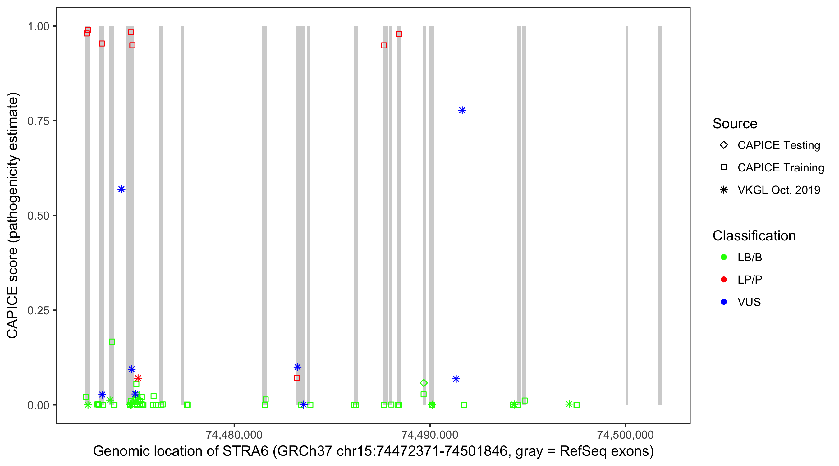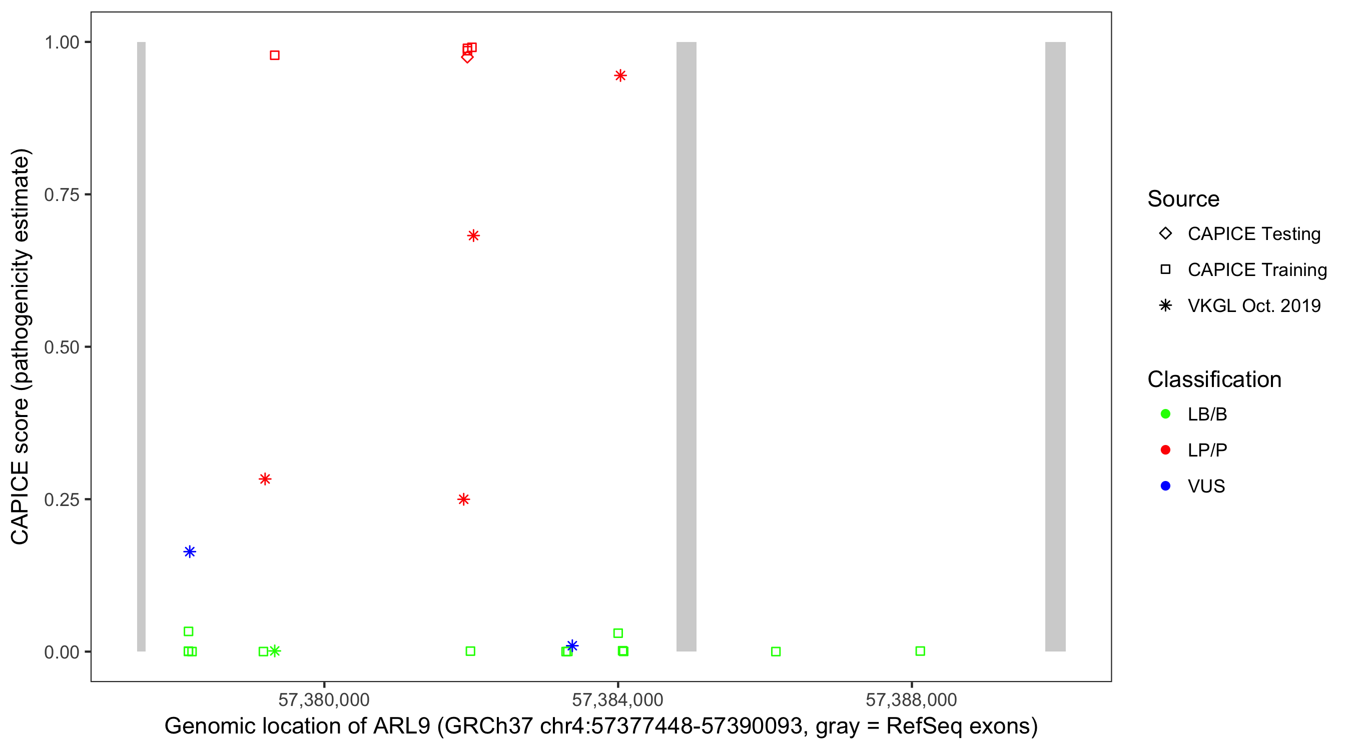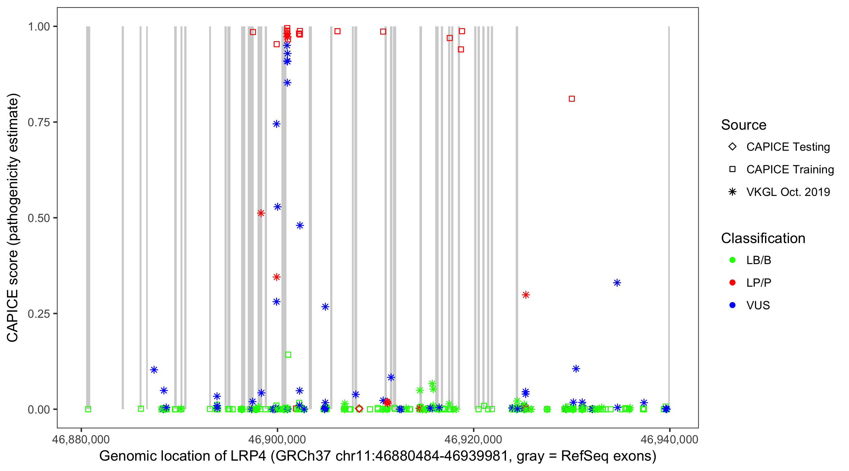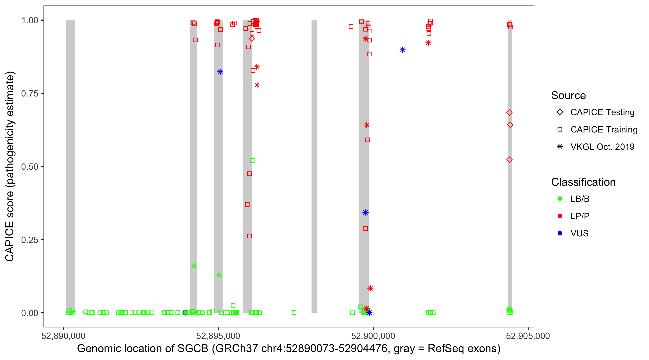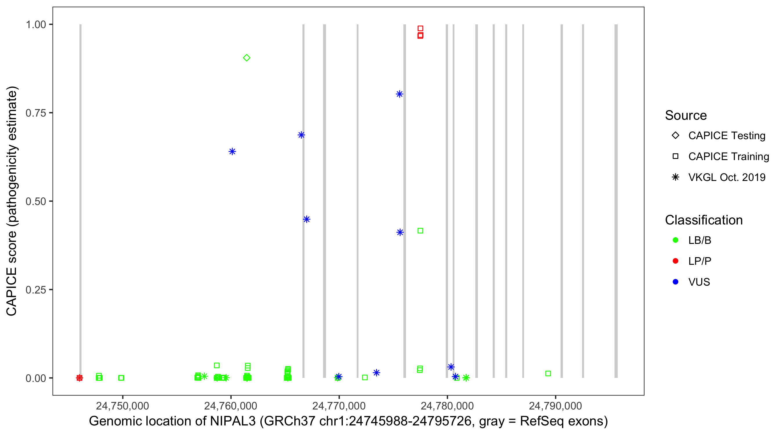 Shown are CAPICE train/test variants plus VKGL Oct 2019.