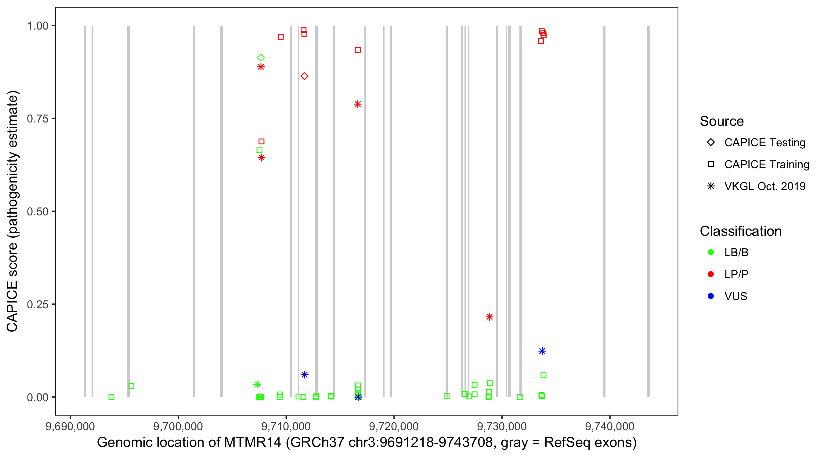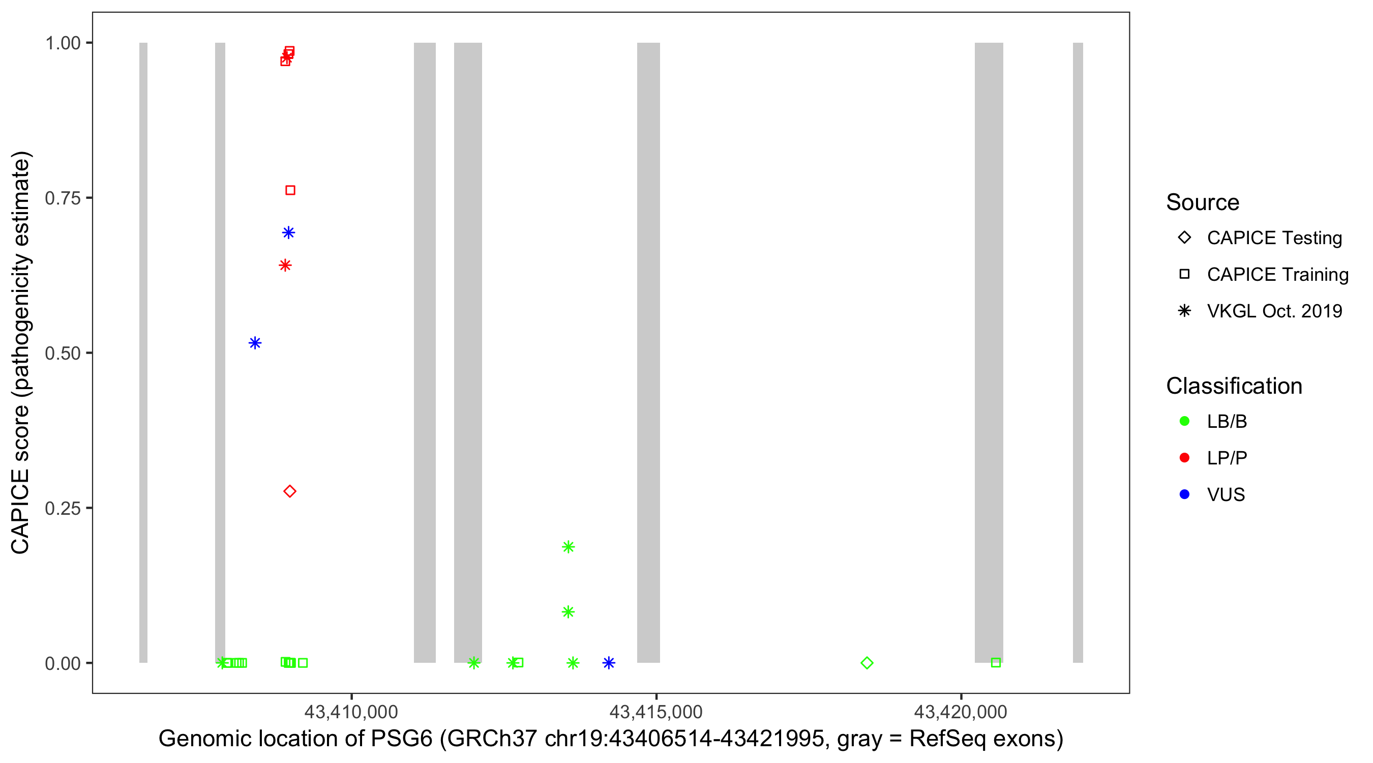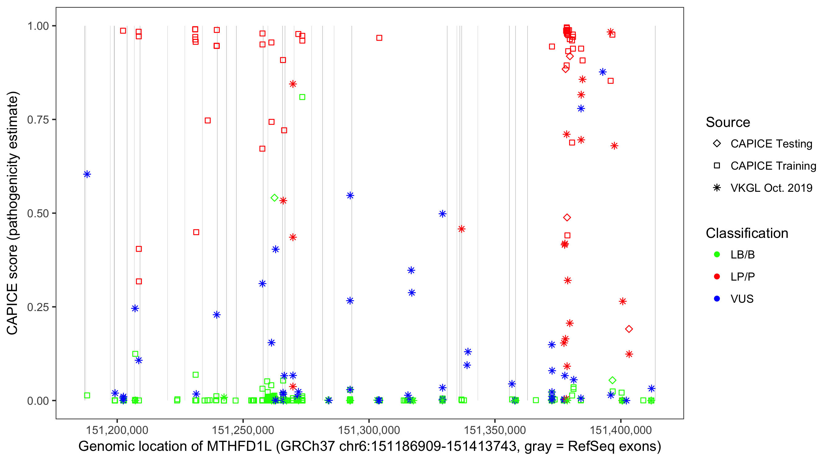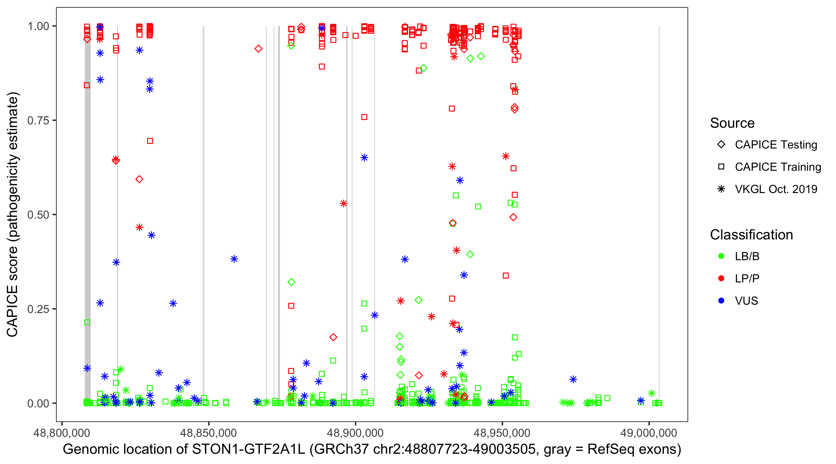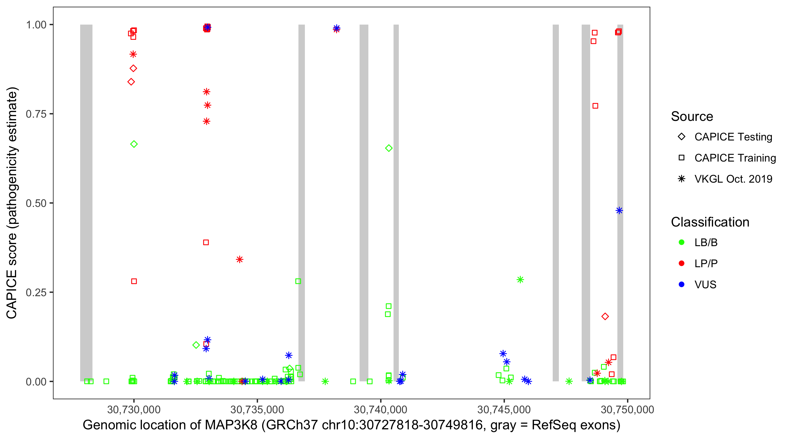 Shown are CAPICE train/test variants plus VKGL Oct 2019.
