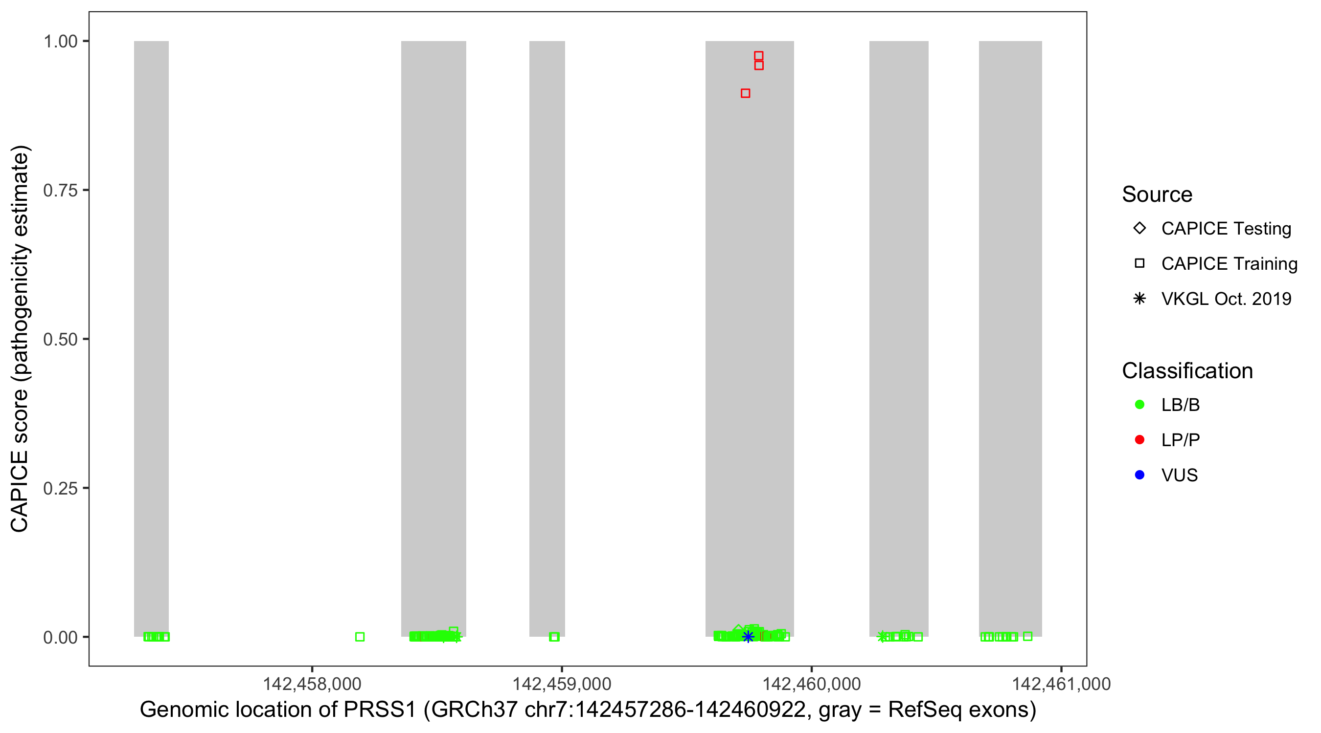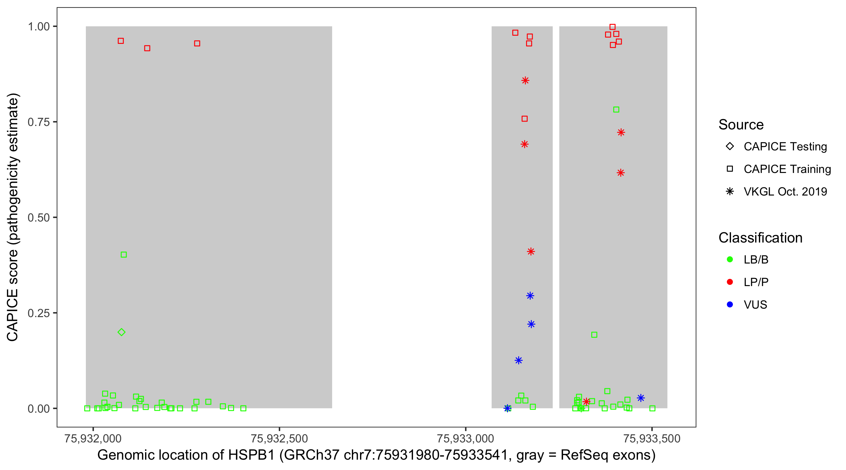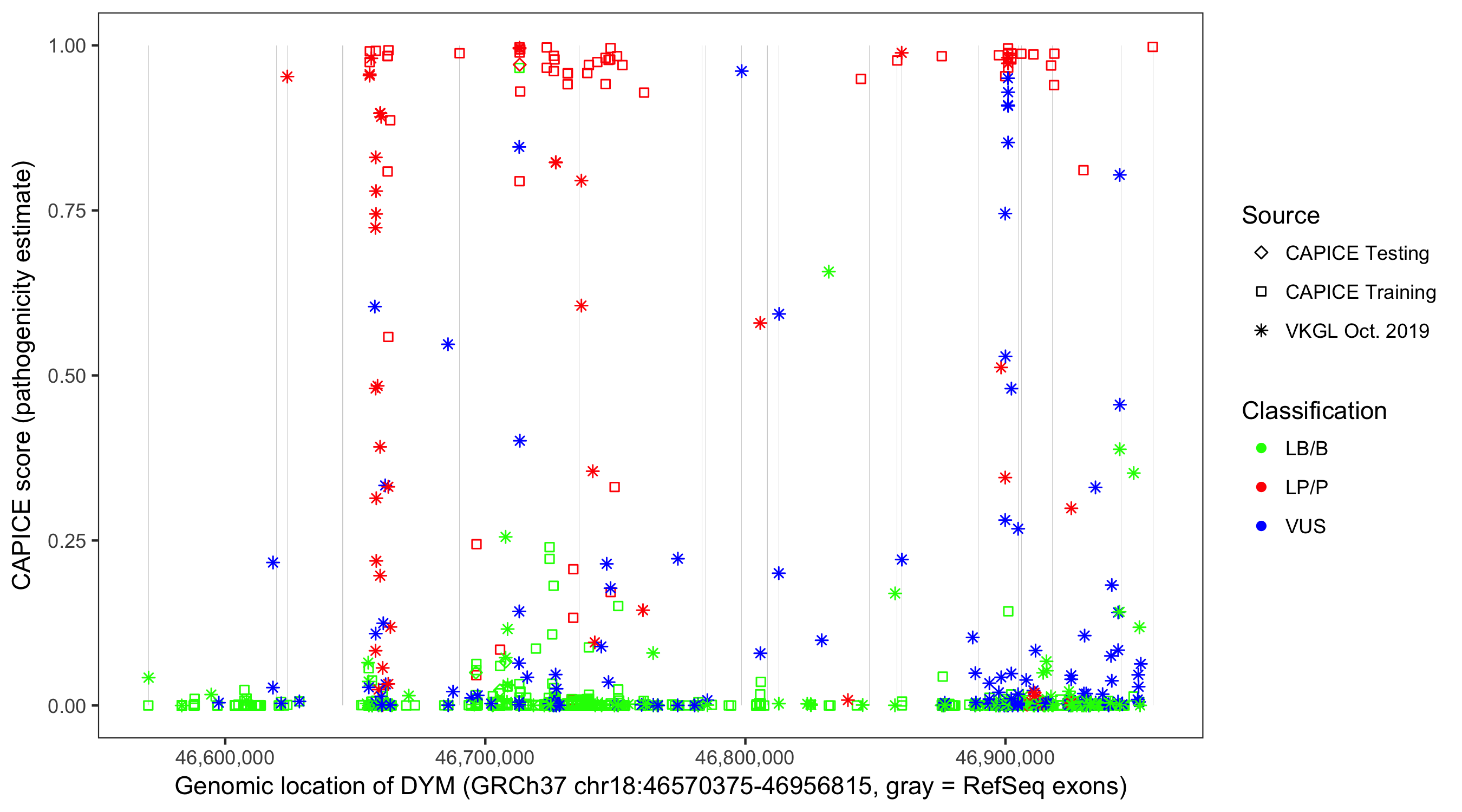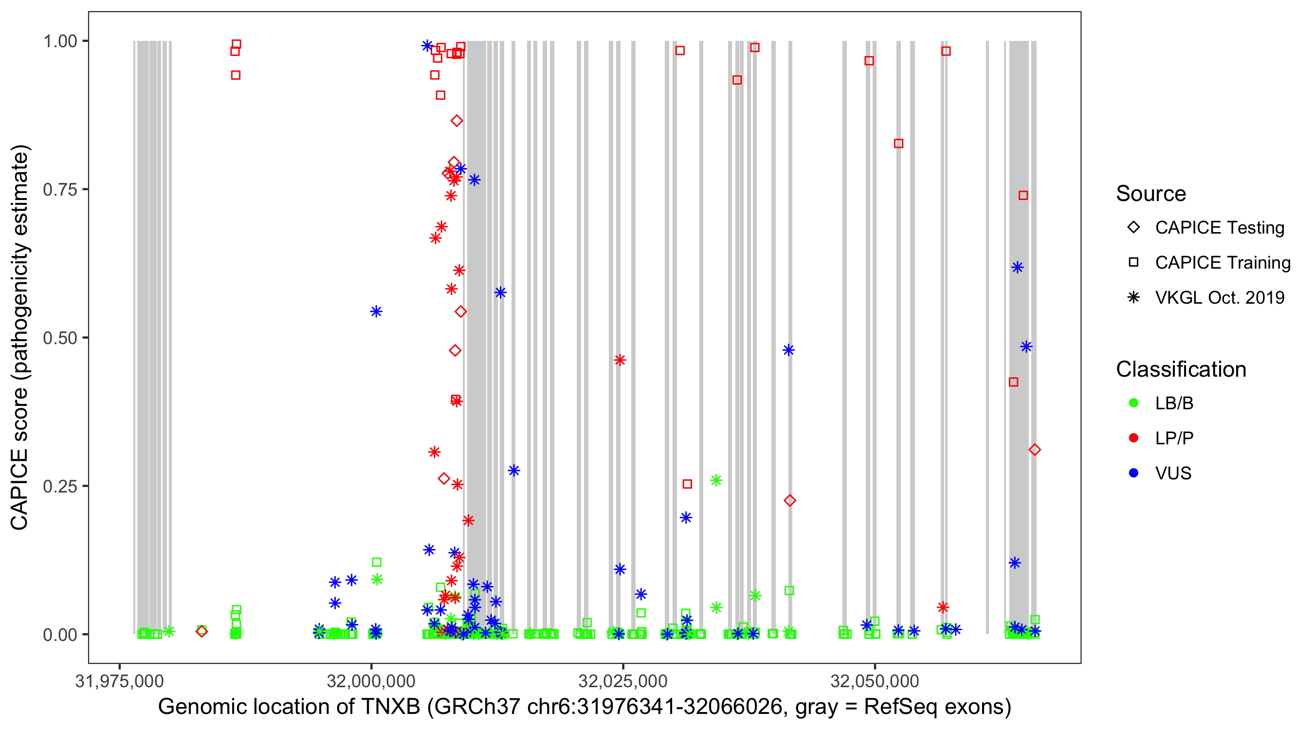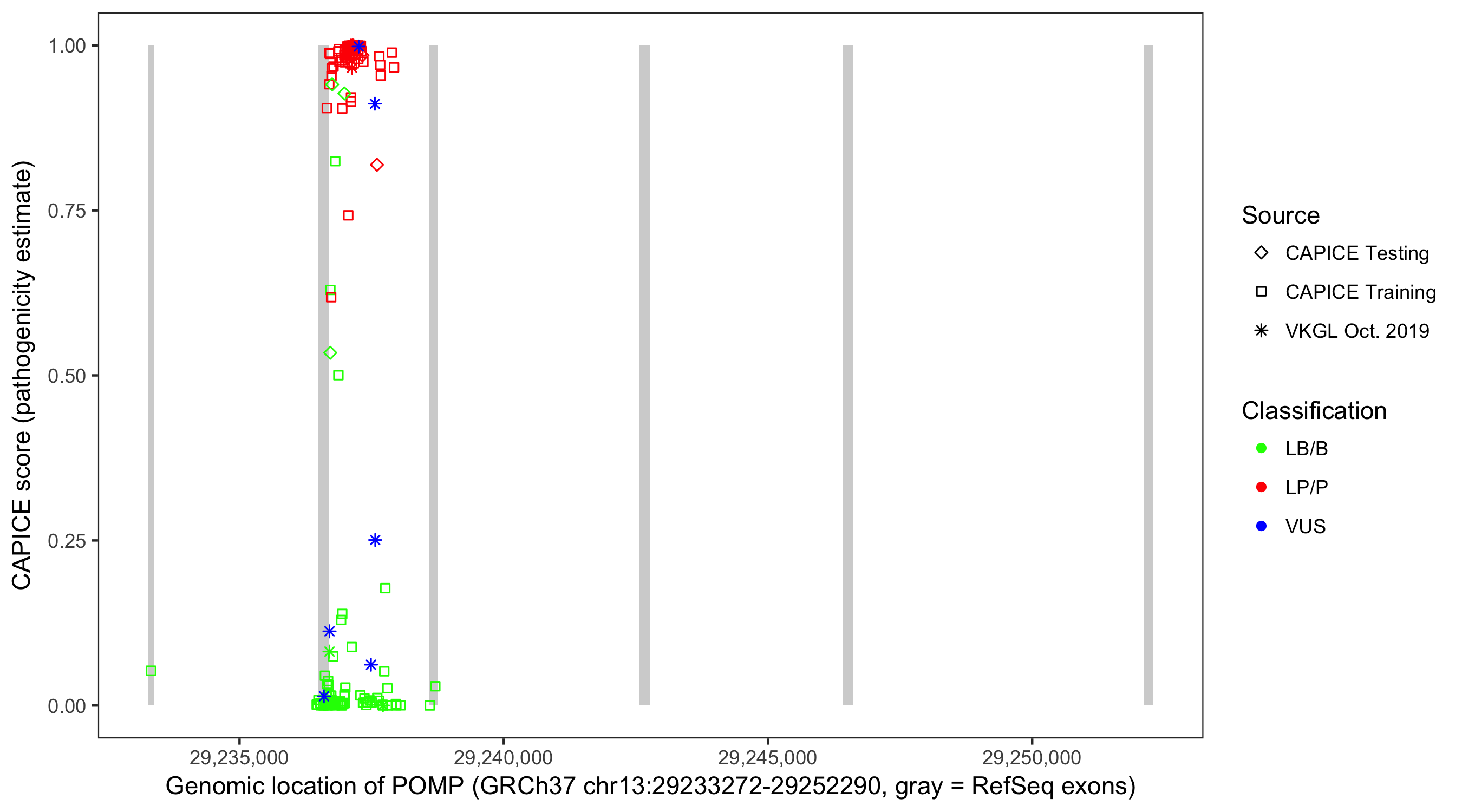 Shown are CAPICE train/test variants plus VKGL Oct 2019.