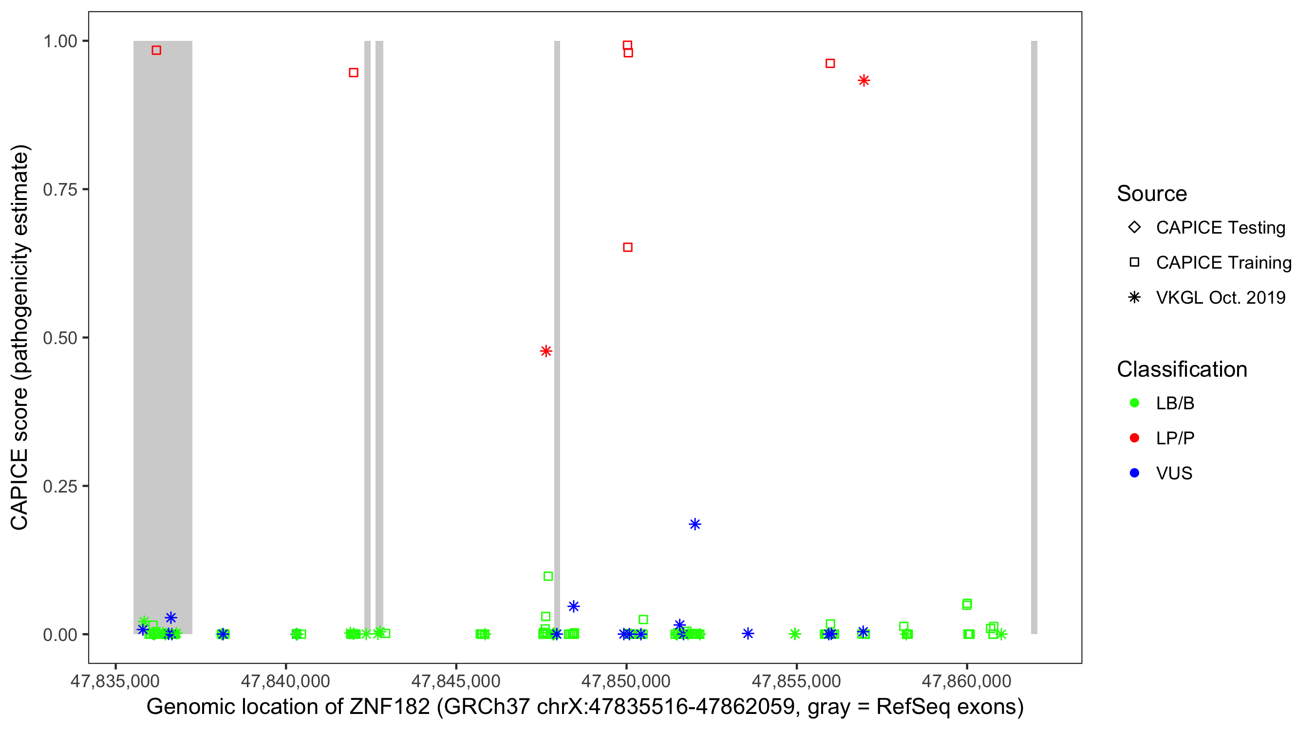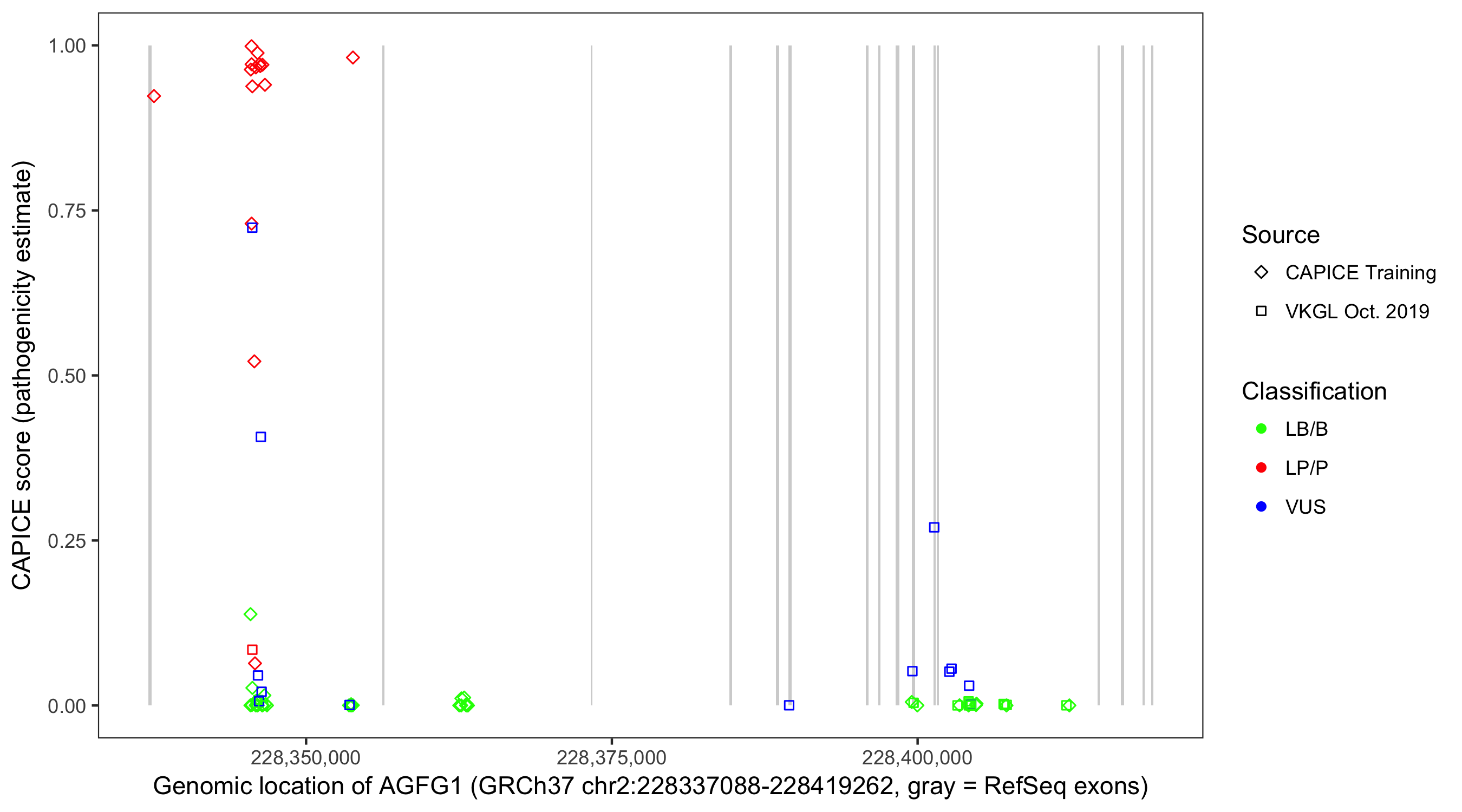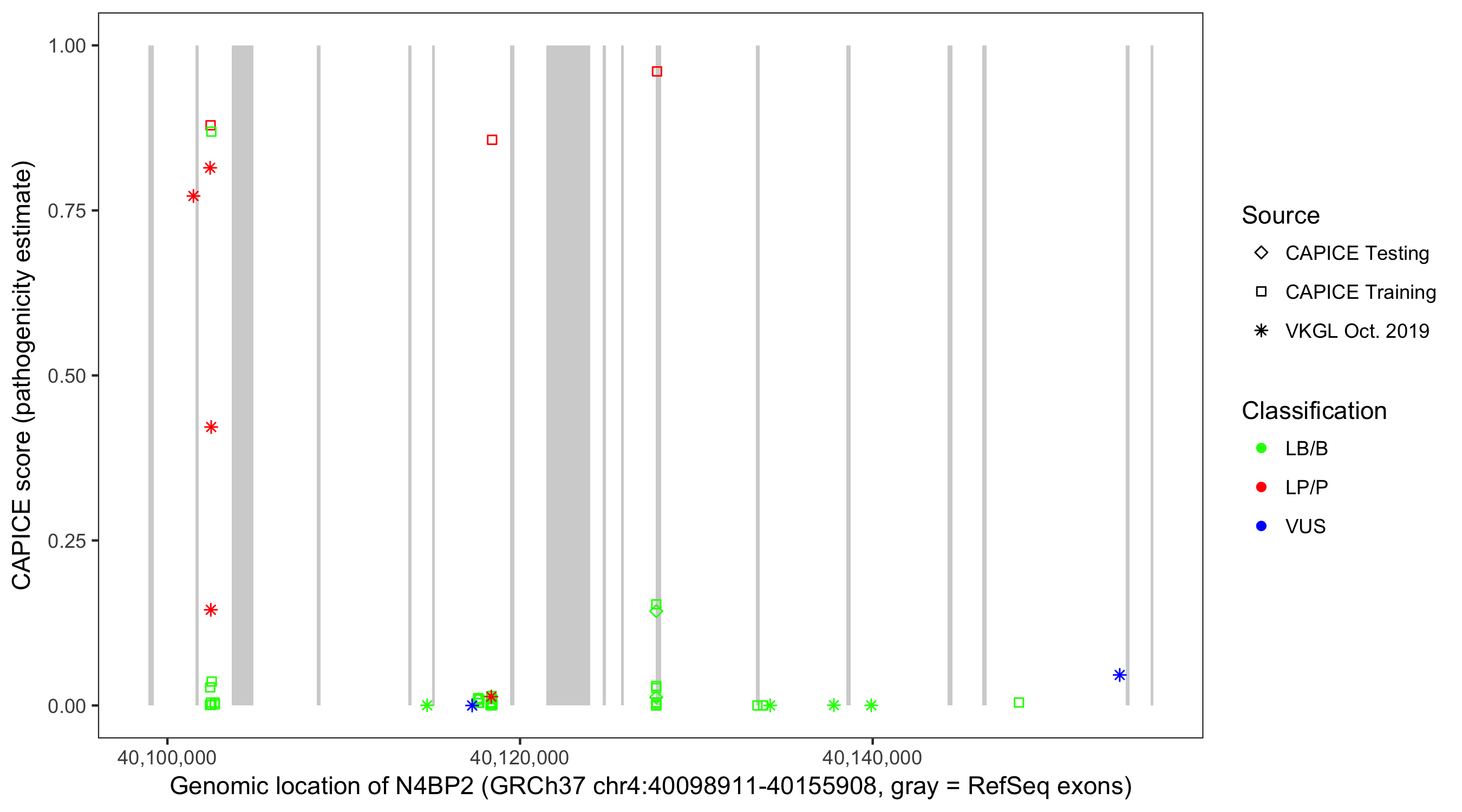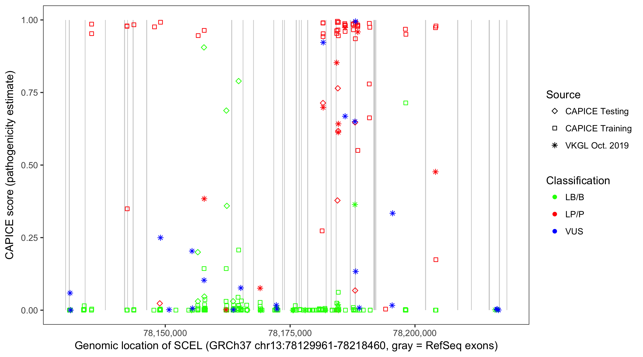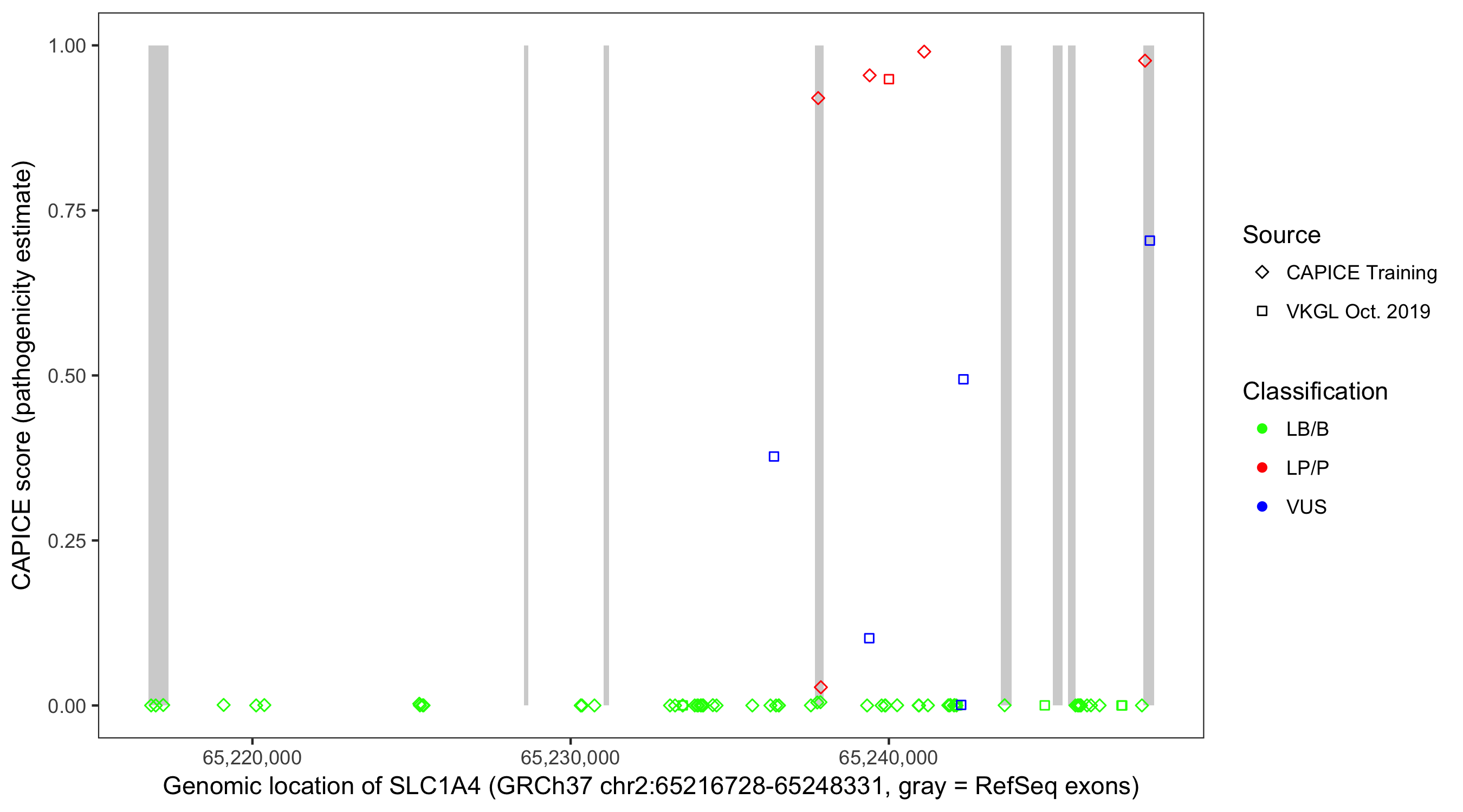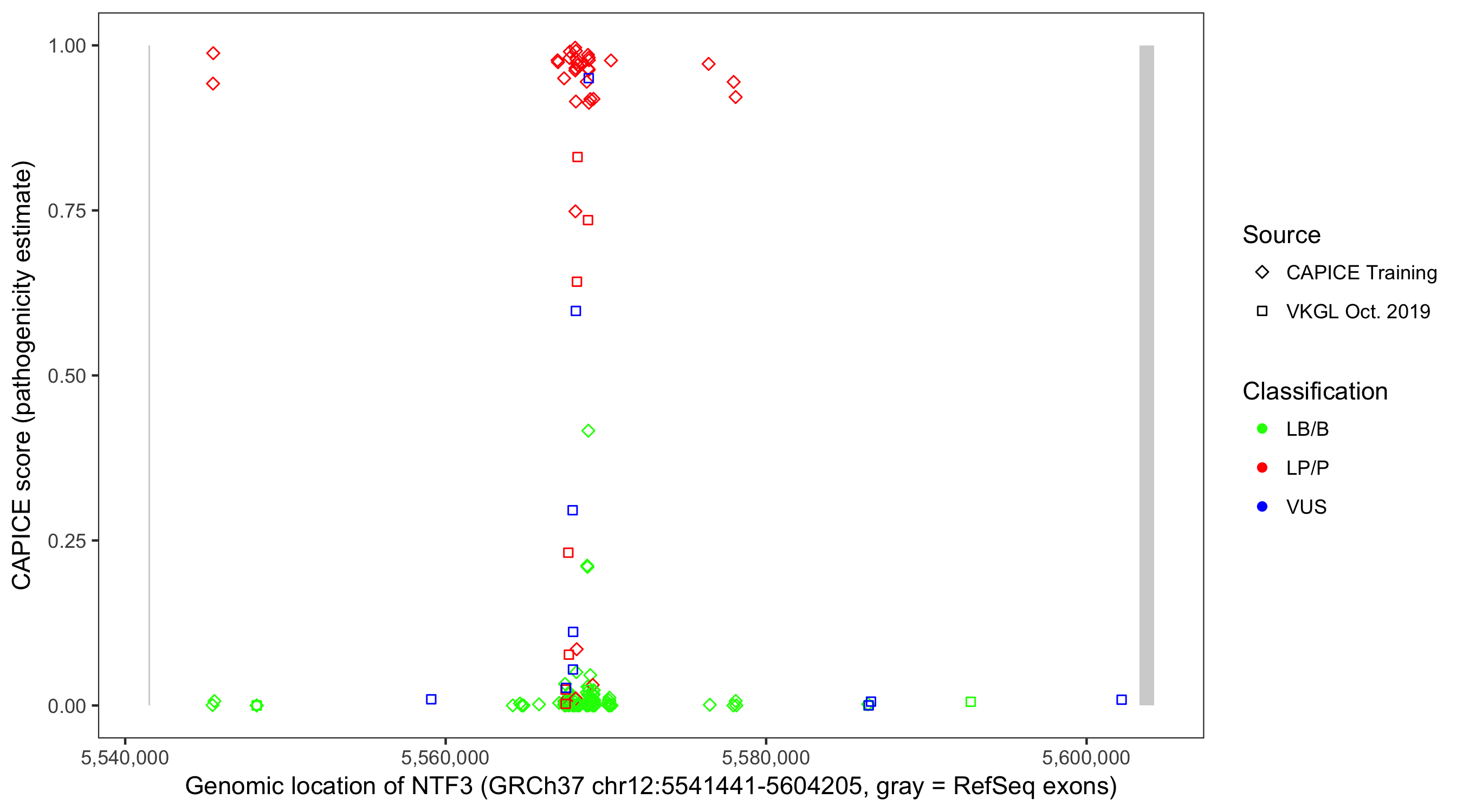 Shown are CAPICE train/test variants plus VKGL Oct 2019.