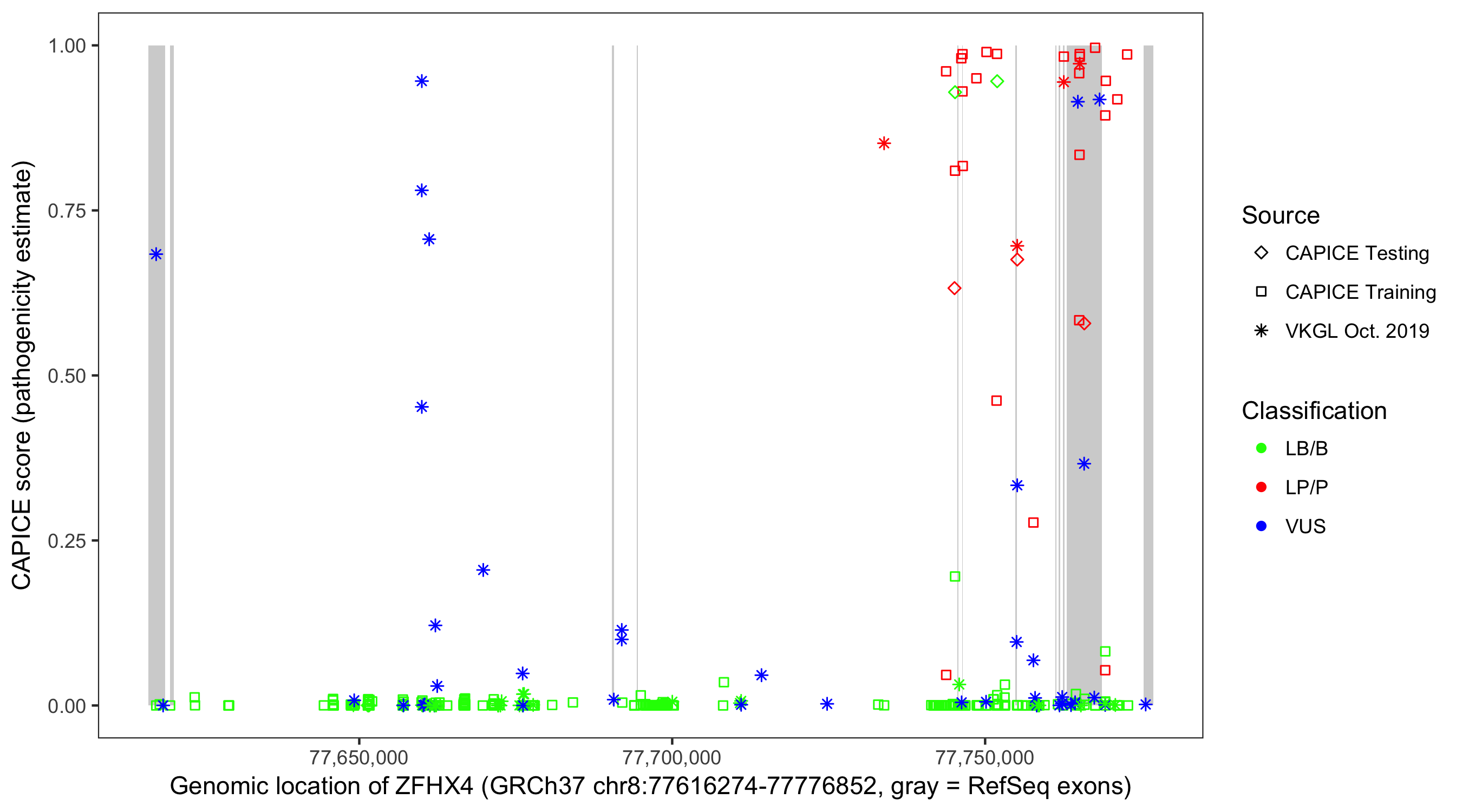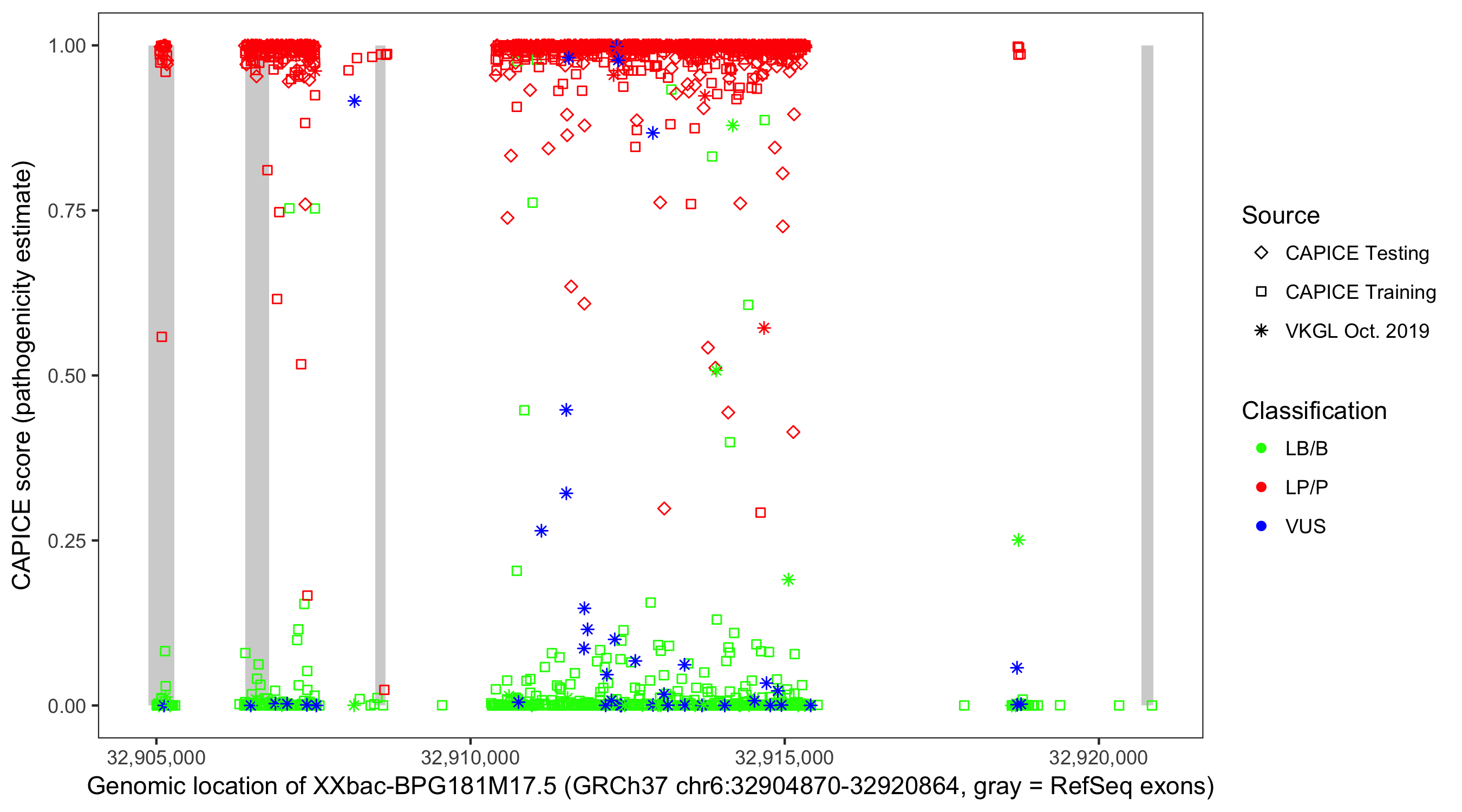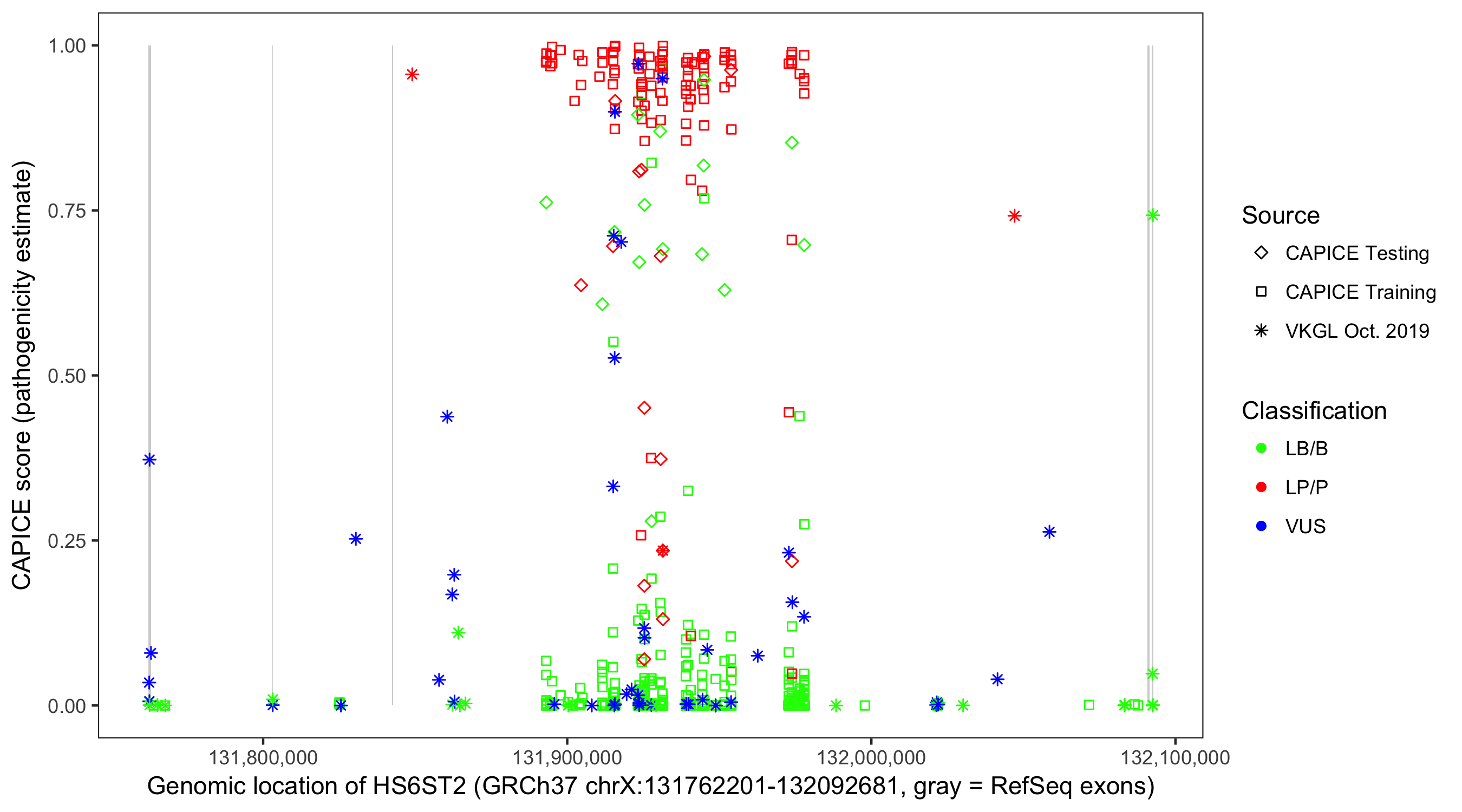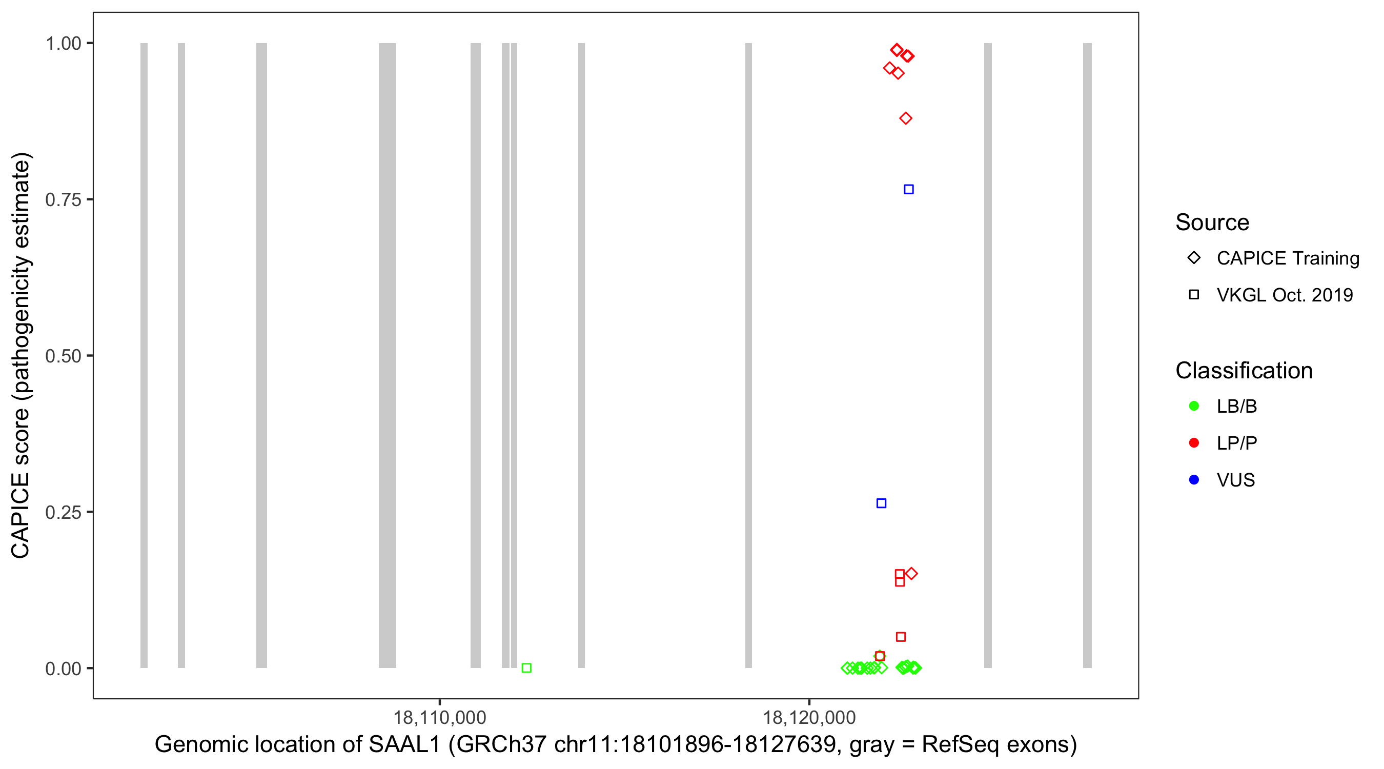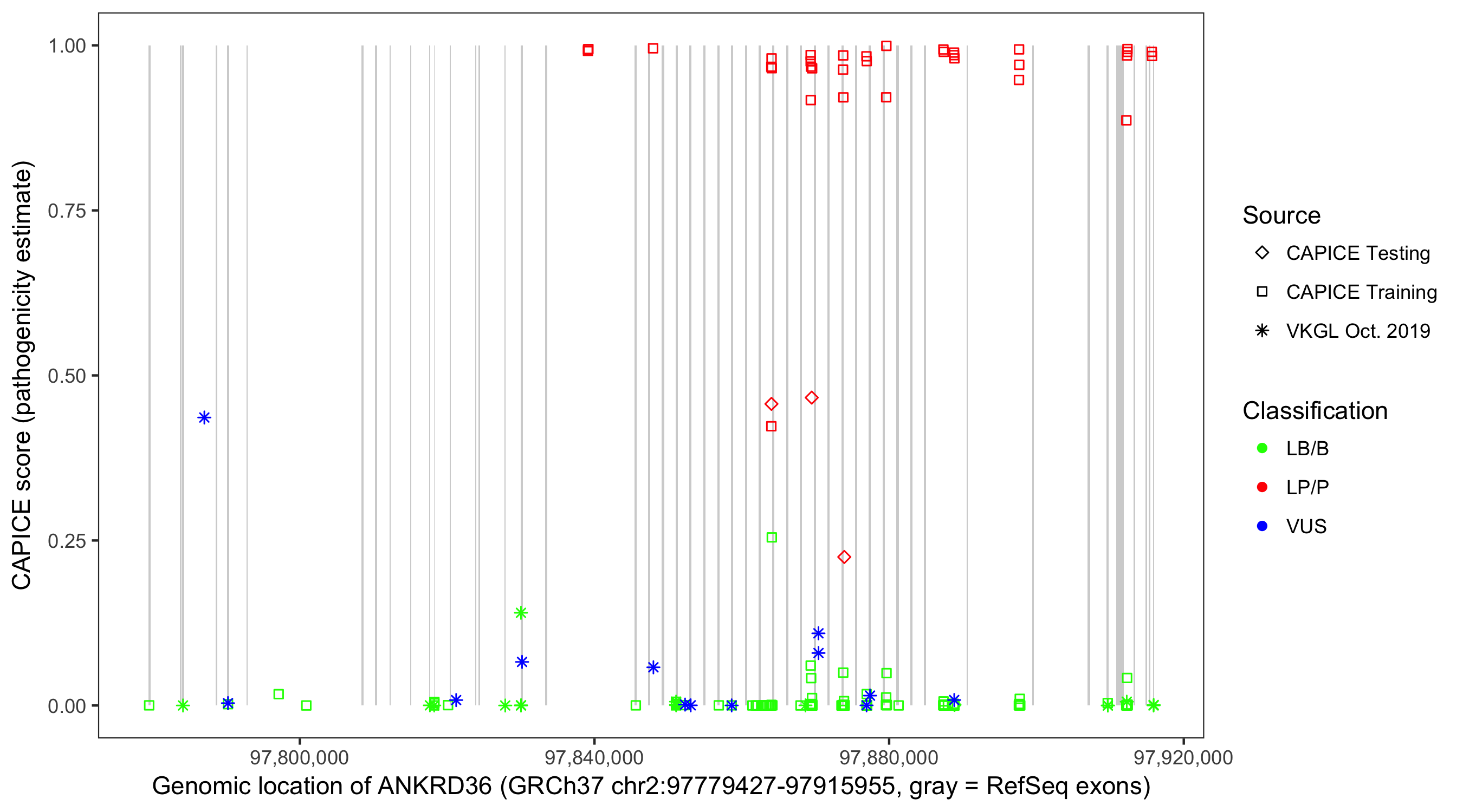 Shown are CAPICE train/test variants plus VKGL Oct 2019.
