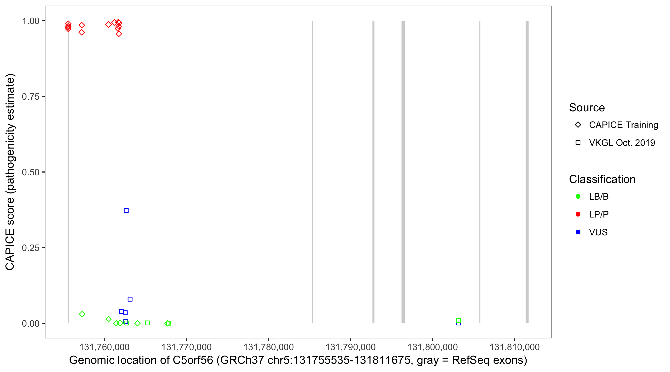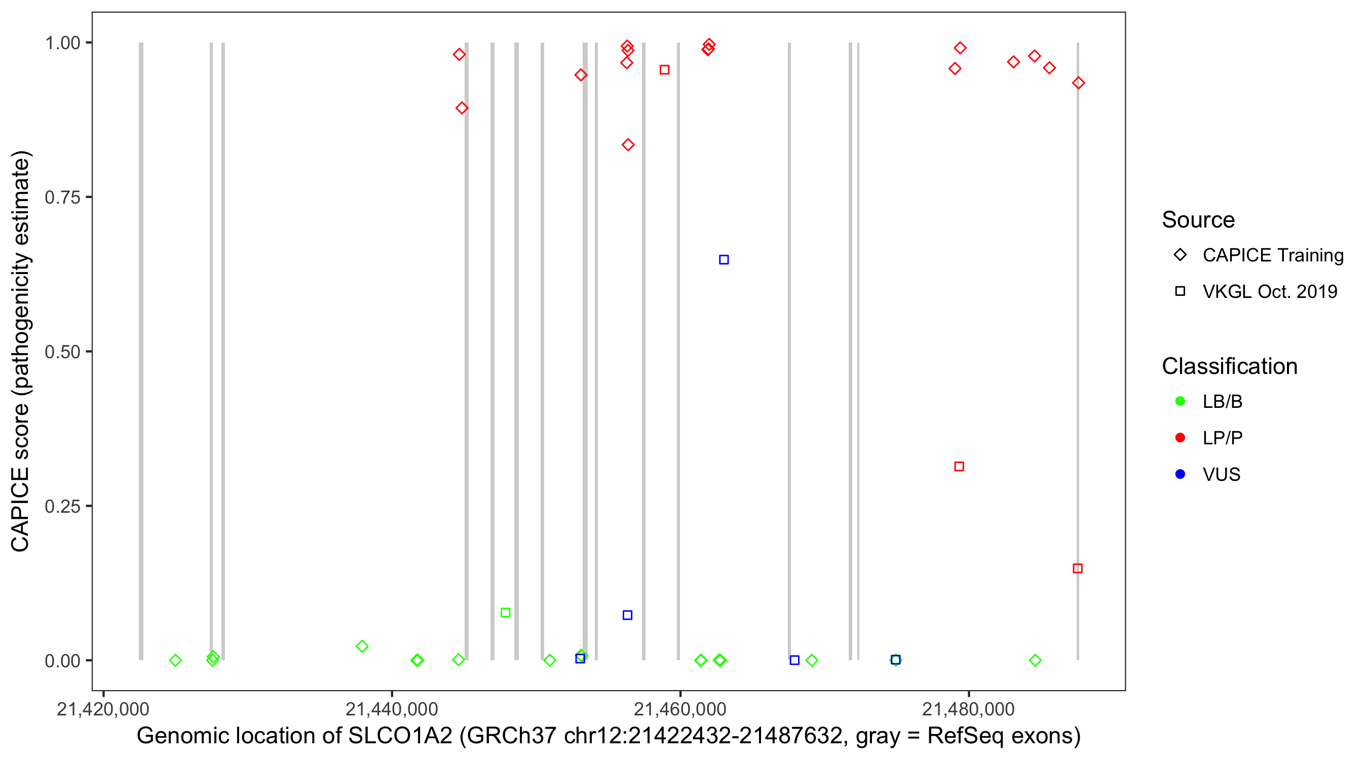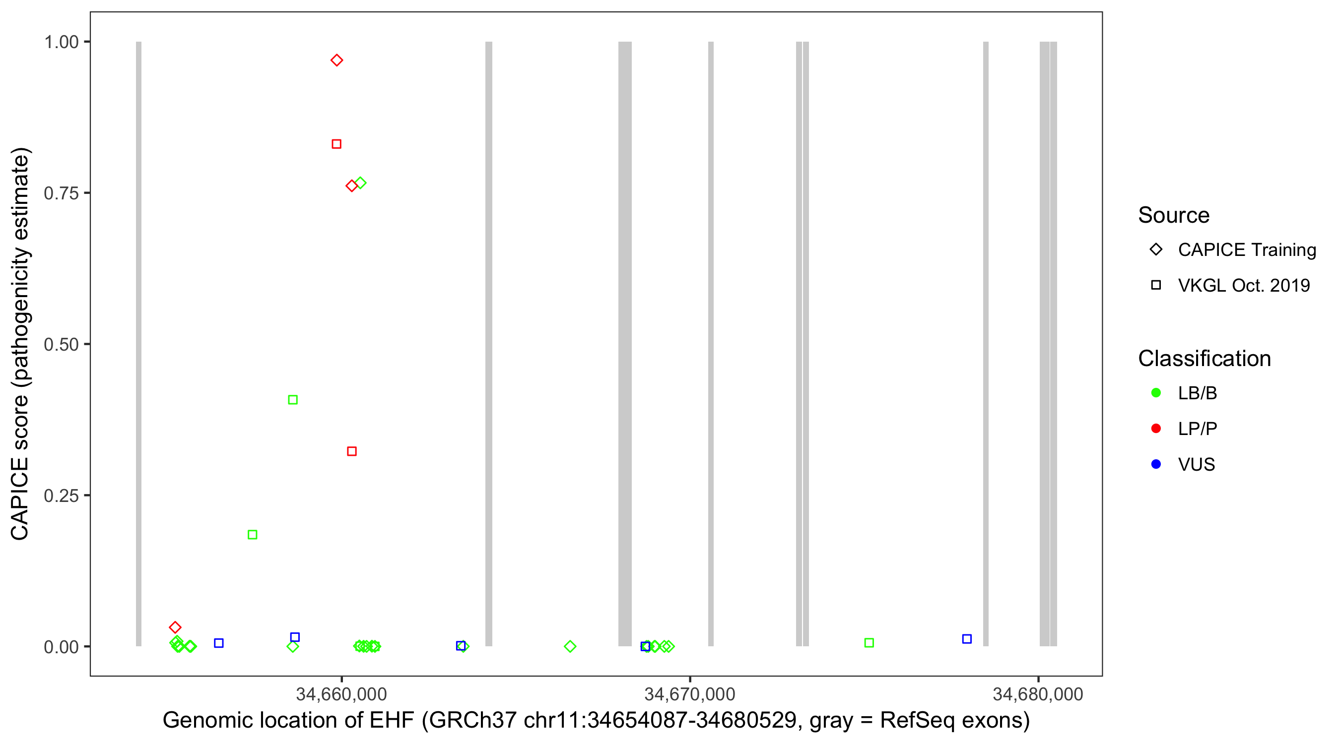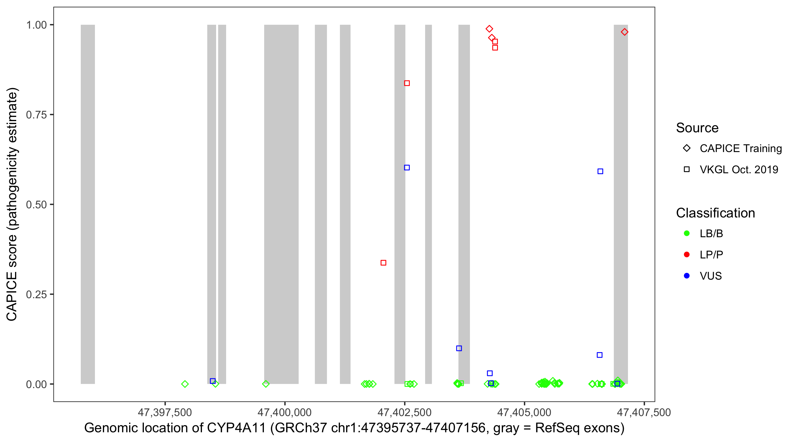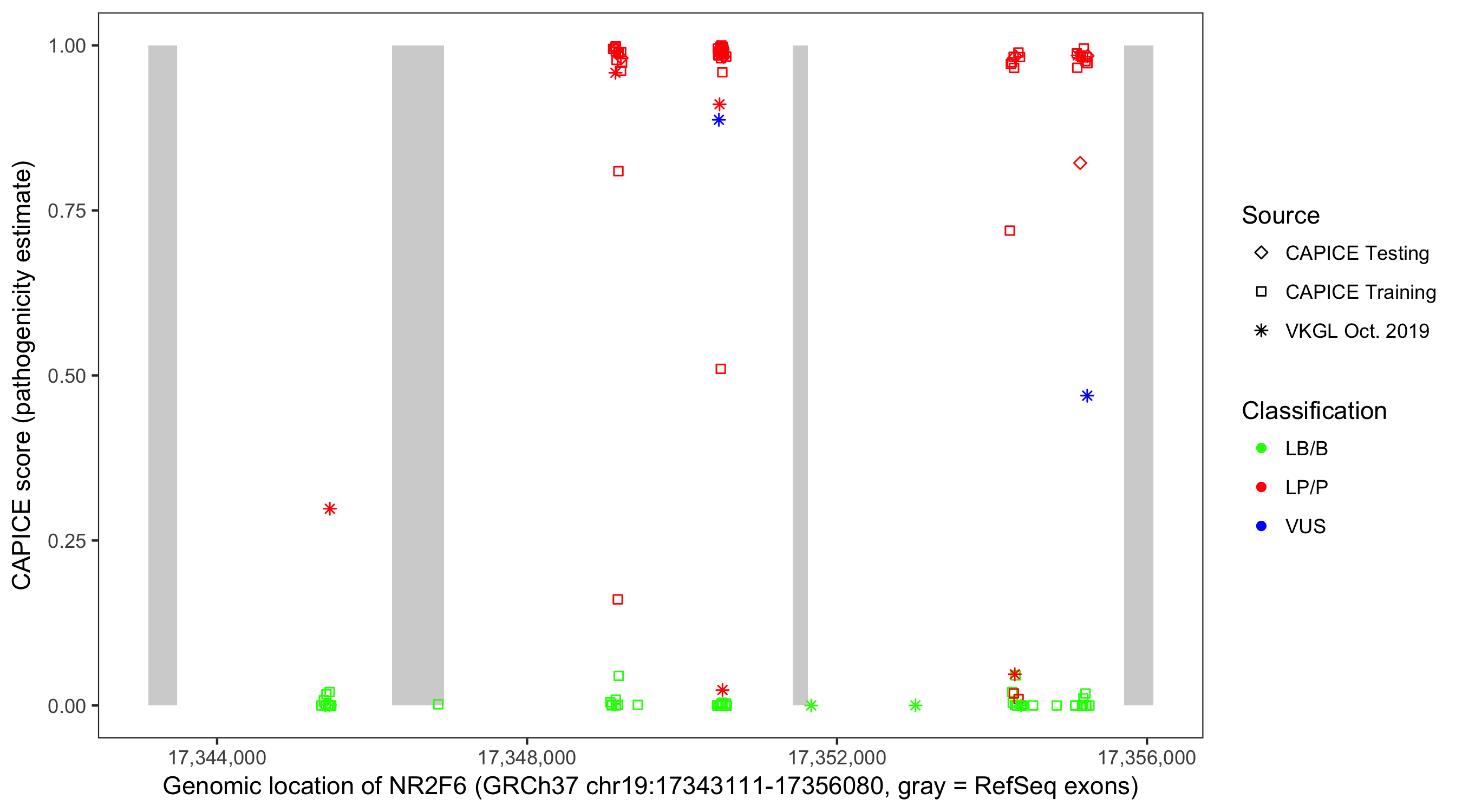 Shown are CAPICE train/test variants plus VKGL Oct 2019.