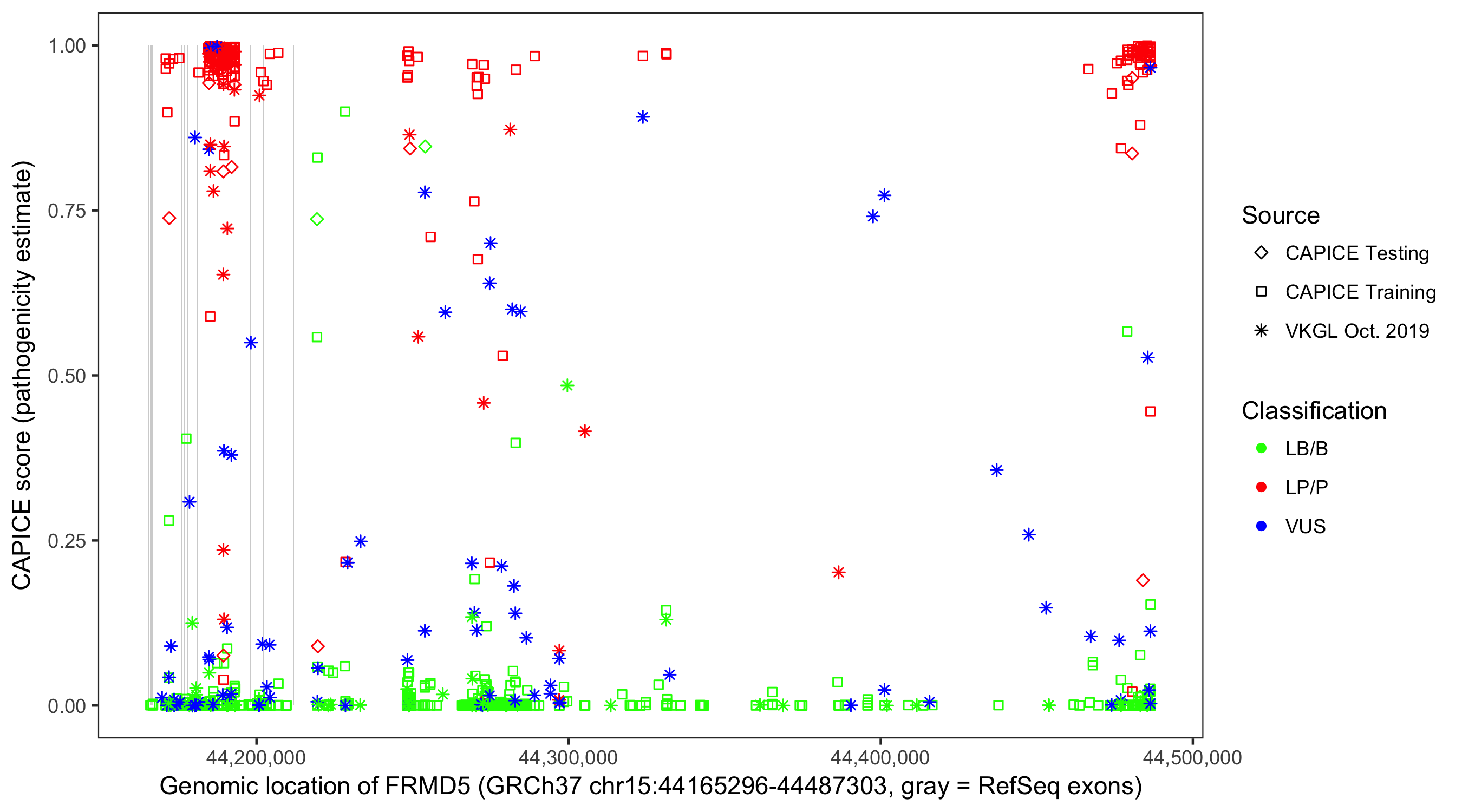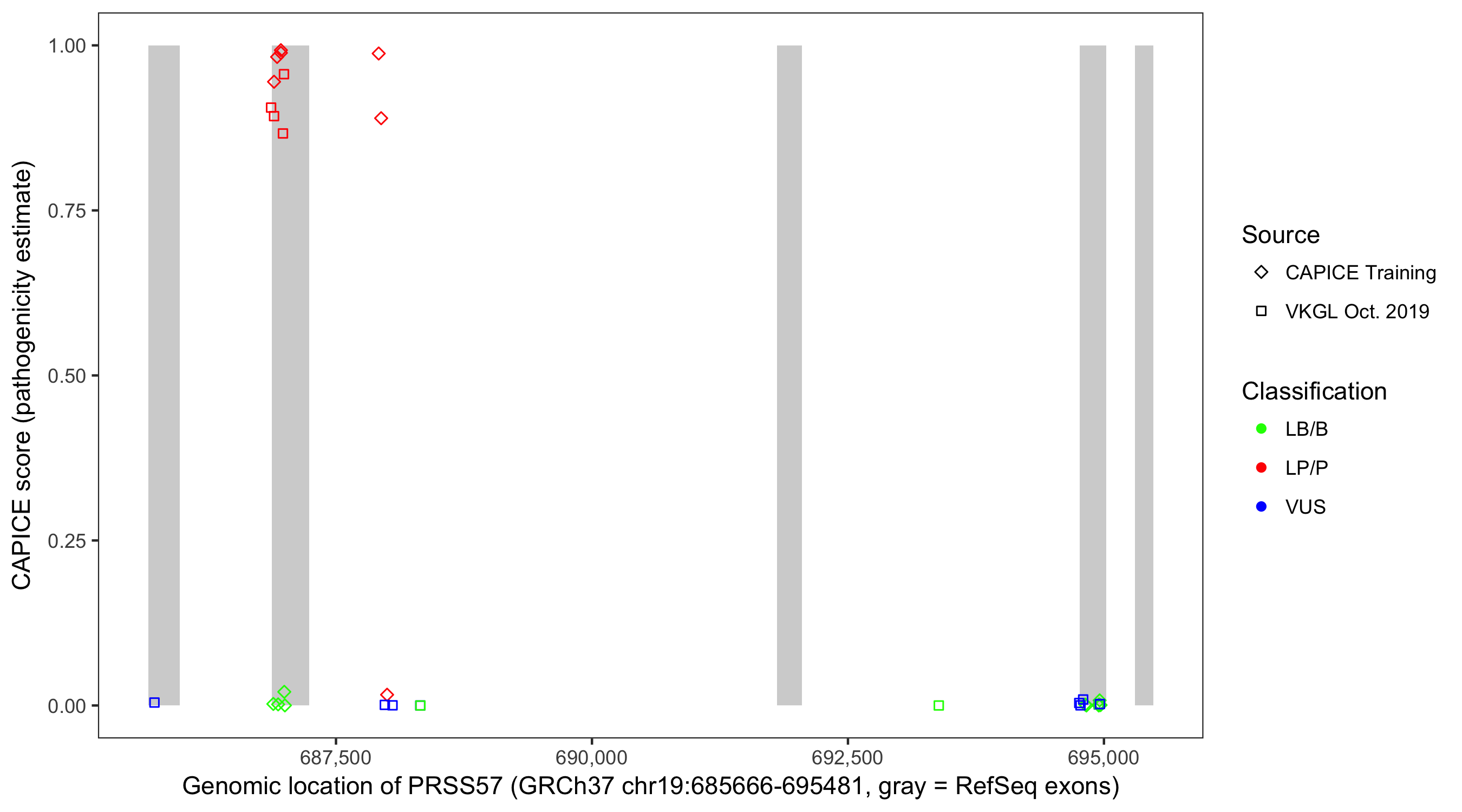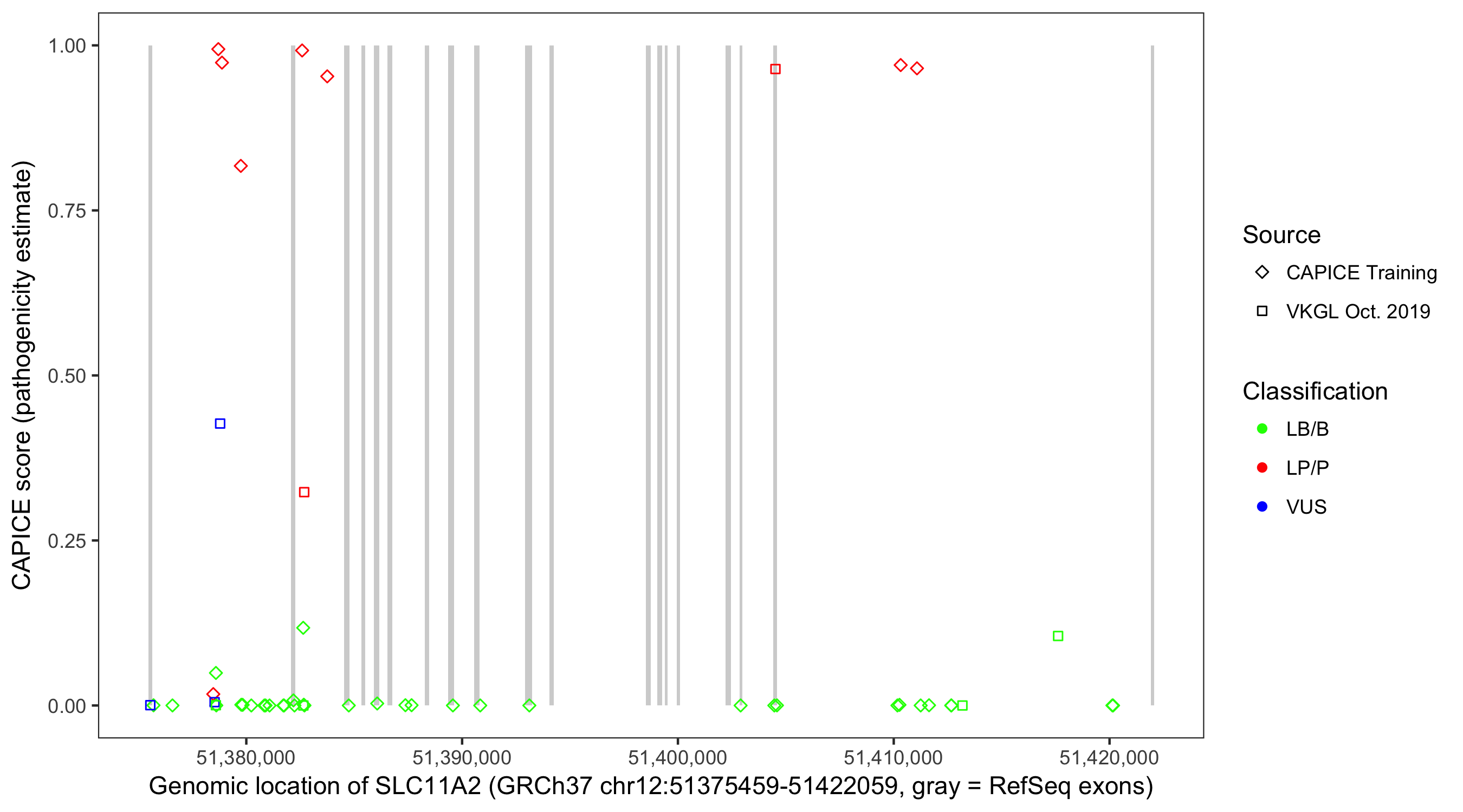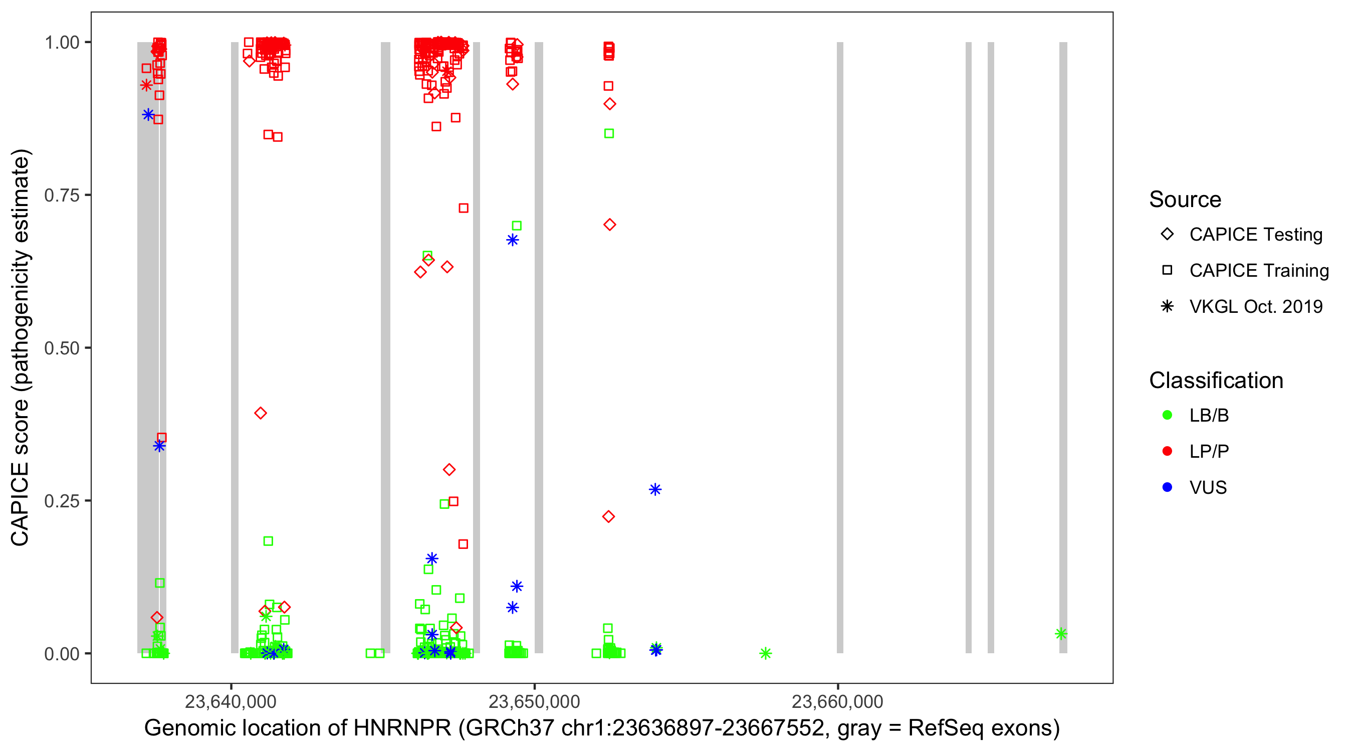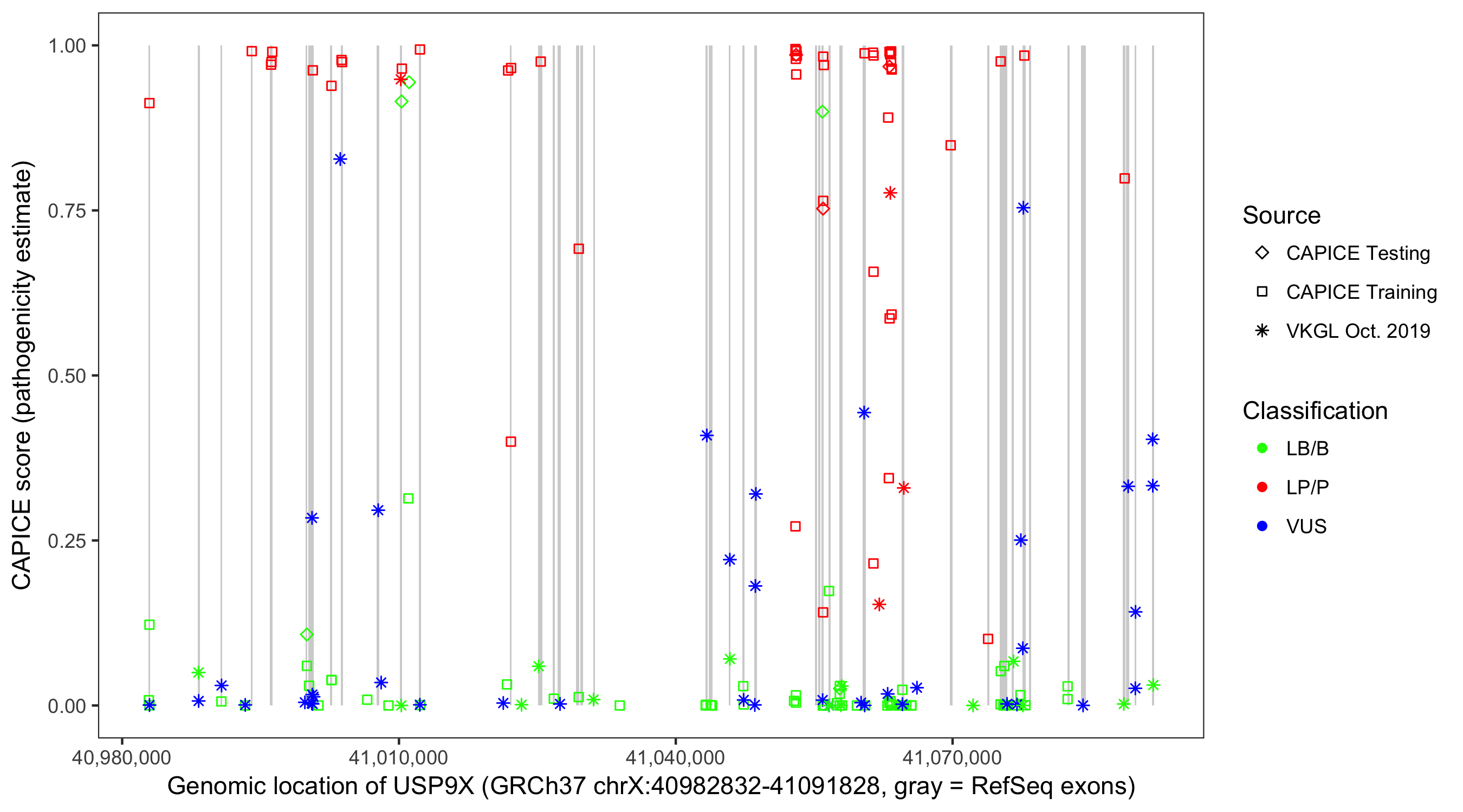 Shown are CAPICE train/test variants plus VKGL Oct 2019.