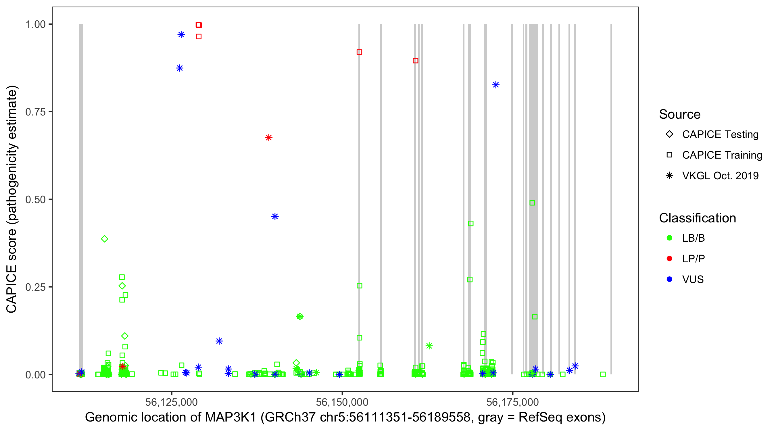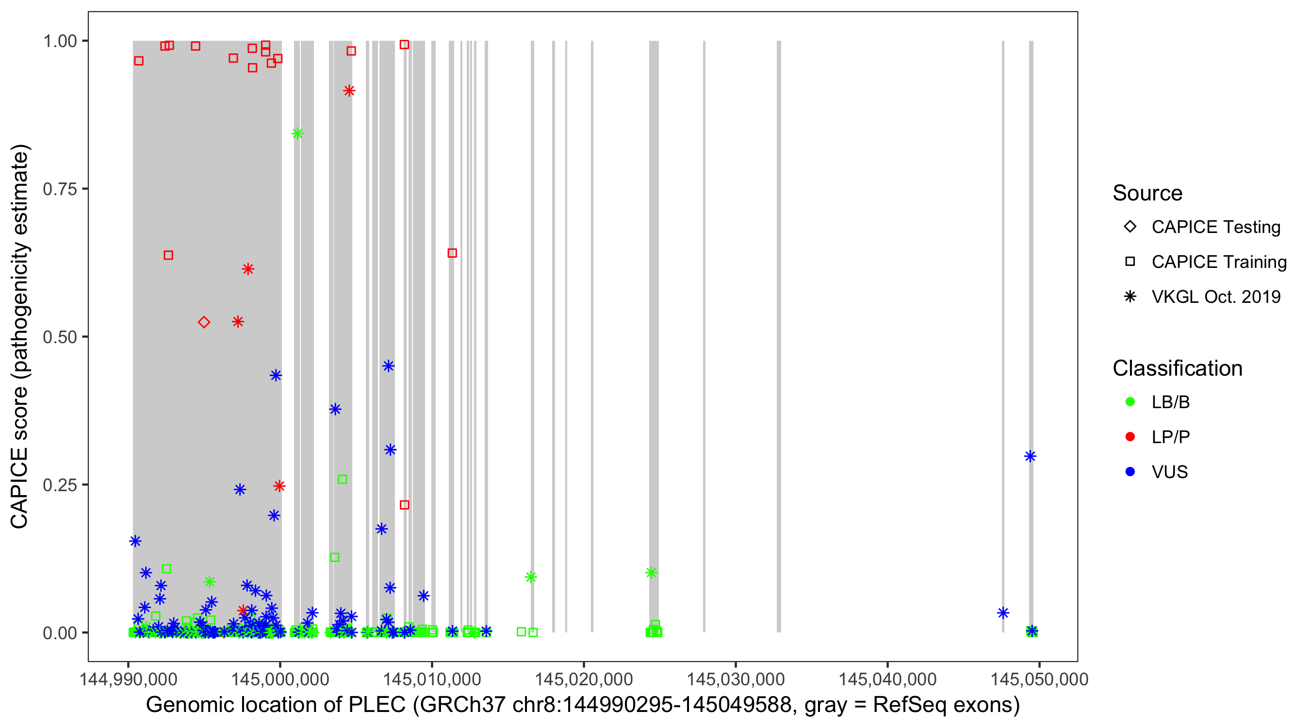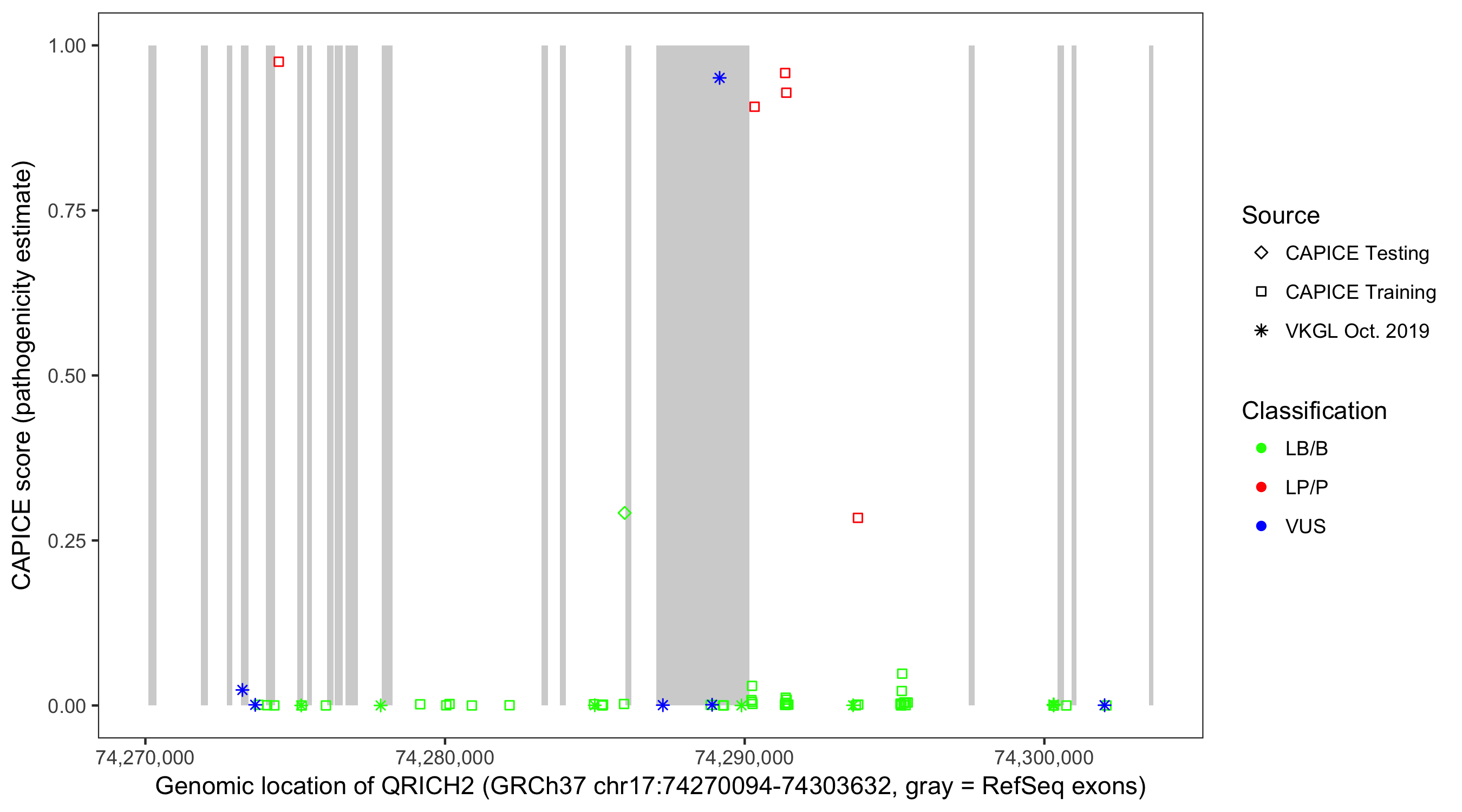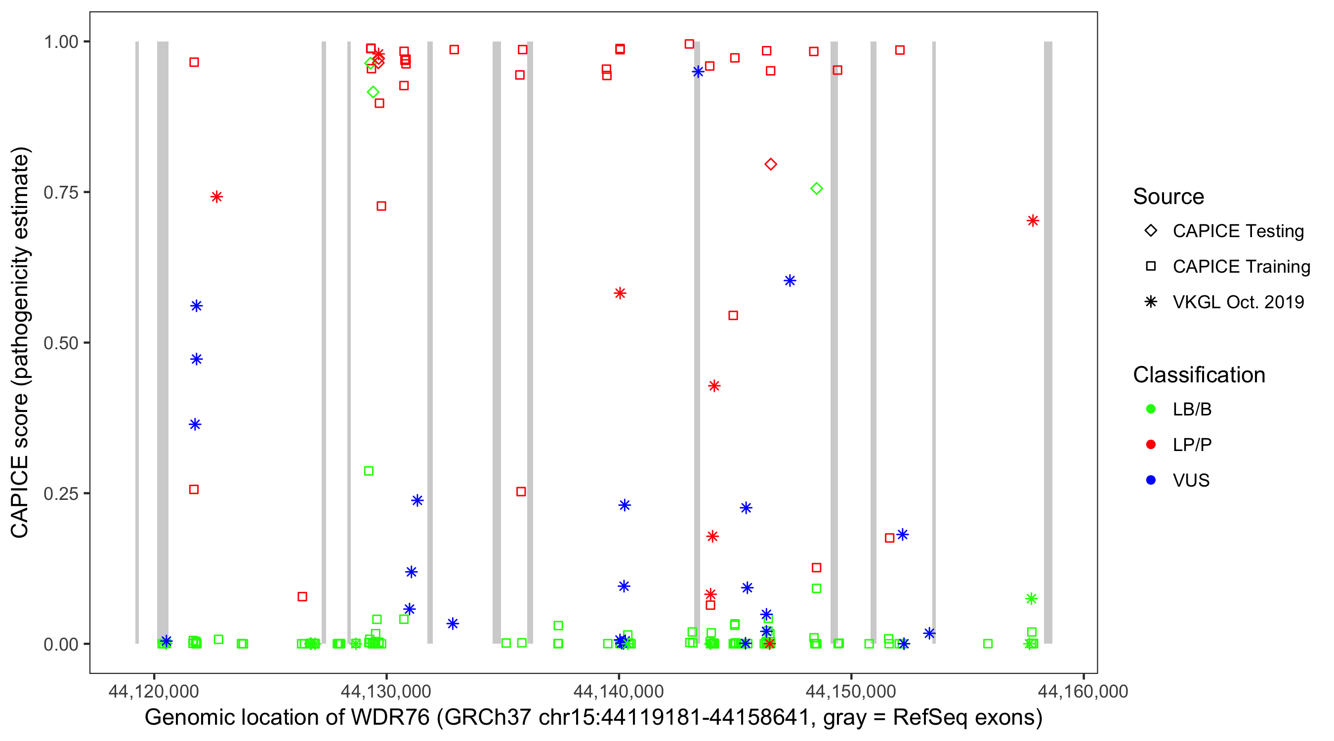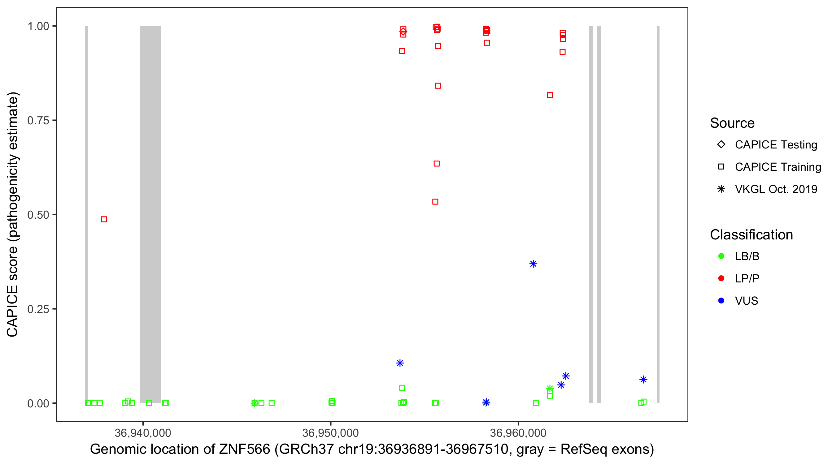 Shown are CAPICE train/test variants plus VKGL Oct 2019.