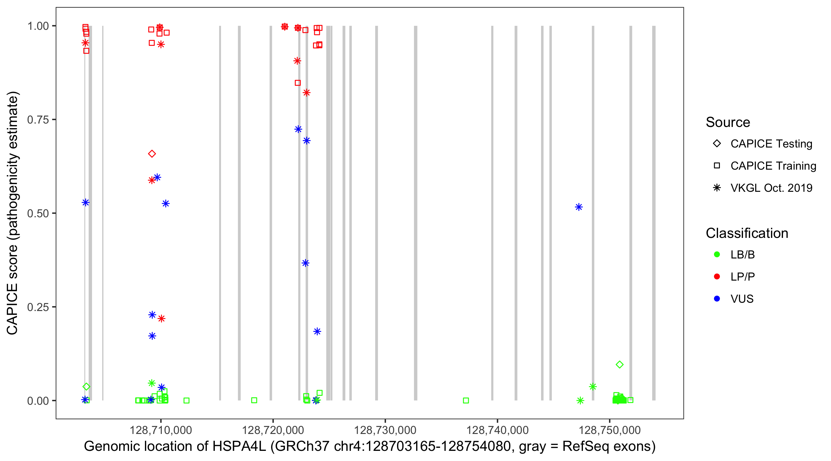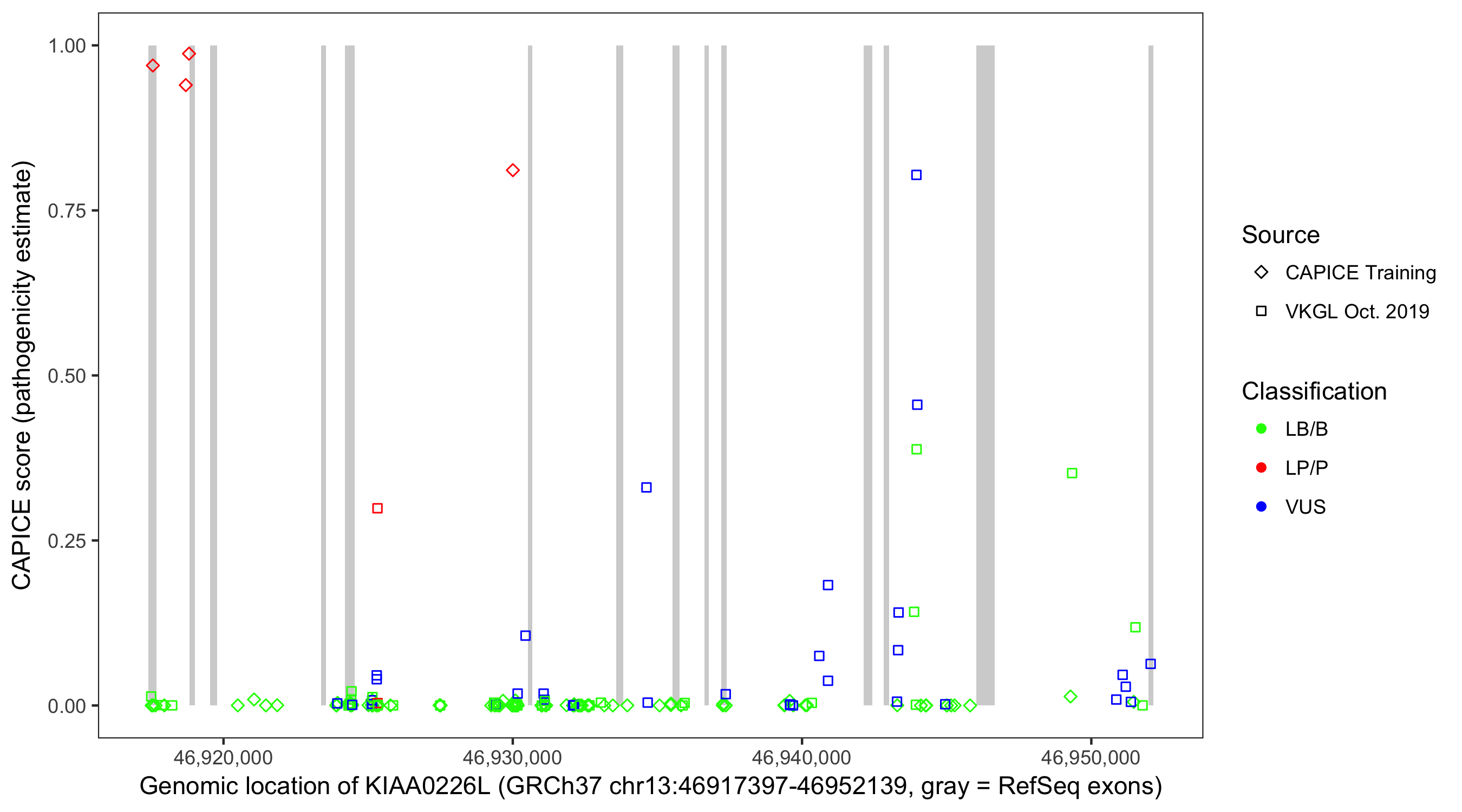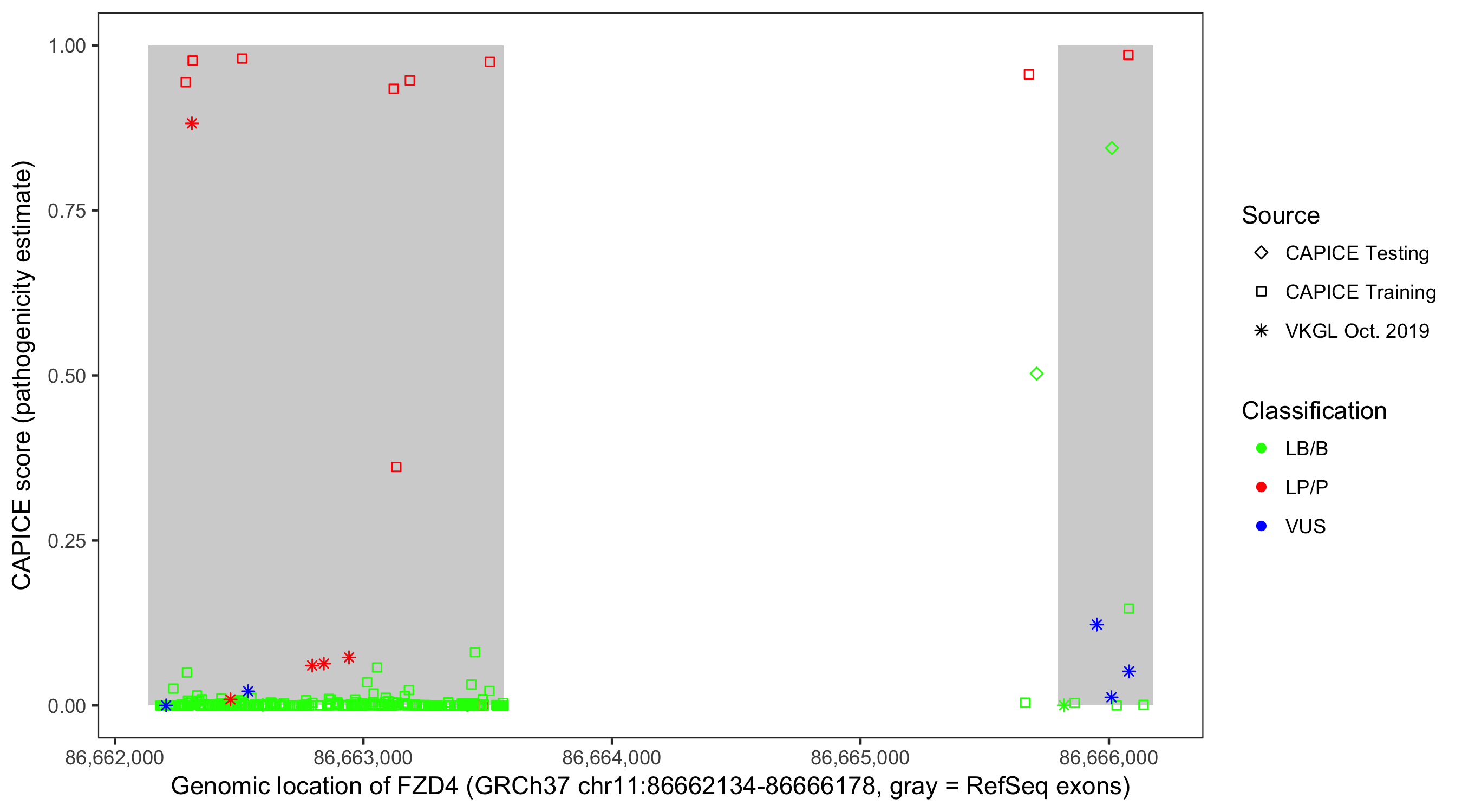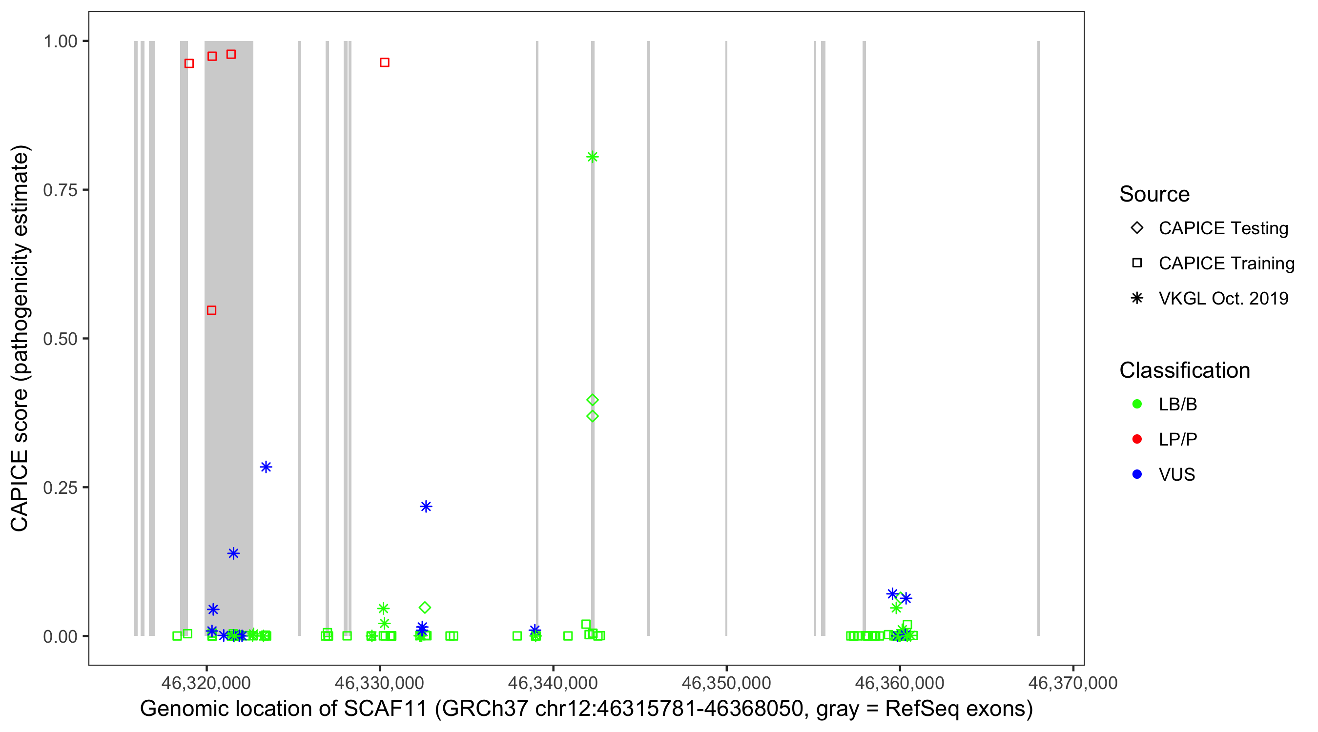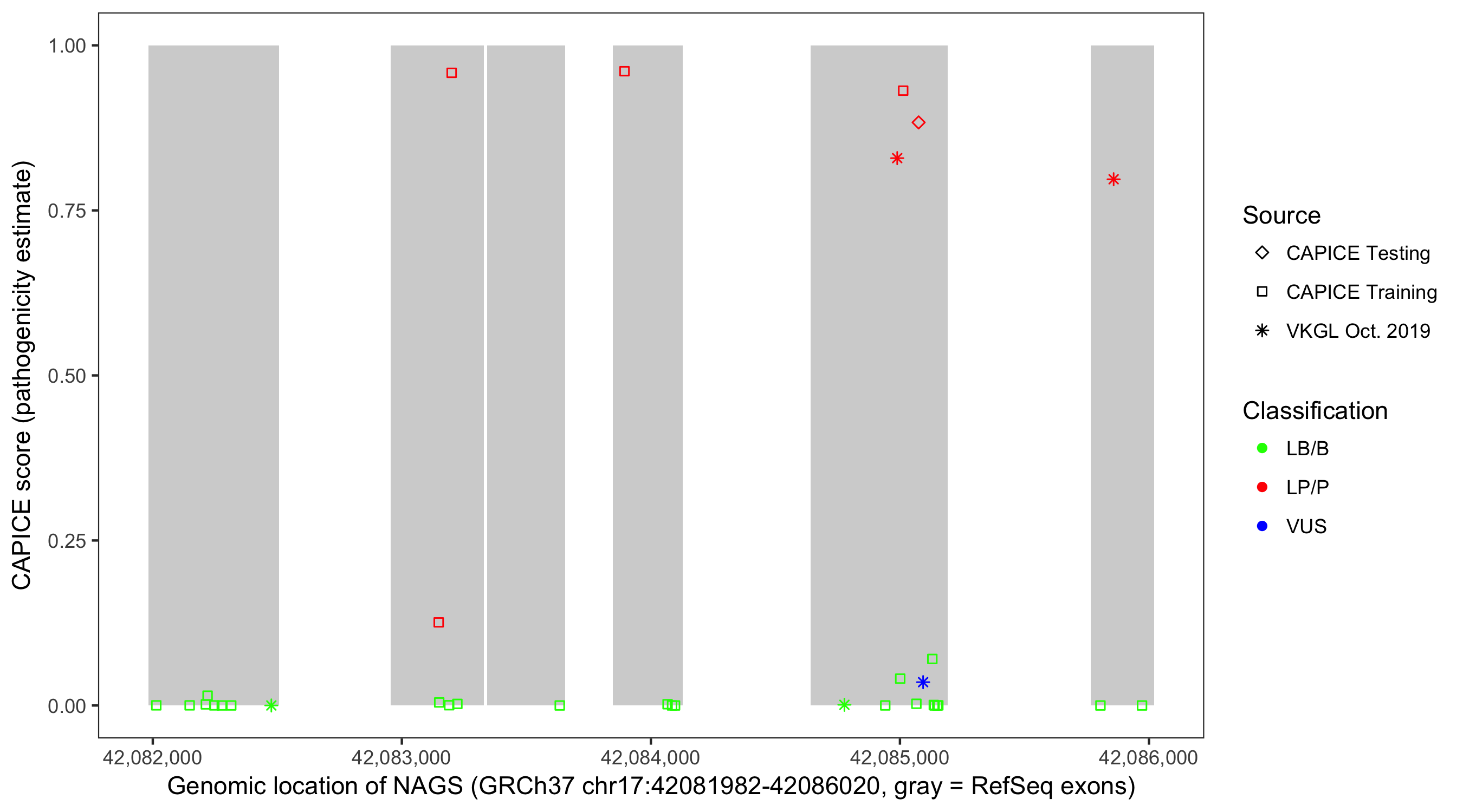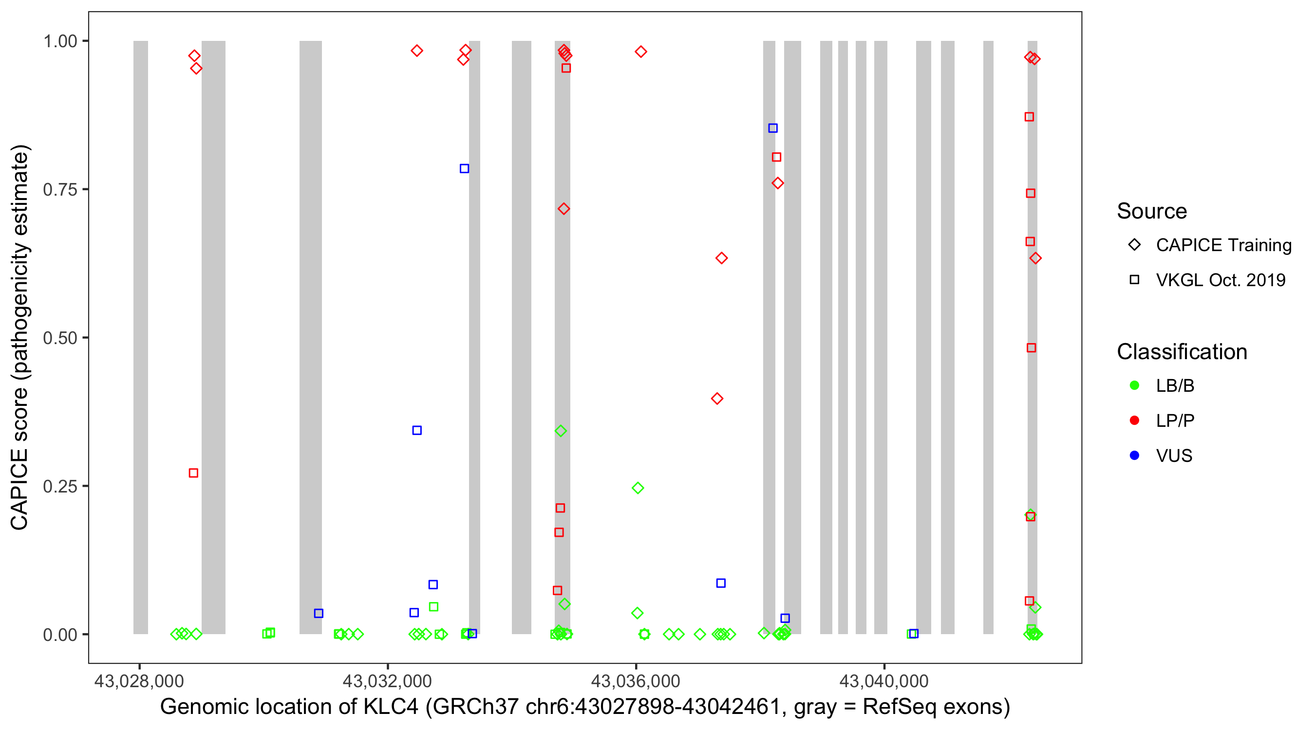 Shown are CAPICE train/test variants plus VKGL Oct 2019.
