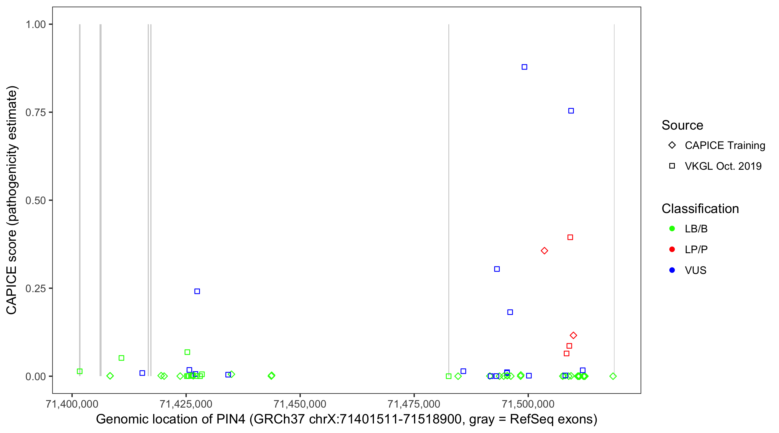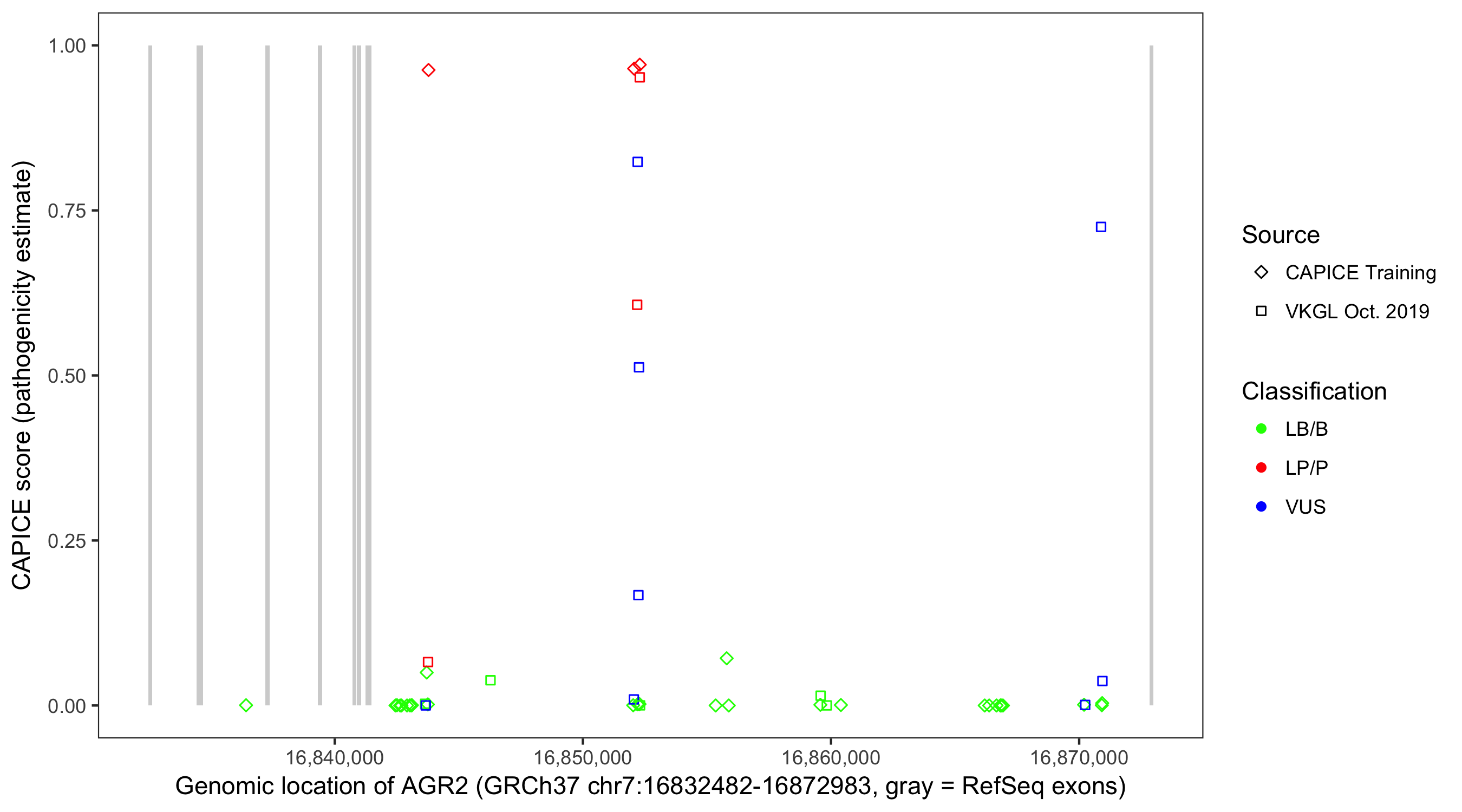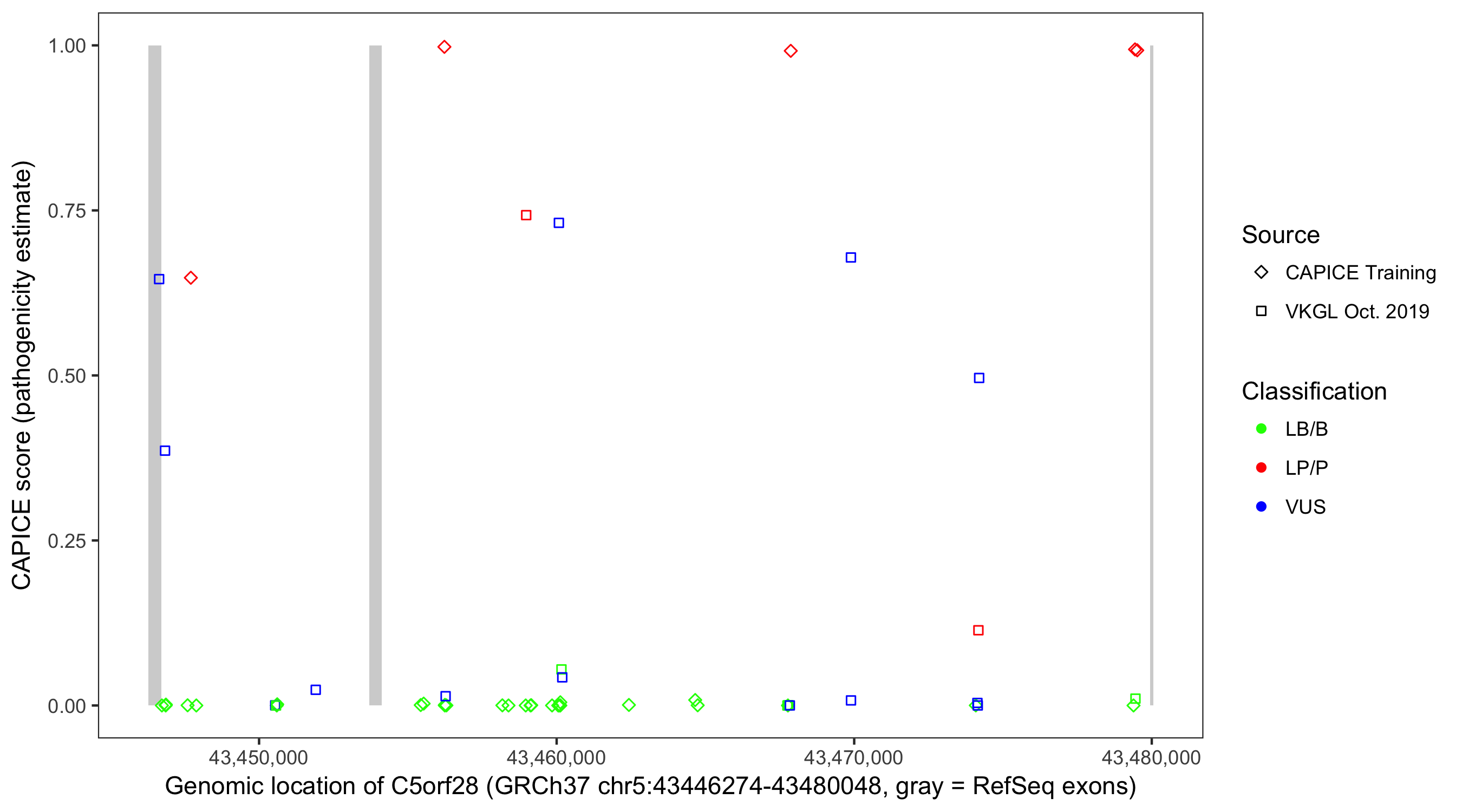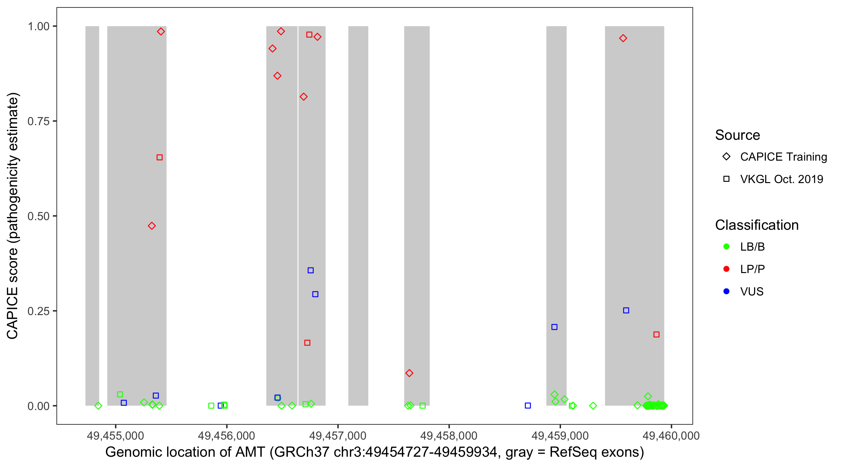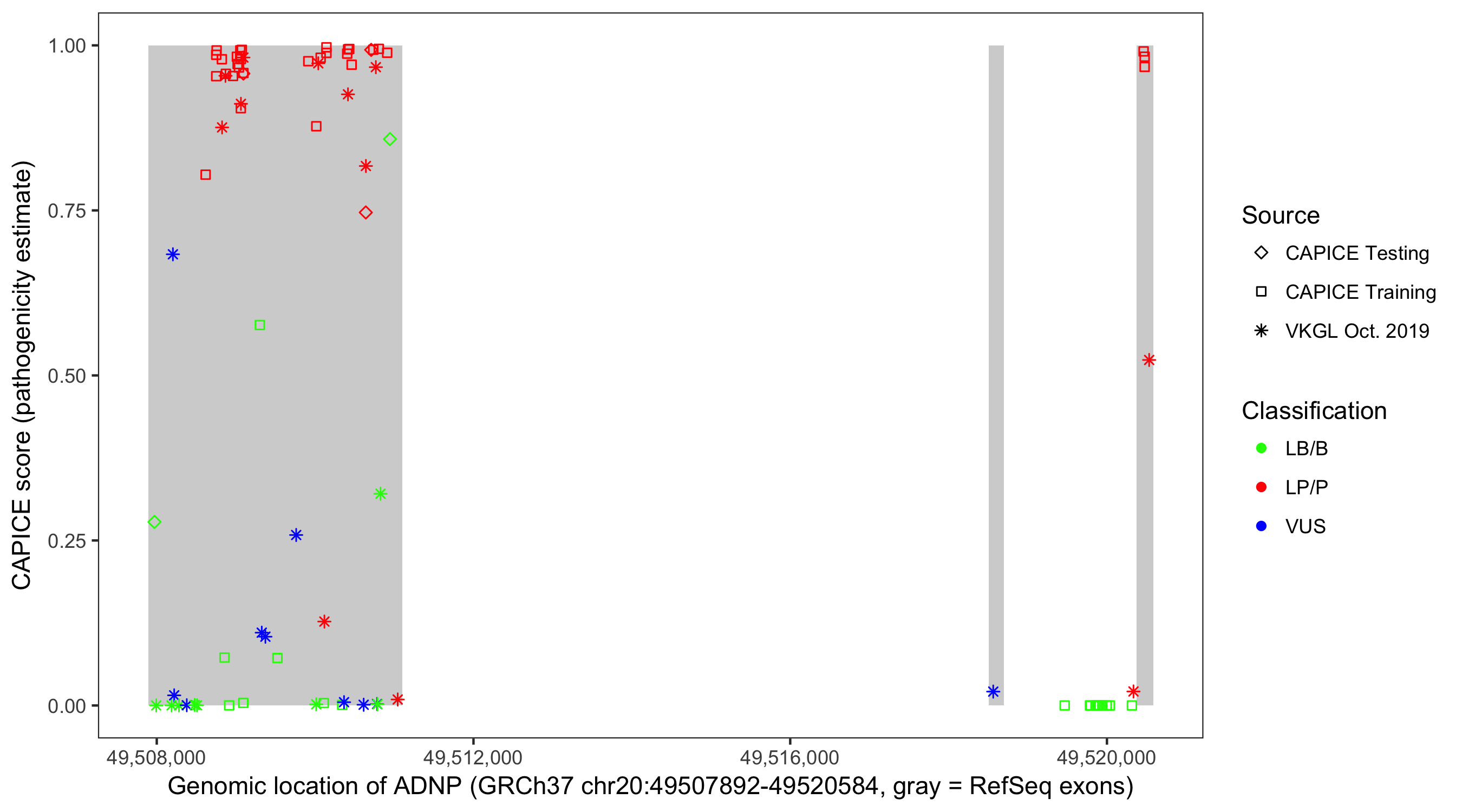 Shown are CAPICE train/test variants plus VKGL Oct 2019.