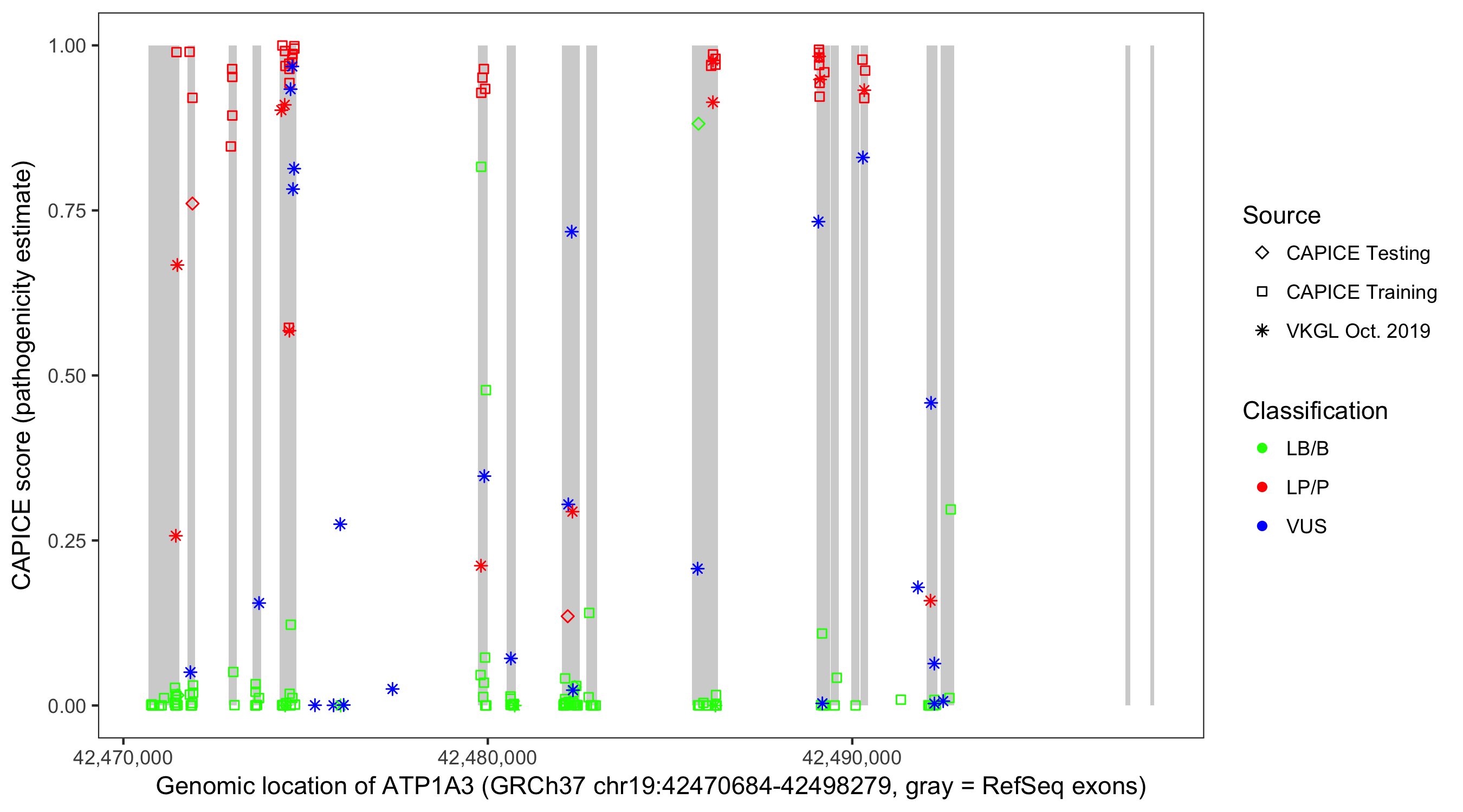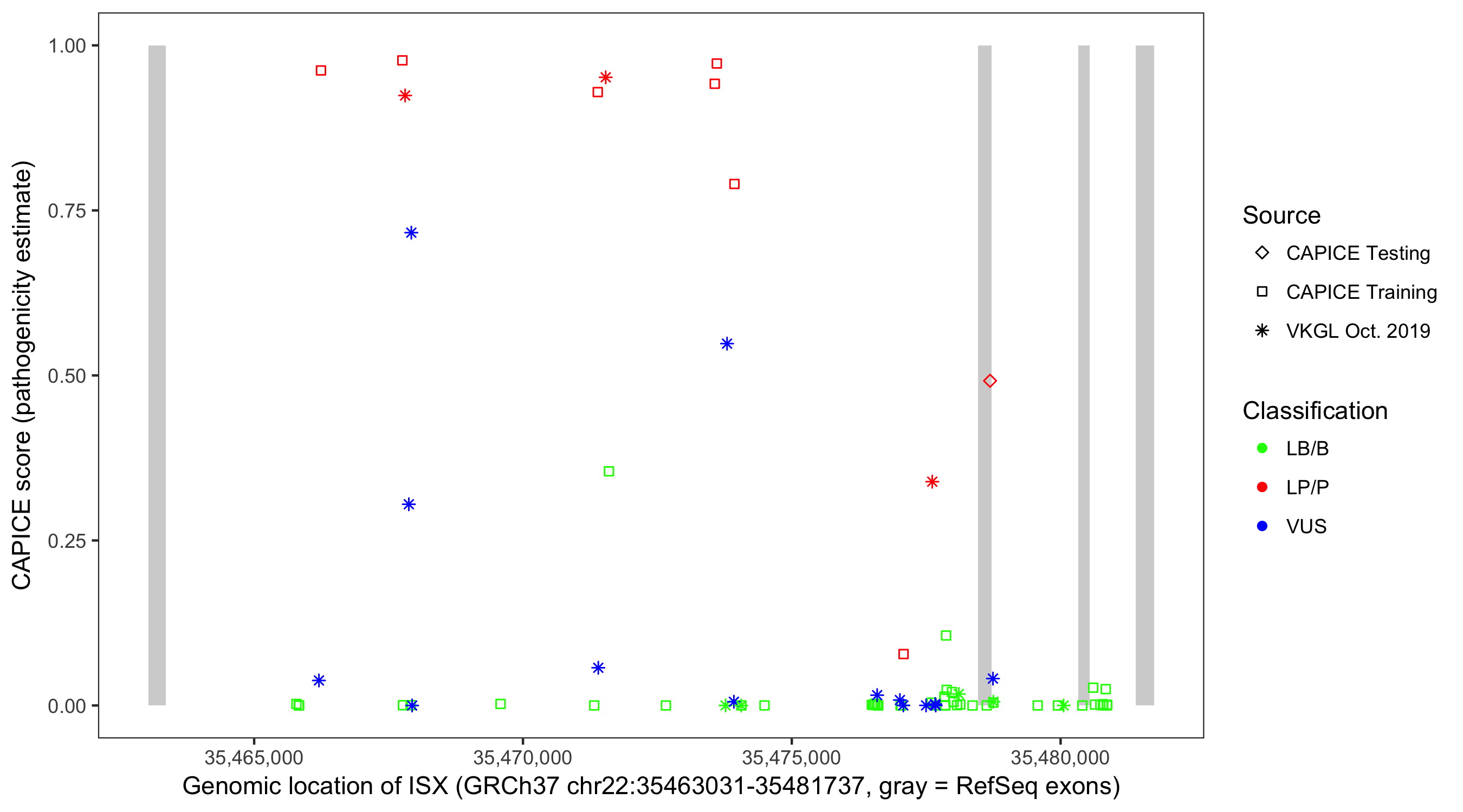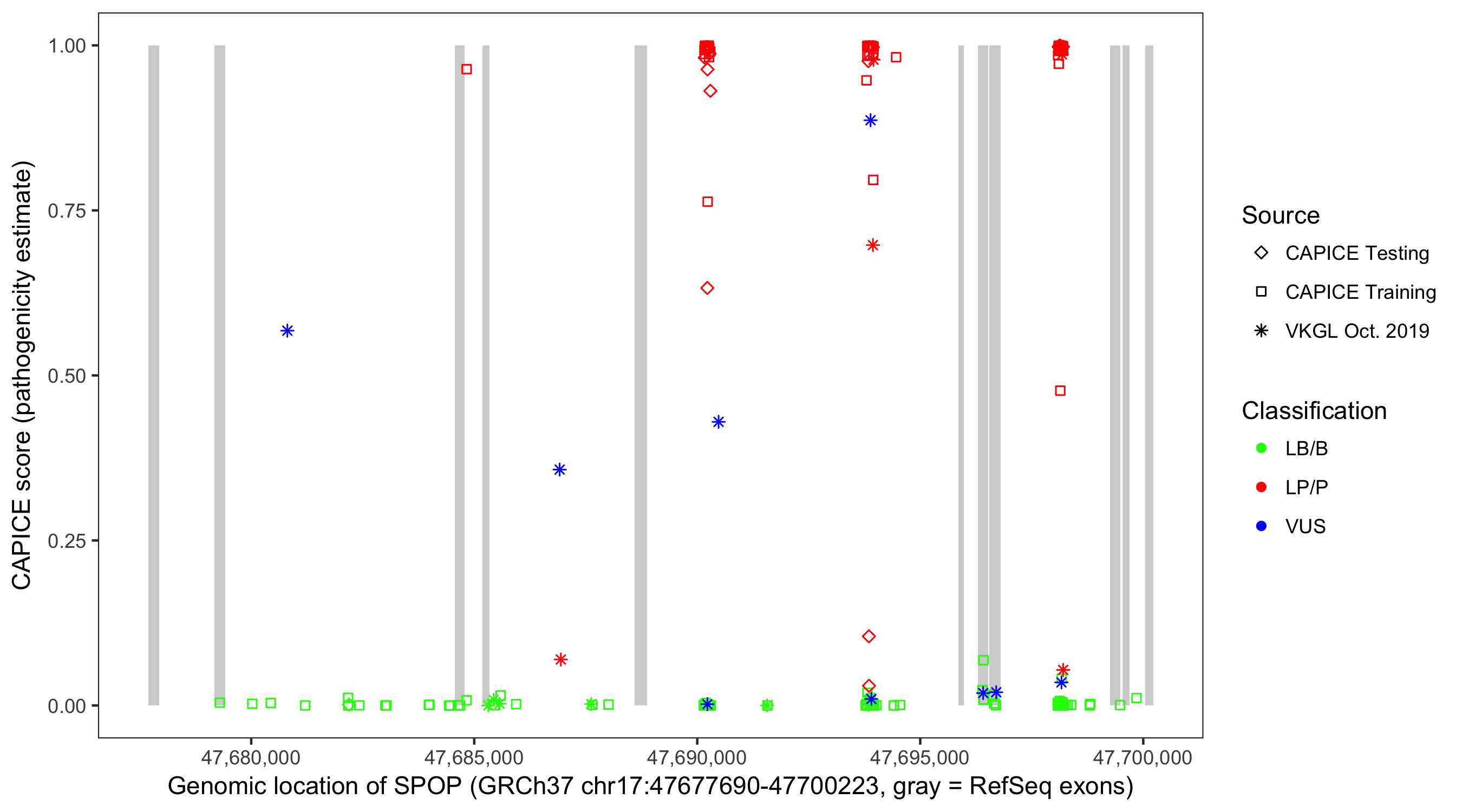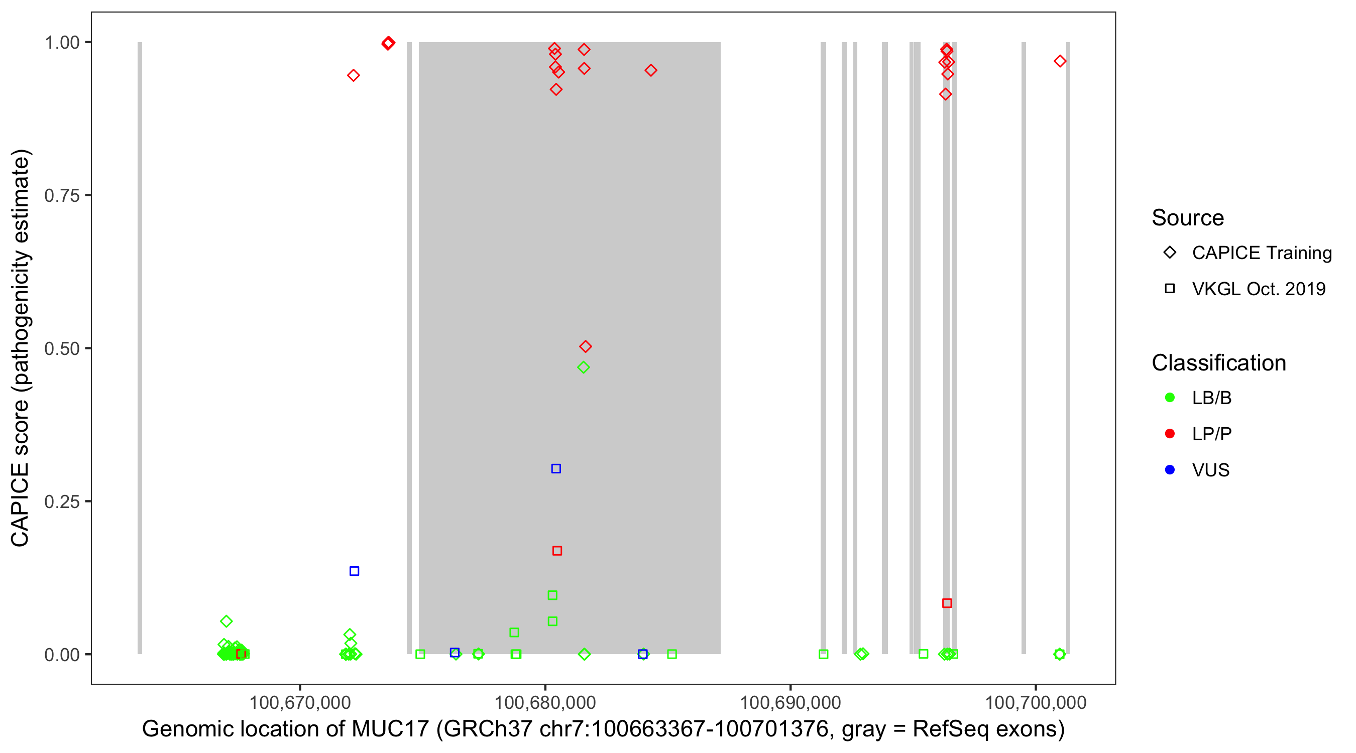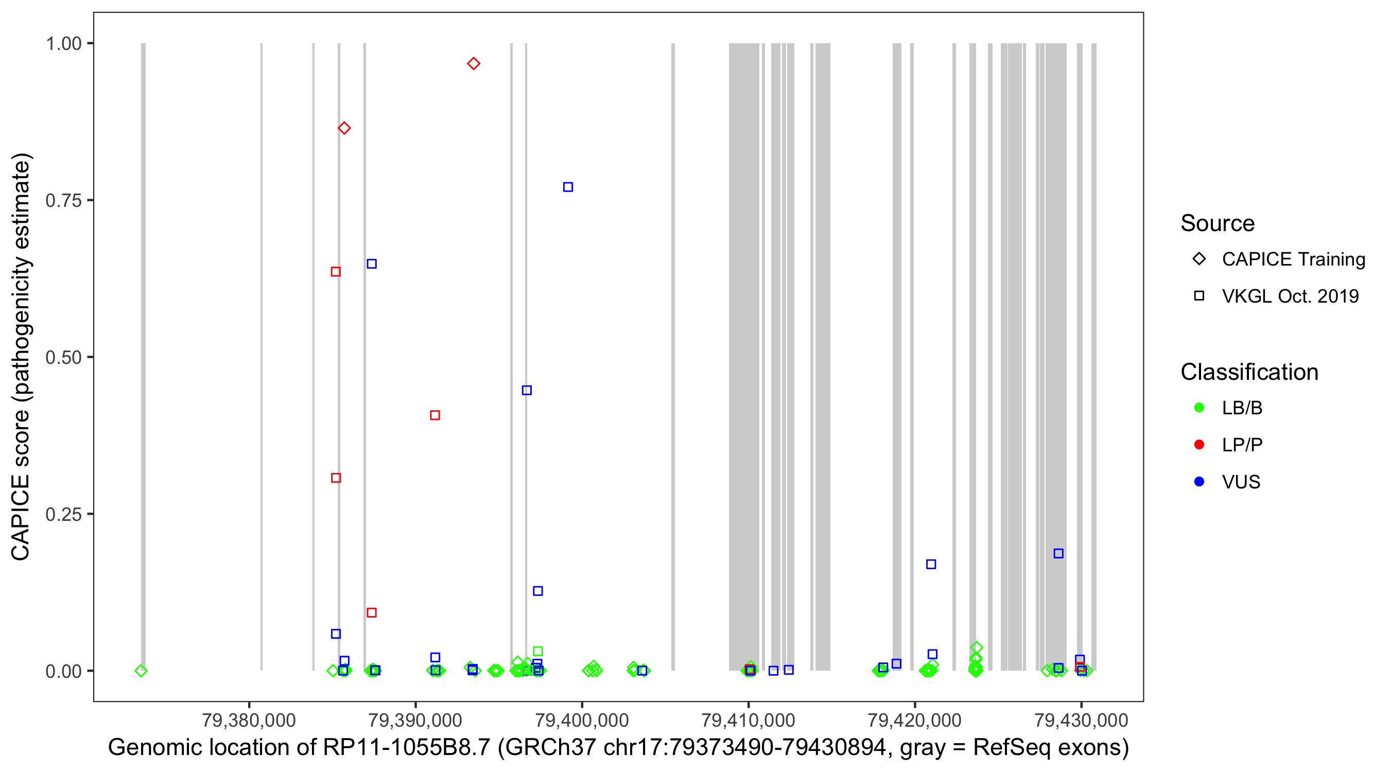 Shown are CAPICE train/test variants plus VKGL Oct 2019.