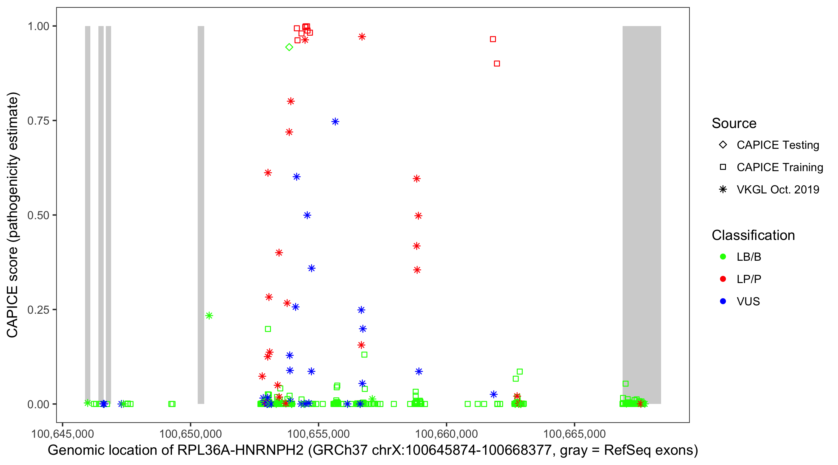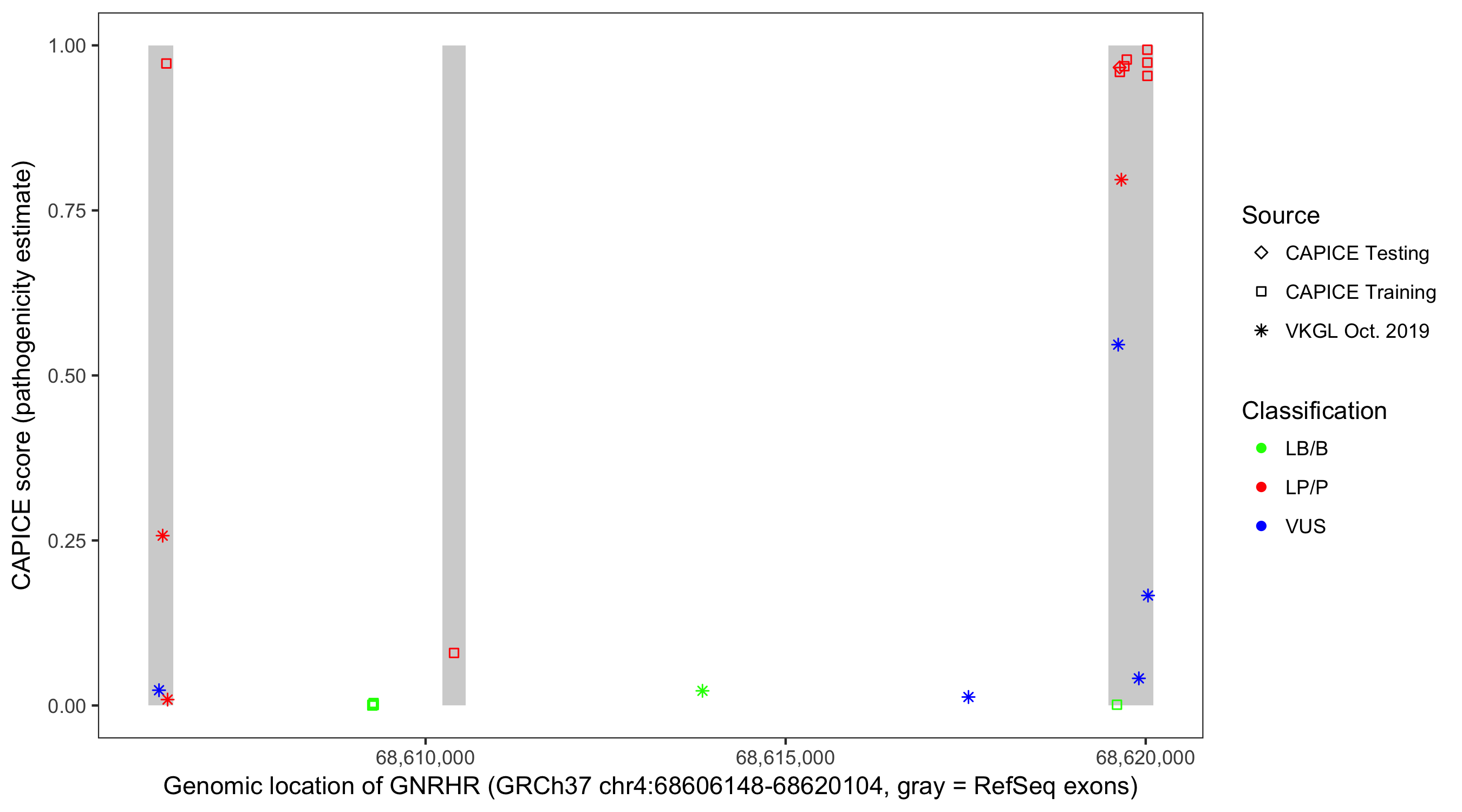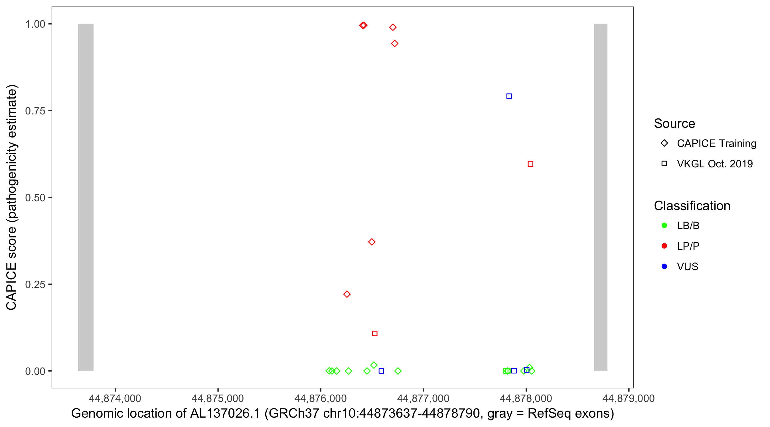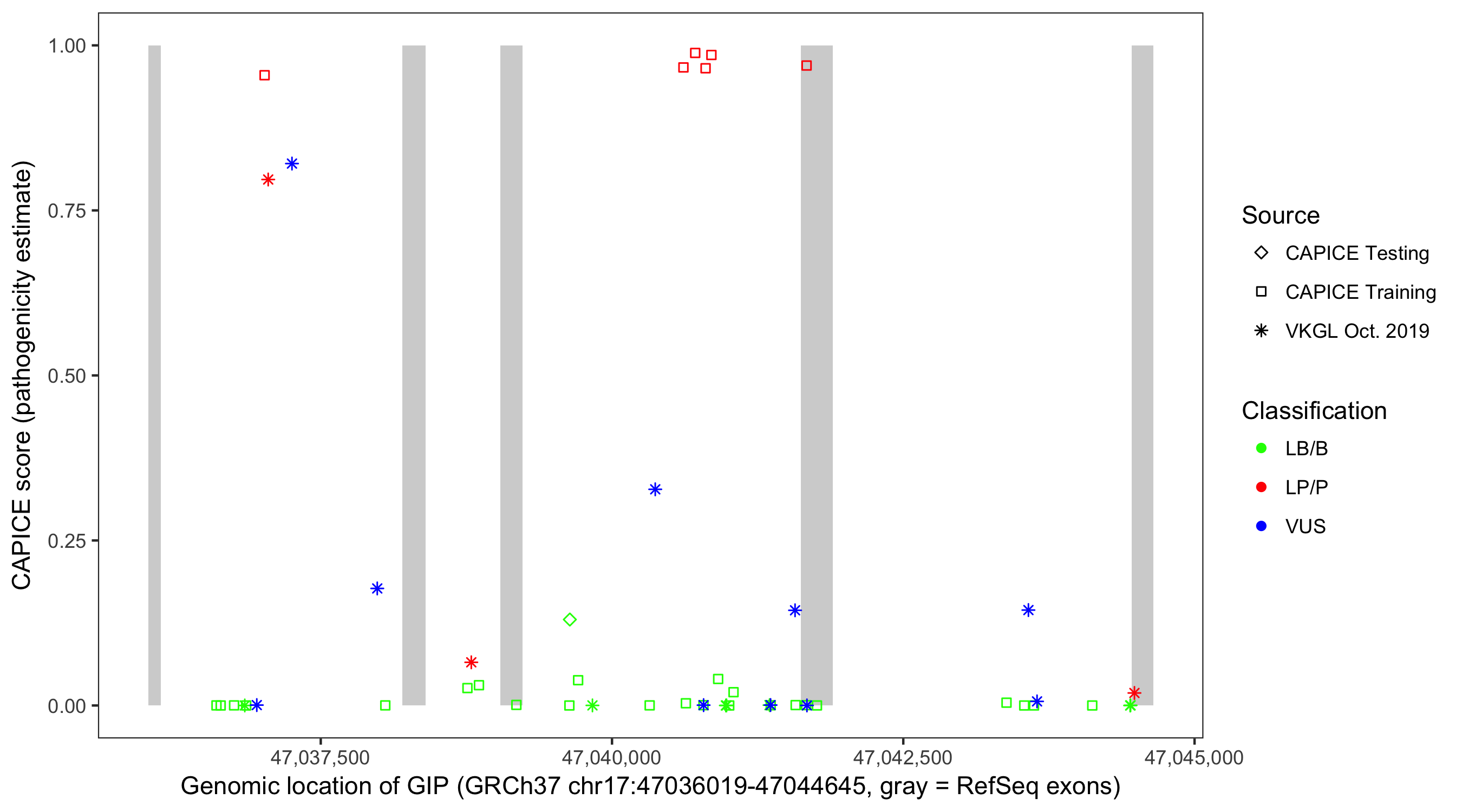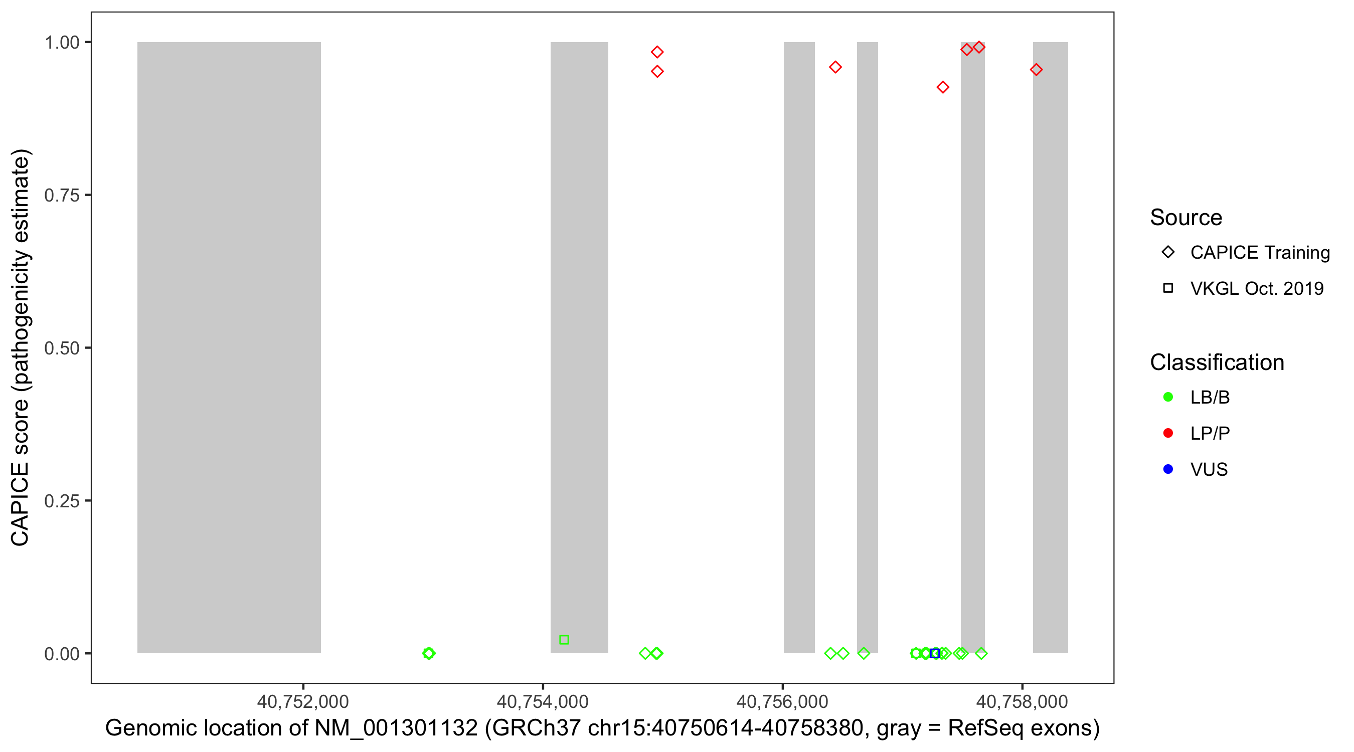 Shown are CAPICE train/test variants plus VKGL Oct 2019.