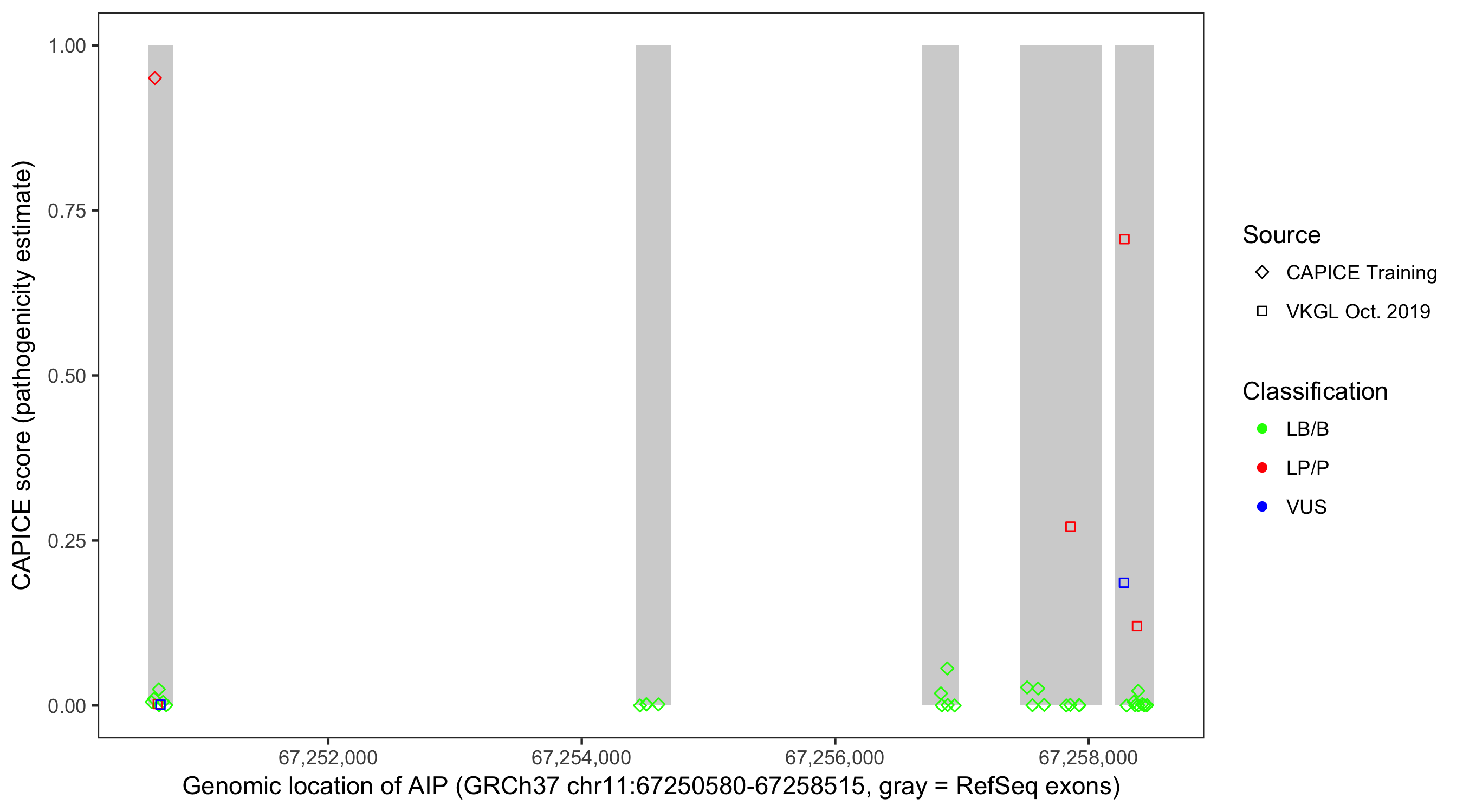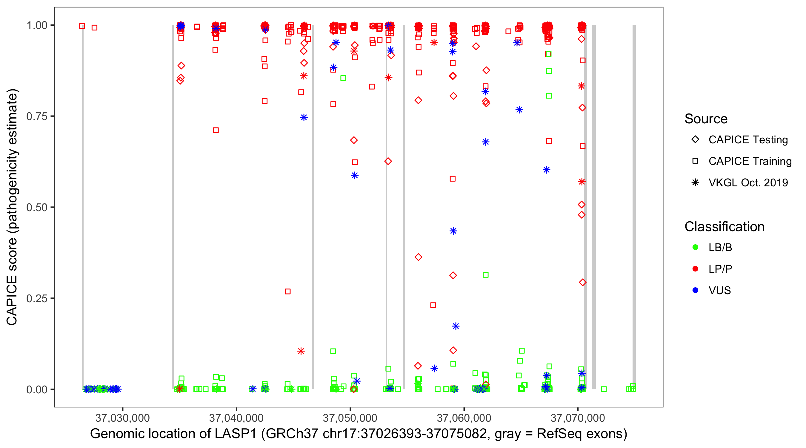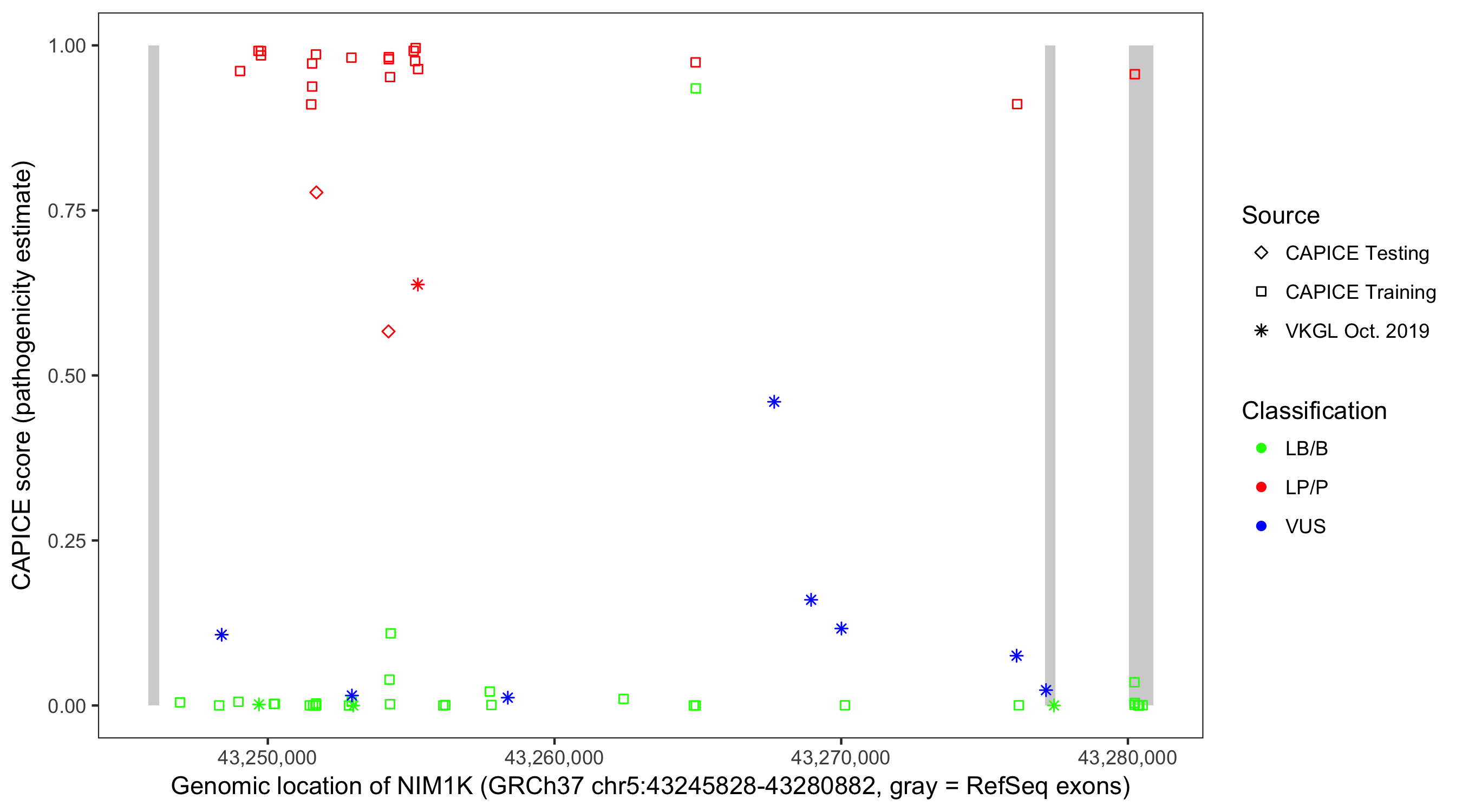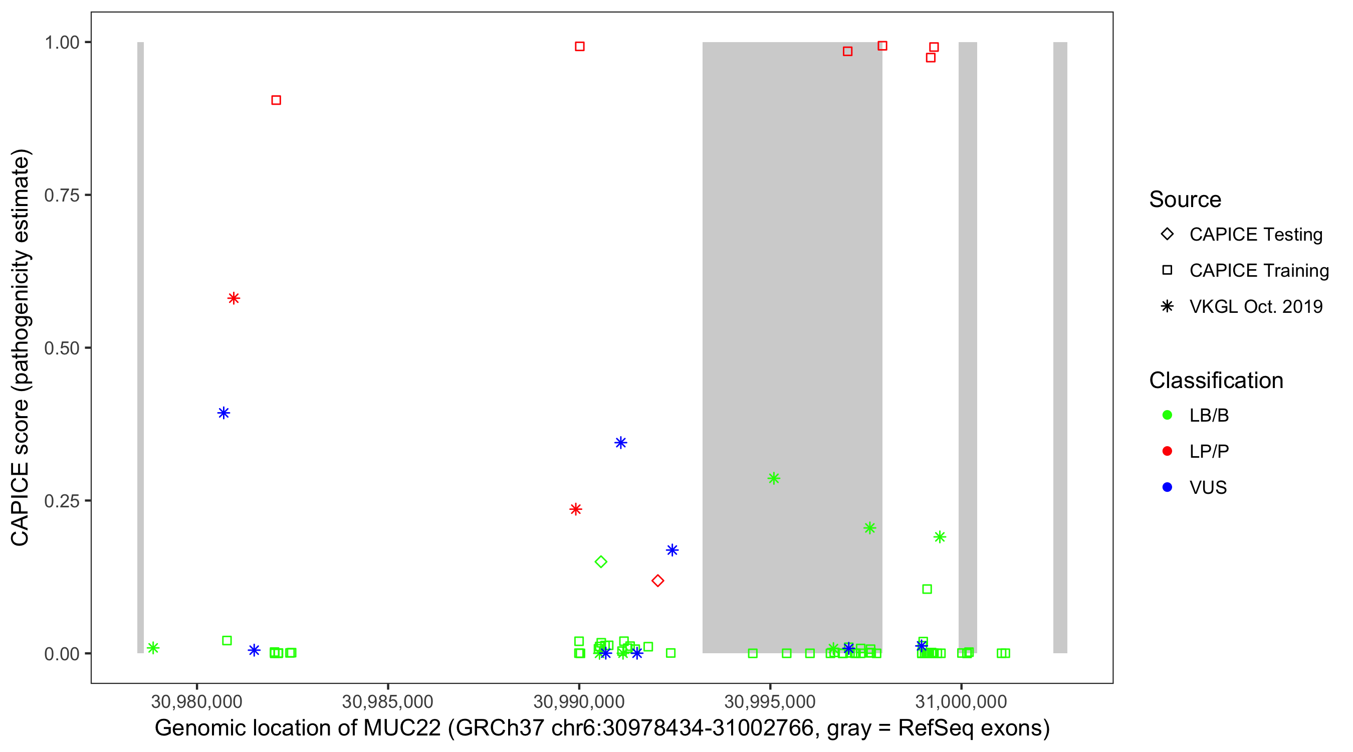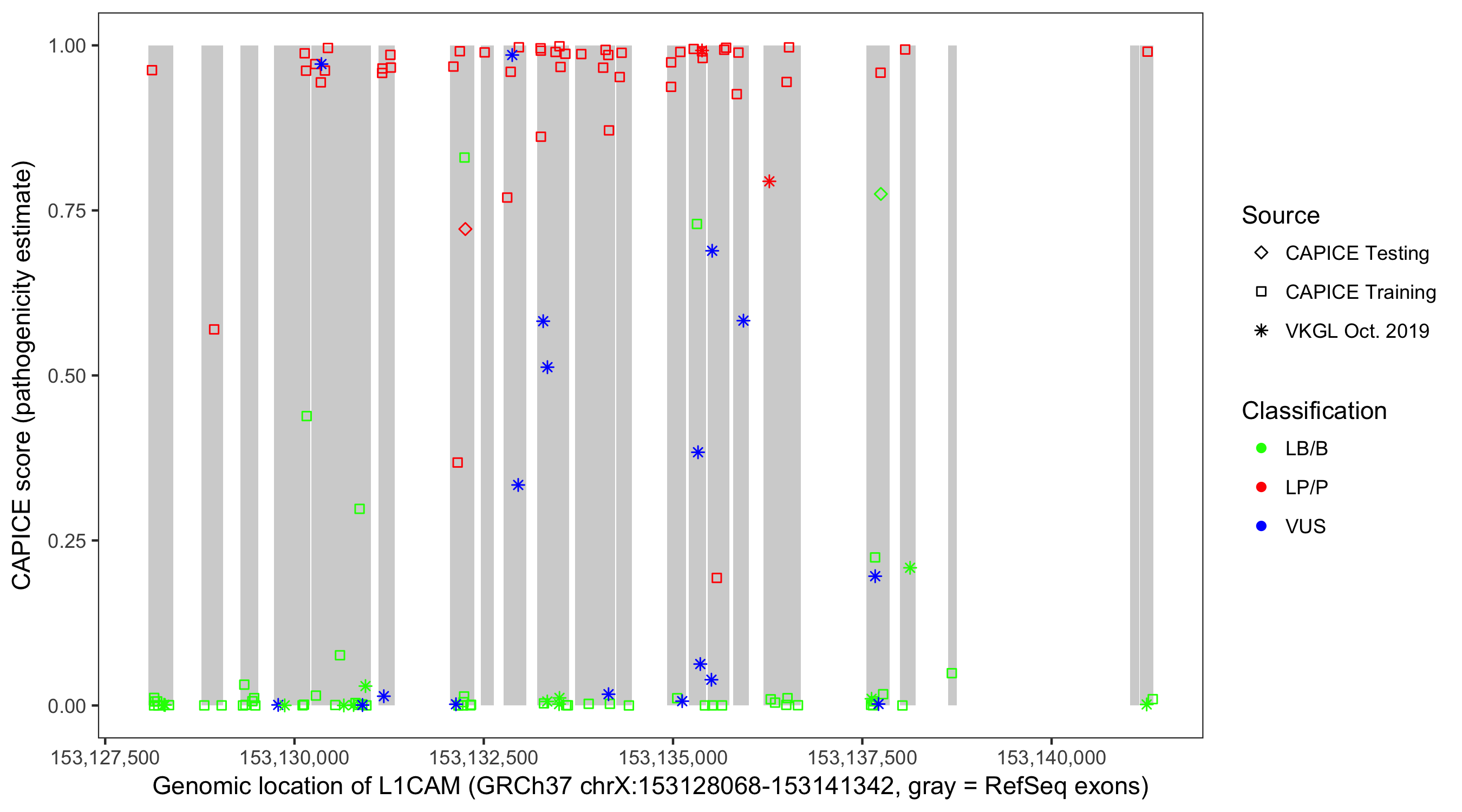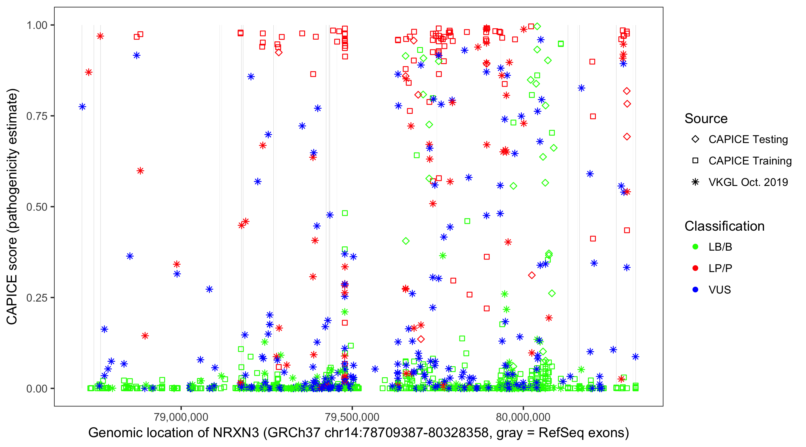 Shown are CAPICE train/test variants plus VKGL Oct 2019.