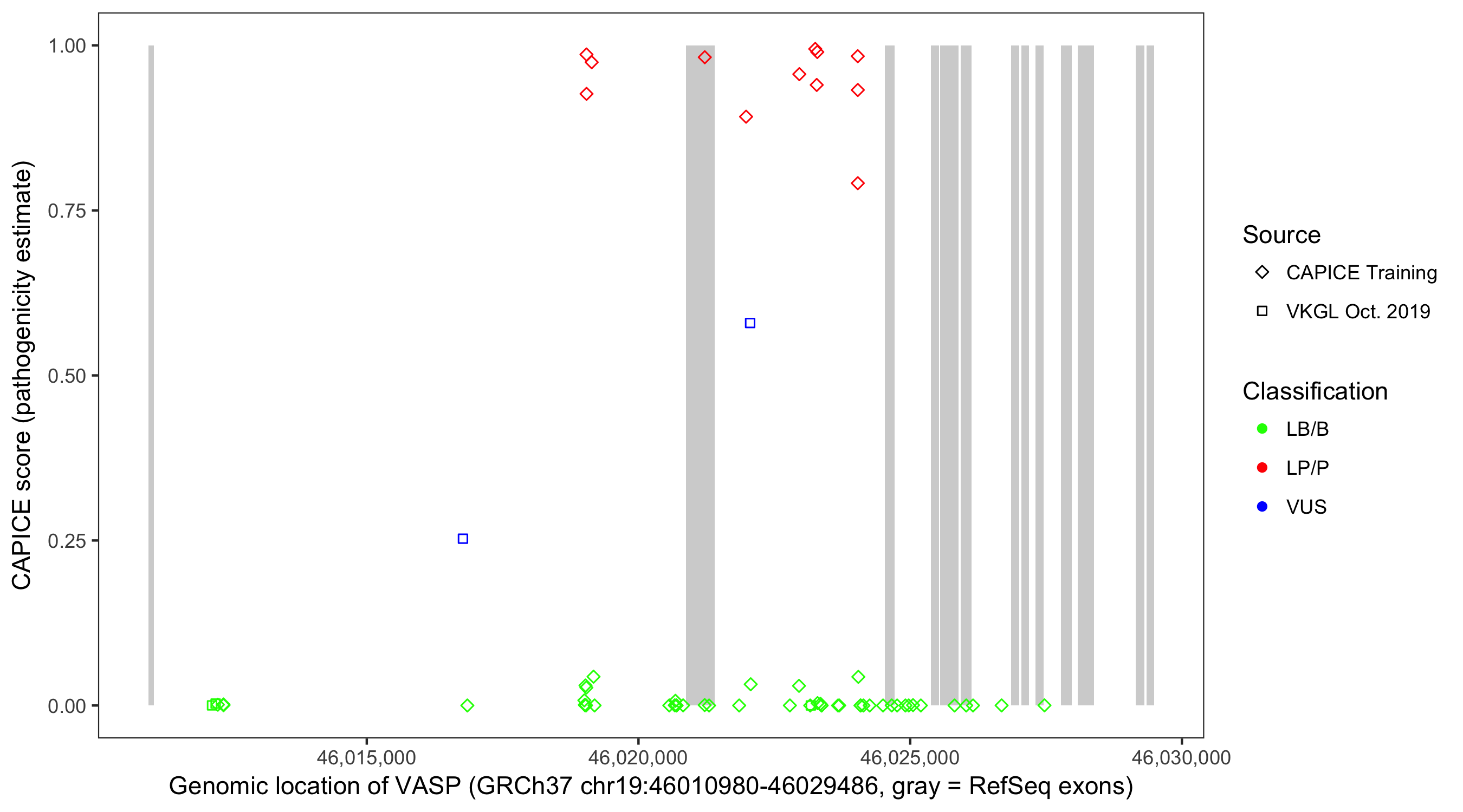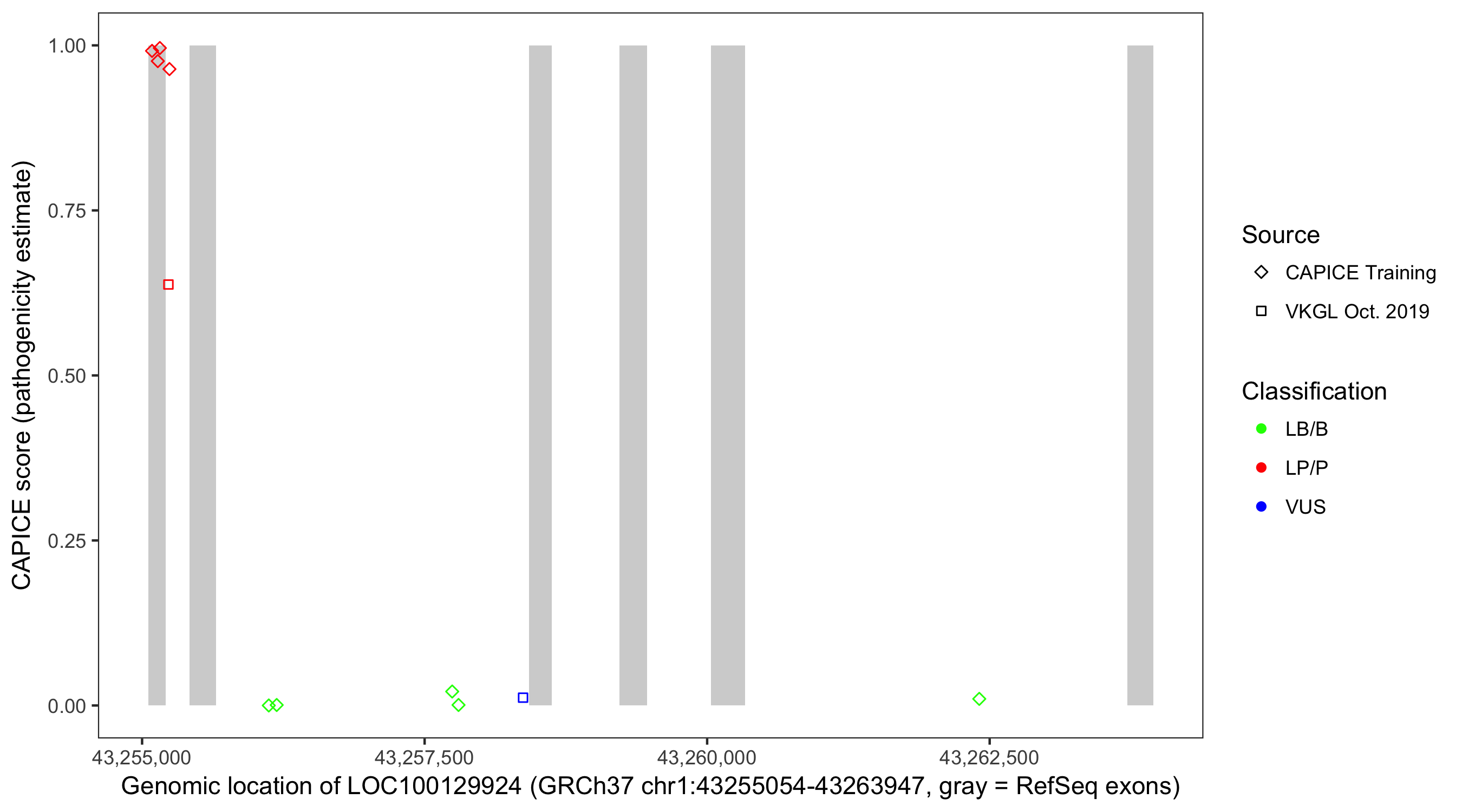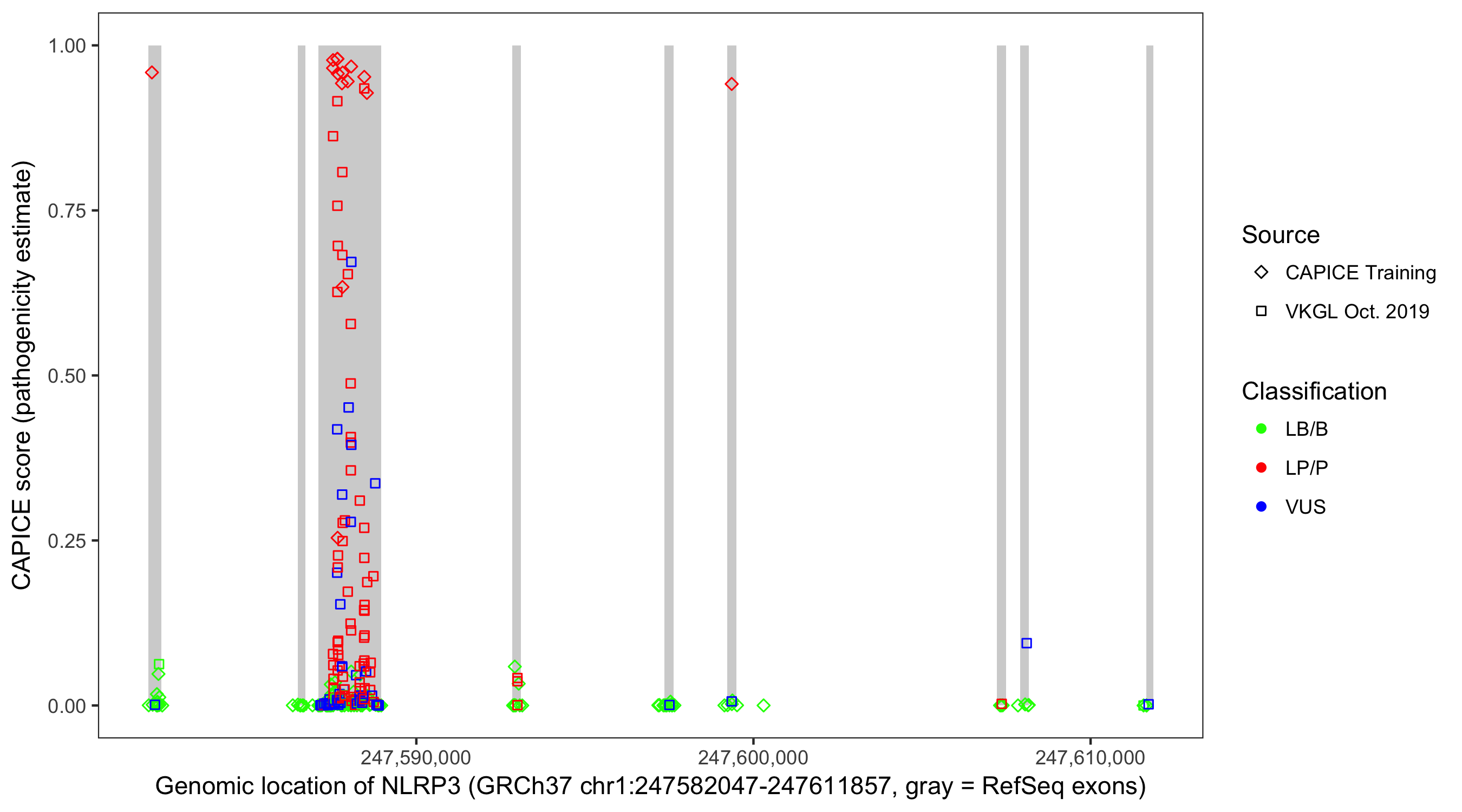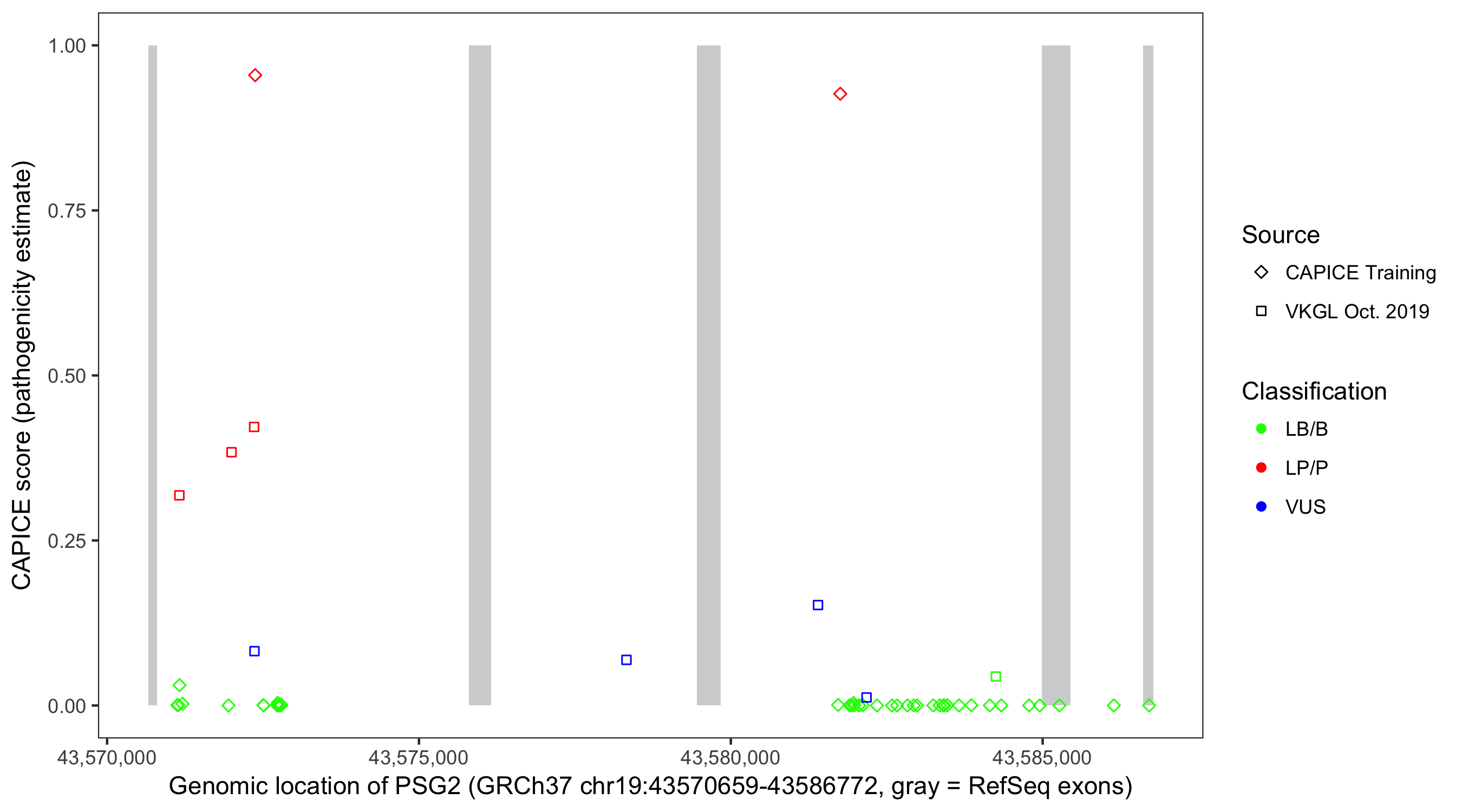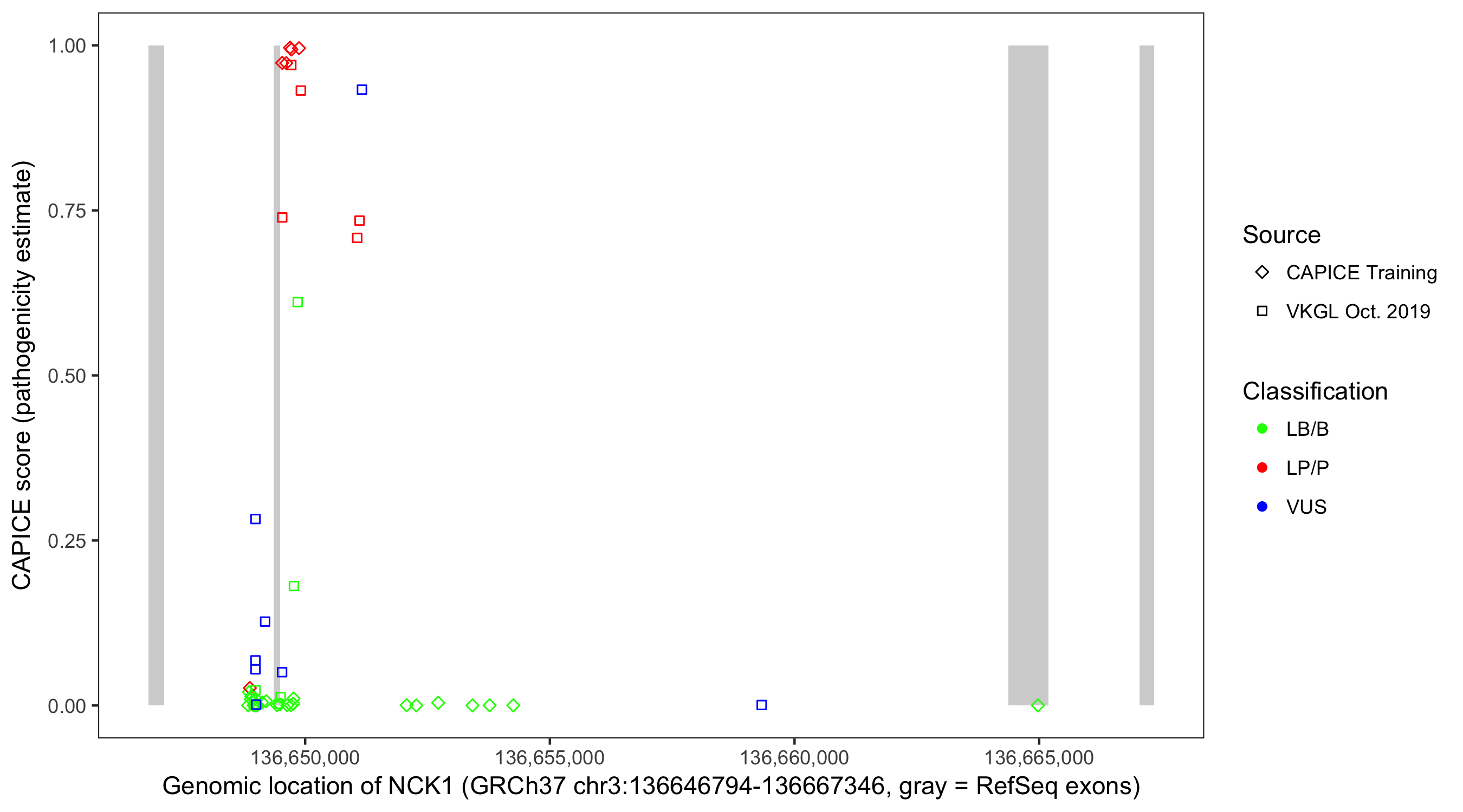 Shown are CAPICE train/test variants plus VKGL Oct 2019.
