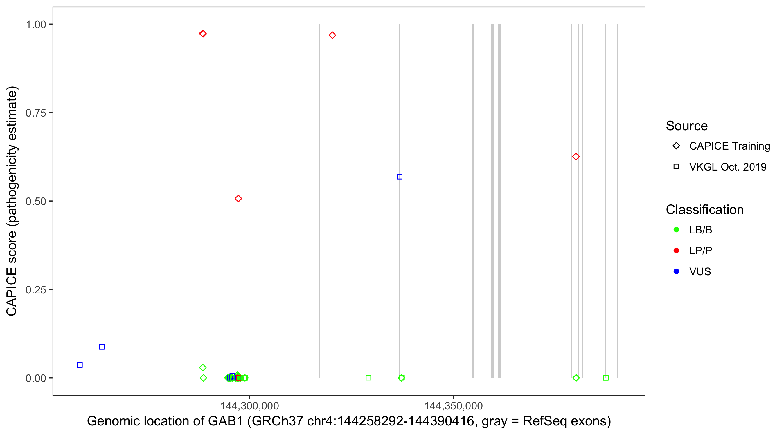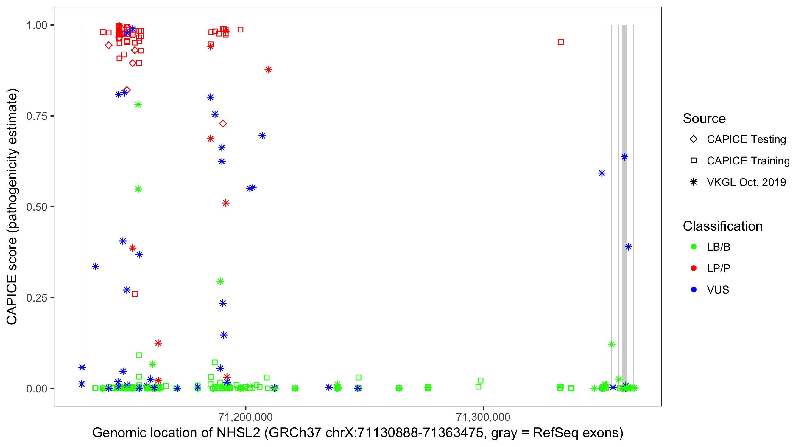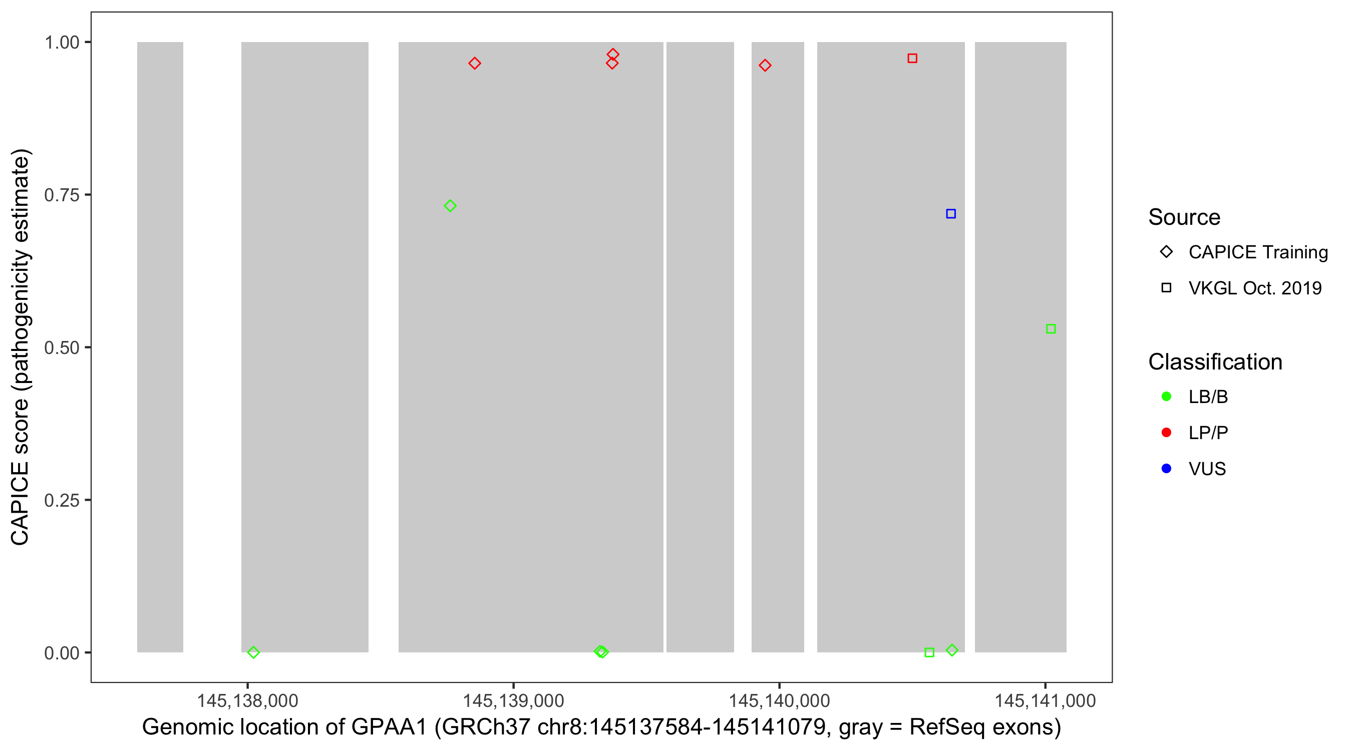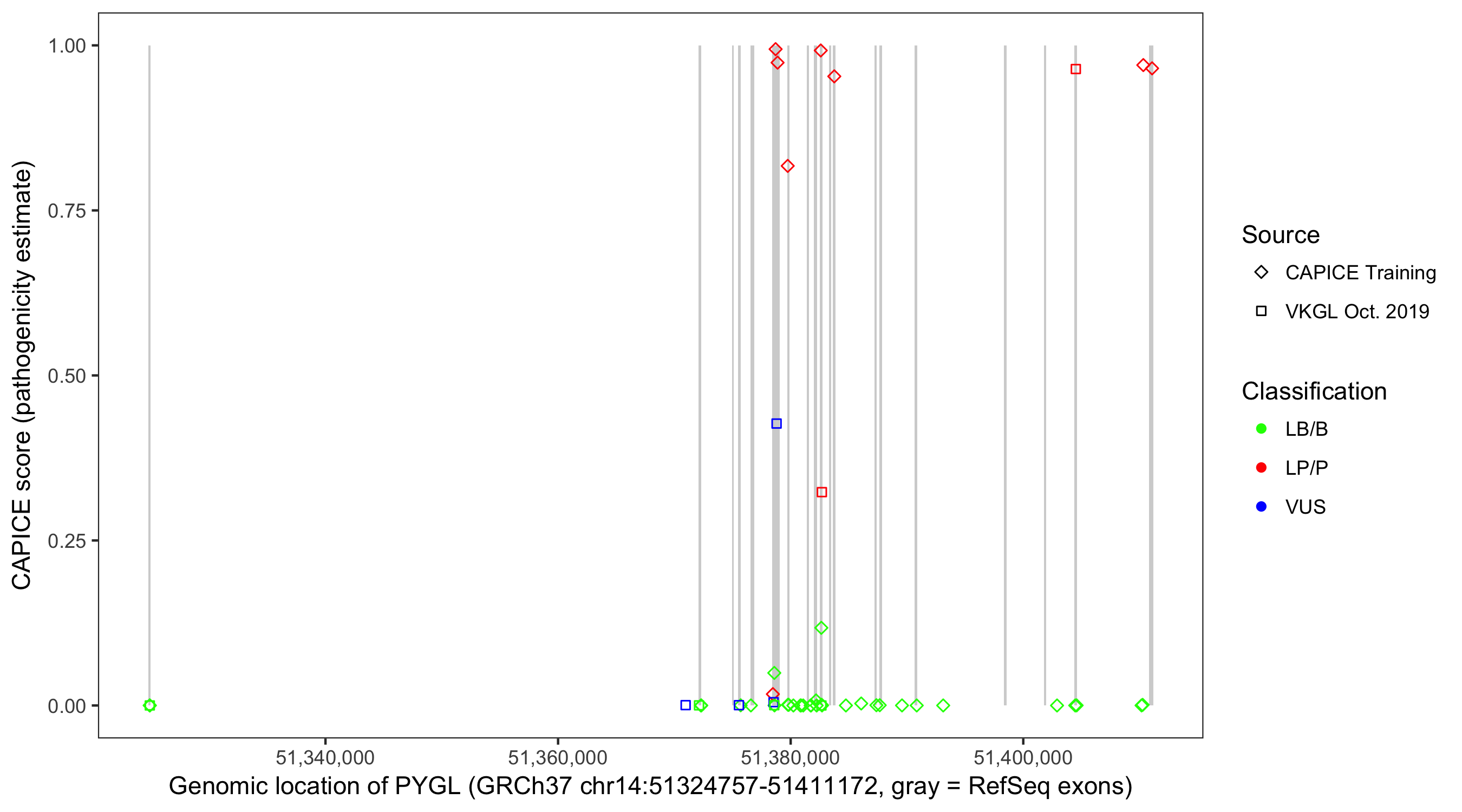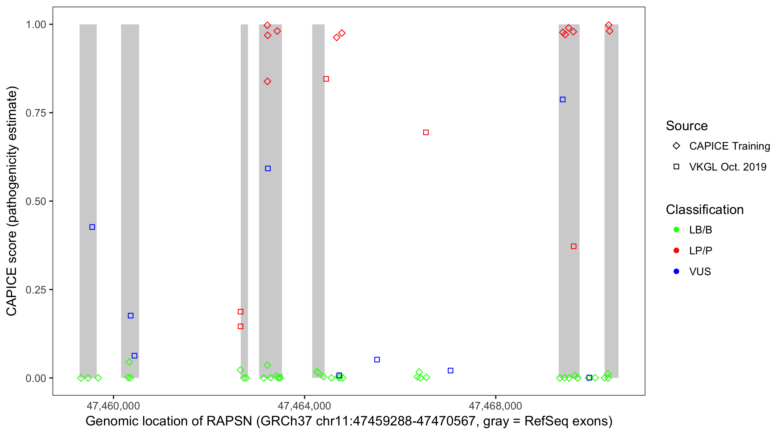 Shown are CAPICE train/test variants plus VKGL Oct 2019.
