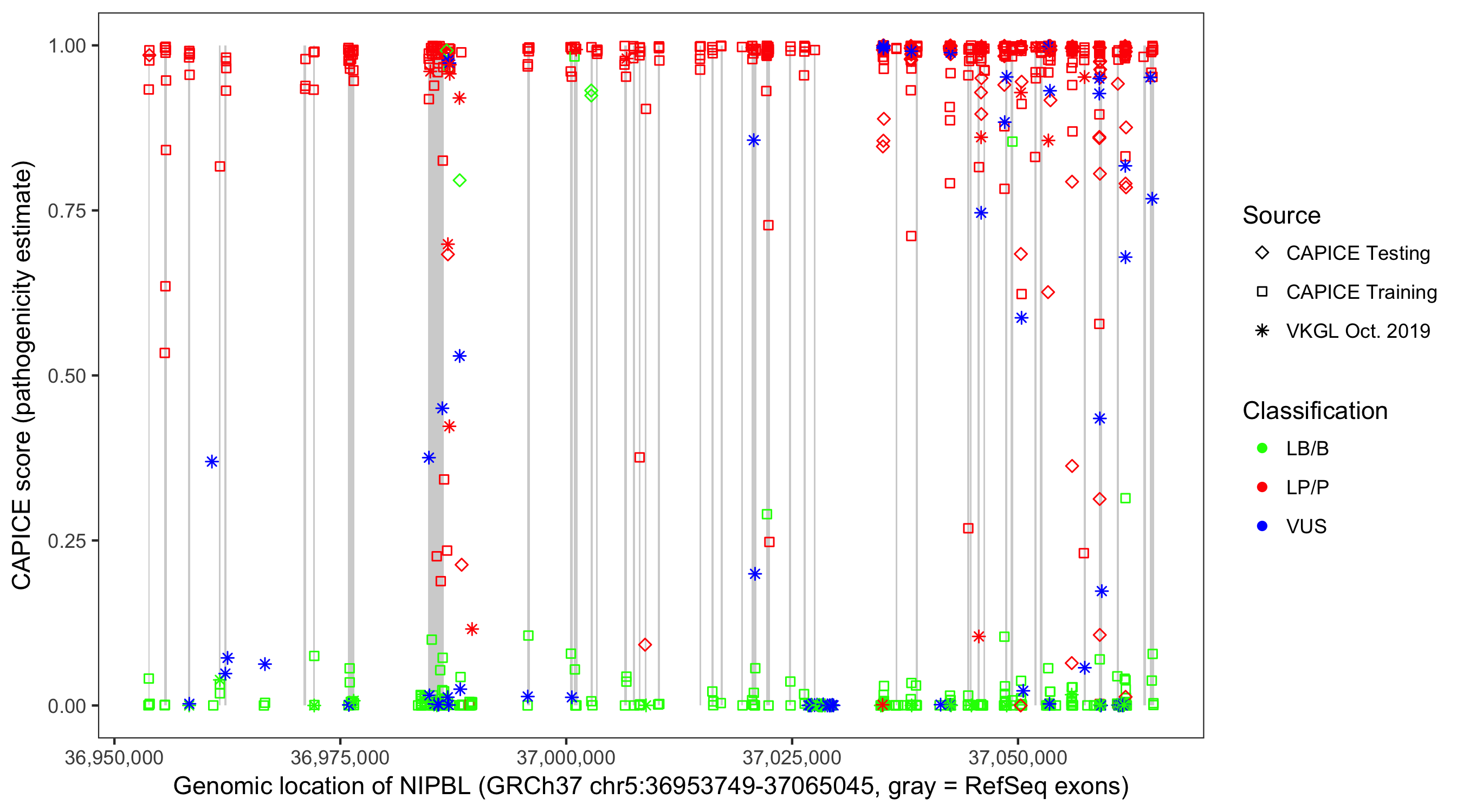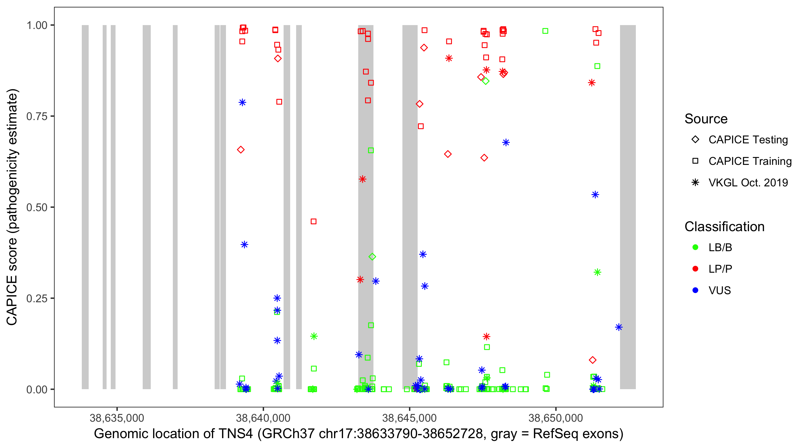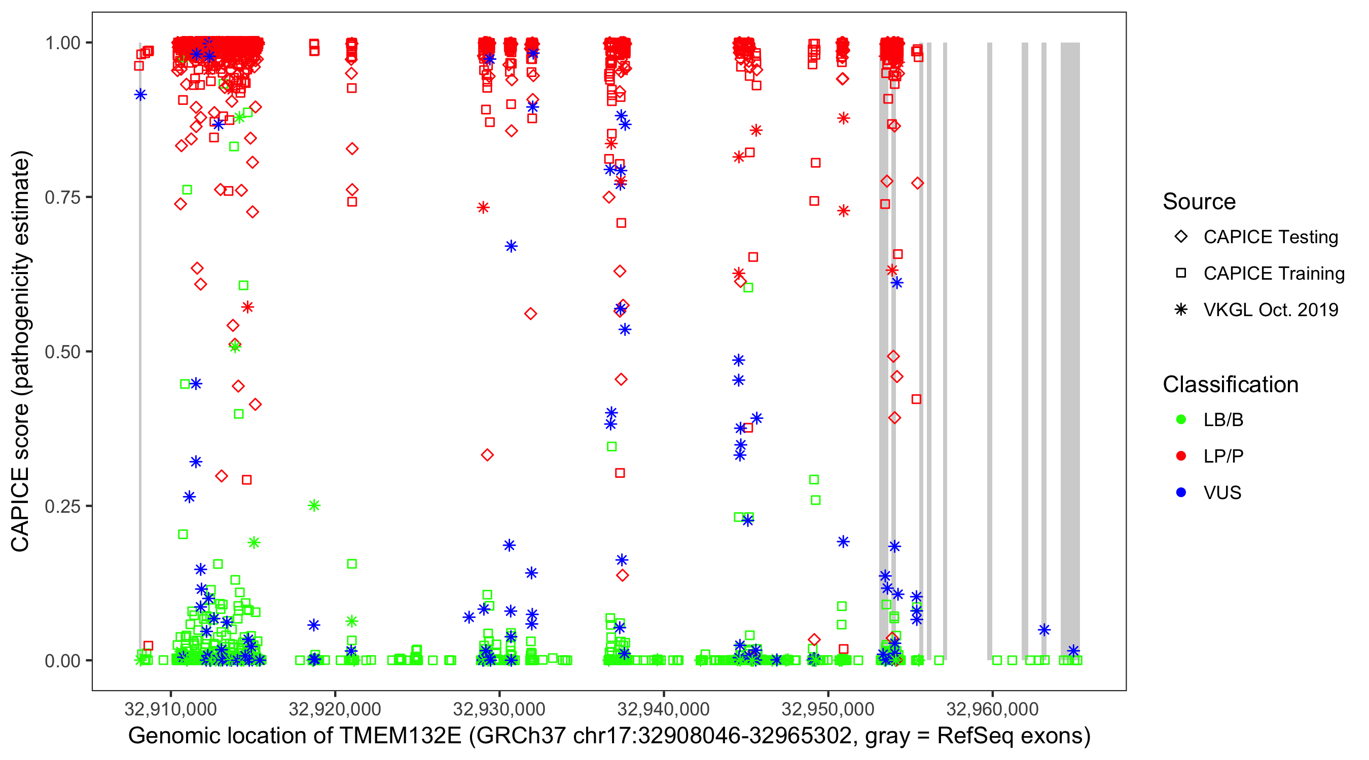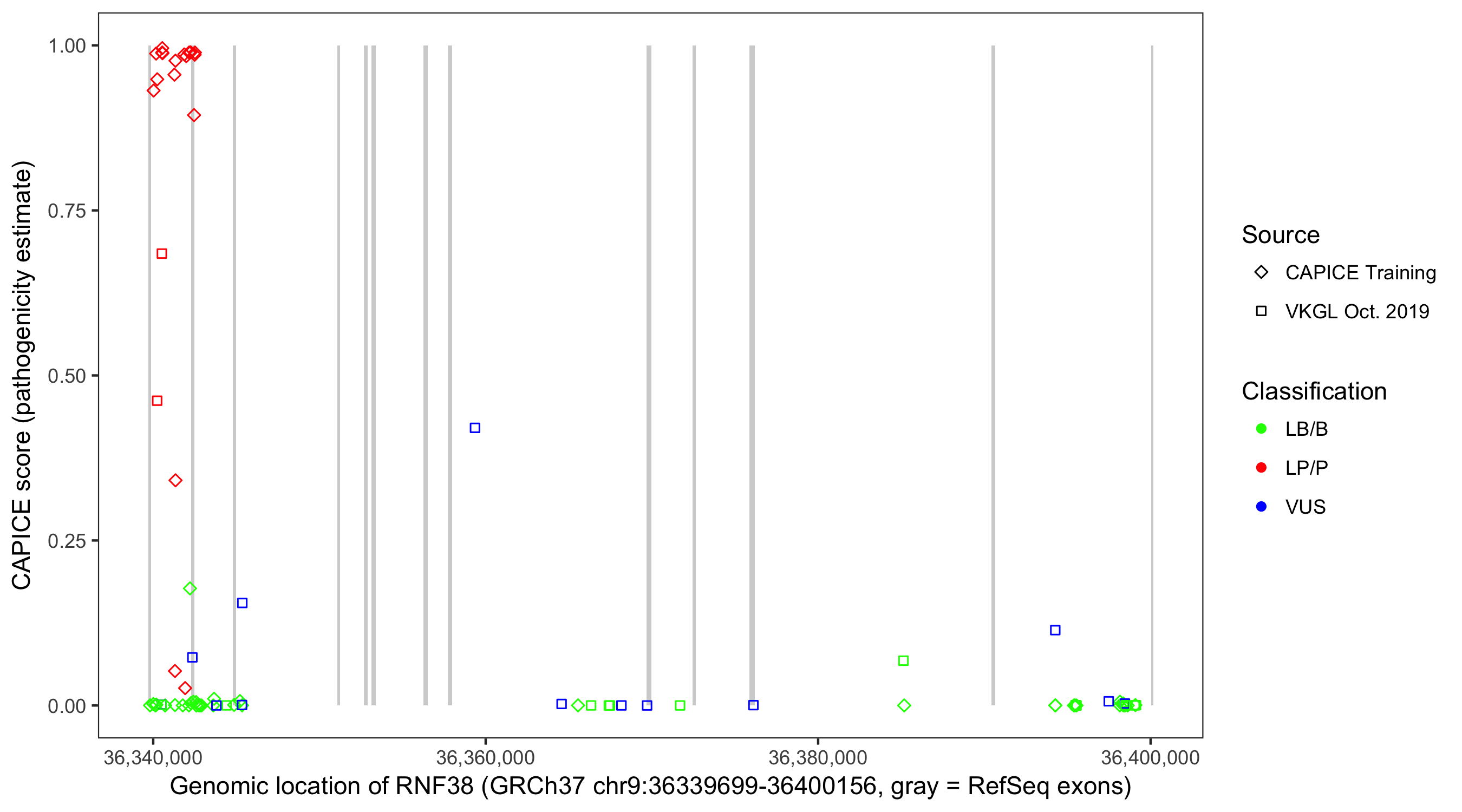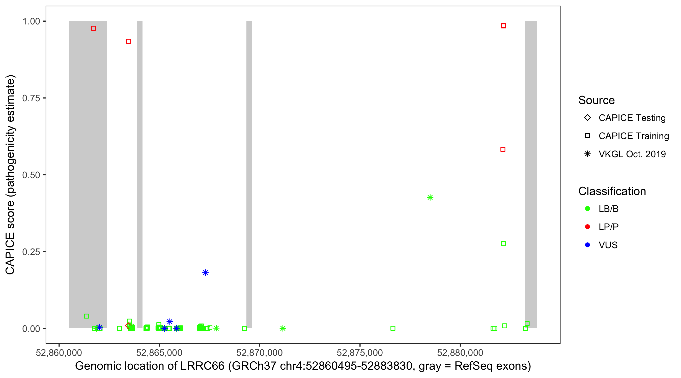 Shown are CAPICE train/test variants plus VKGL Oct 2019.