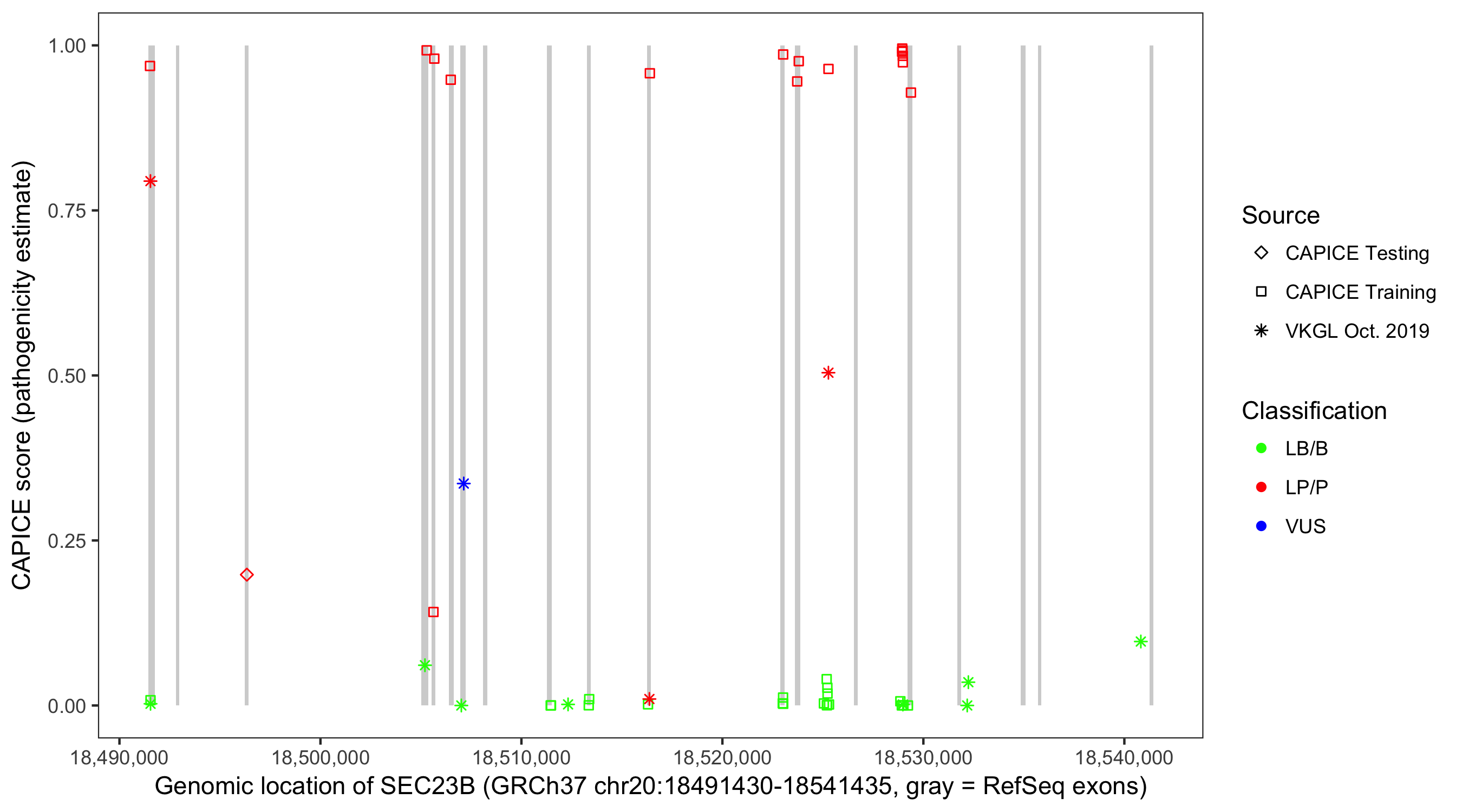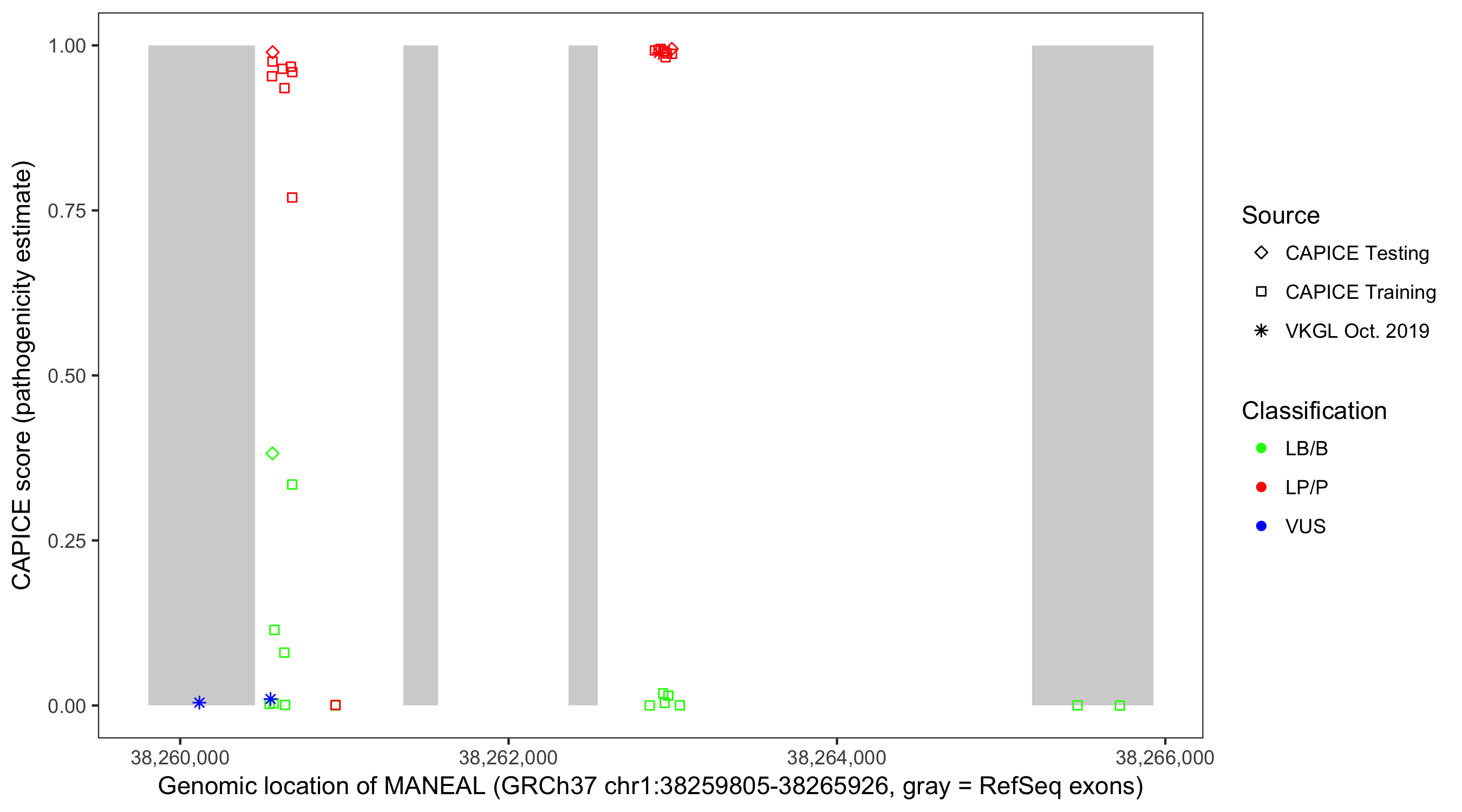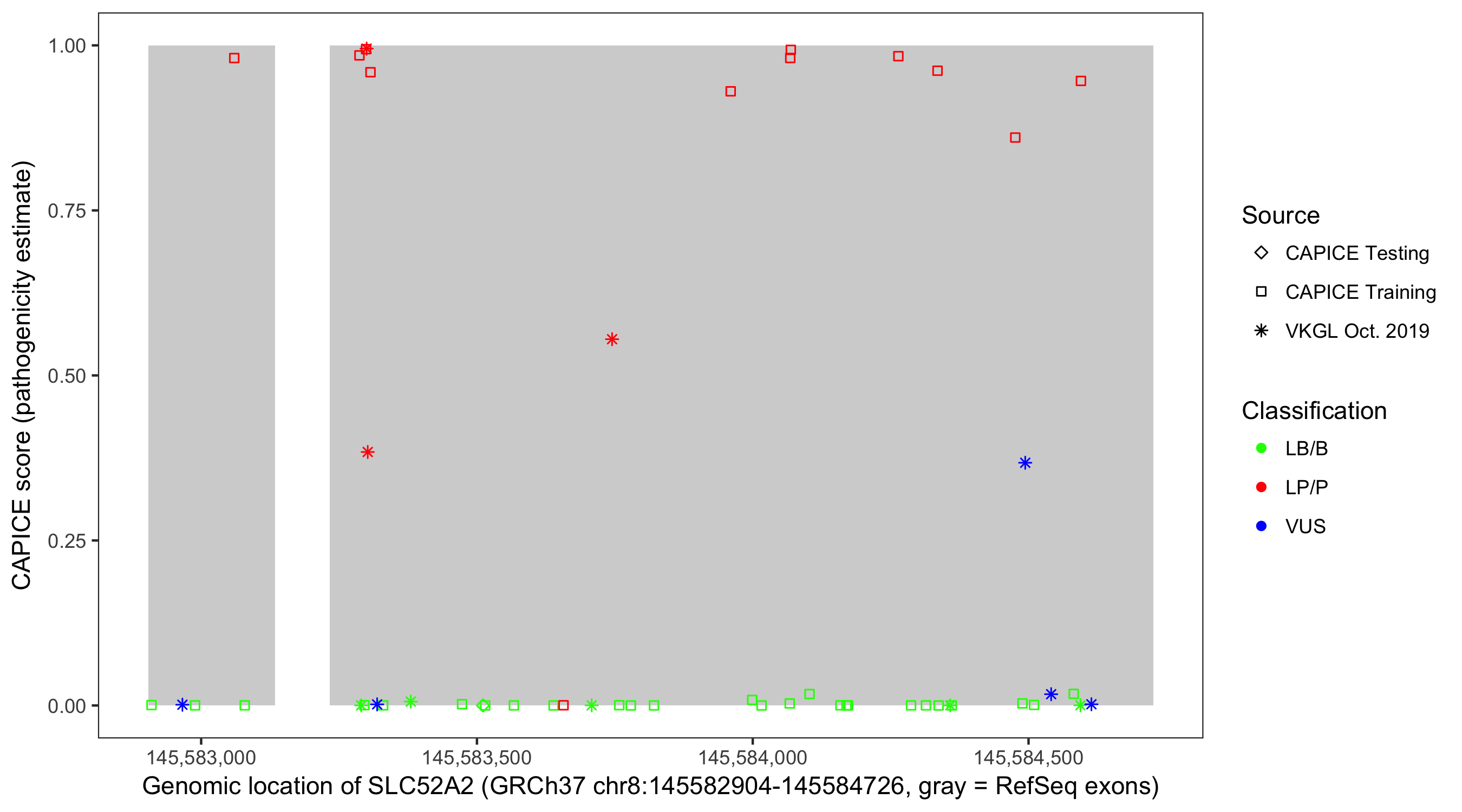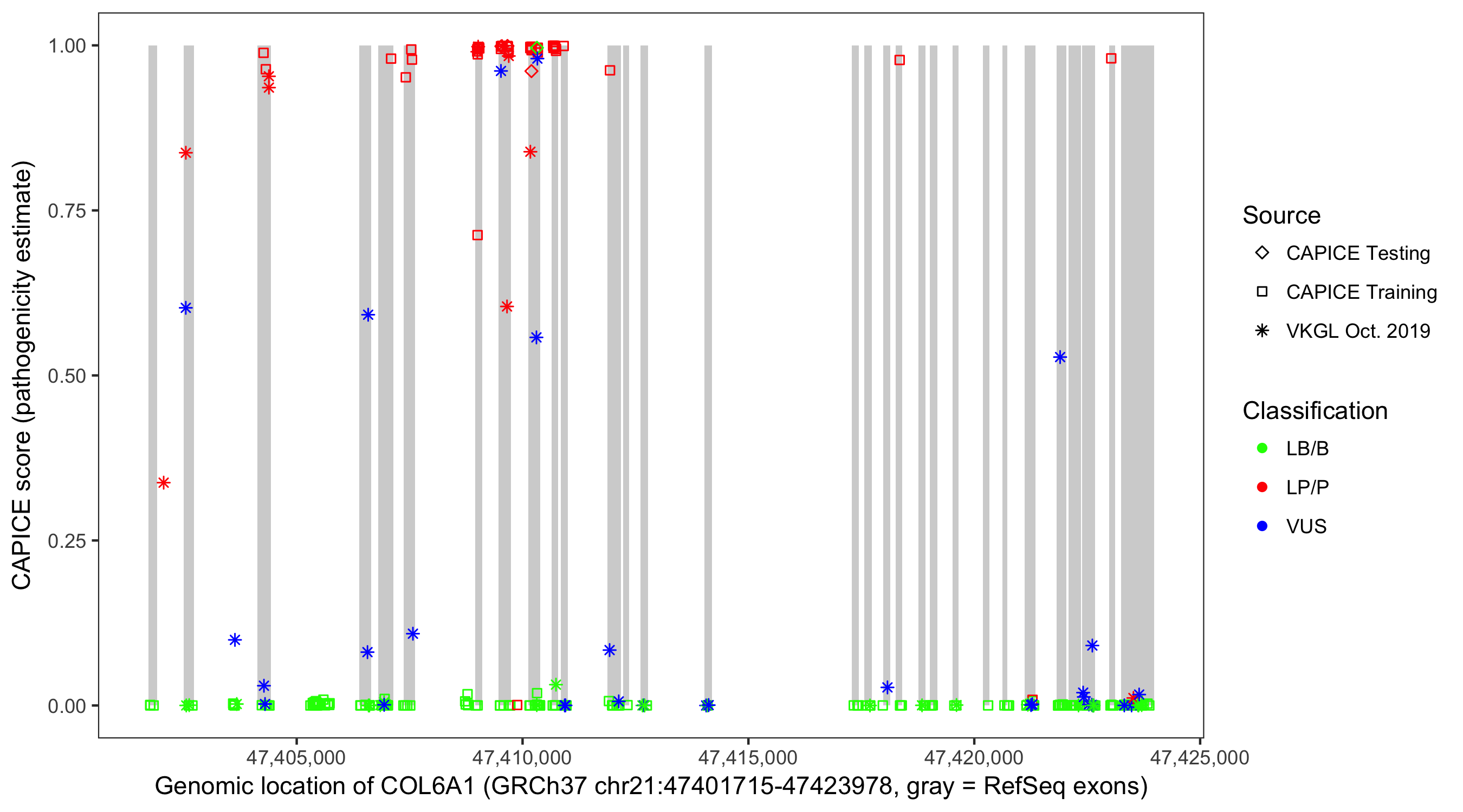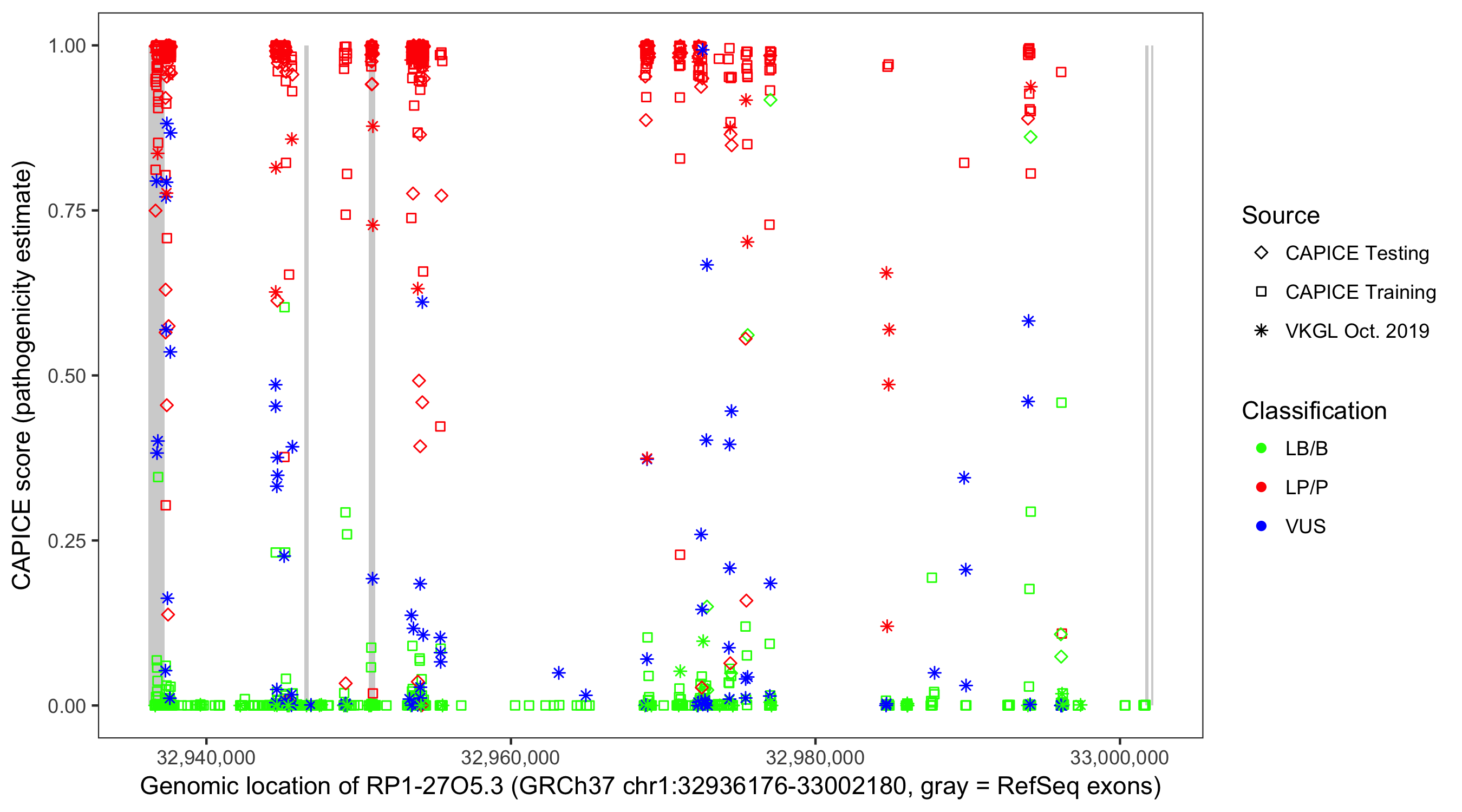 Shown are CAPICE train/test variants plus VKGL Oct 2019.