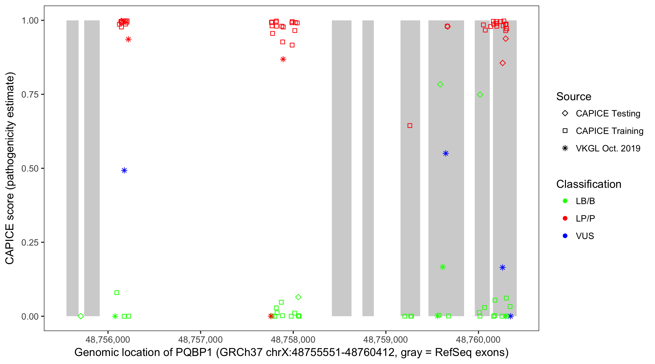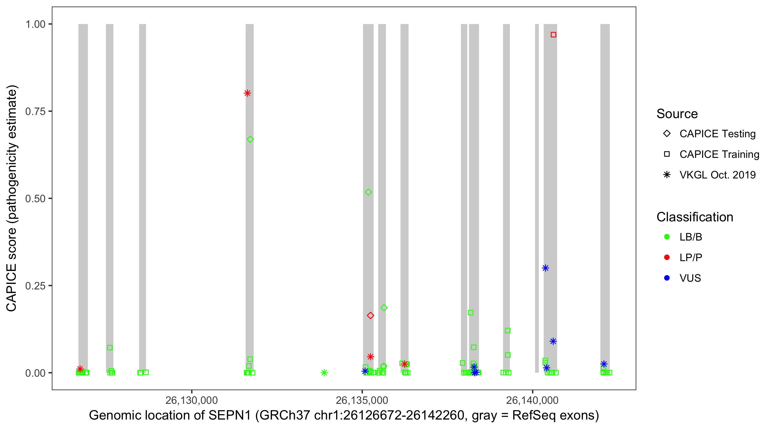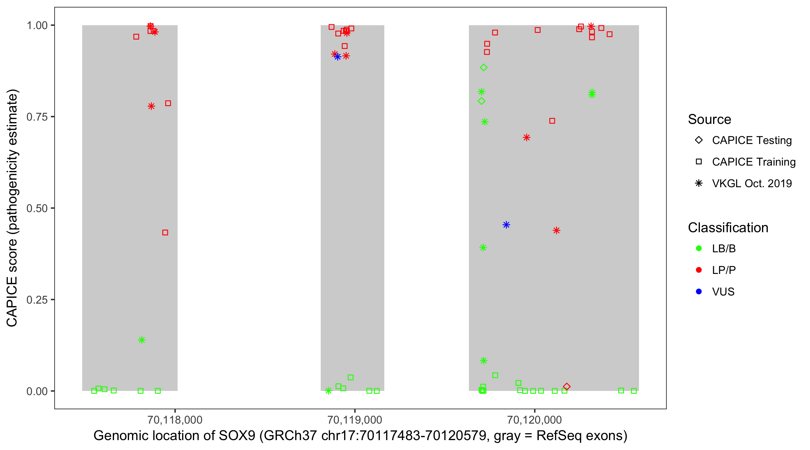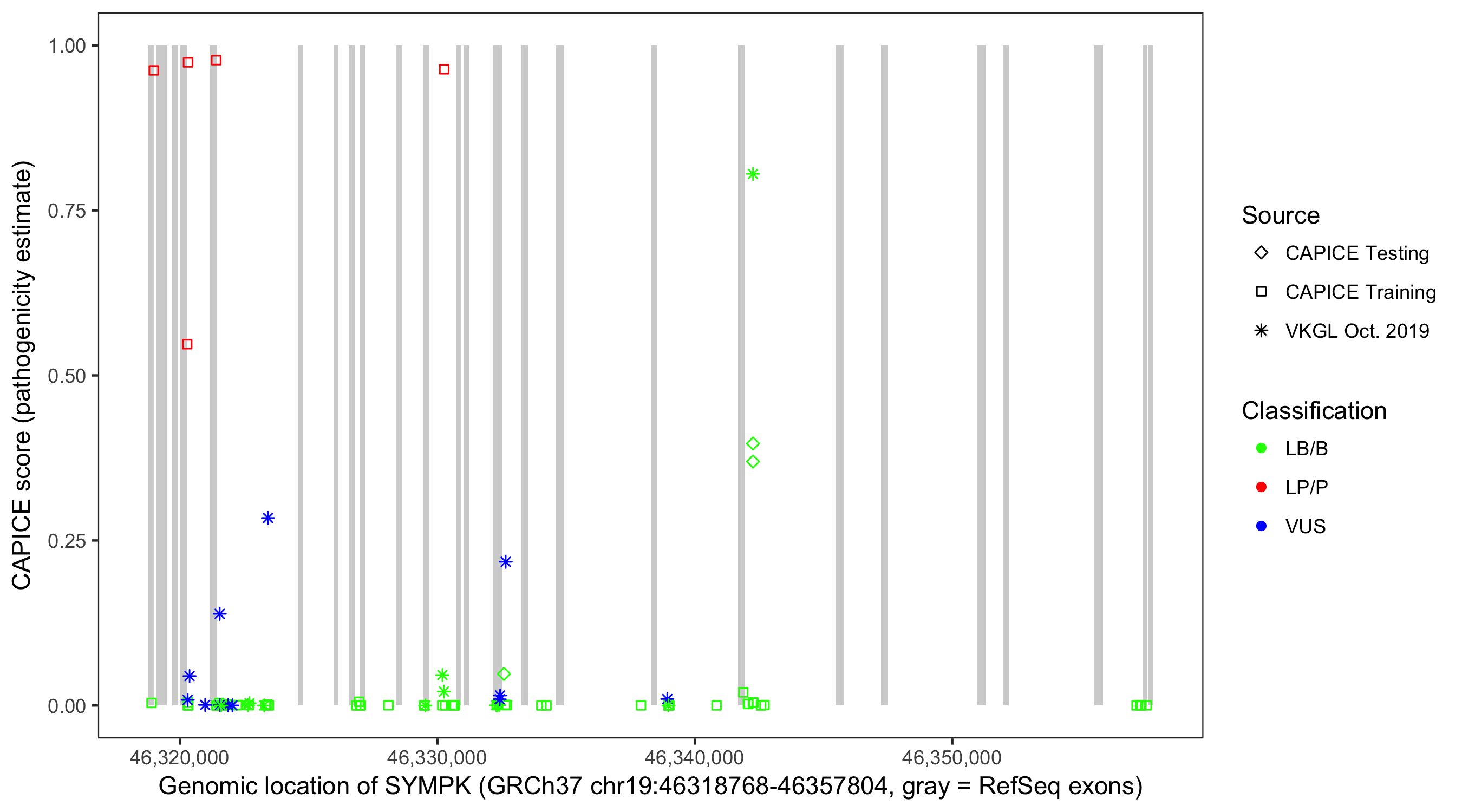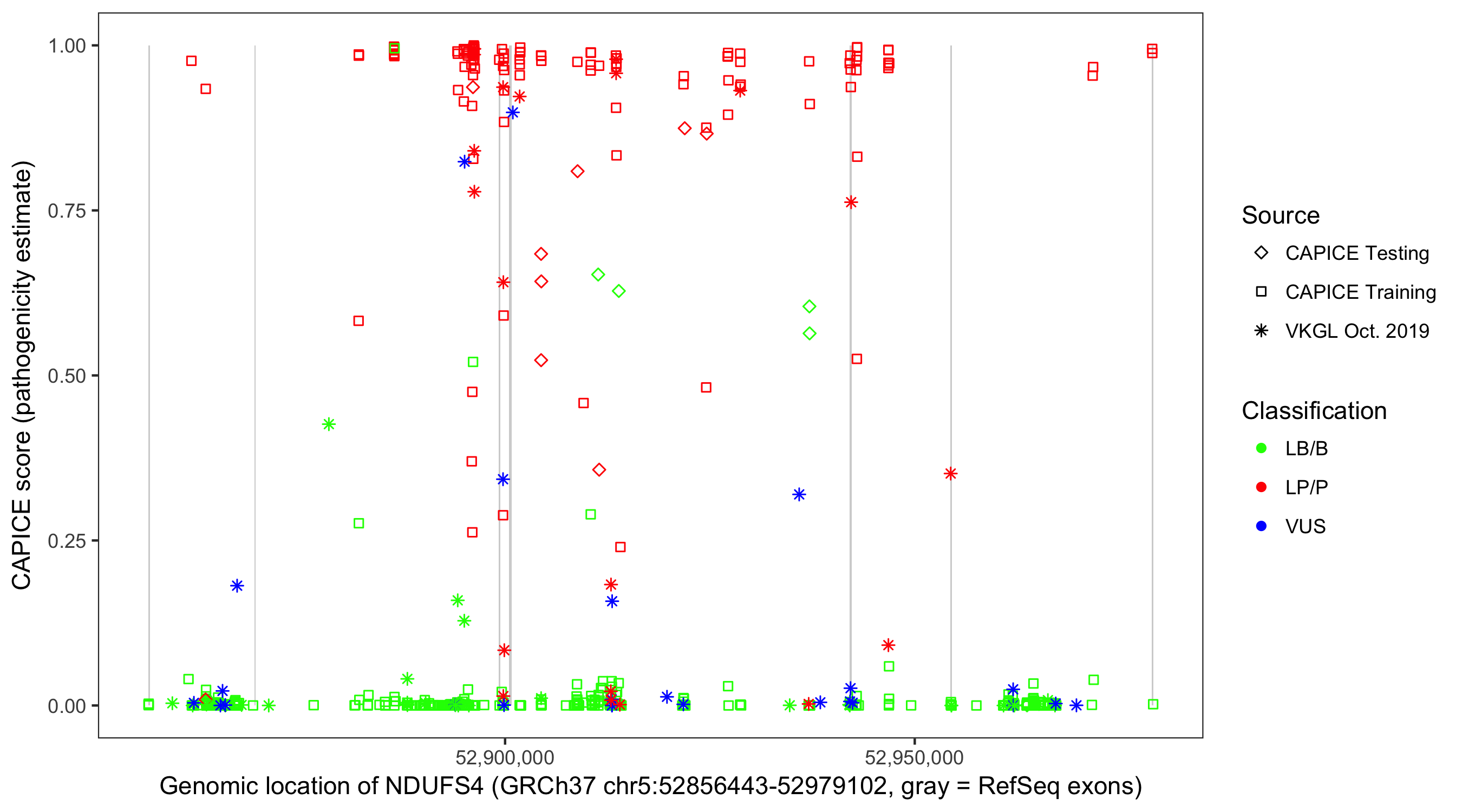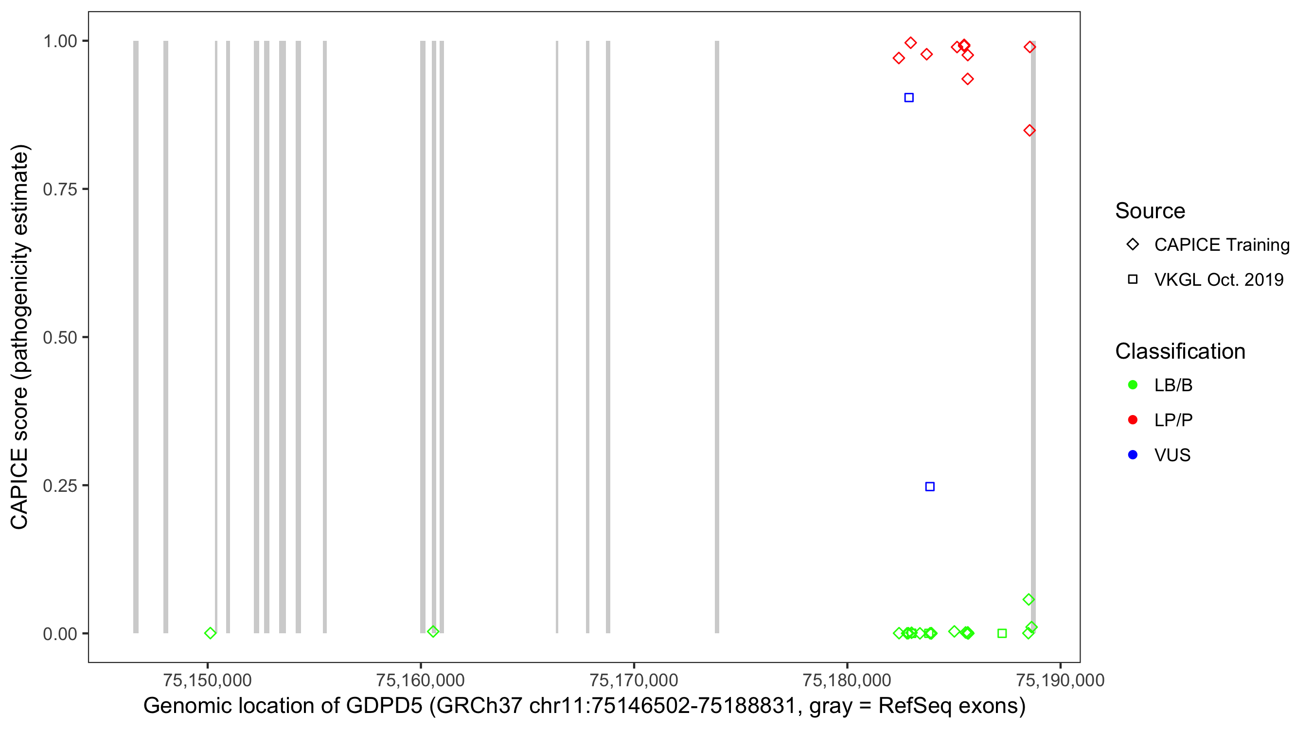 Shown are CAPICE train/test variants plus VKGL Oct 2019.