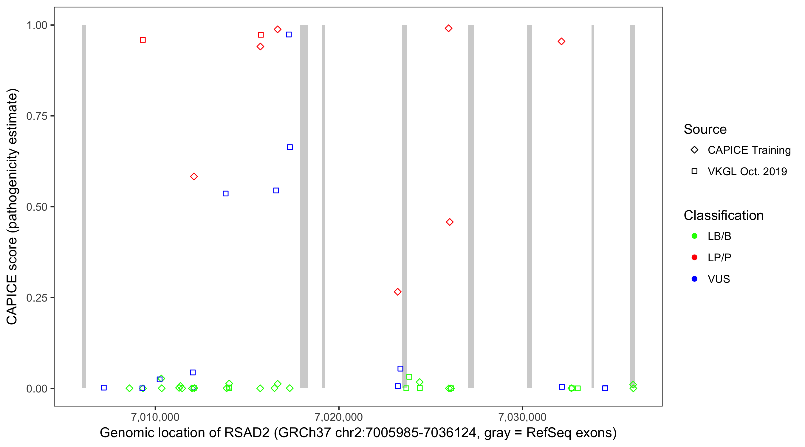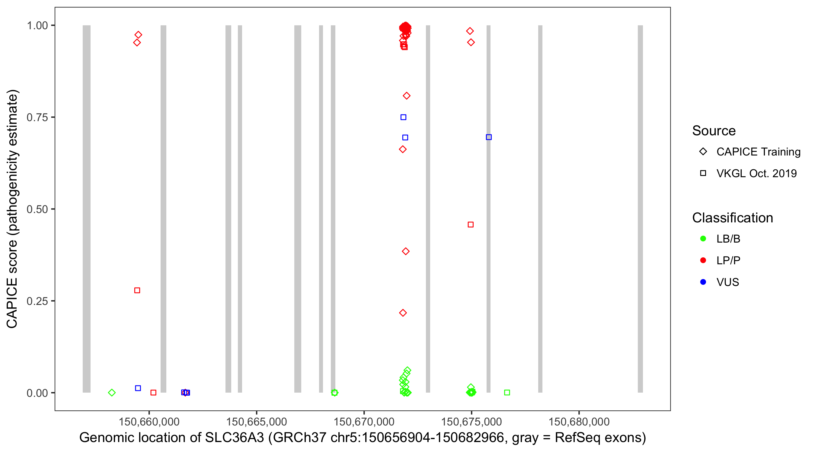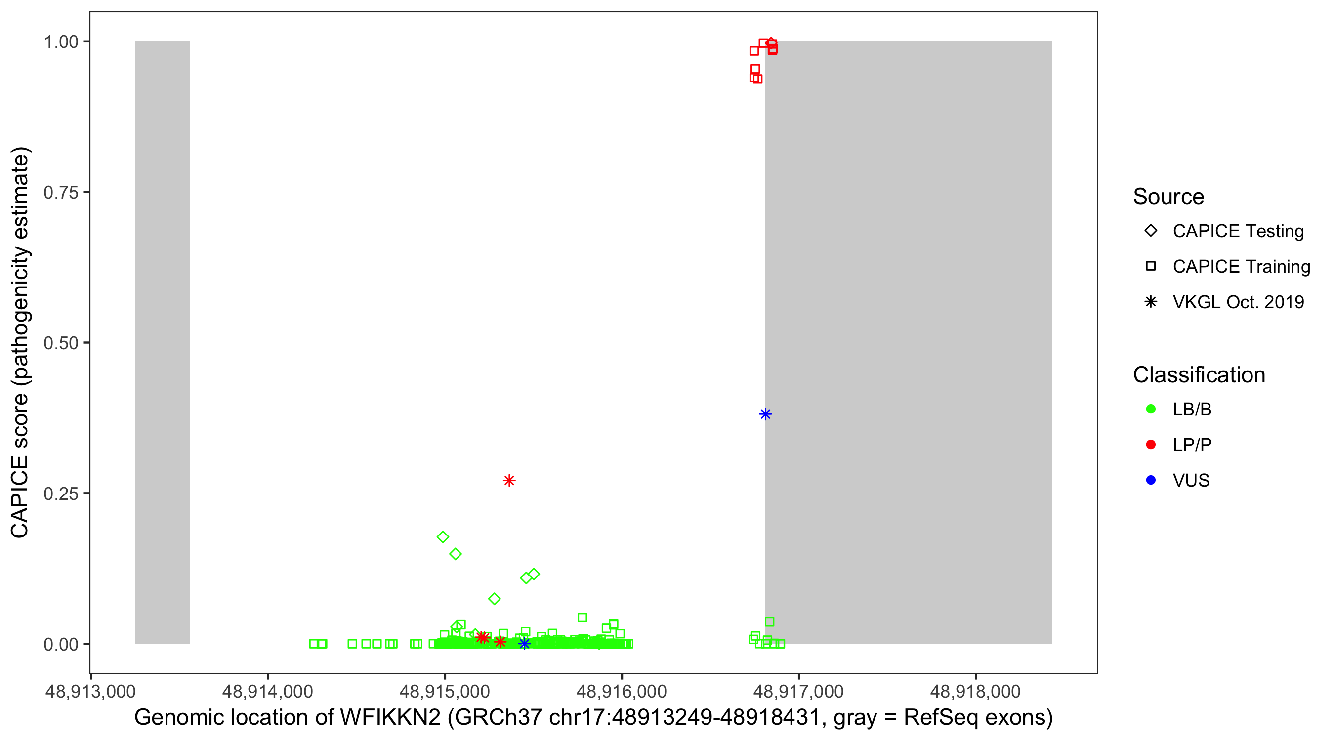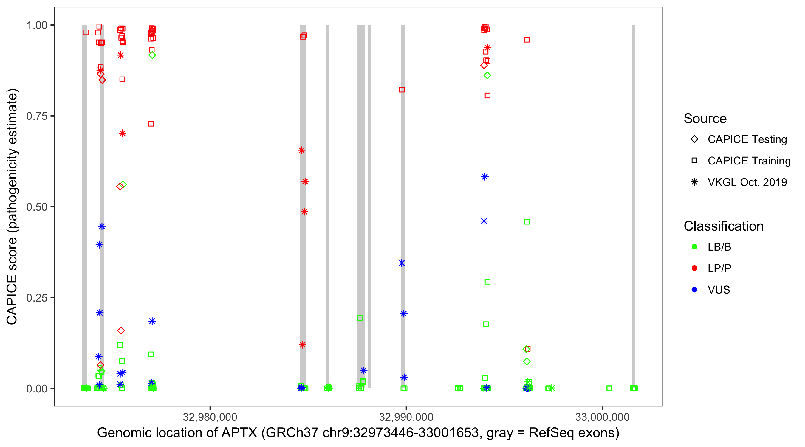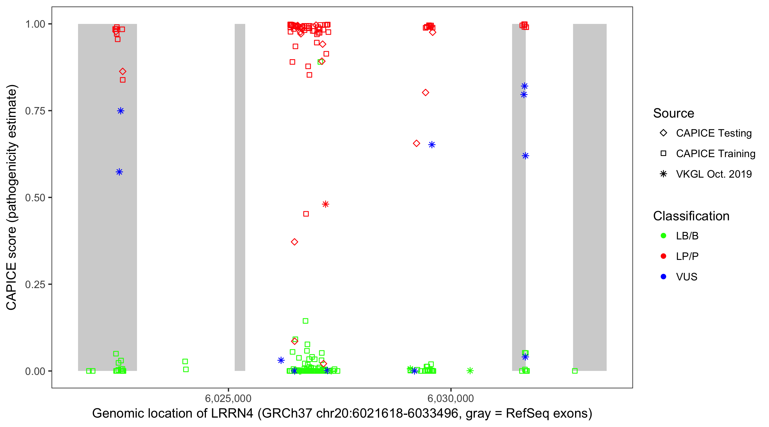 Shown are CAPICE train/test variants plus VKGL Oct 2019.