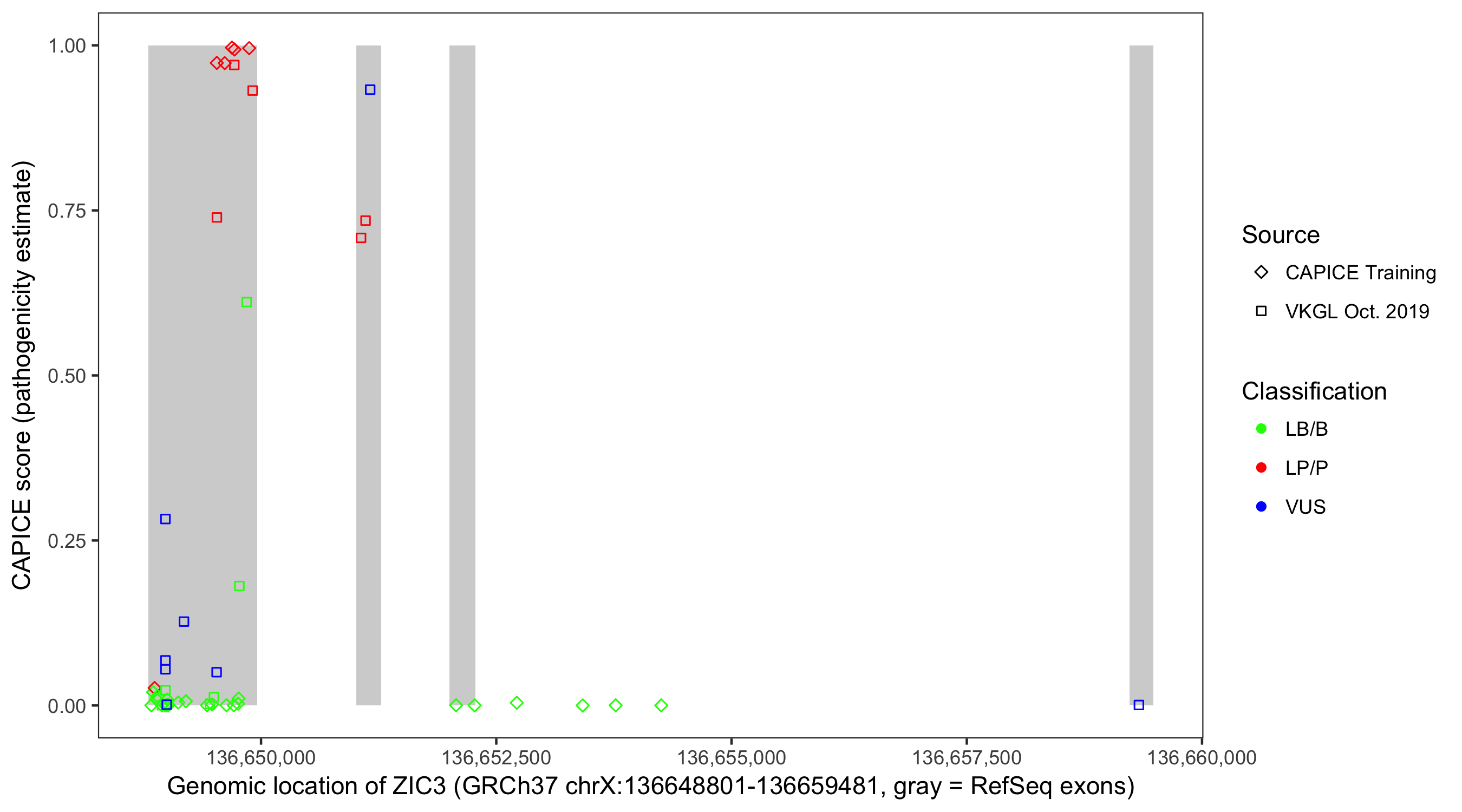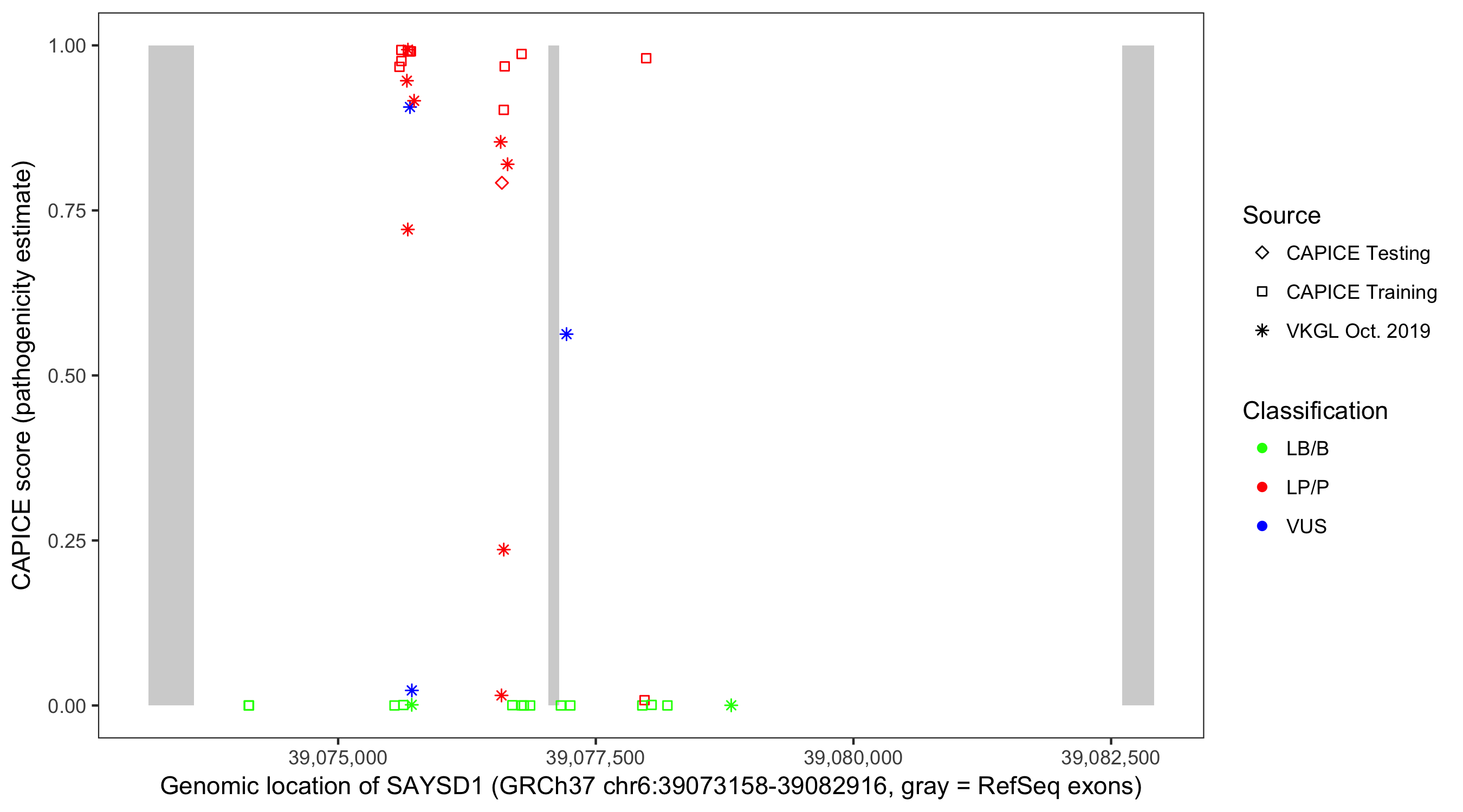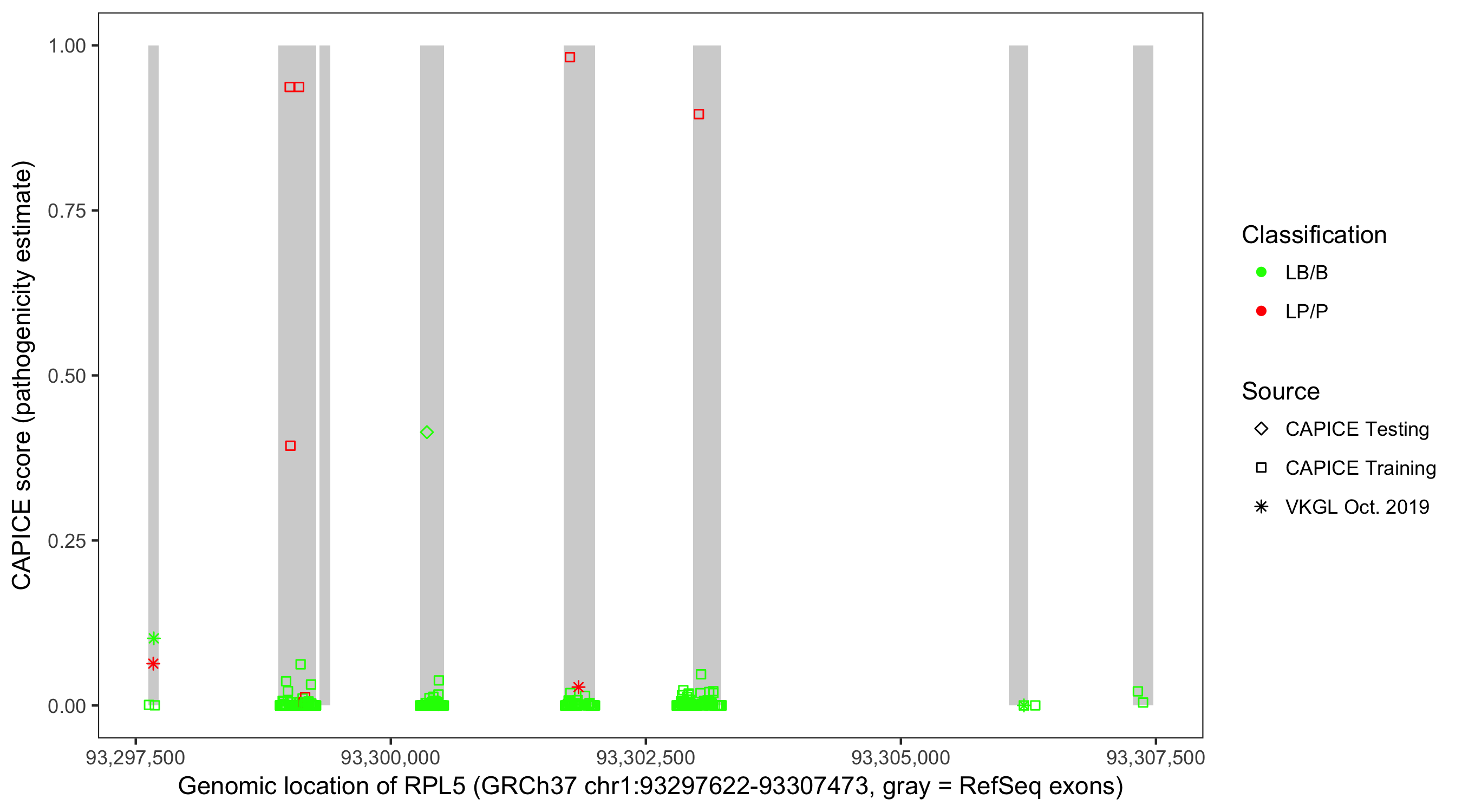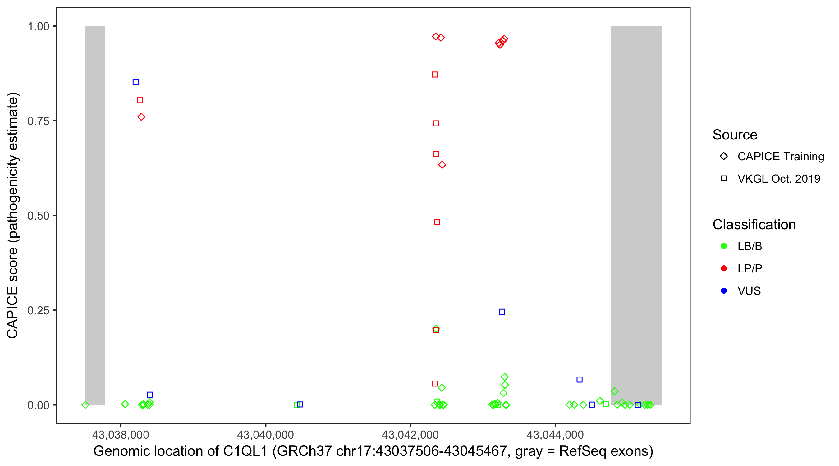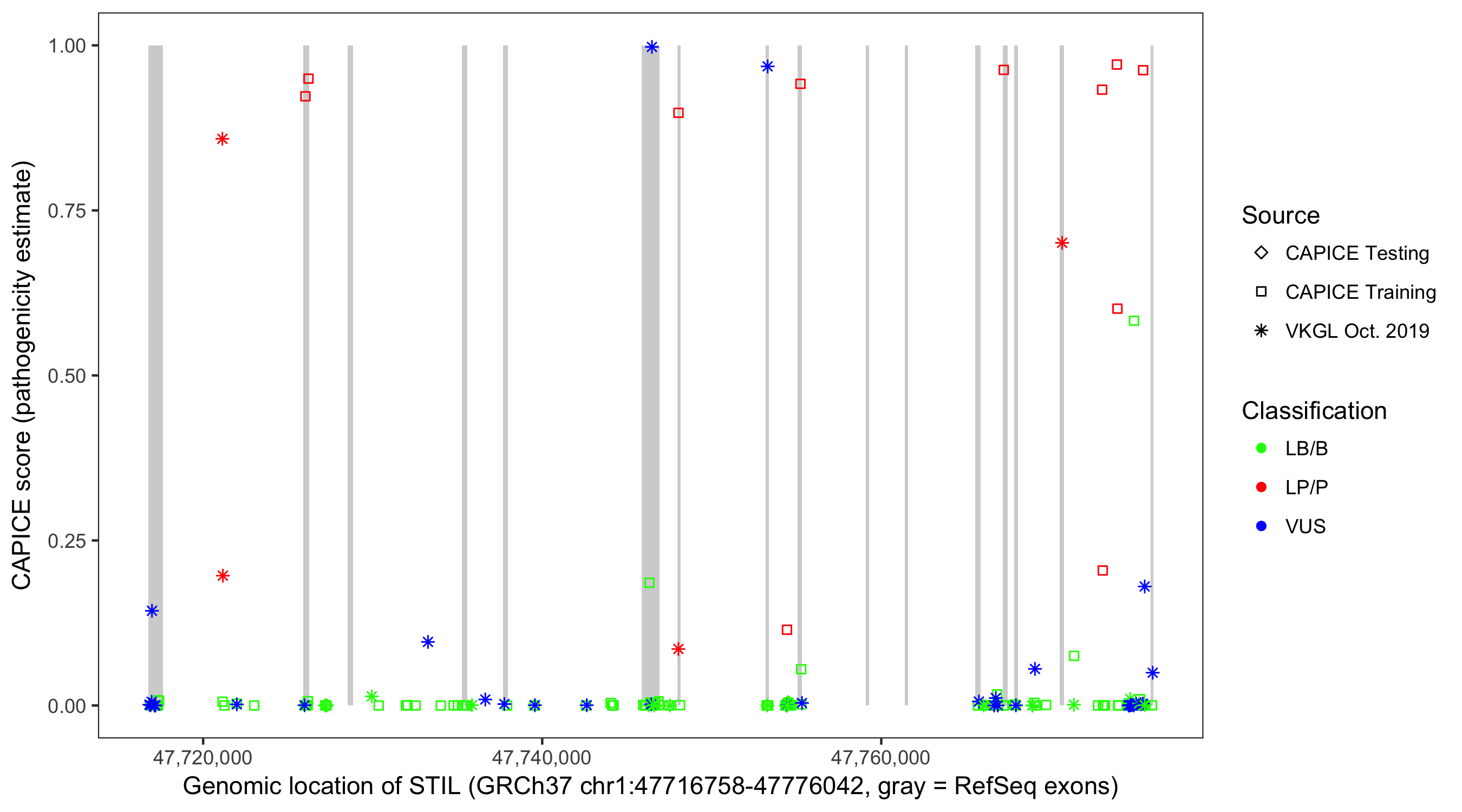 Shown are CAPICE train/test variants plus VKGL Oct 2019.
