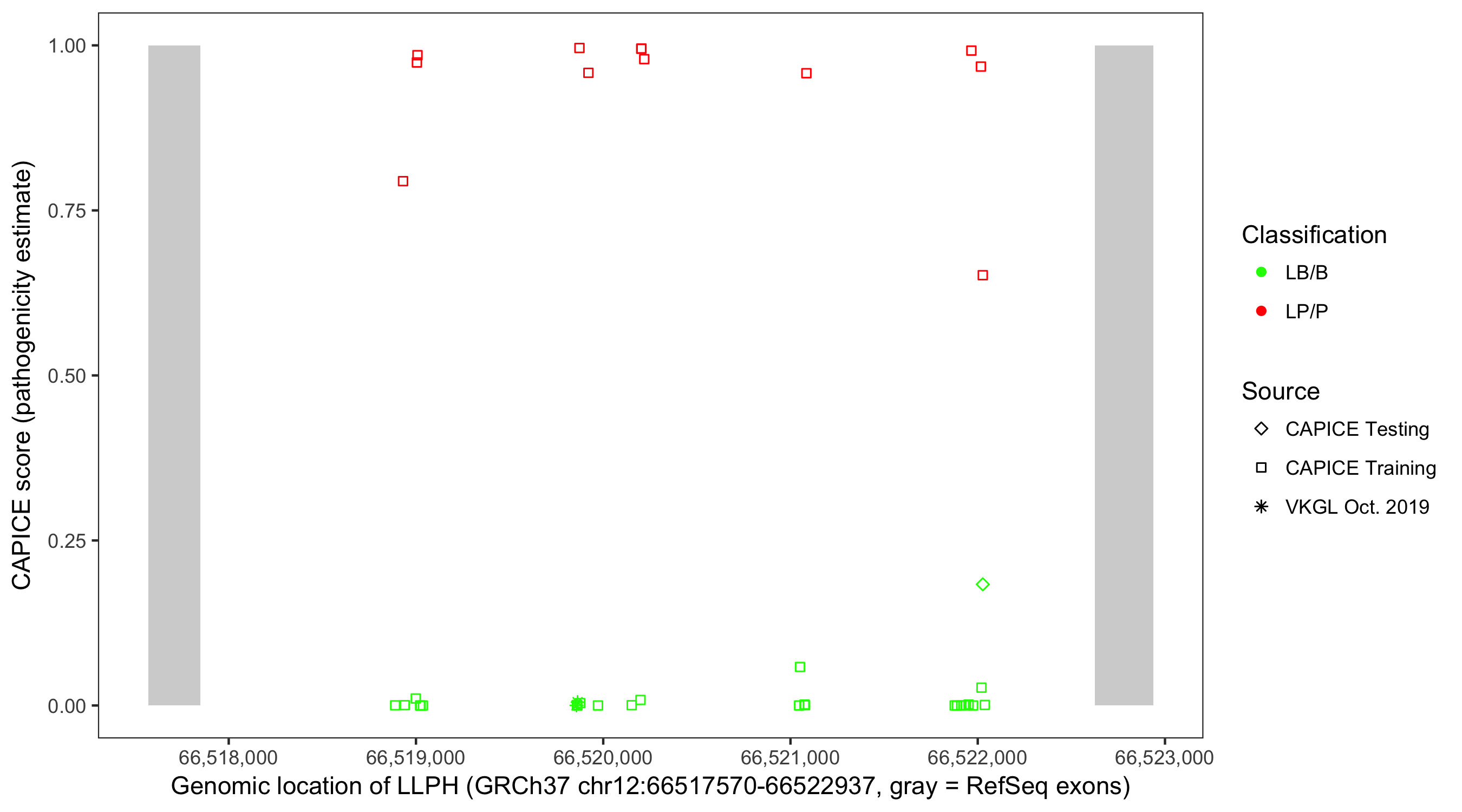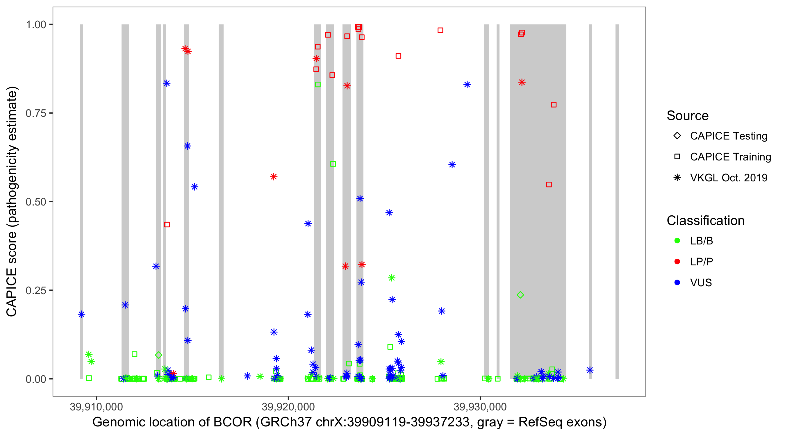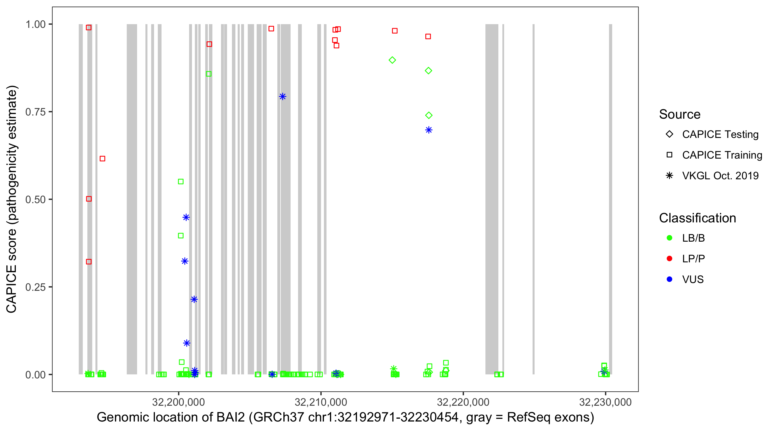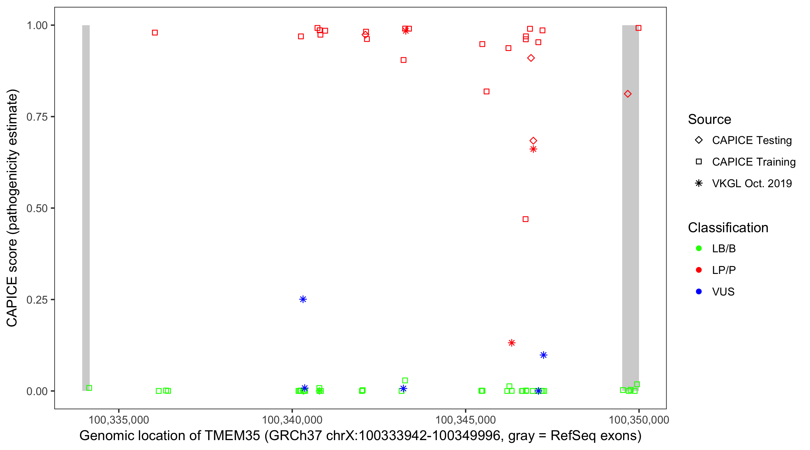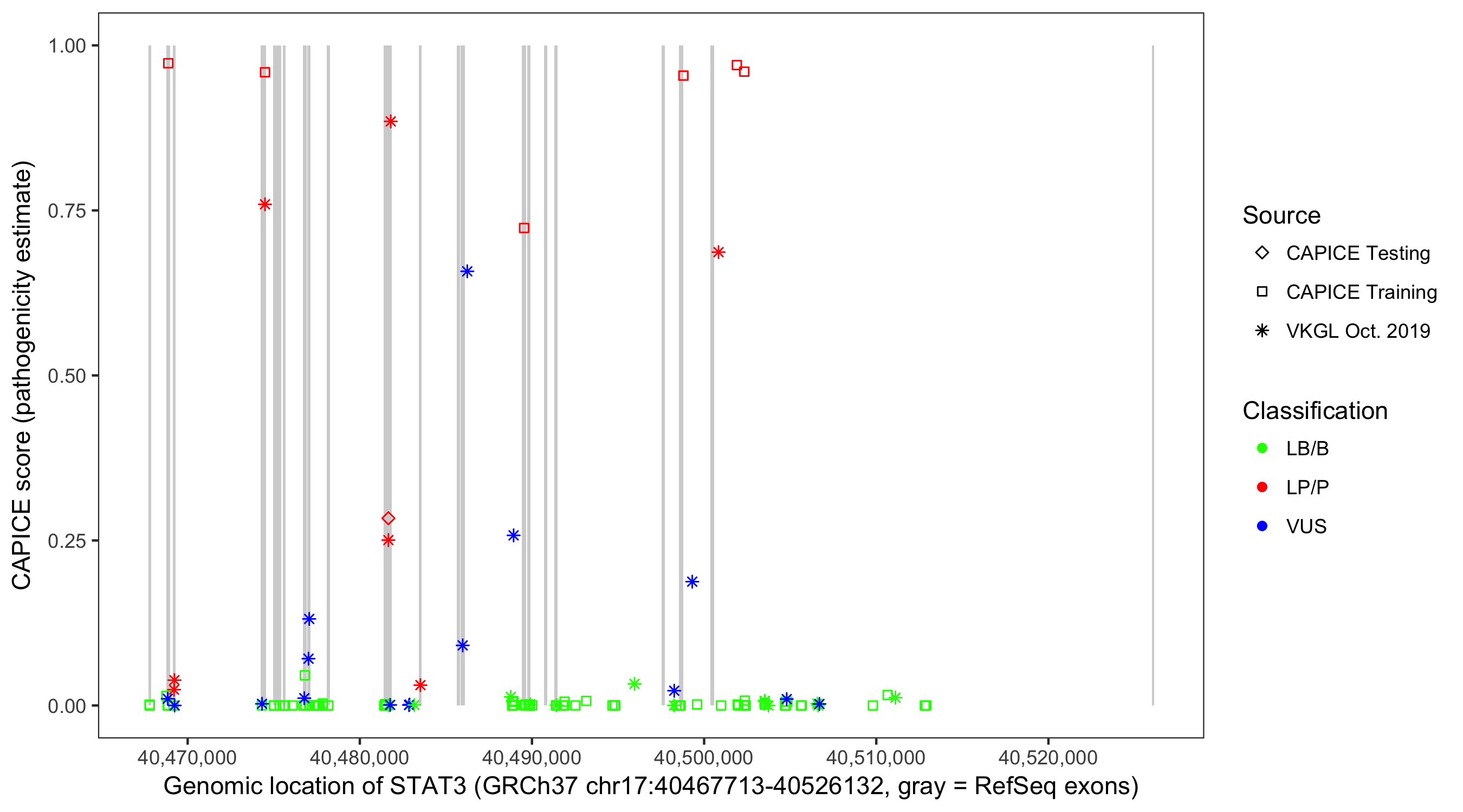 Shown are CAPICE train/test variants plus VKGL Oct 2019.