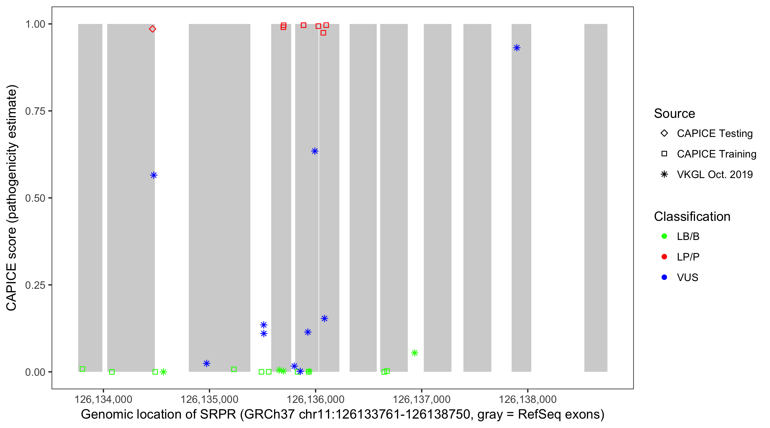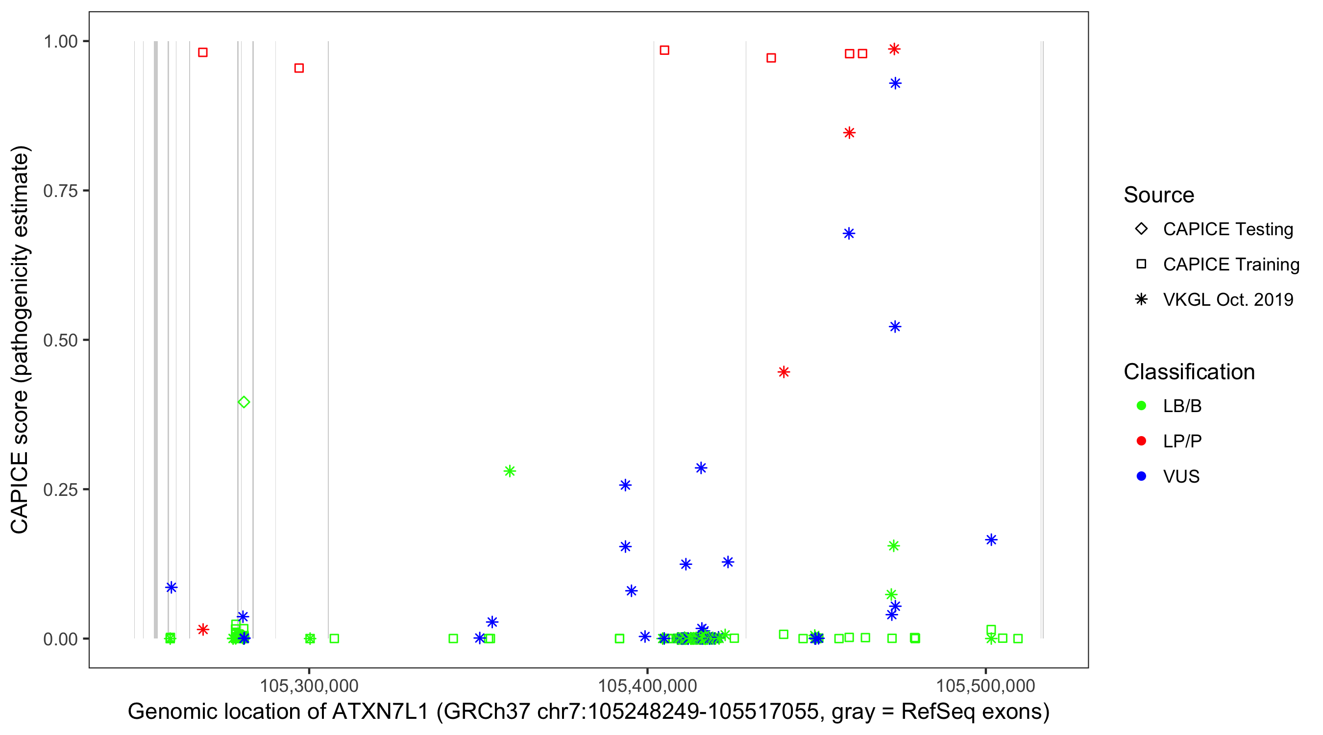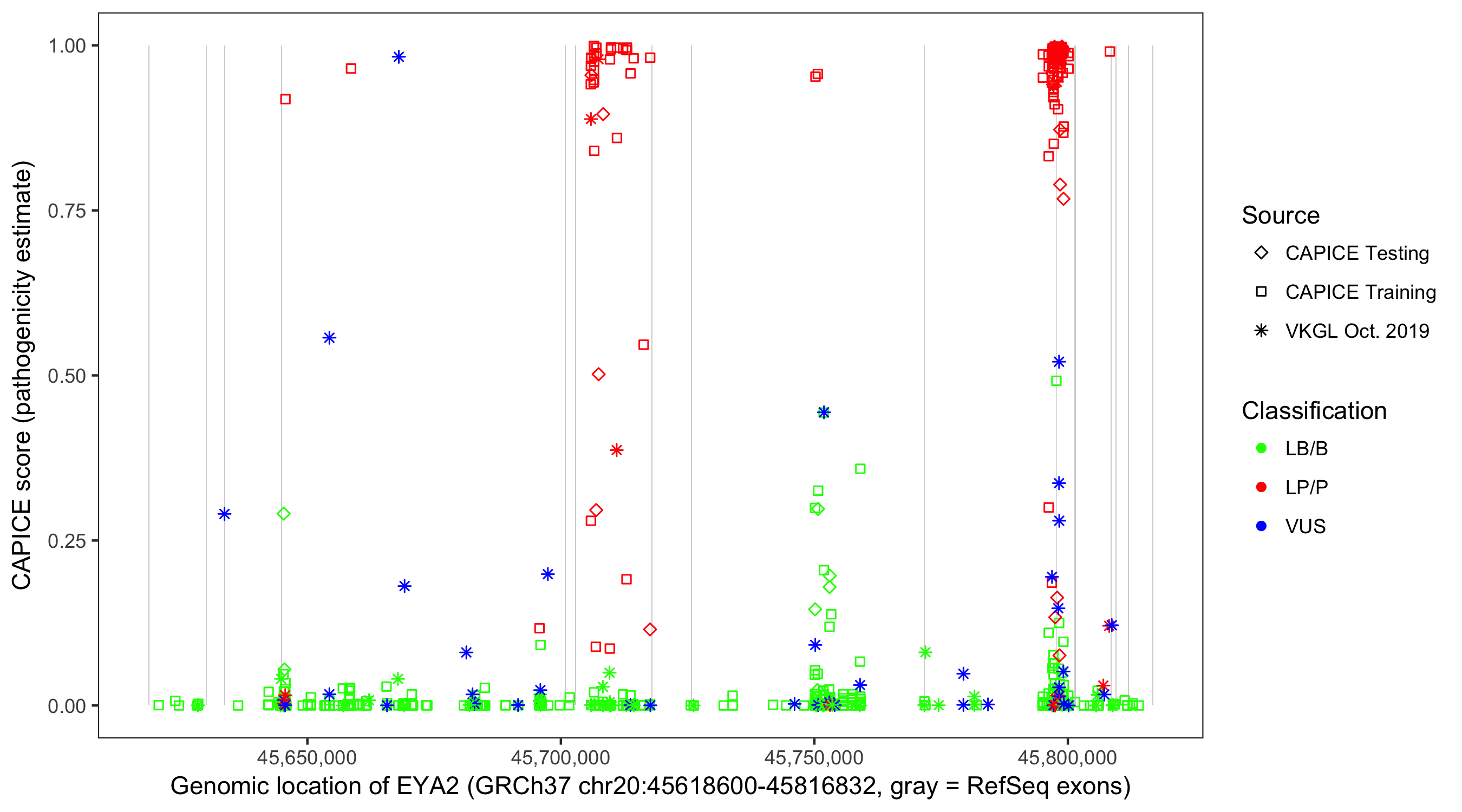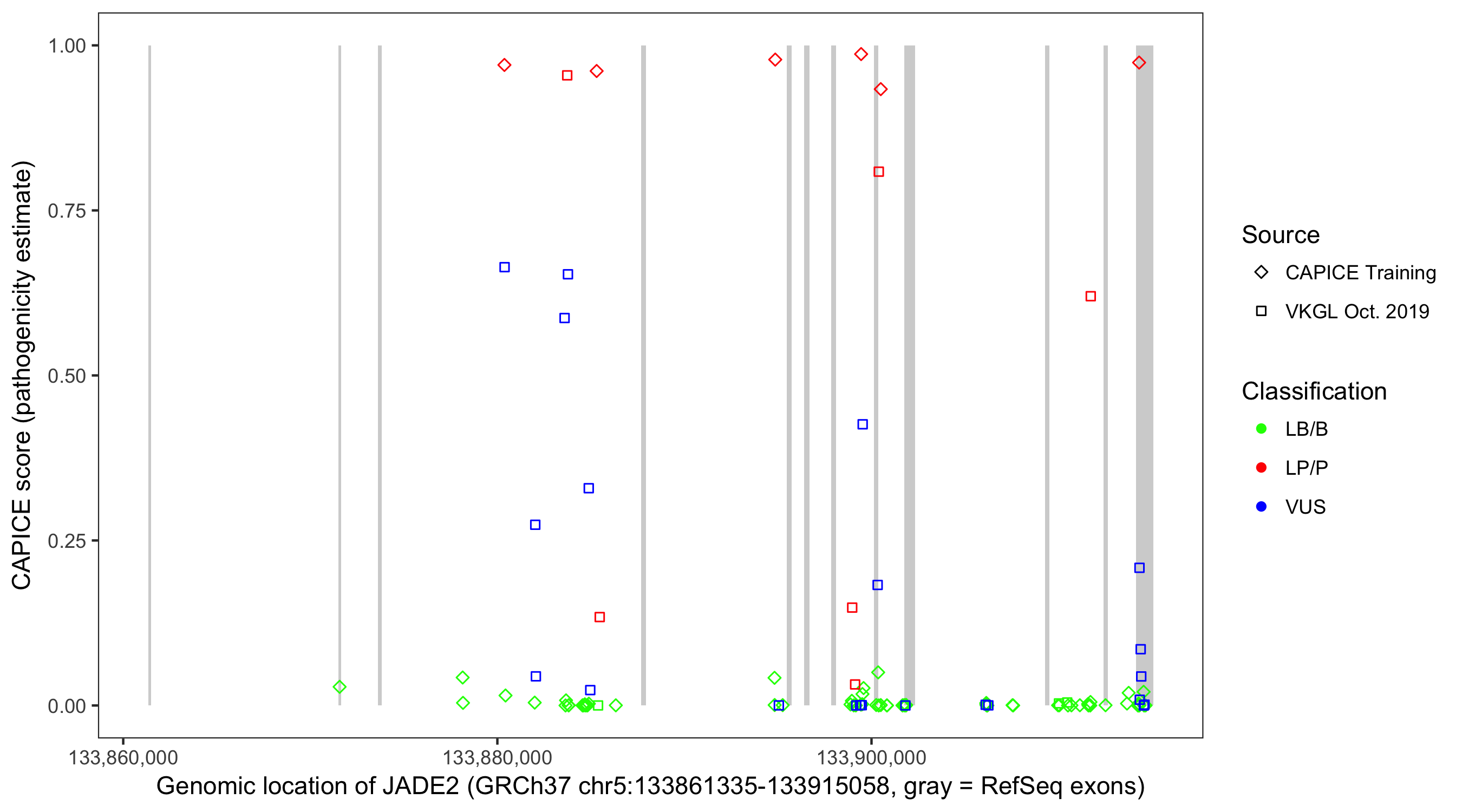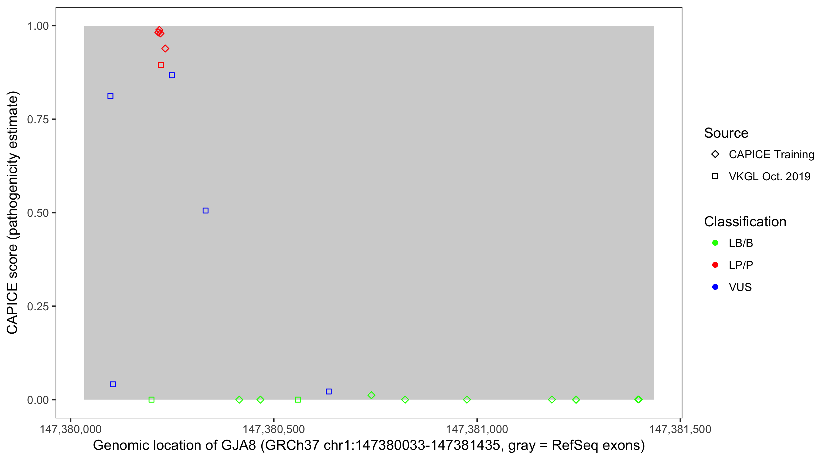 Shown are CAPICE train/test variants plus VKGL Oct 2019.