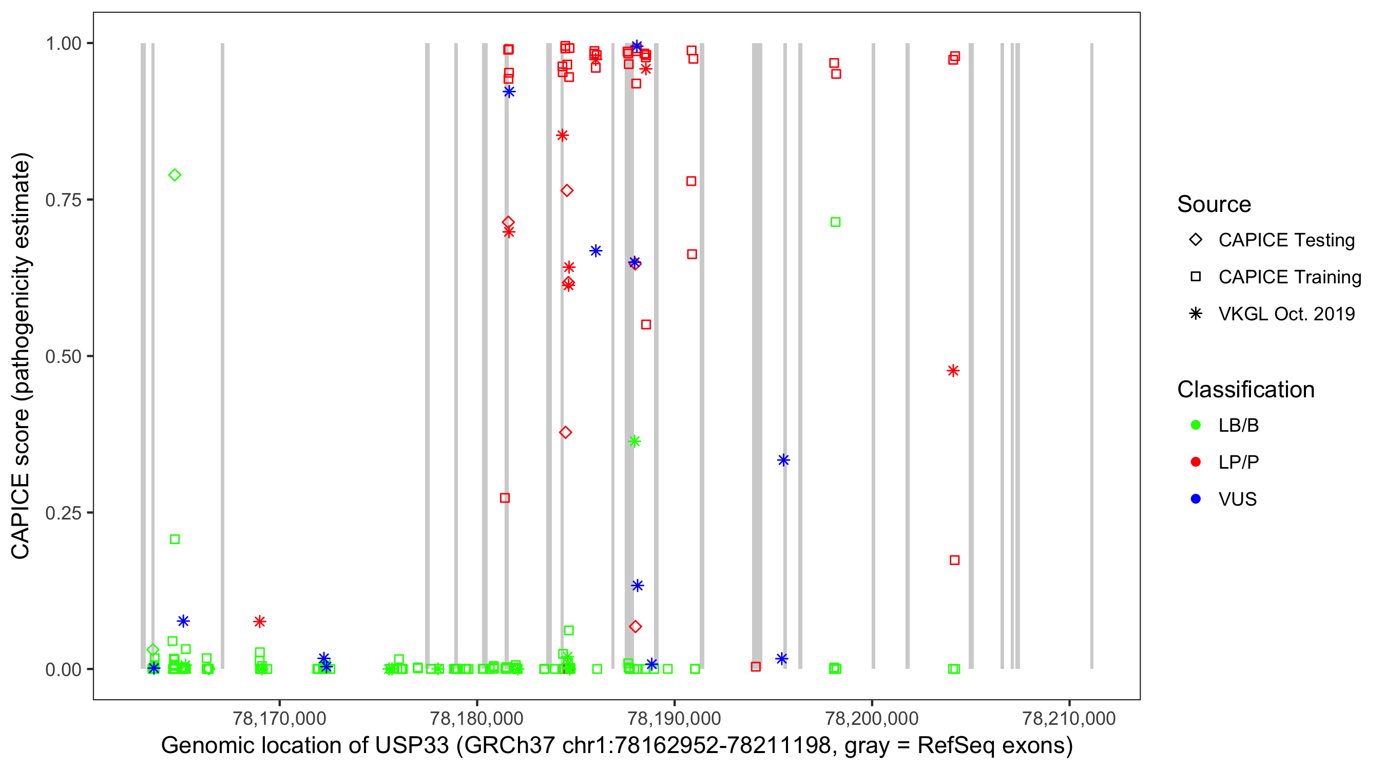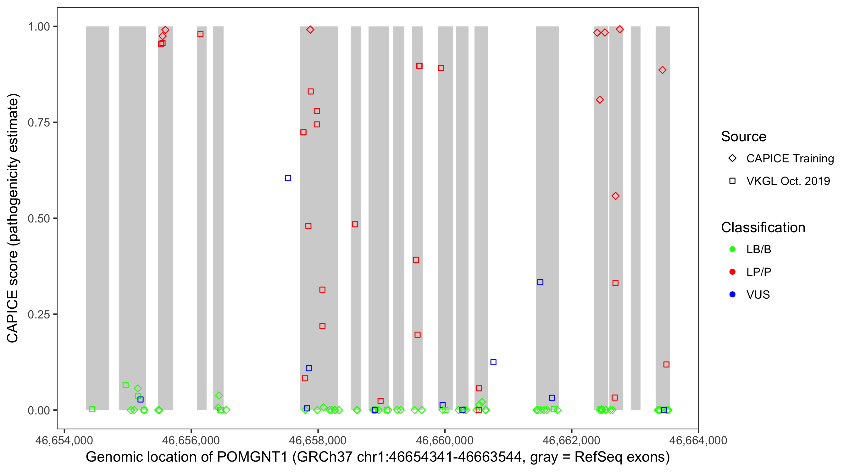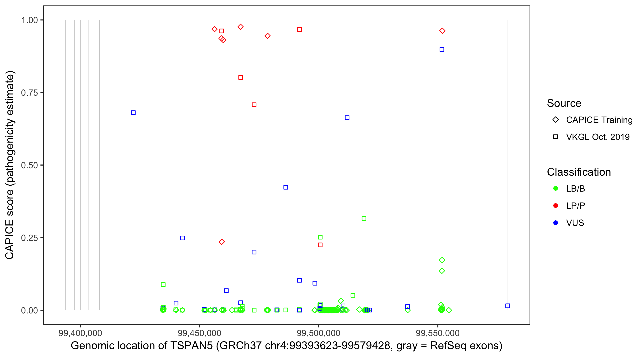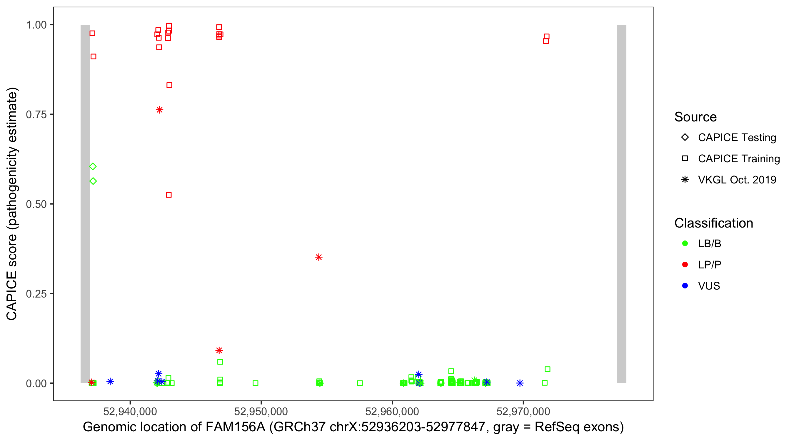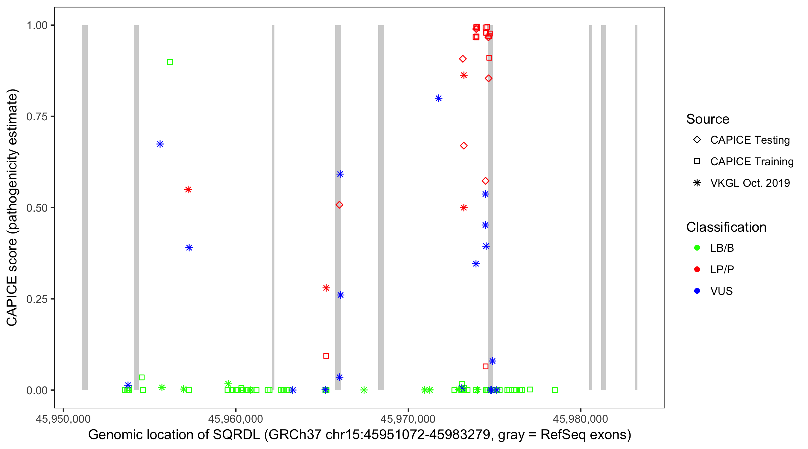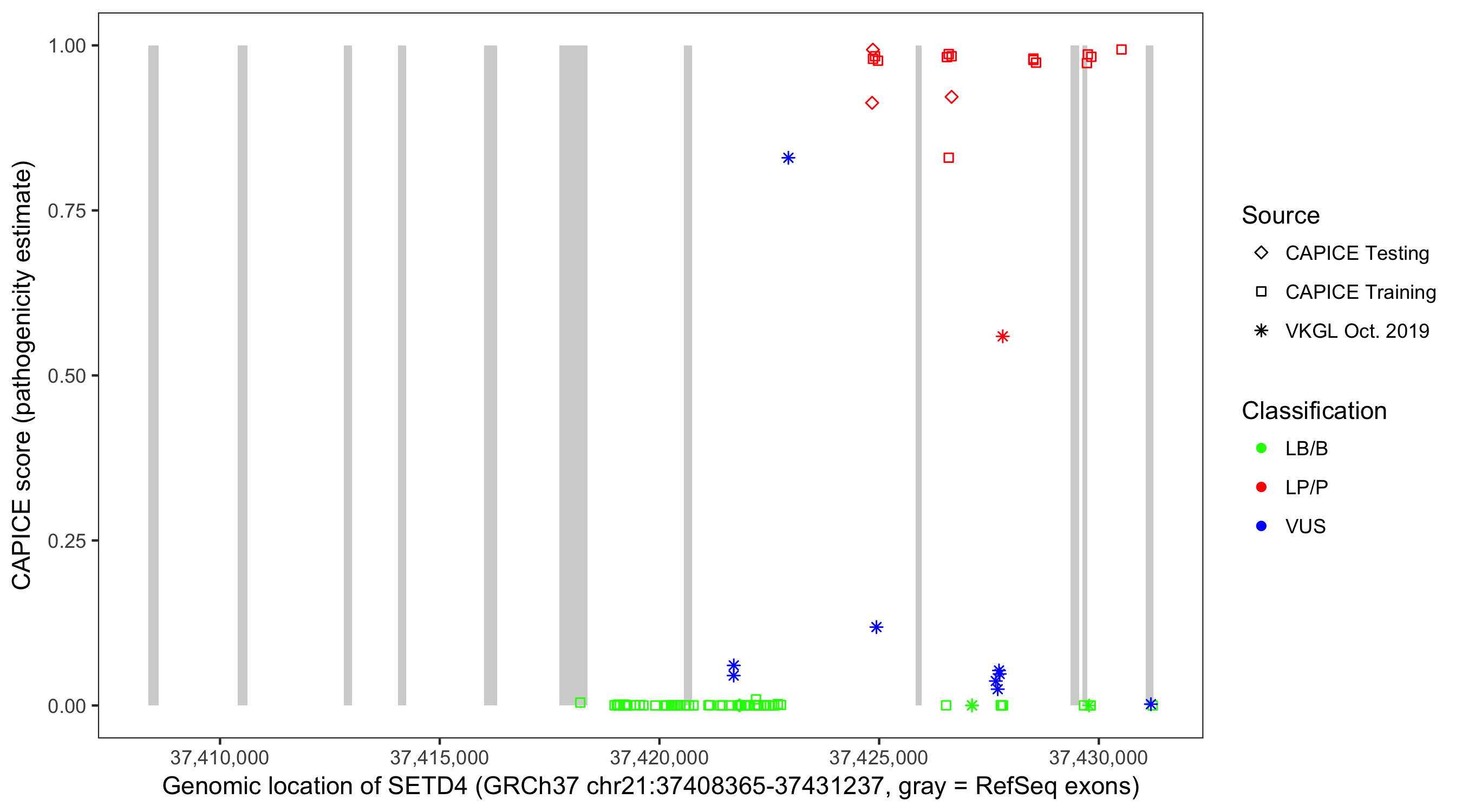 Shown are CAPICE train/test variants plus VKGL Oct 2019.
