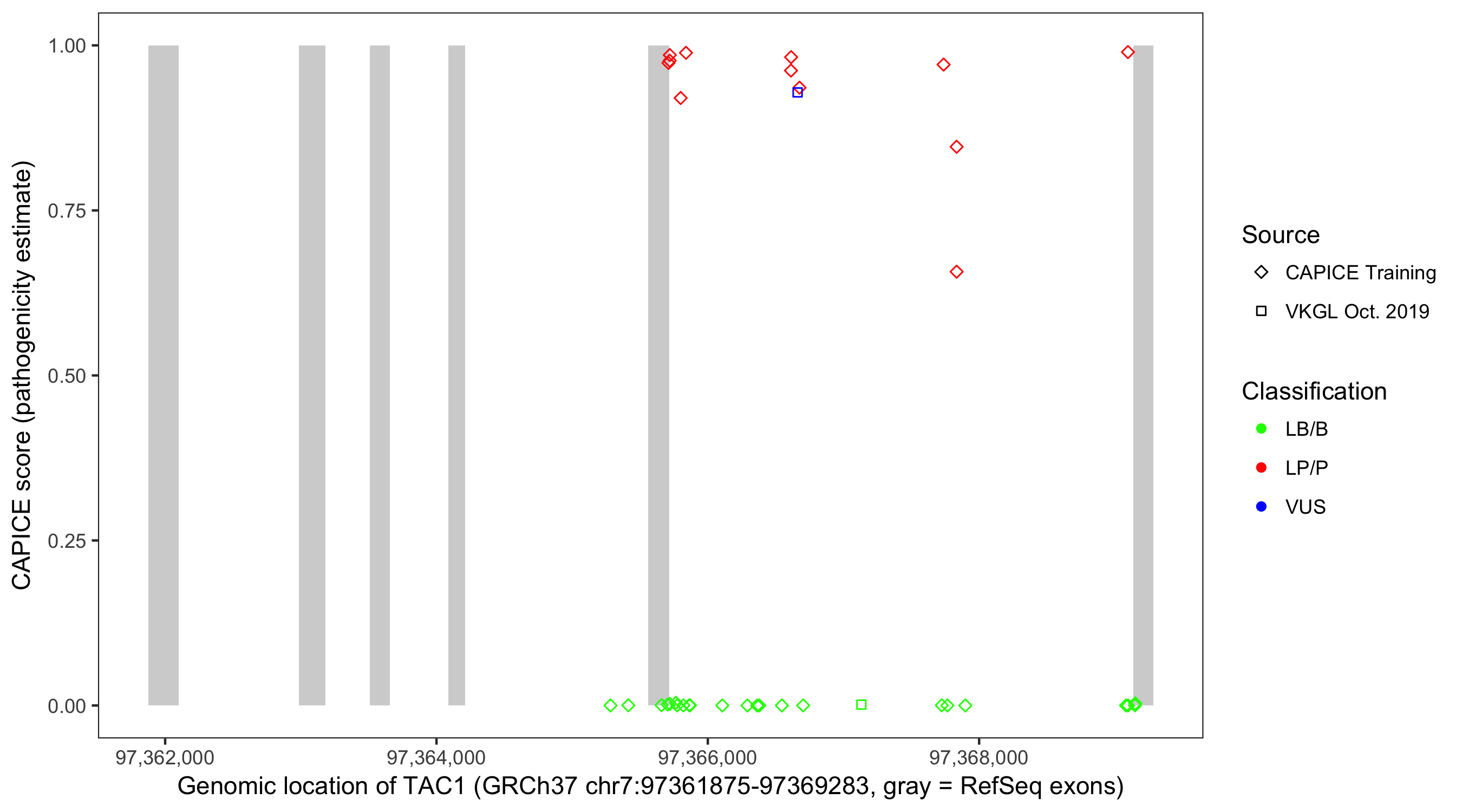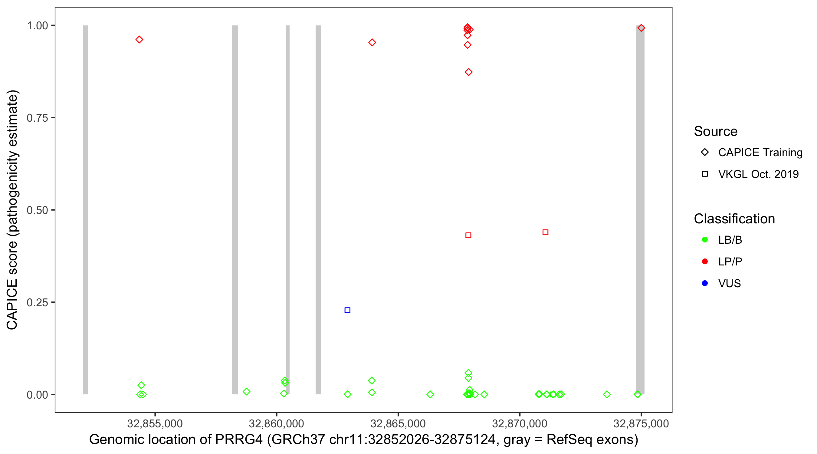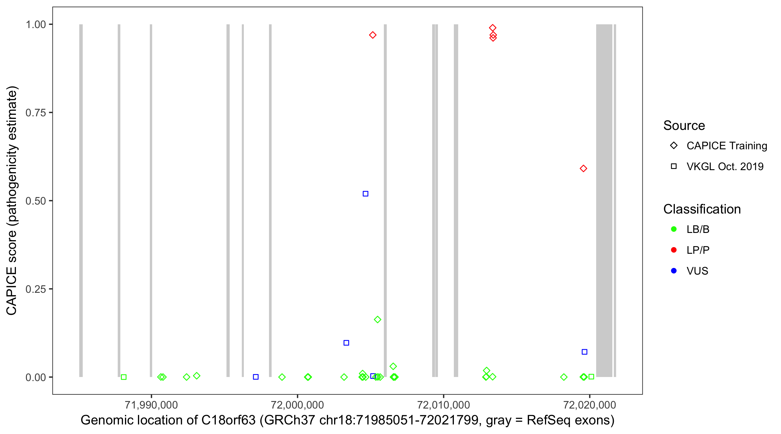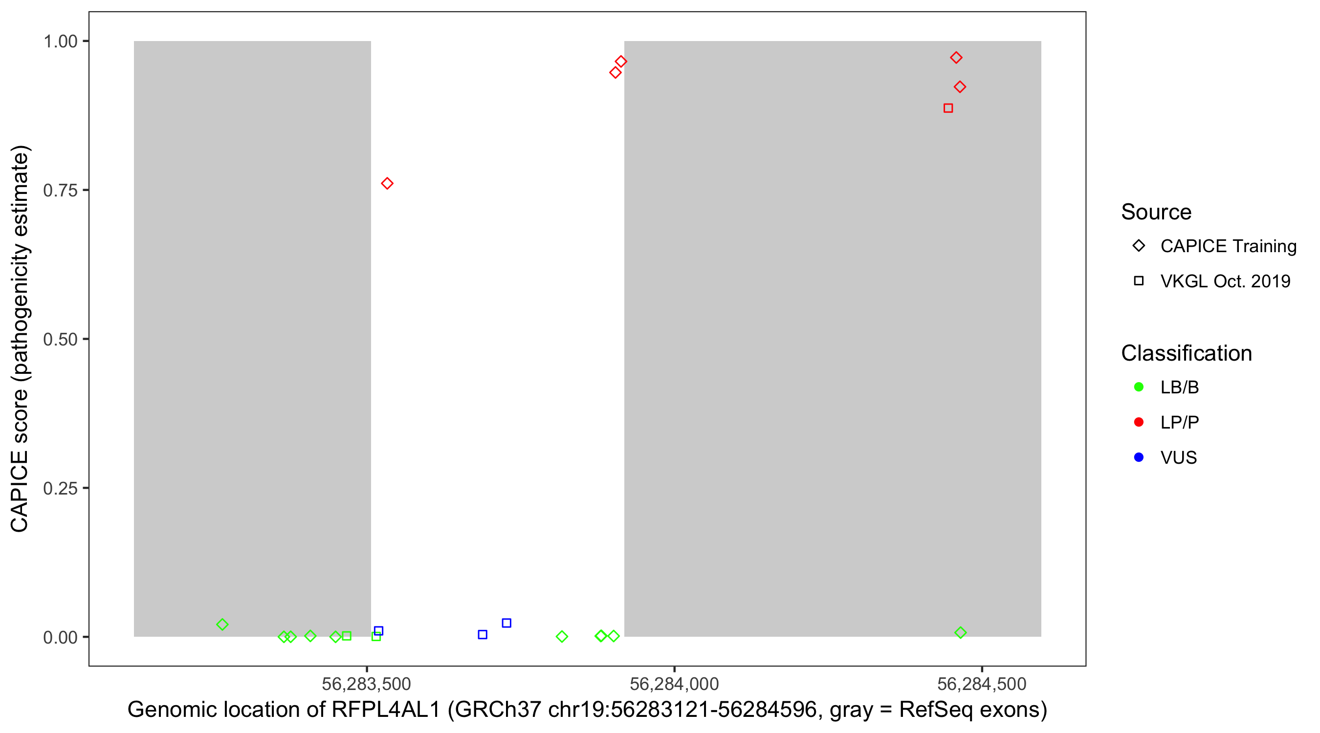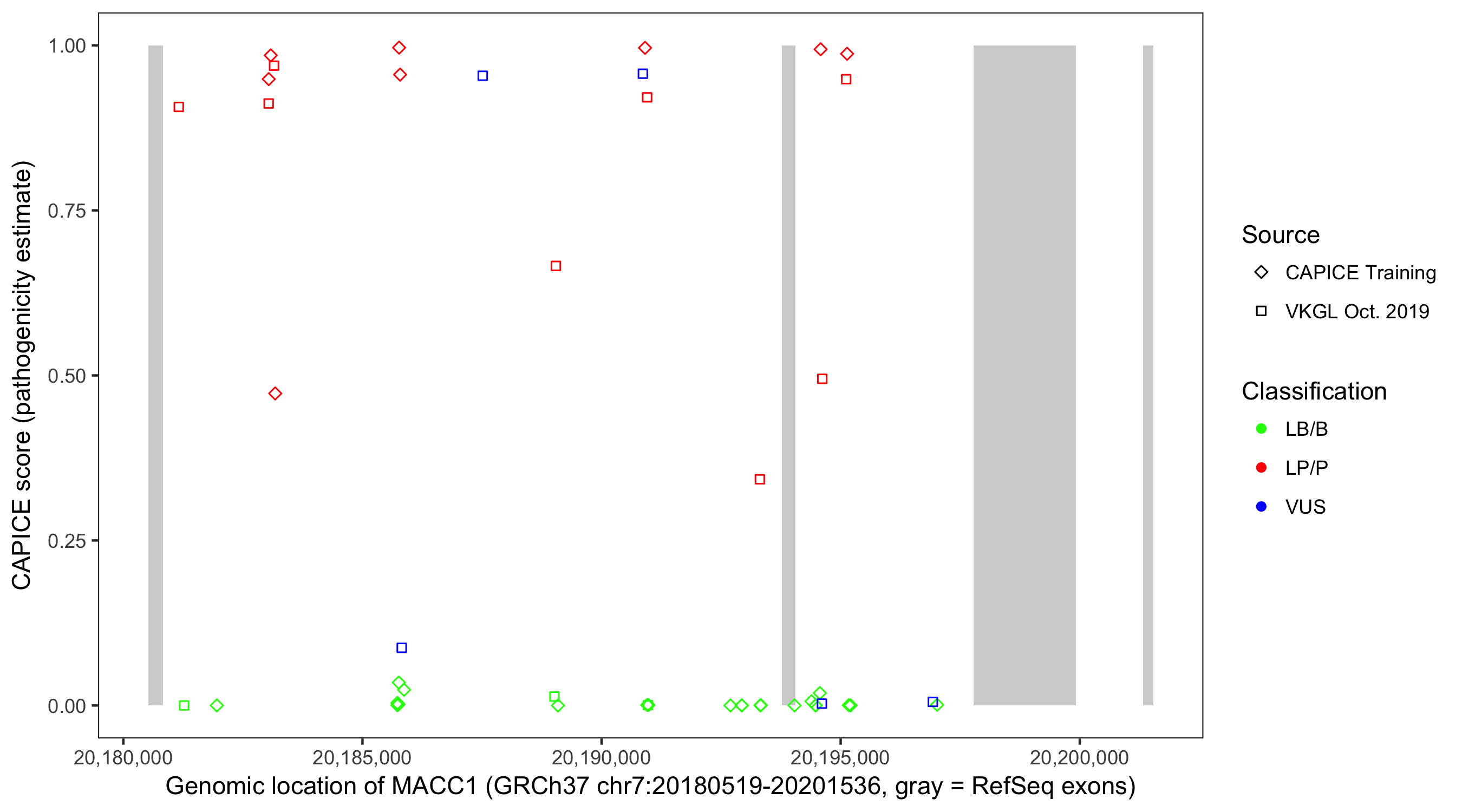 Shown are CAPICE train/test variants plus VKGL Oct 2019.