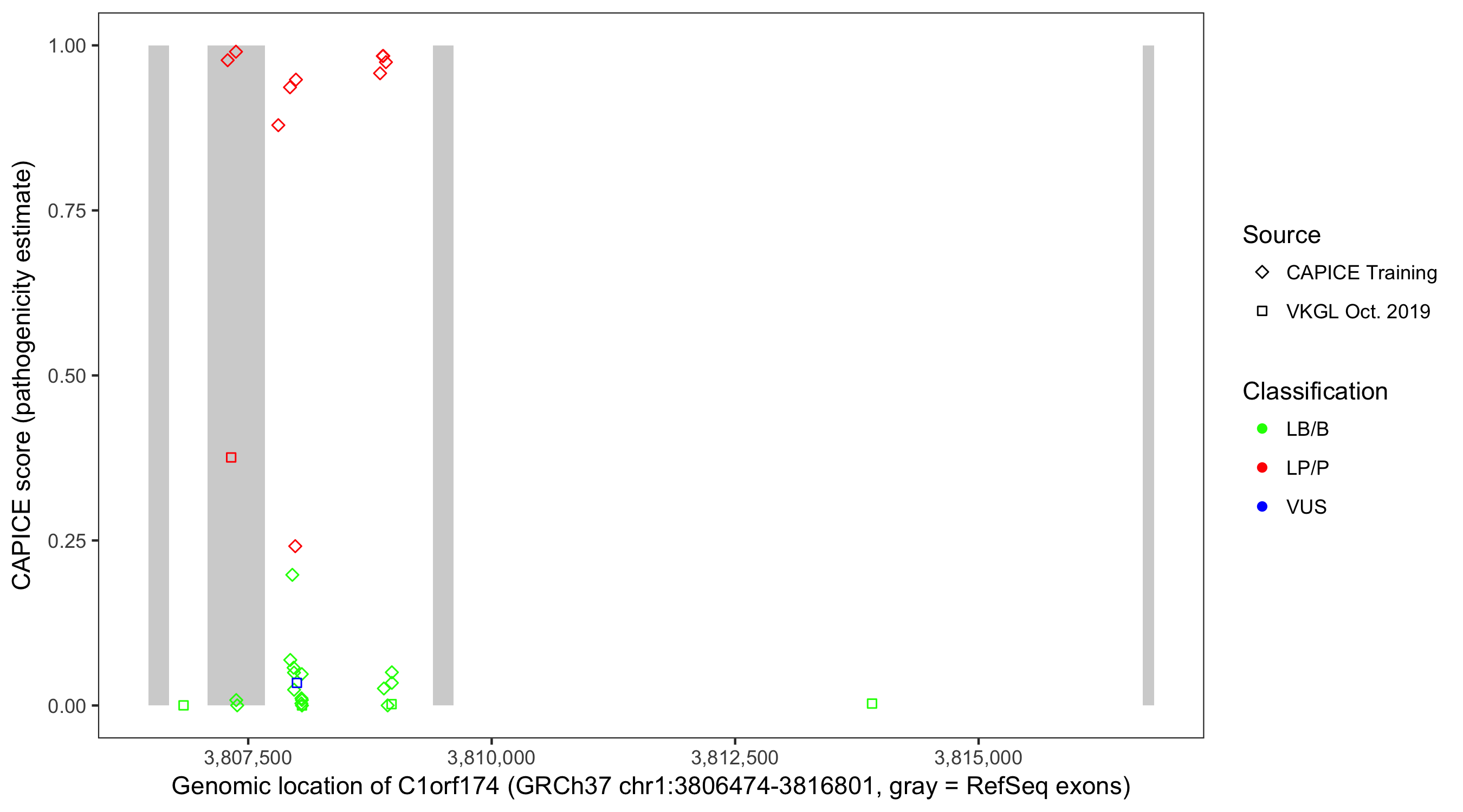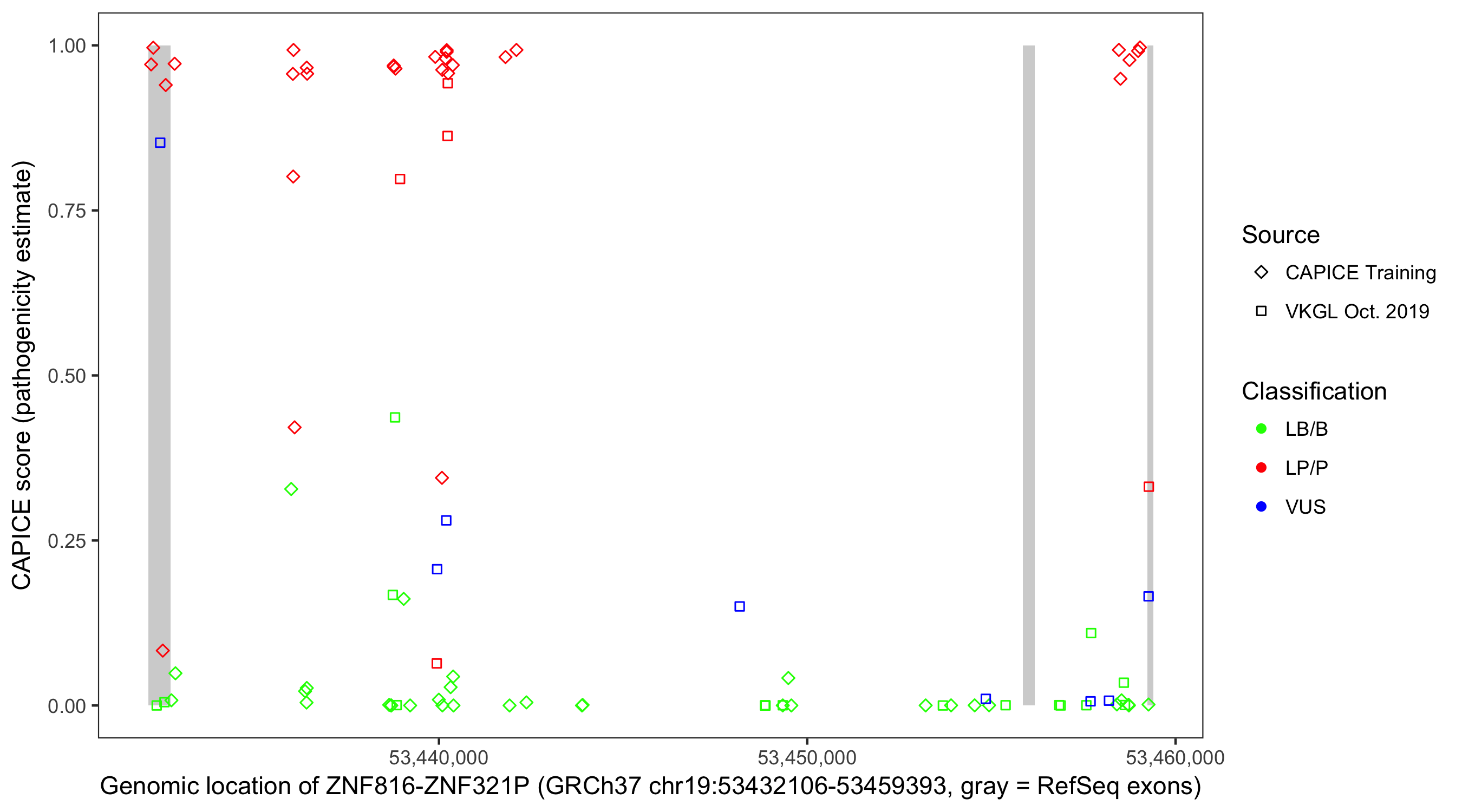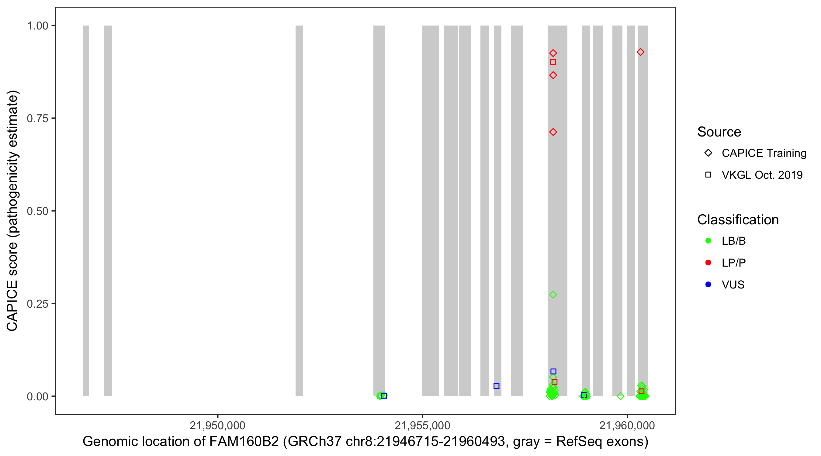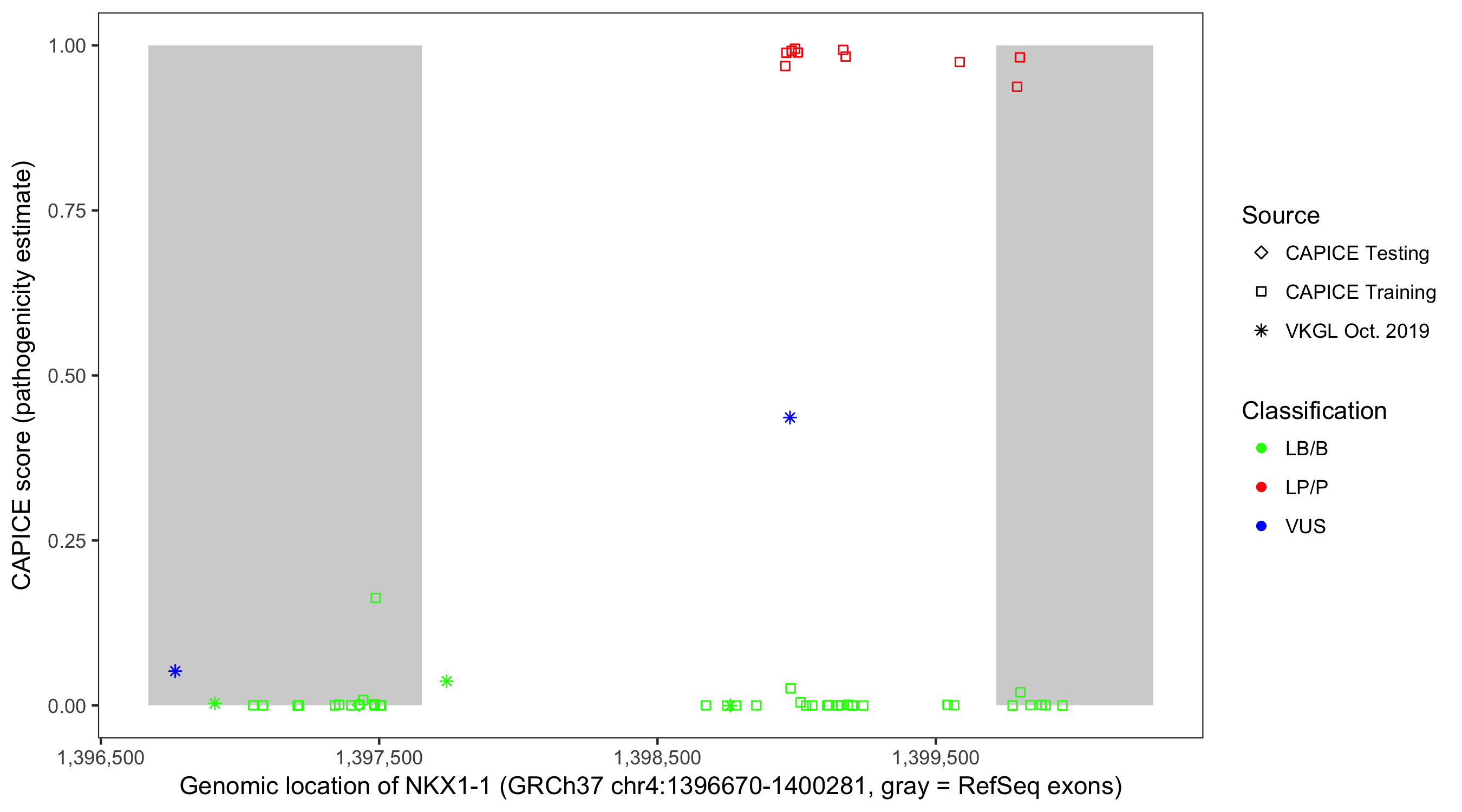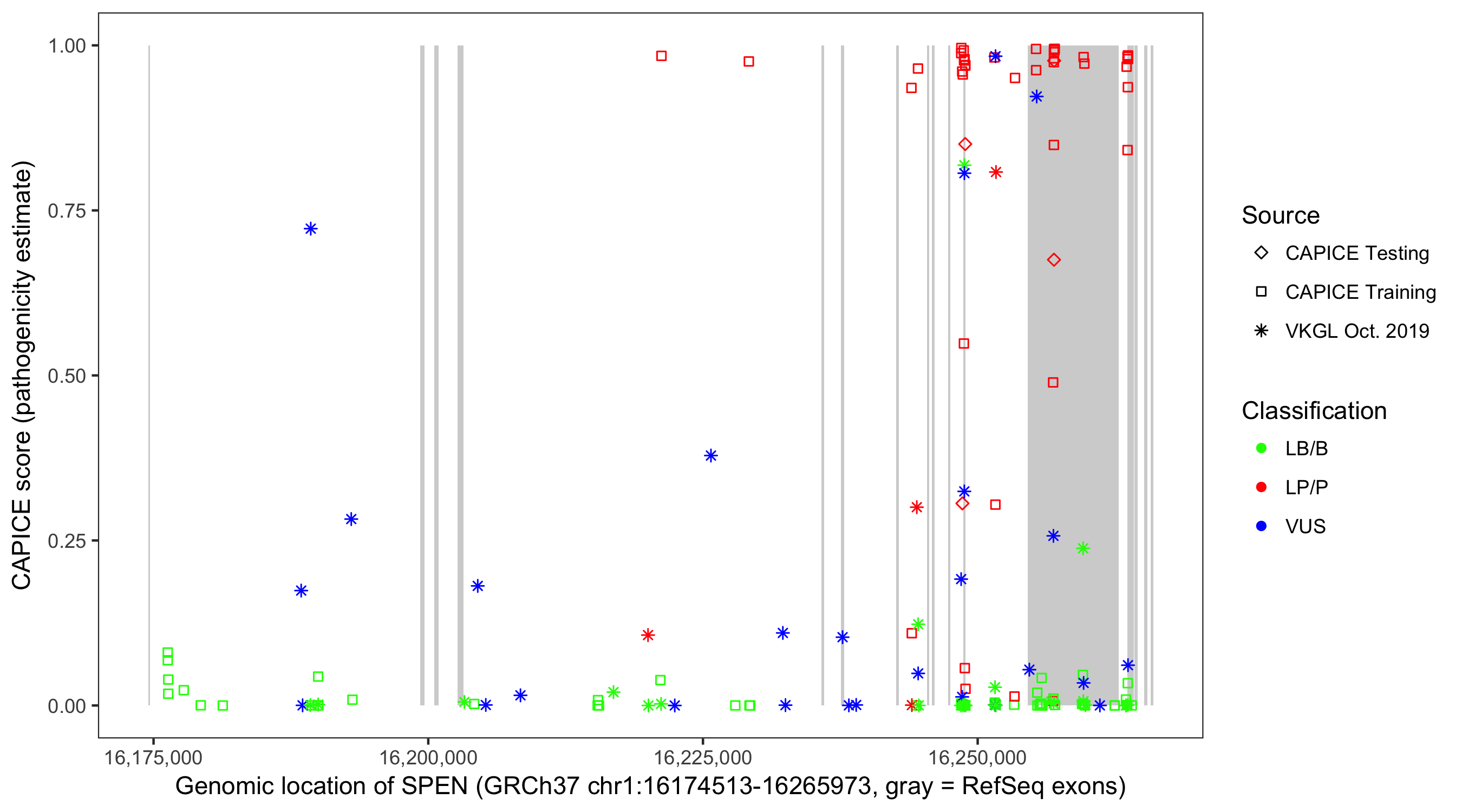 Shown are CAPICE train/test variants plus VKGL Oct 2019.