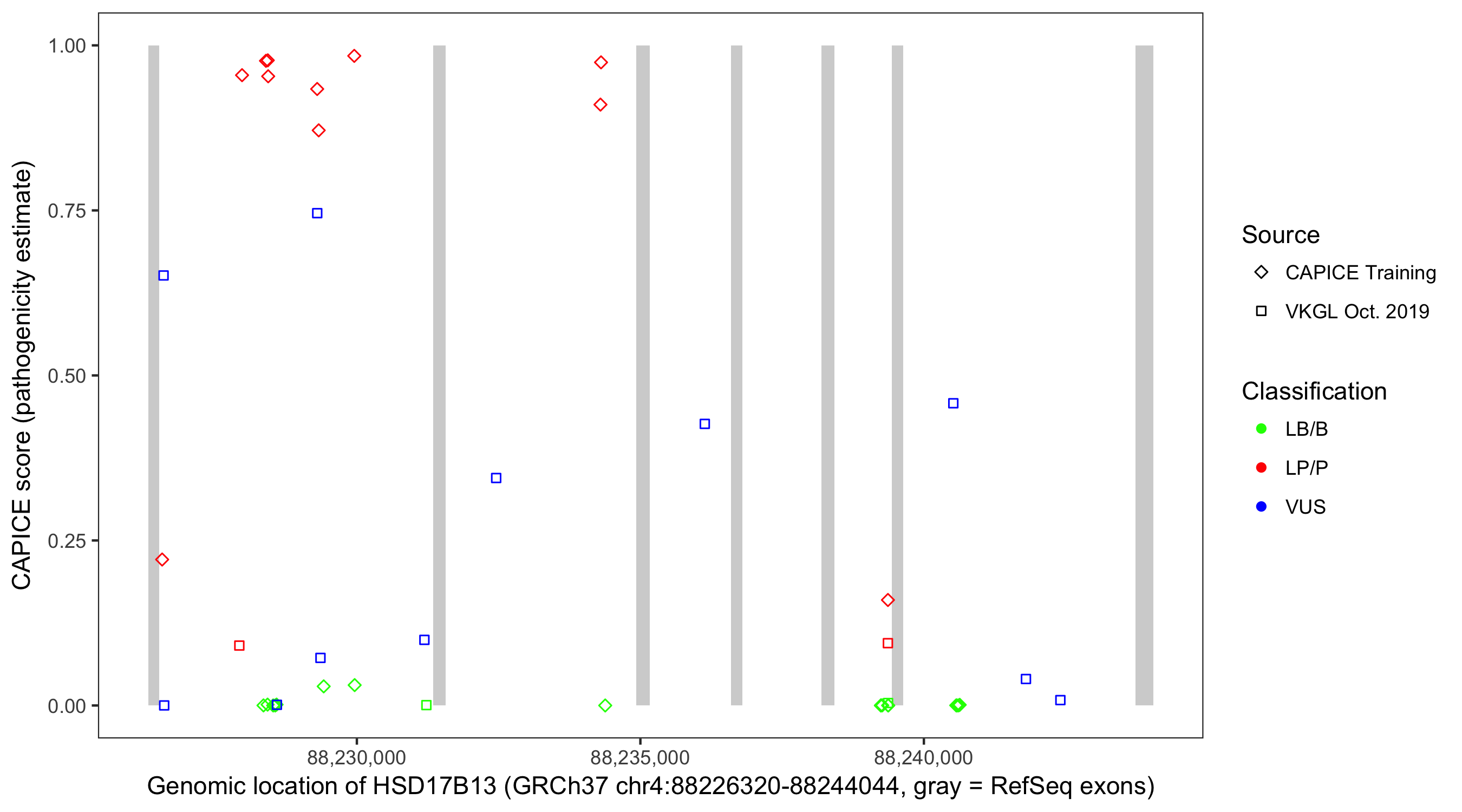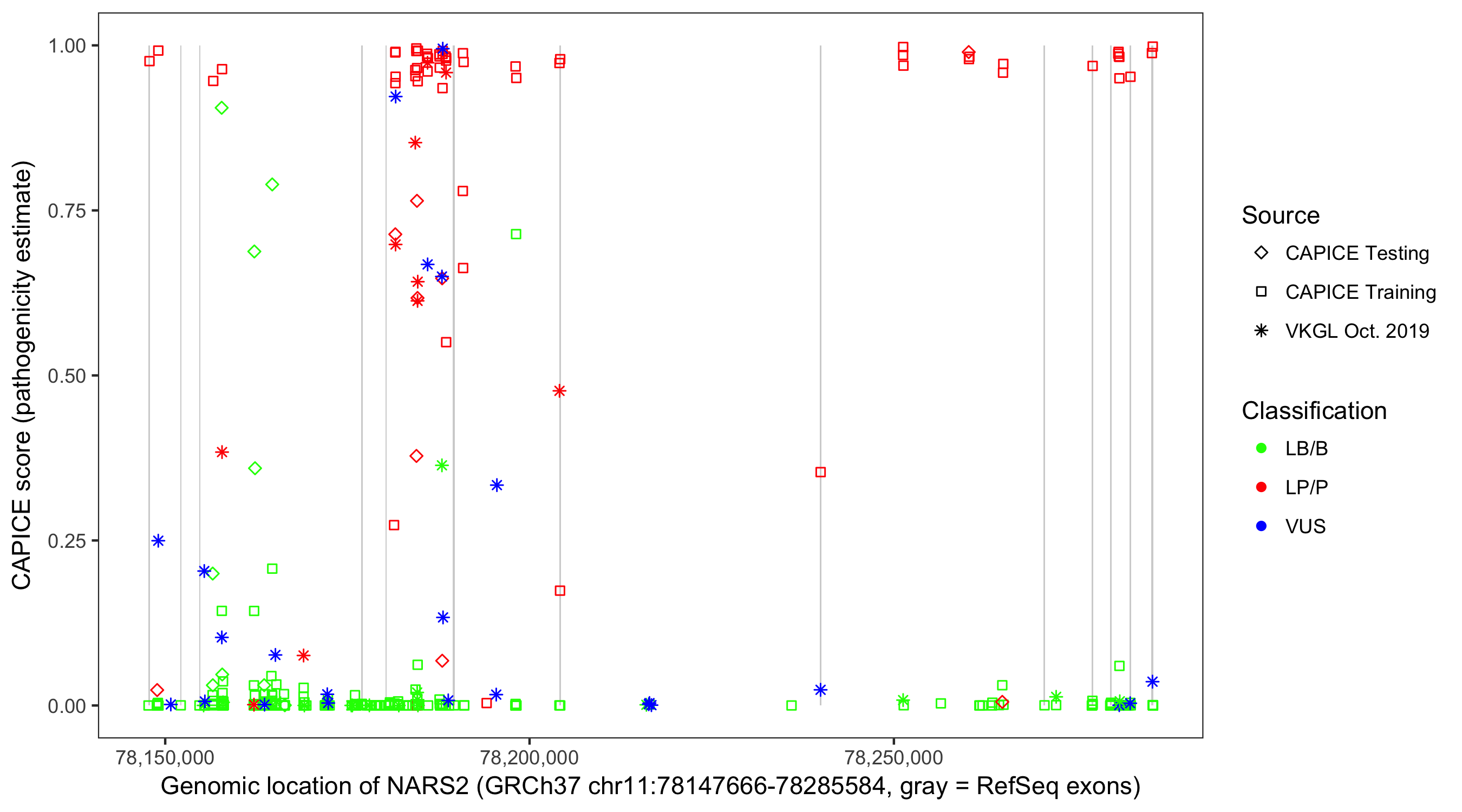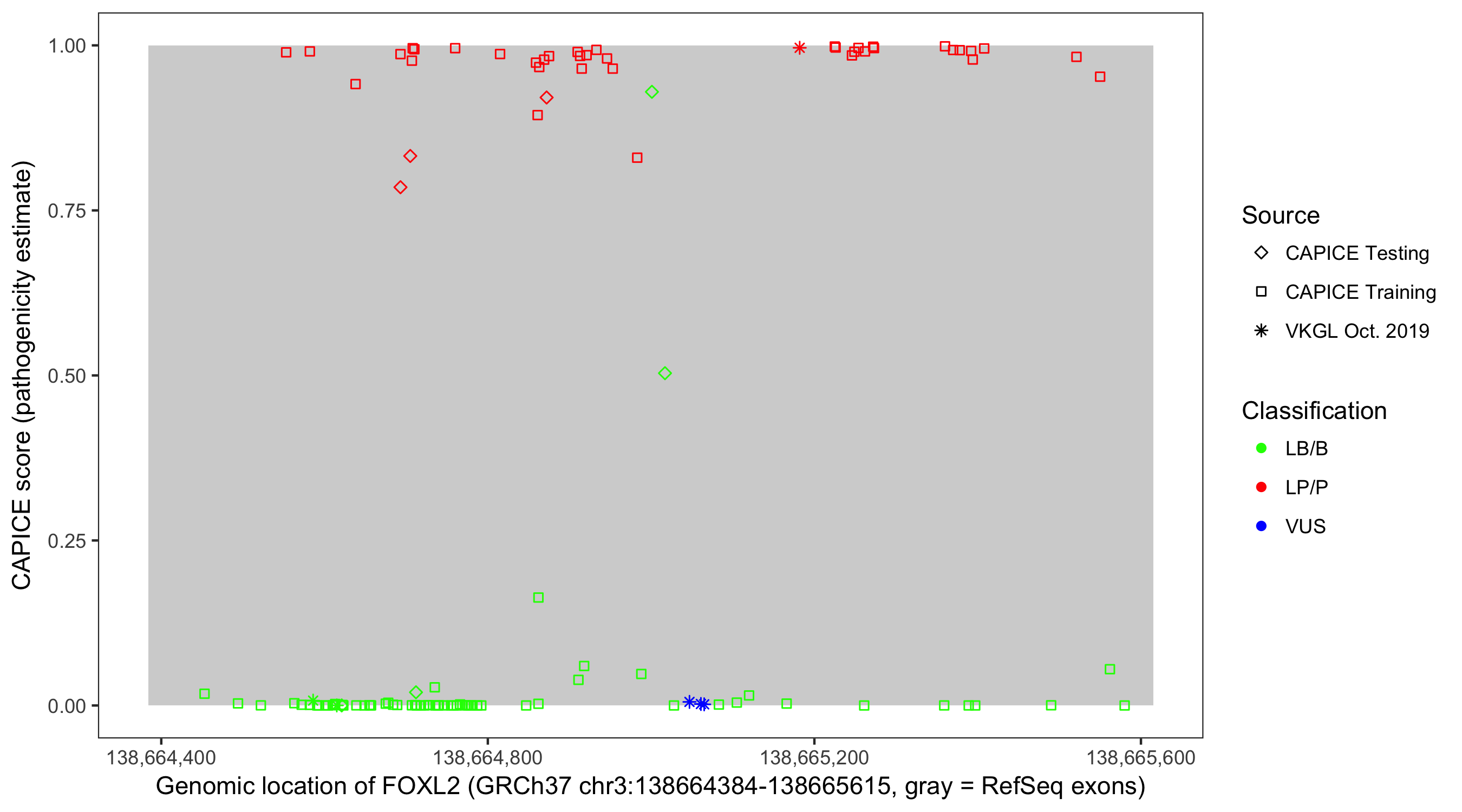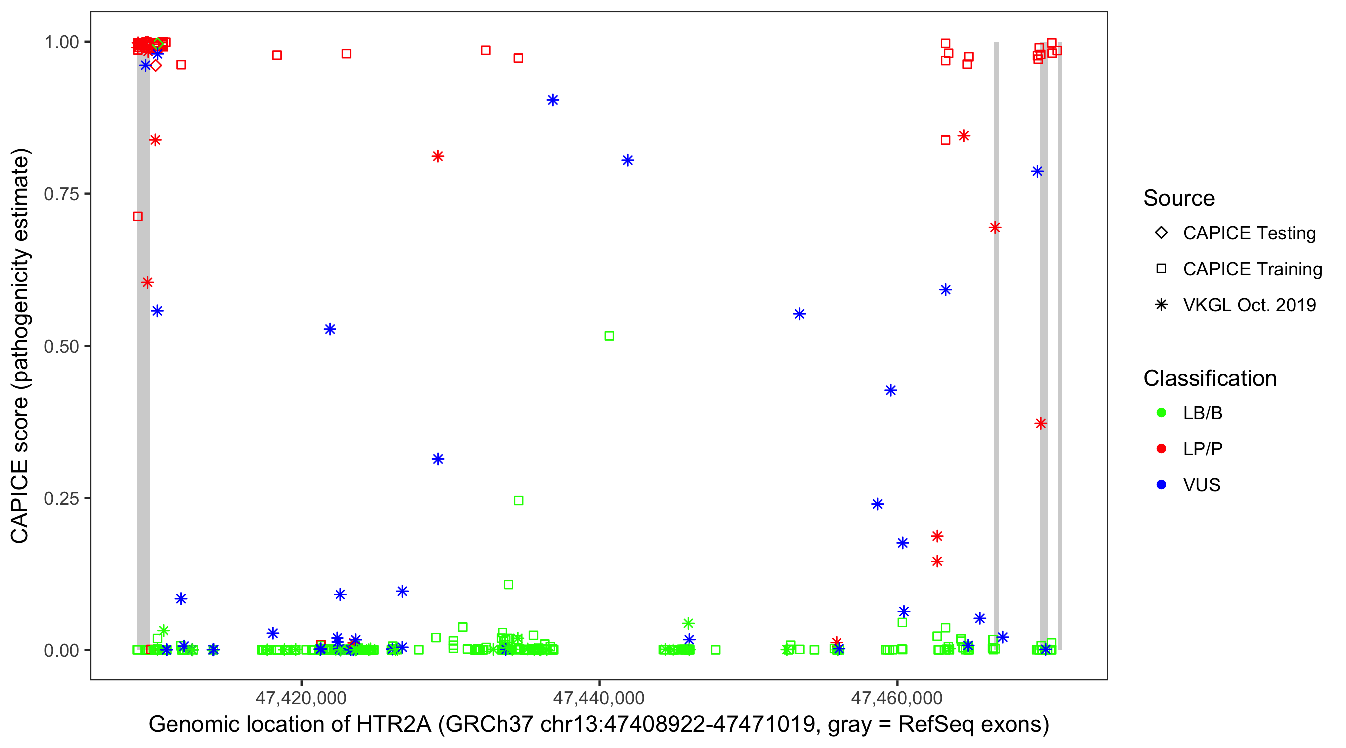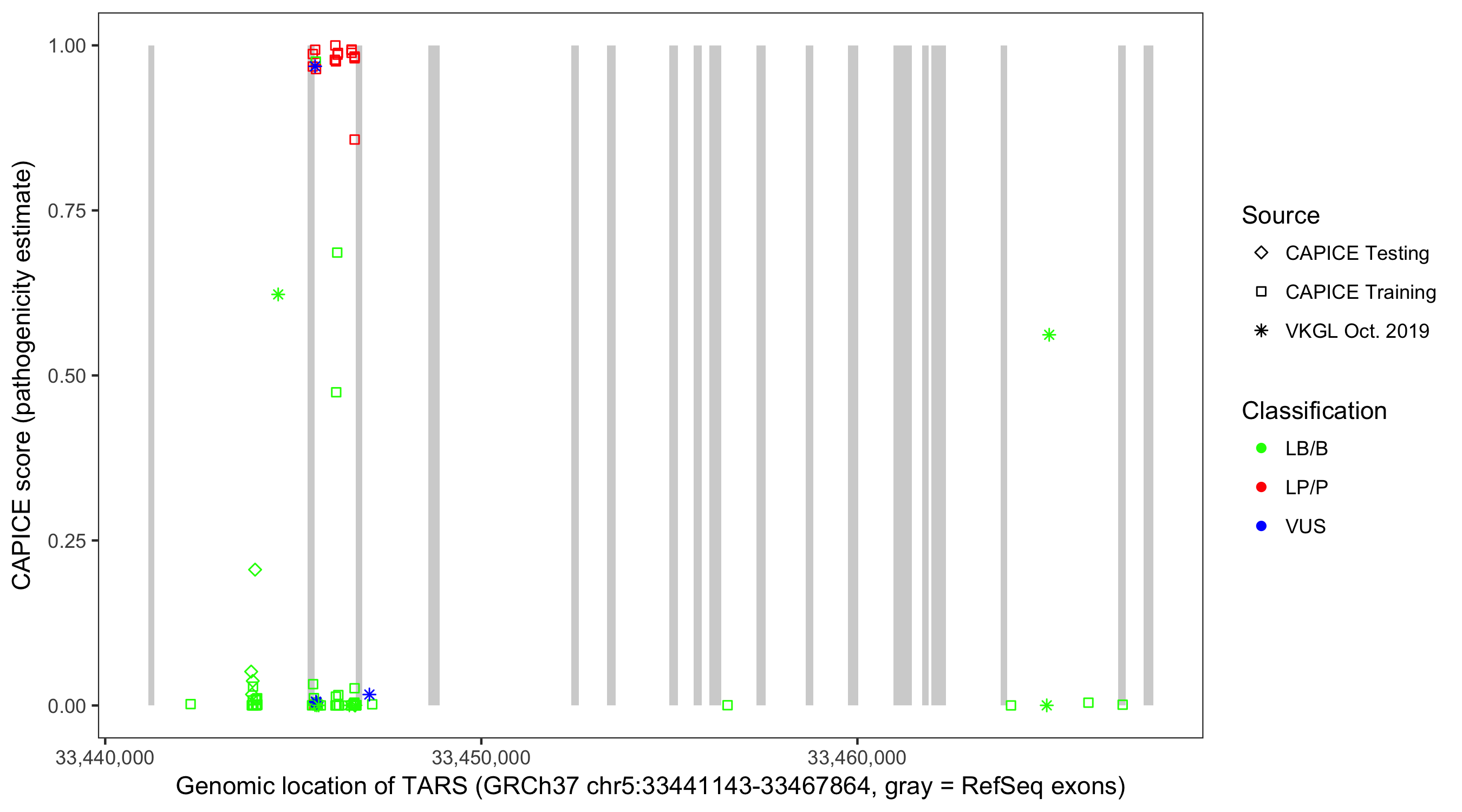 Shown are CAPICE train/test variants plus VKGL Oct 2019.
