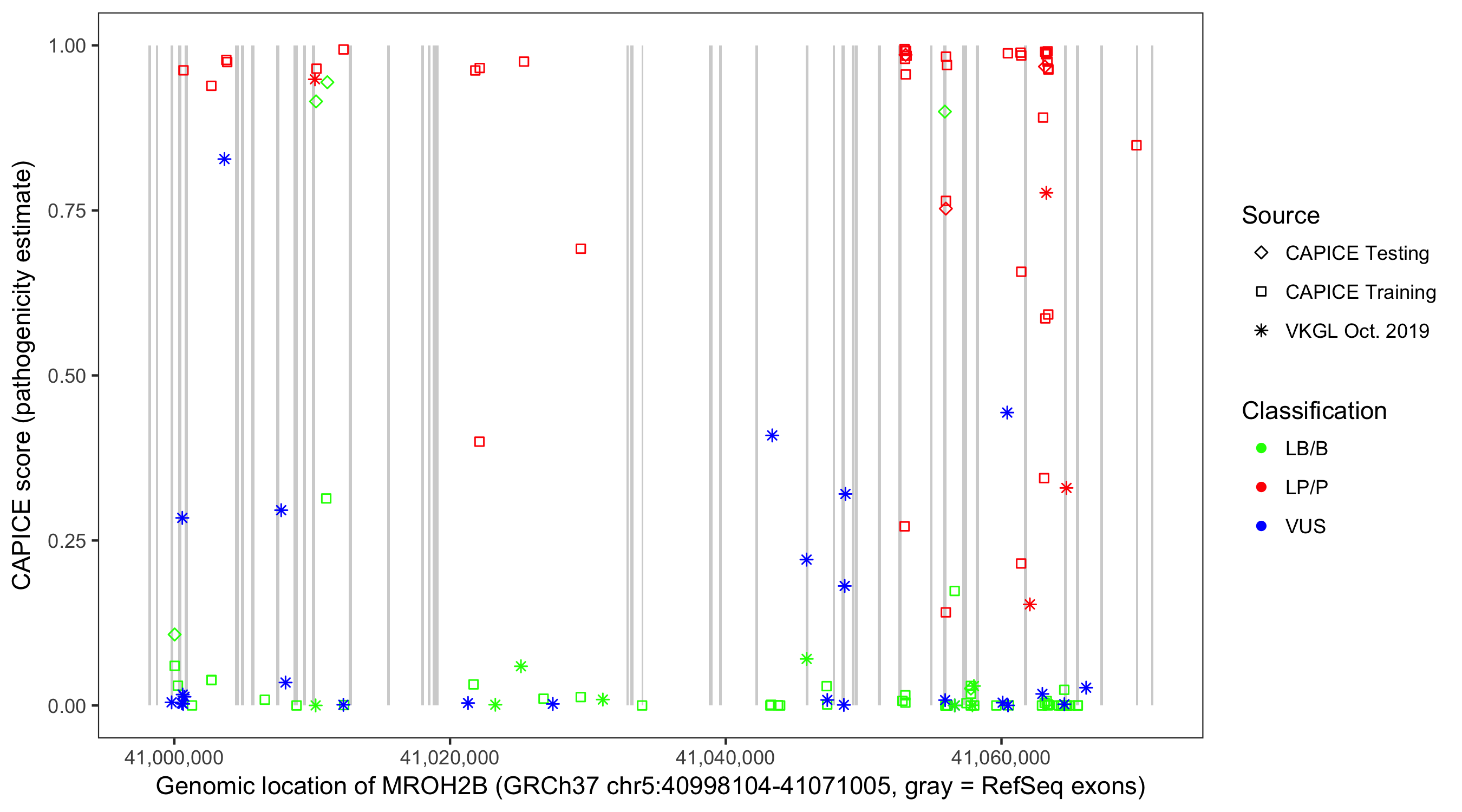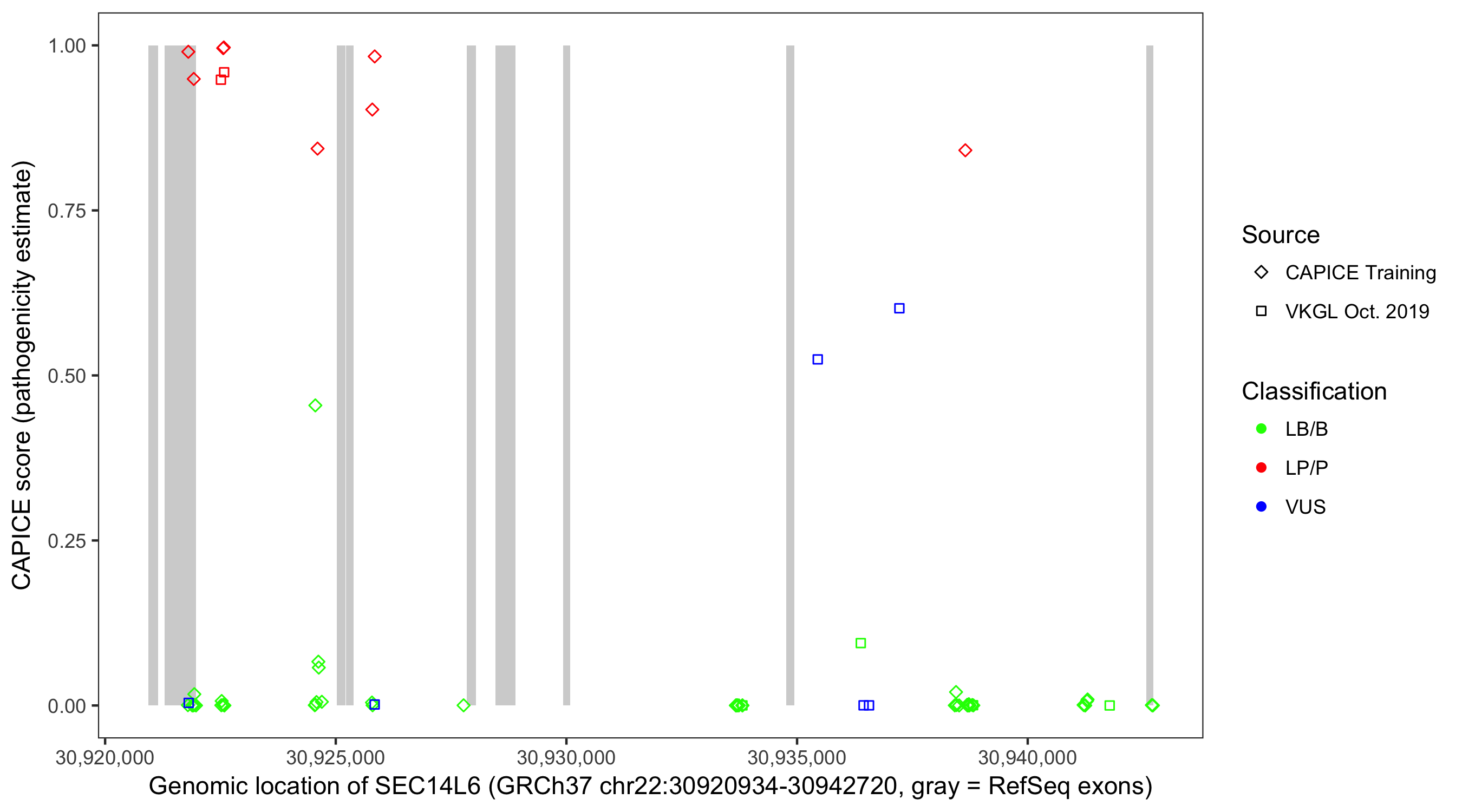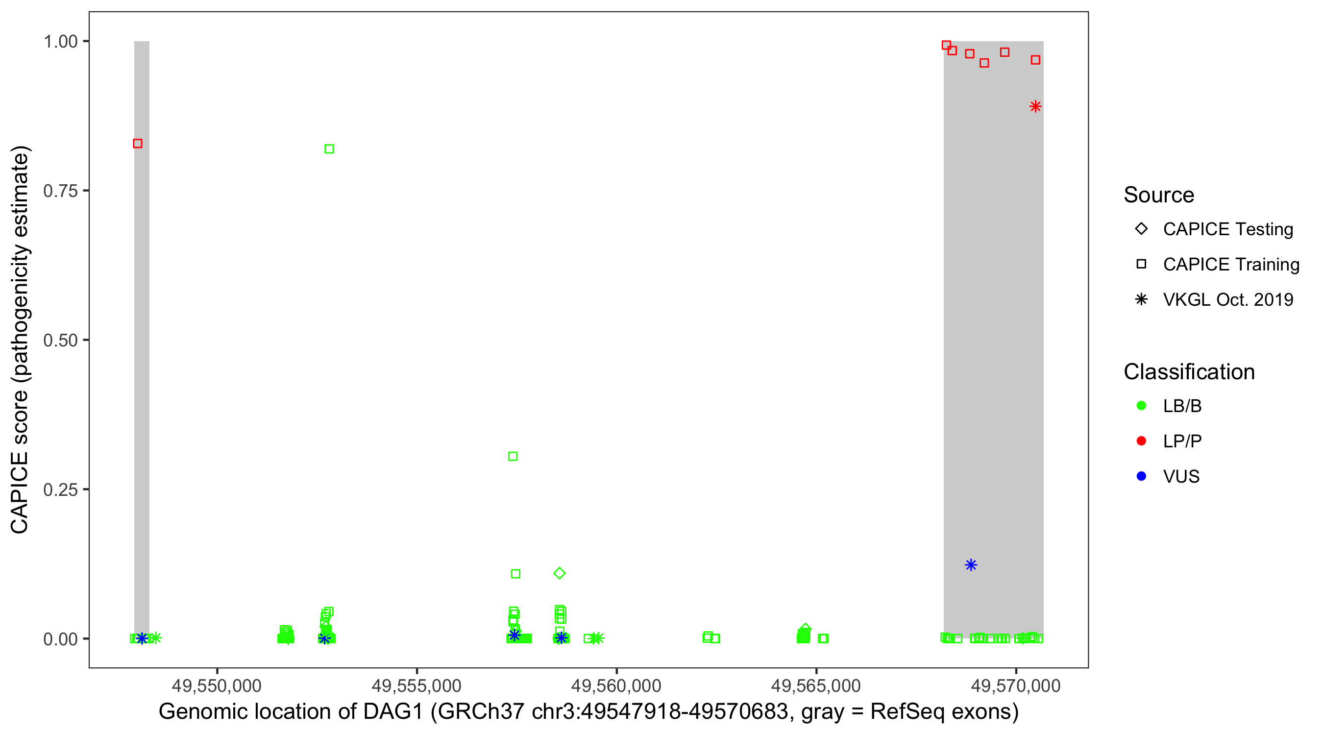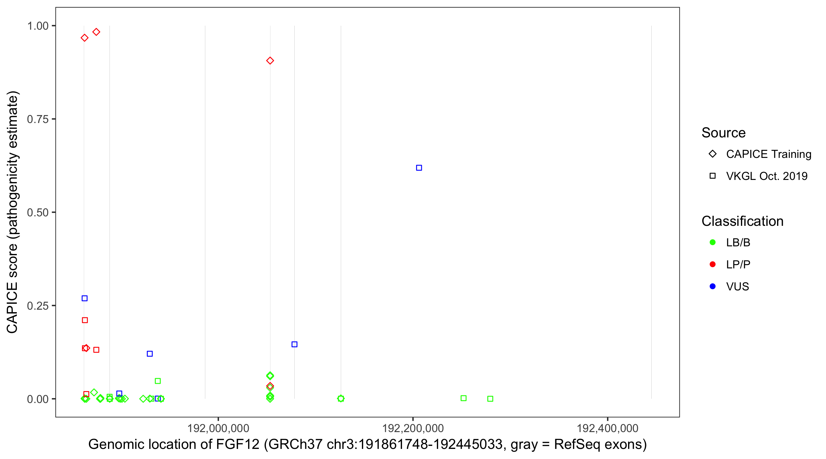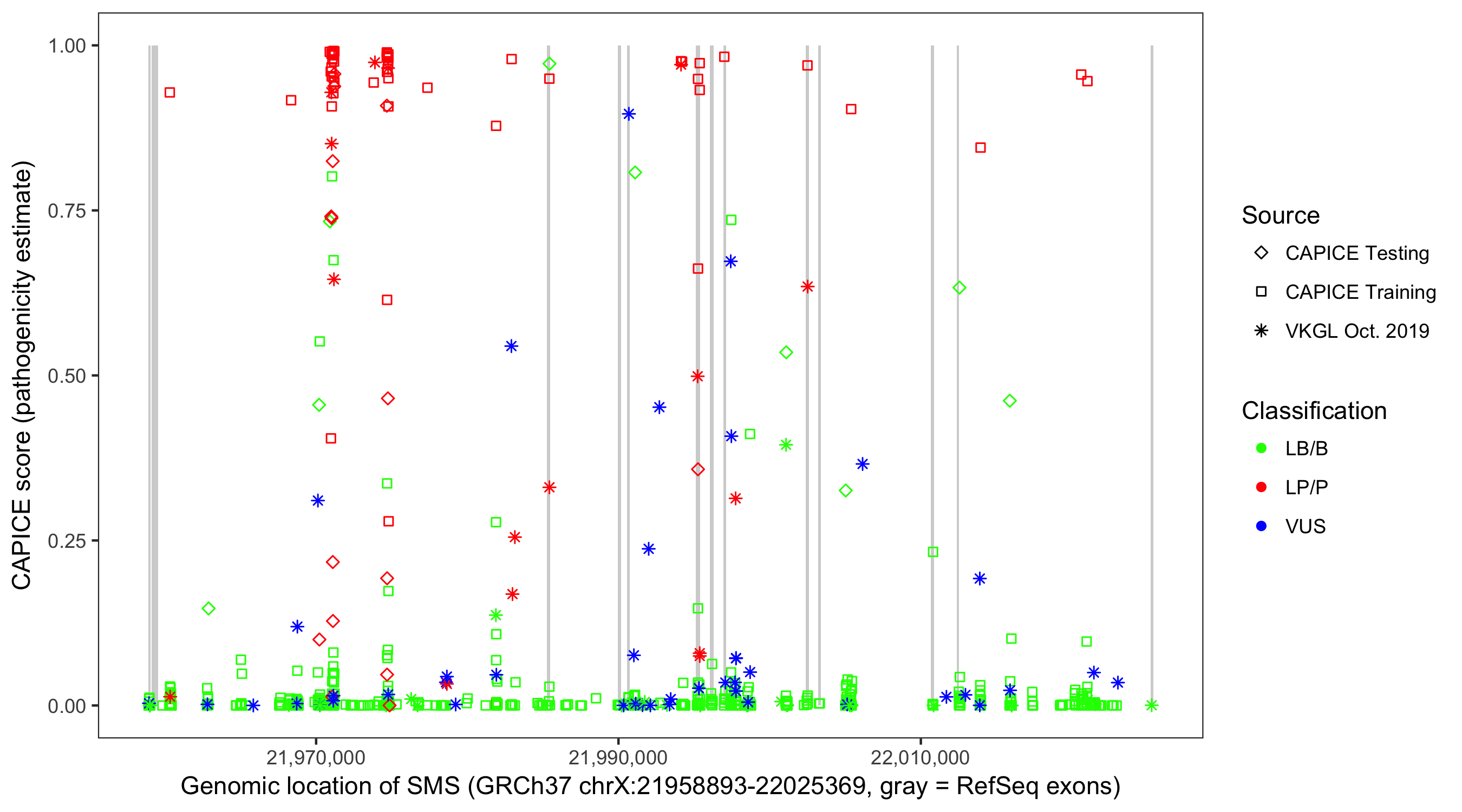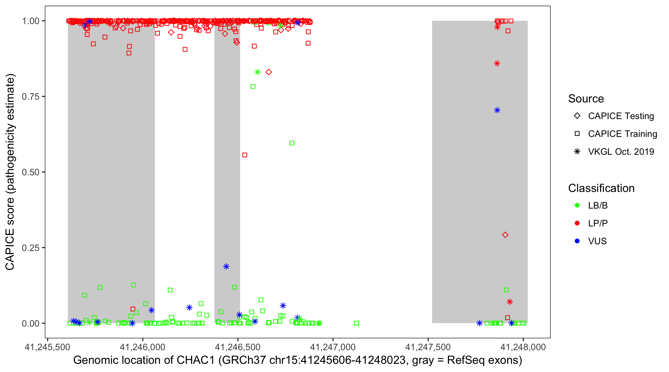 Shown are CAPICE train/test variants plus VKGL Oct 2019.