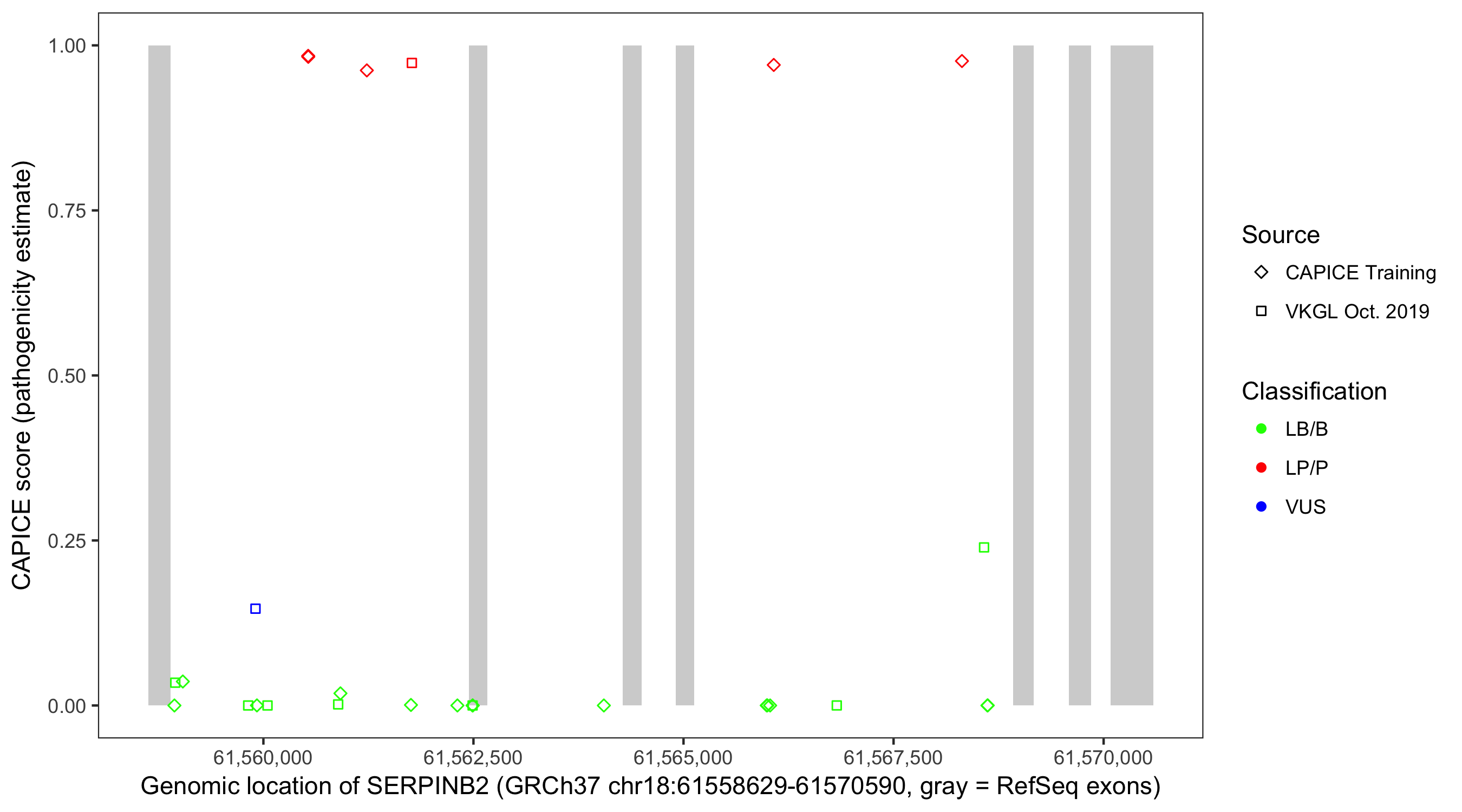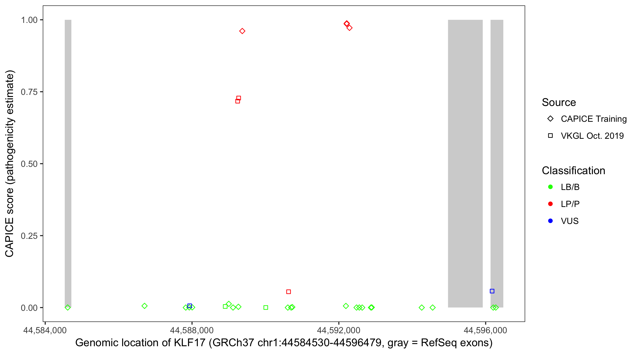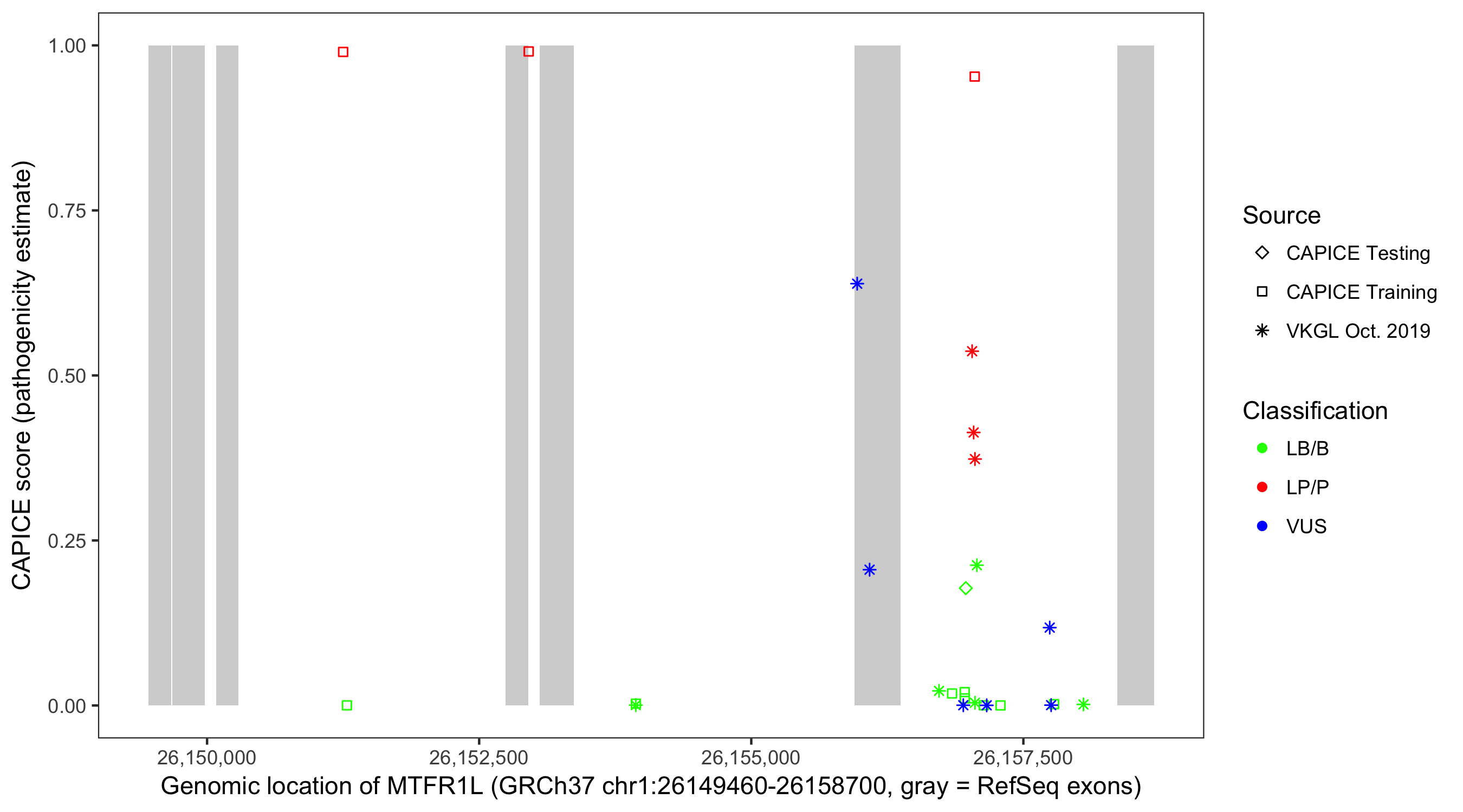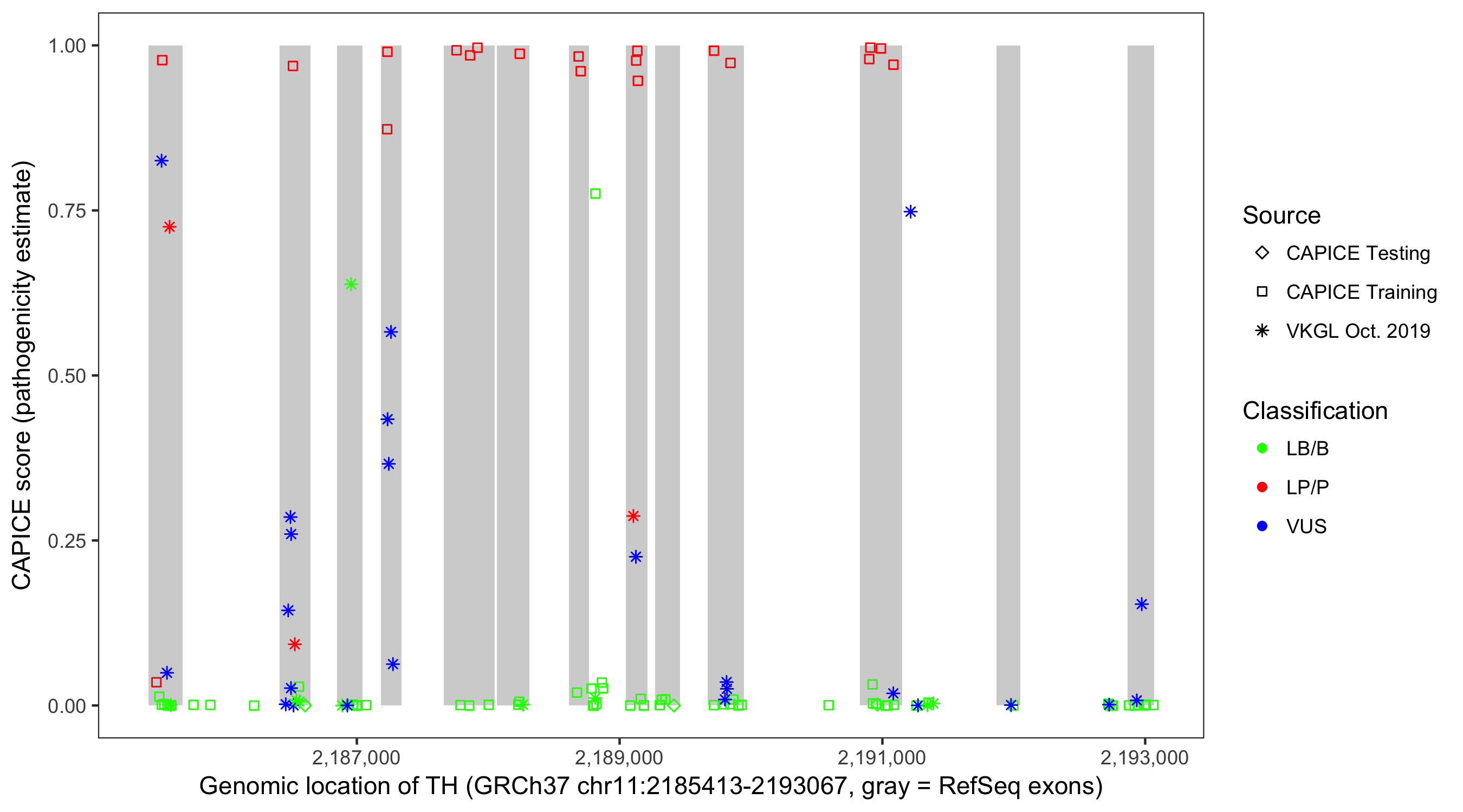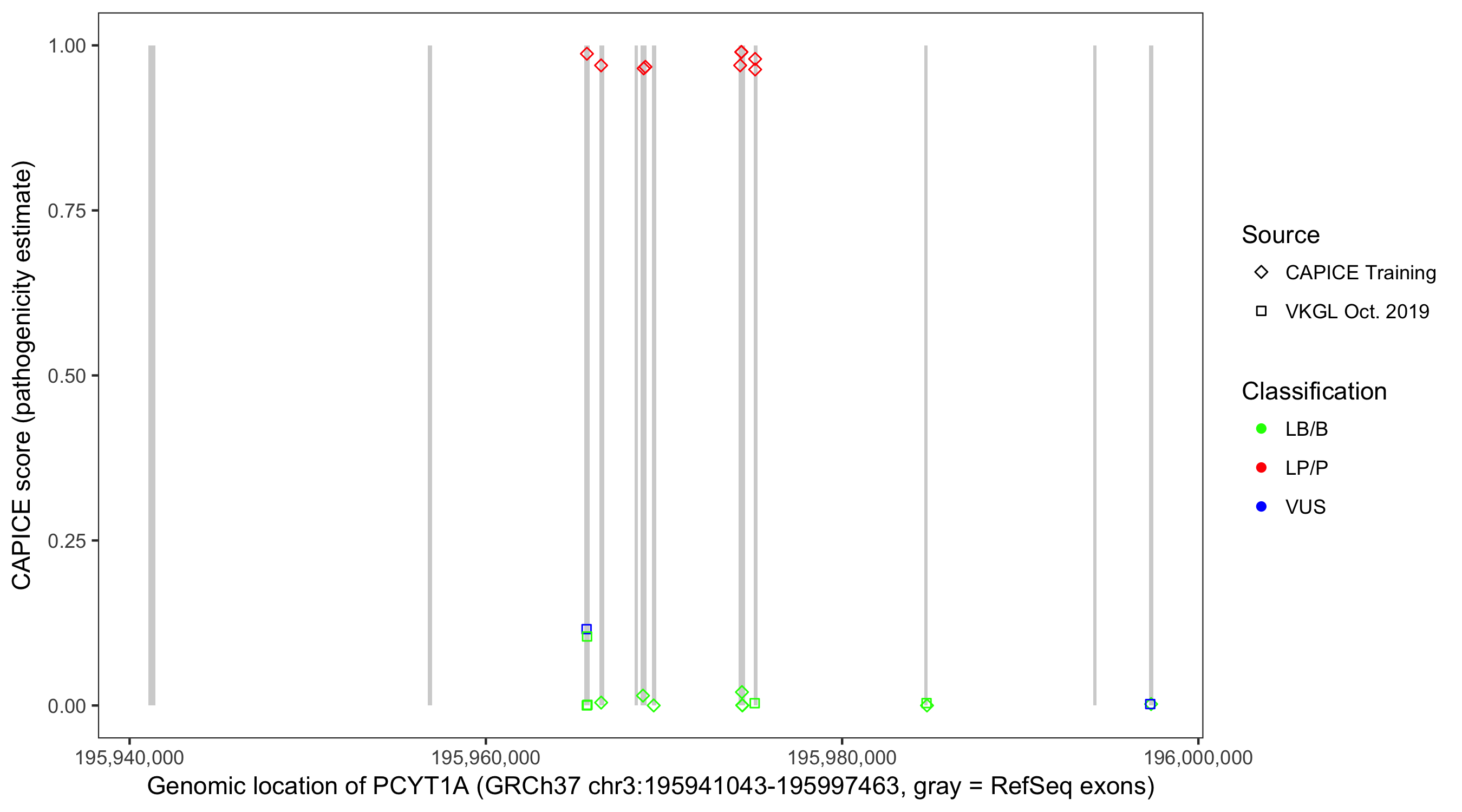 Shown are CAPICE train/test variants plus VKGL Oct 2019.