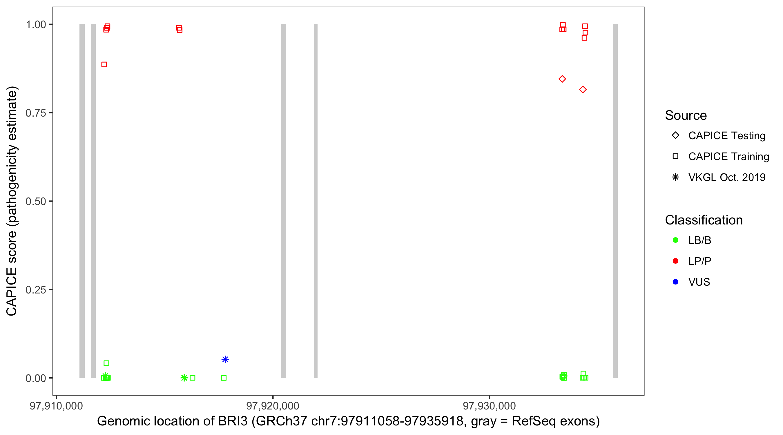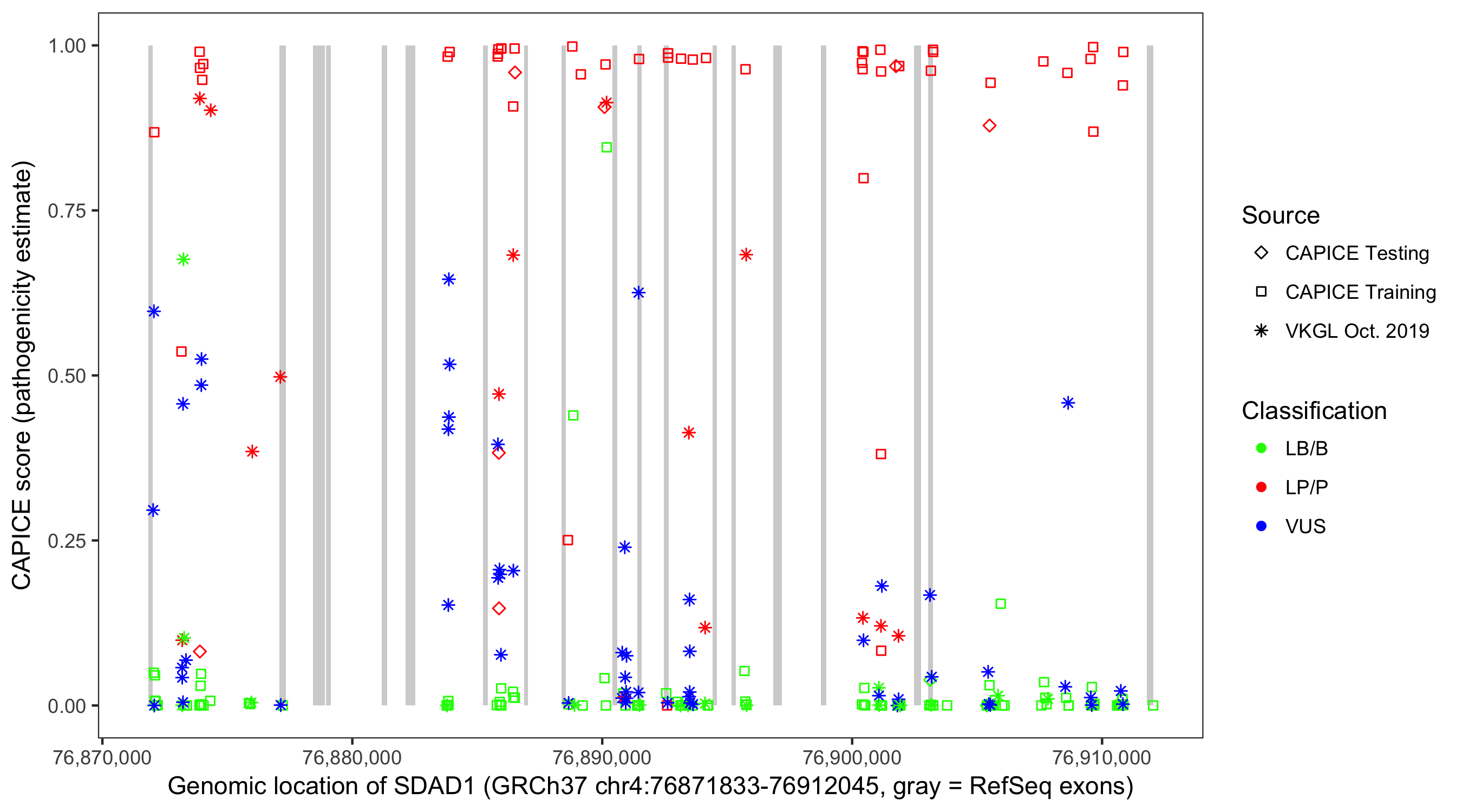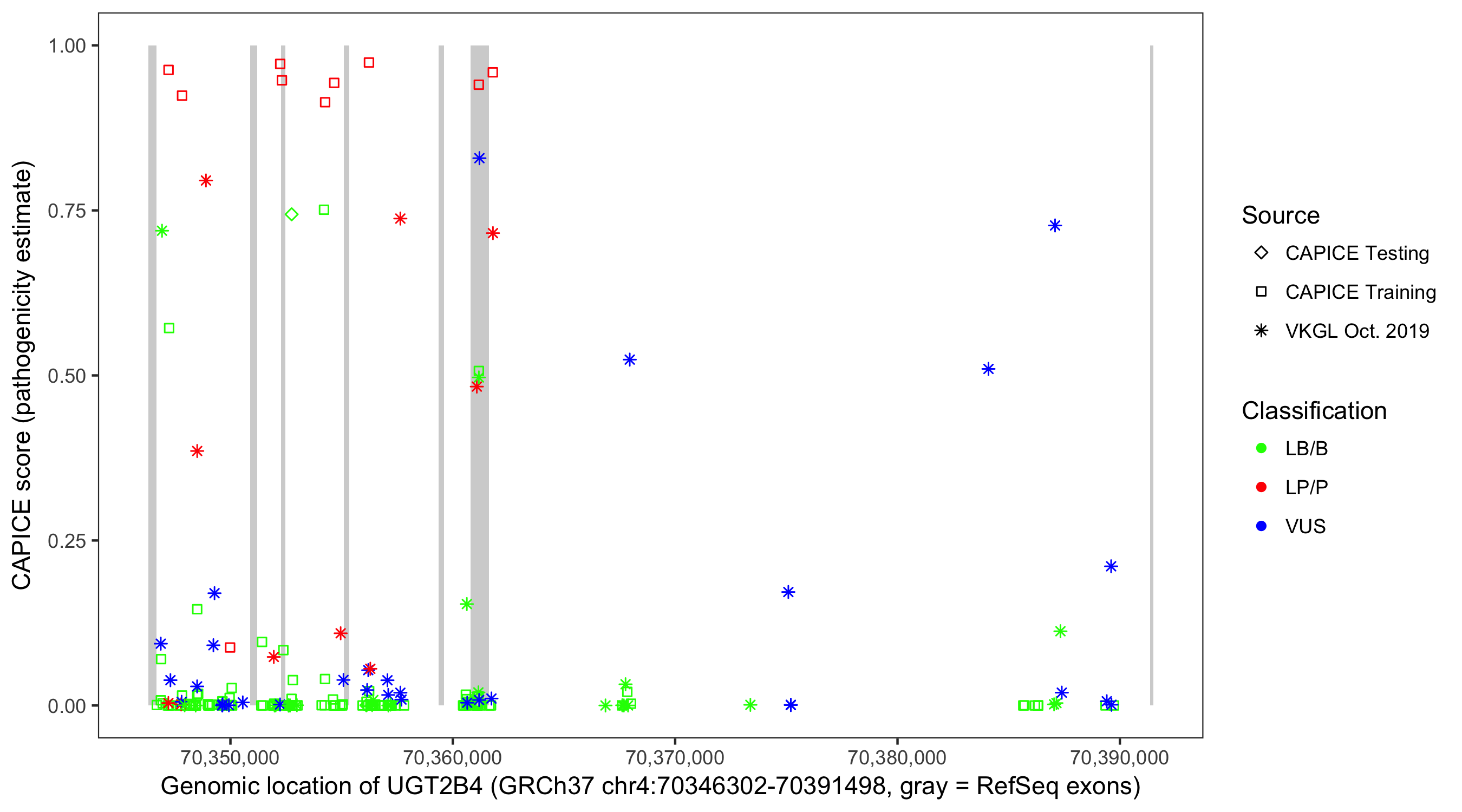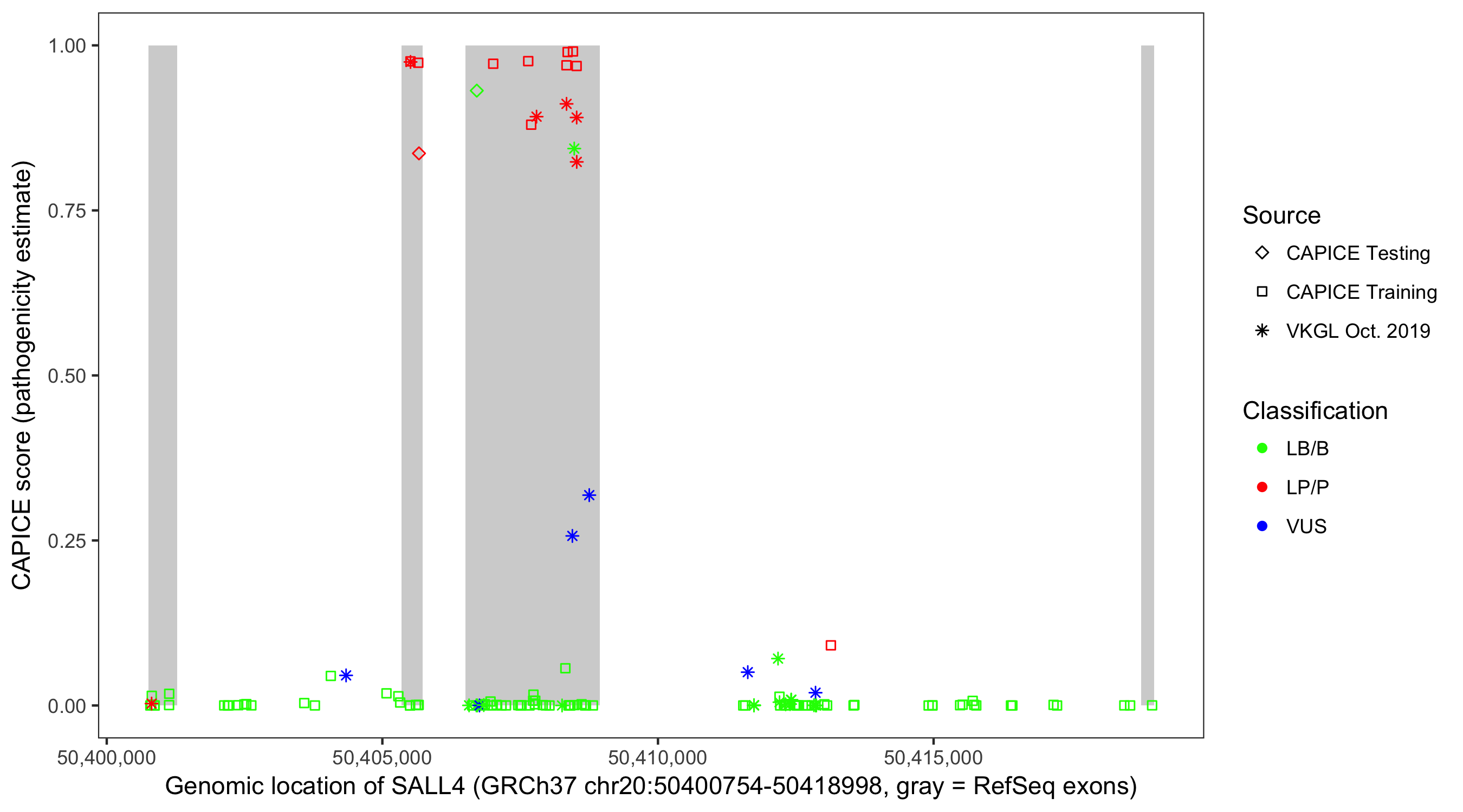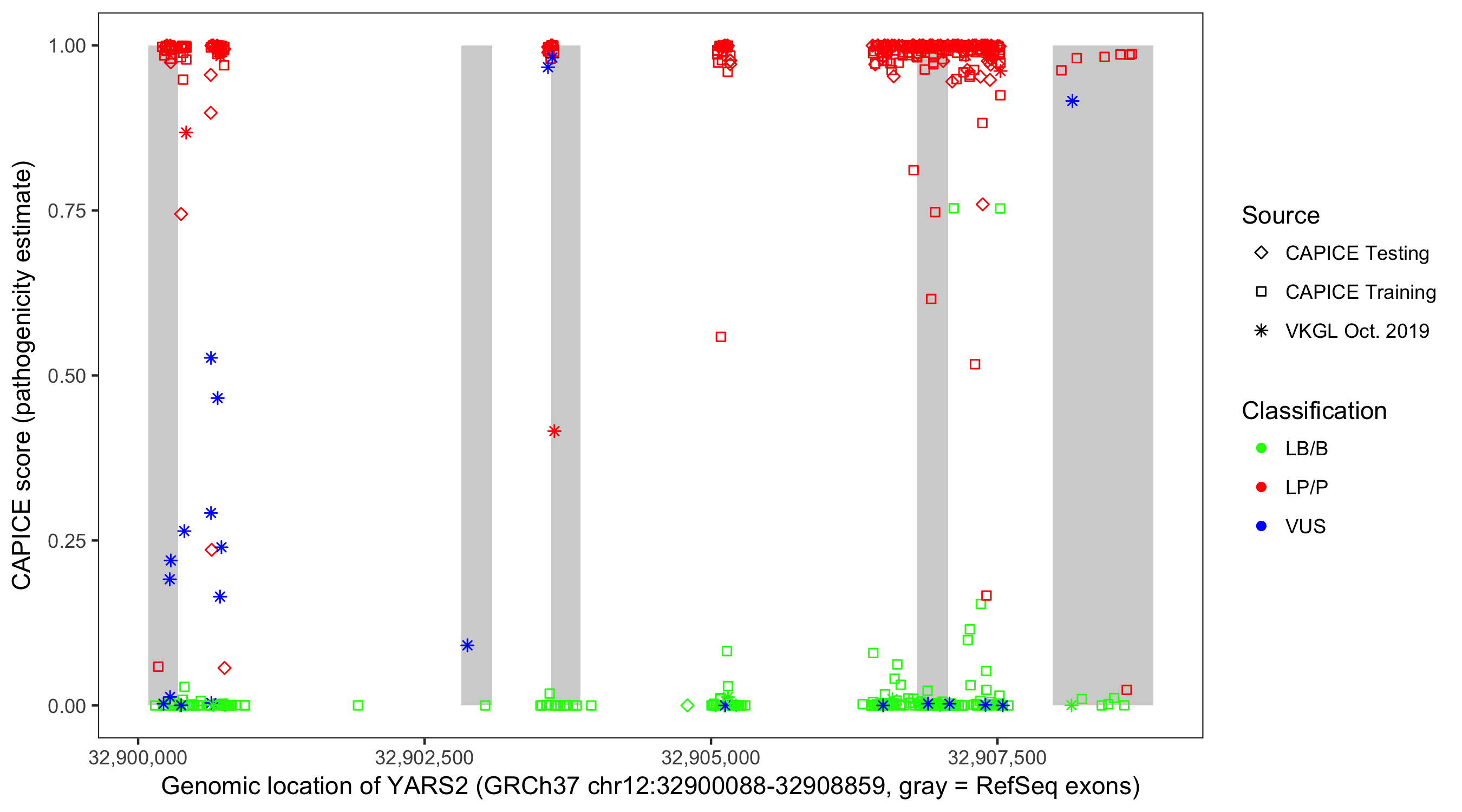 Shown are CAPICE train/test variants plus VKGL Oct 2019.