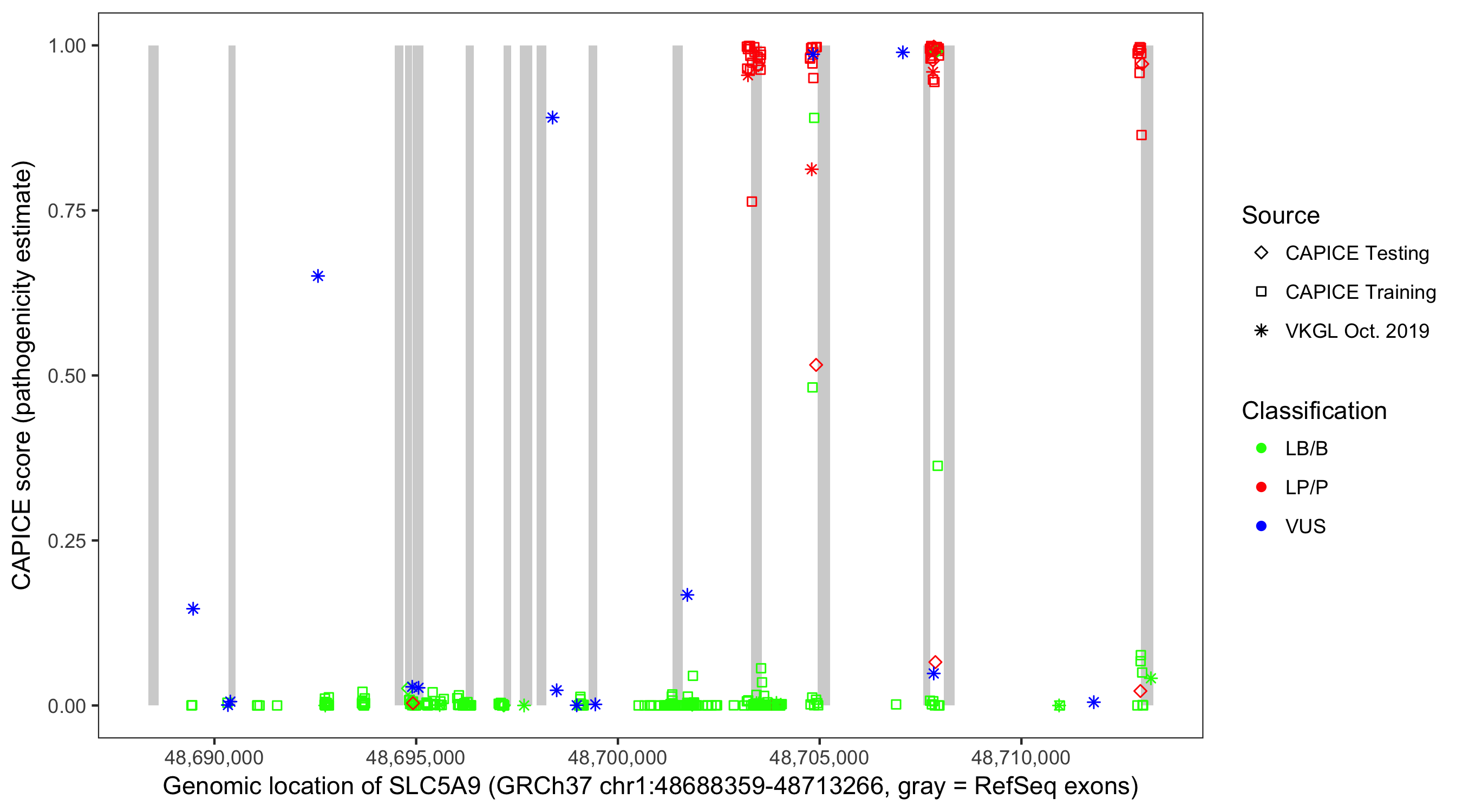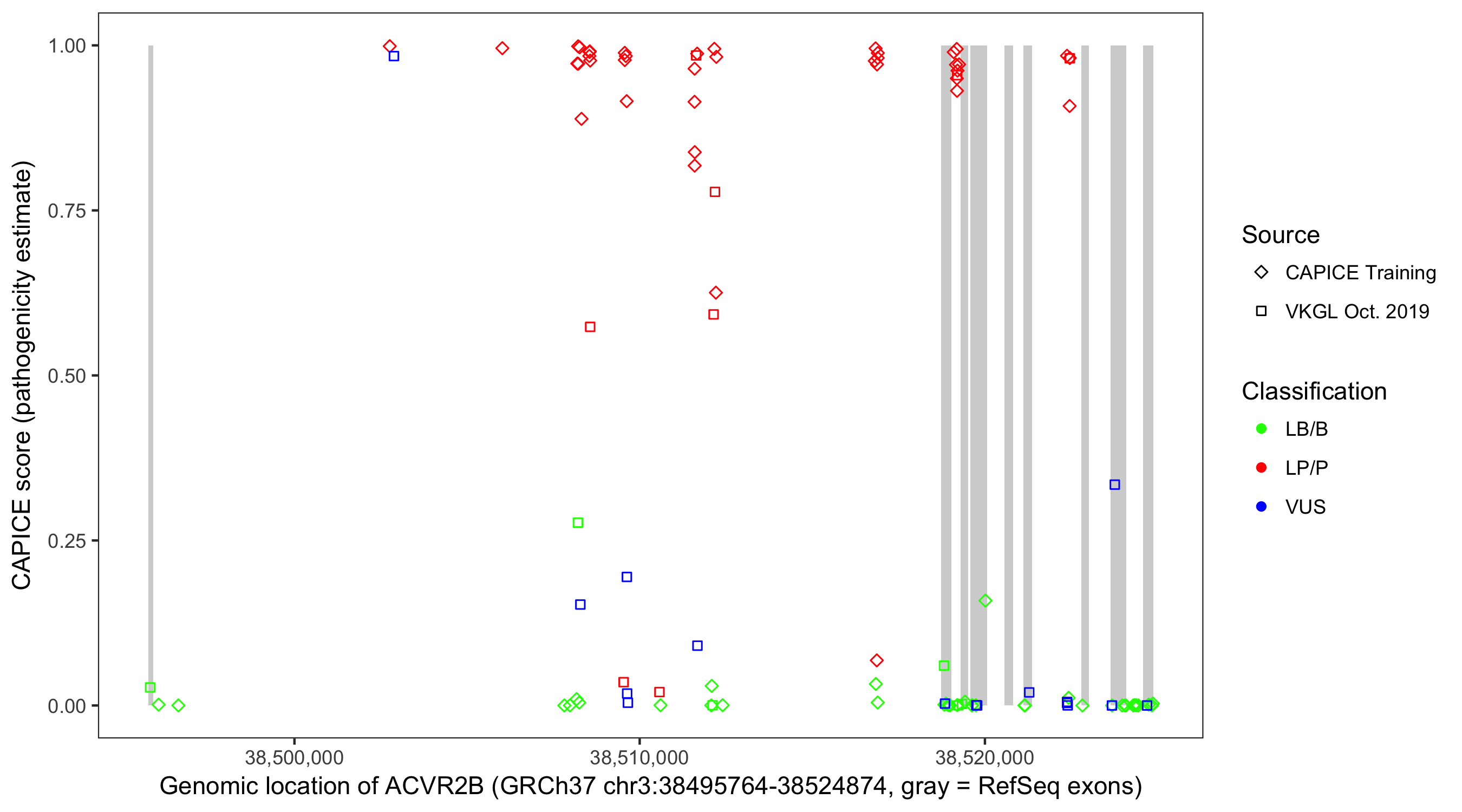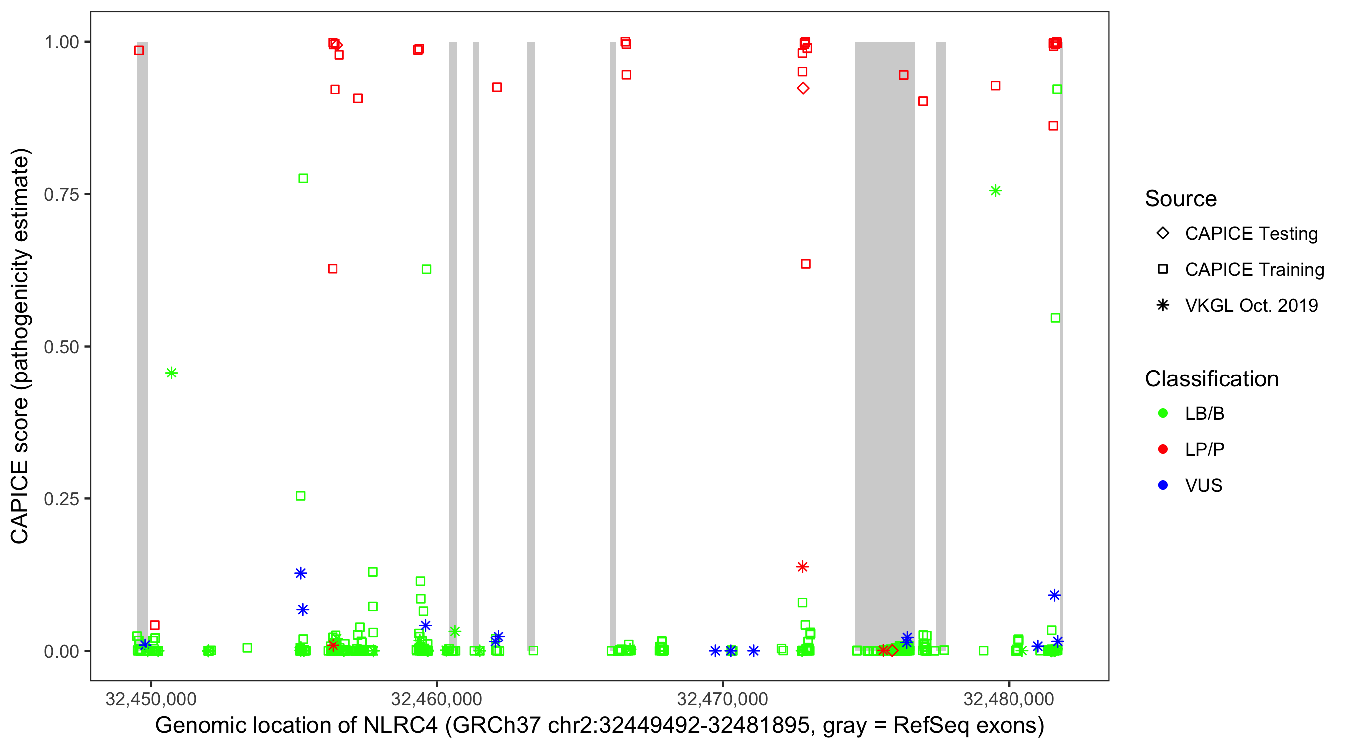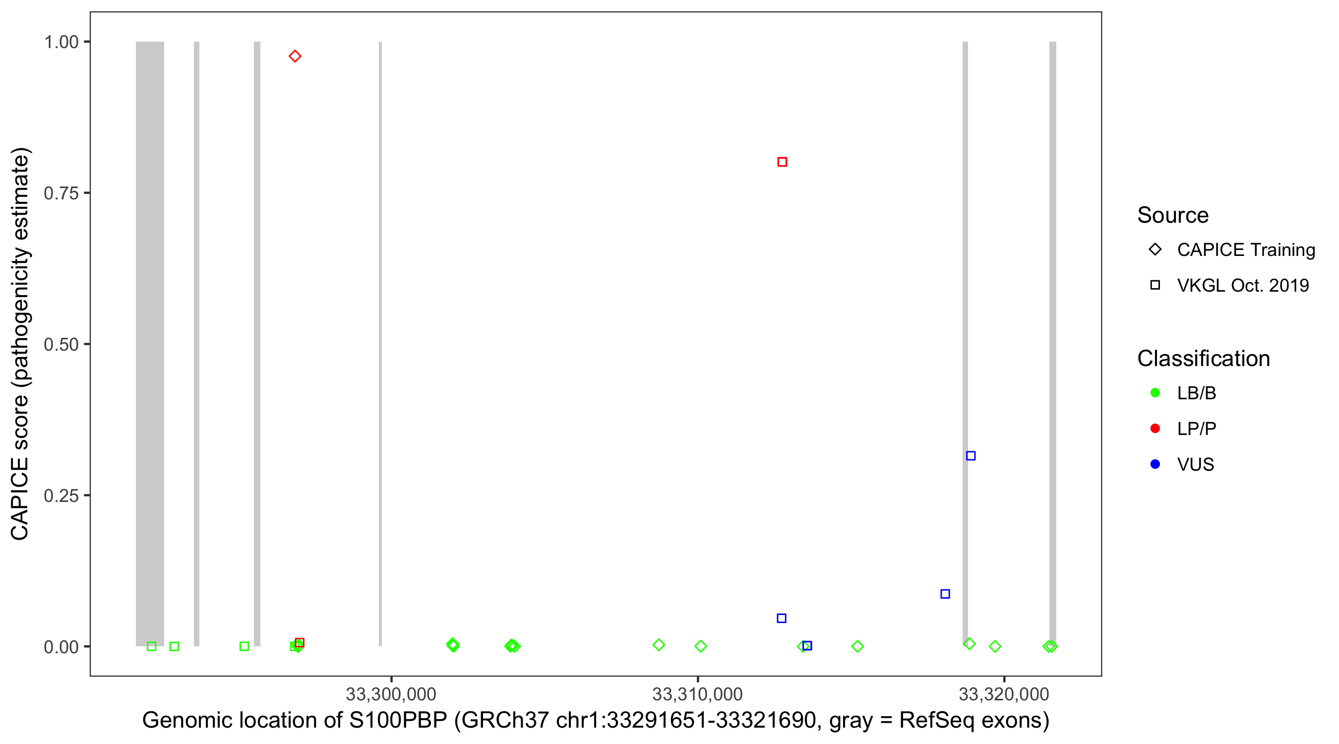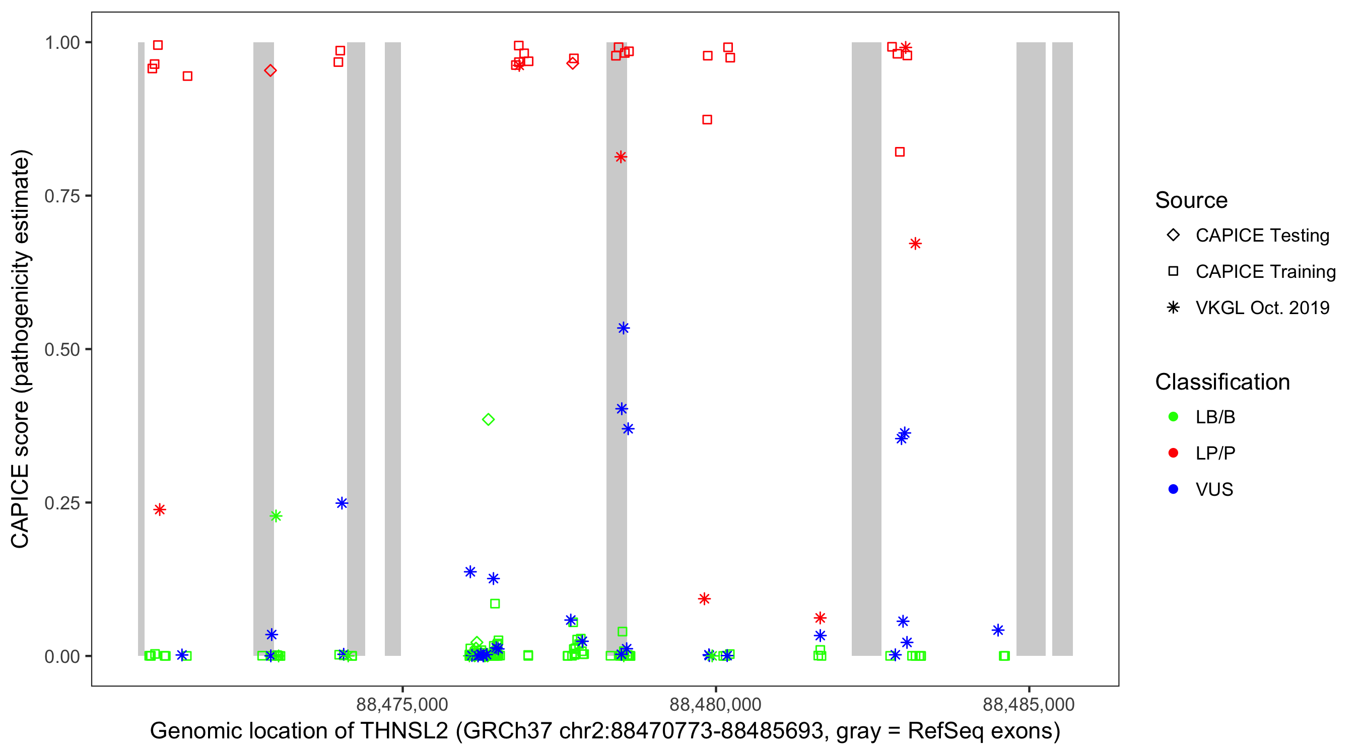 Shown are CAPICE train/test variants plus VKGL Oct 2019.