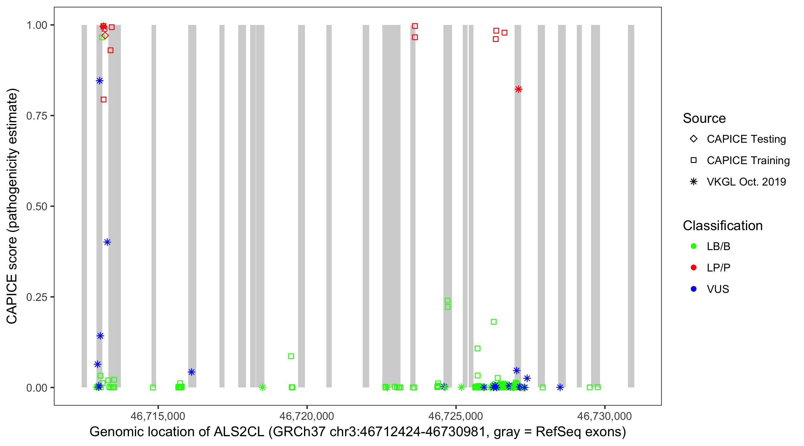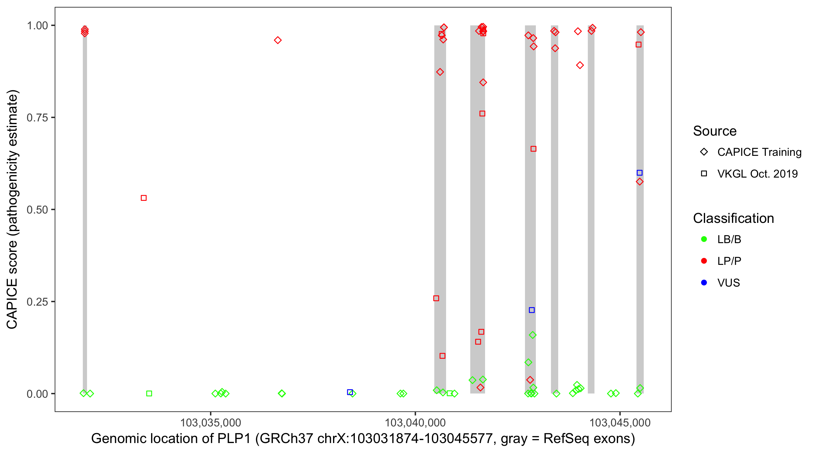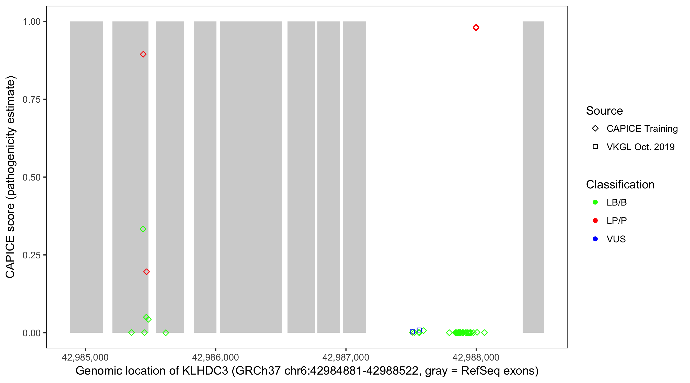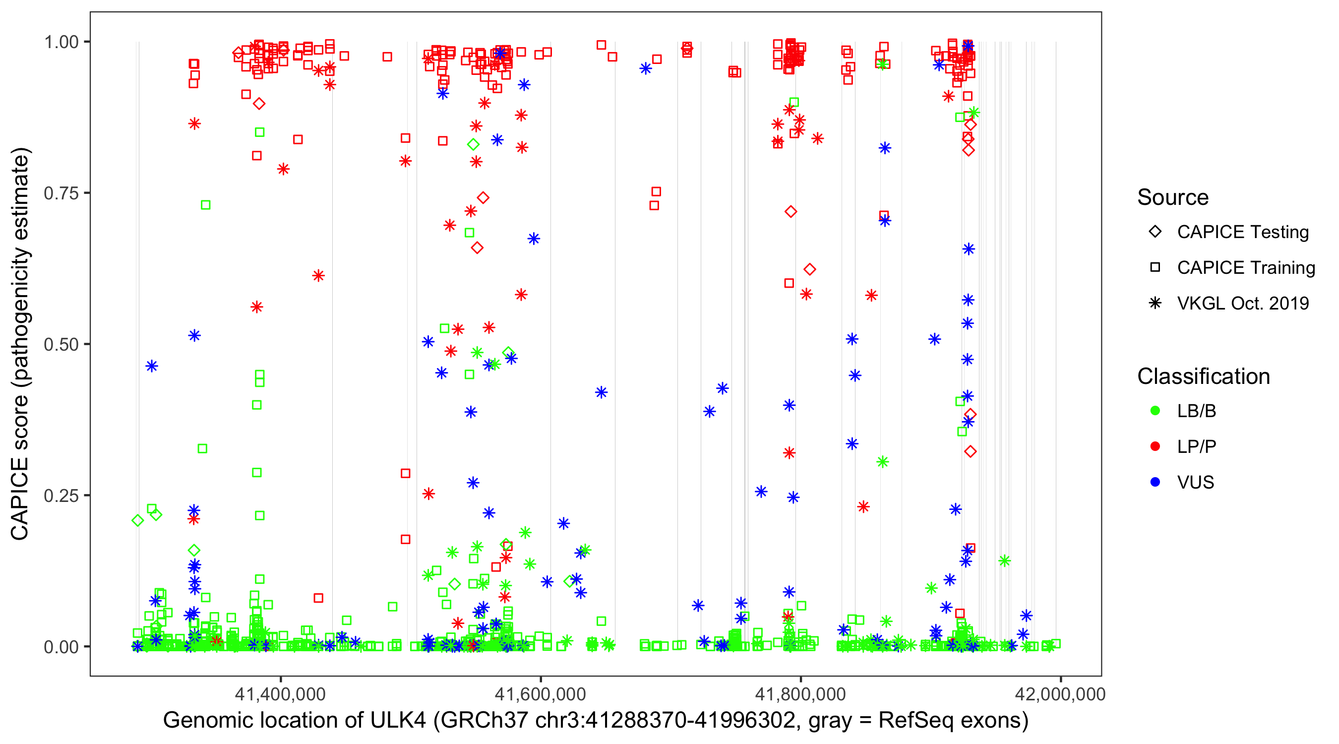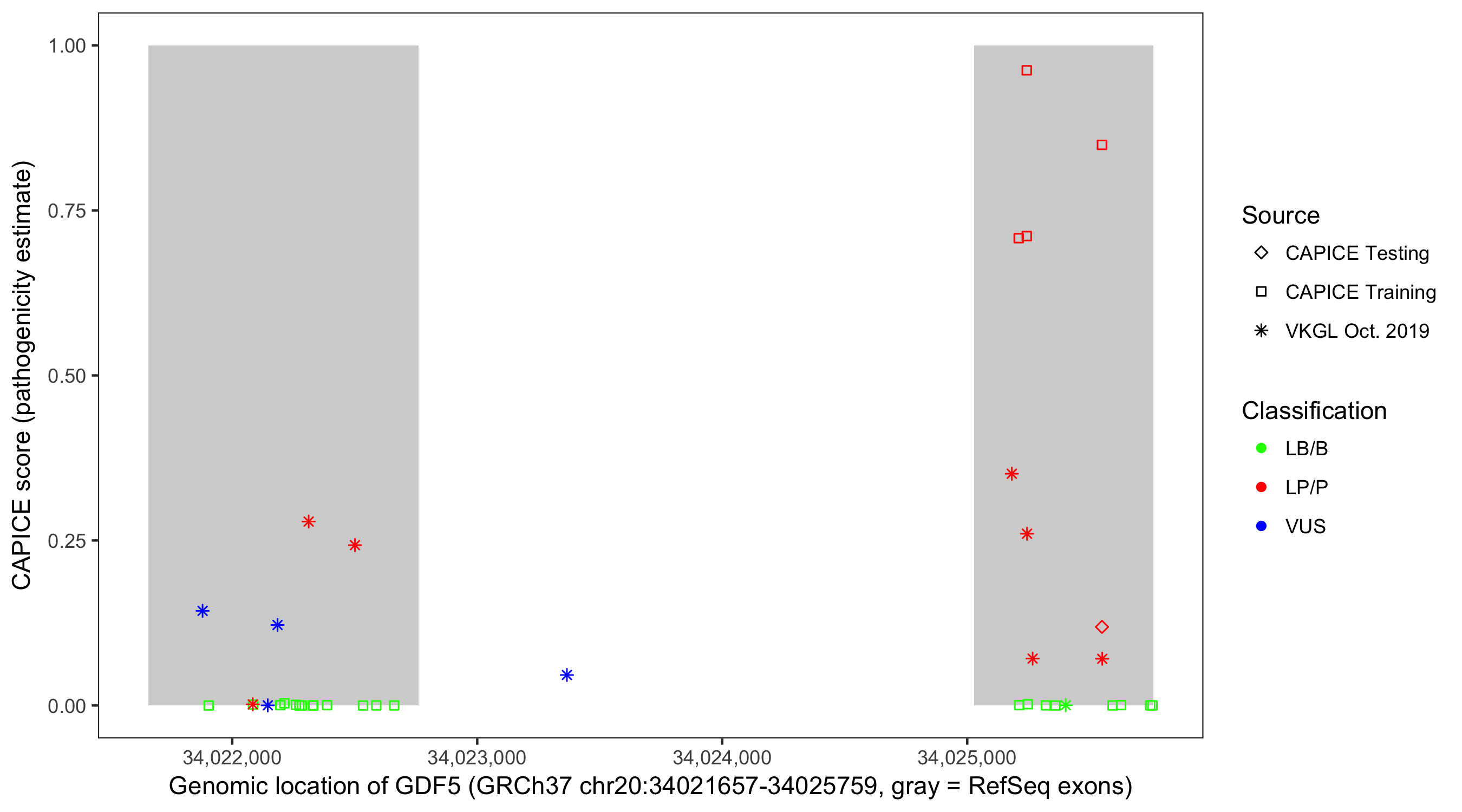 Shown are CAPICE train/test variants plus VKGL Oct 2019.
