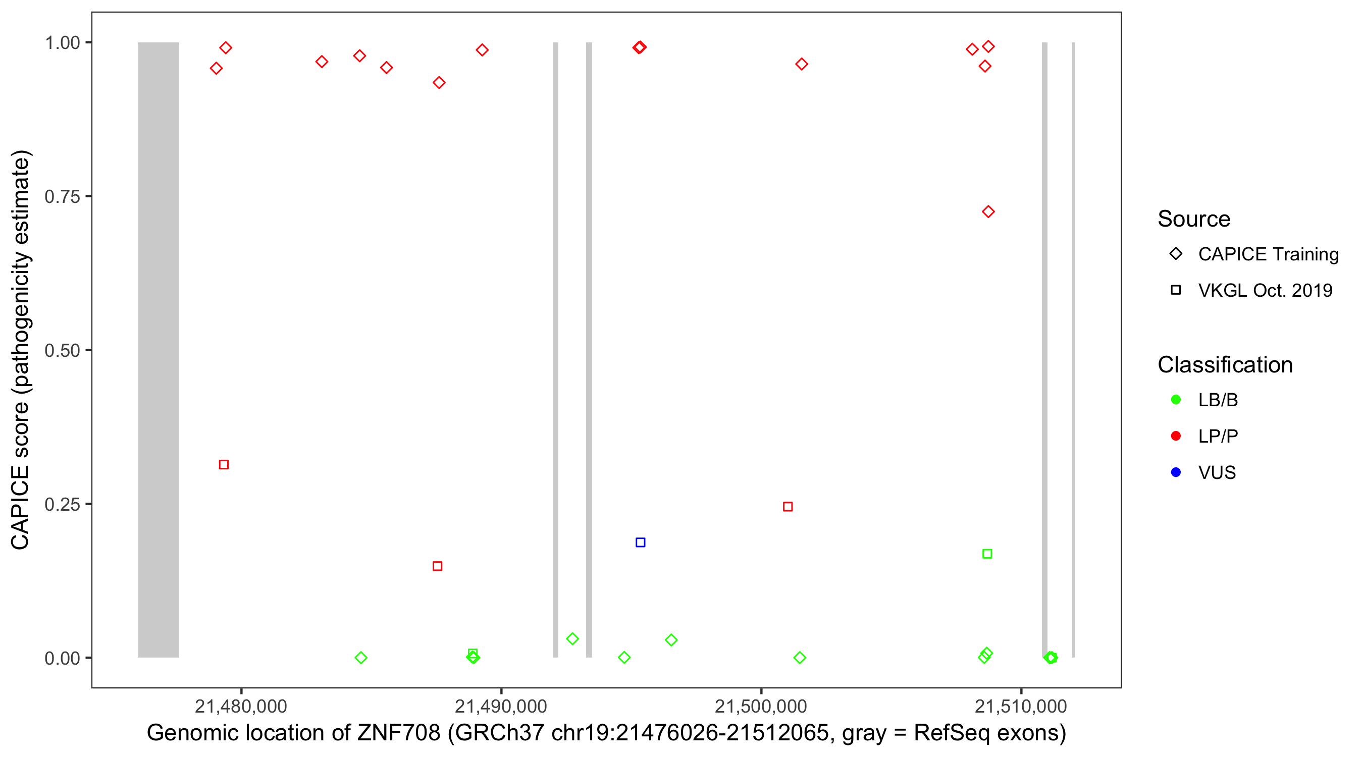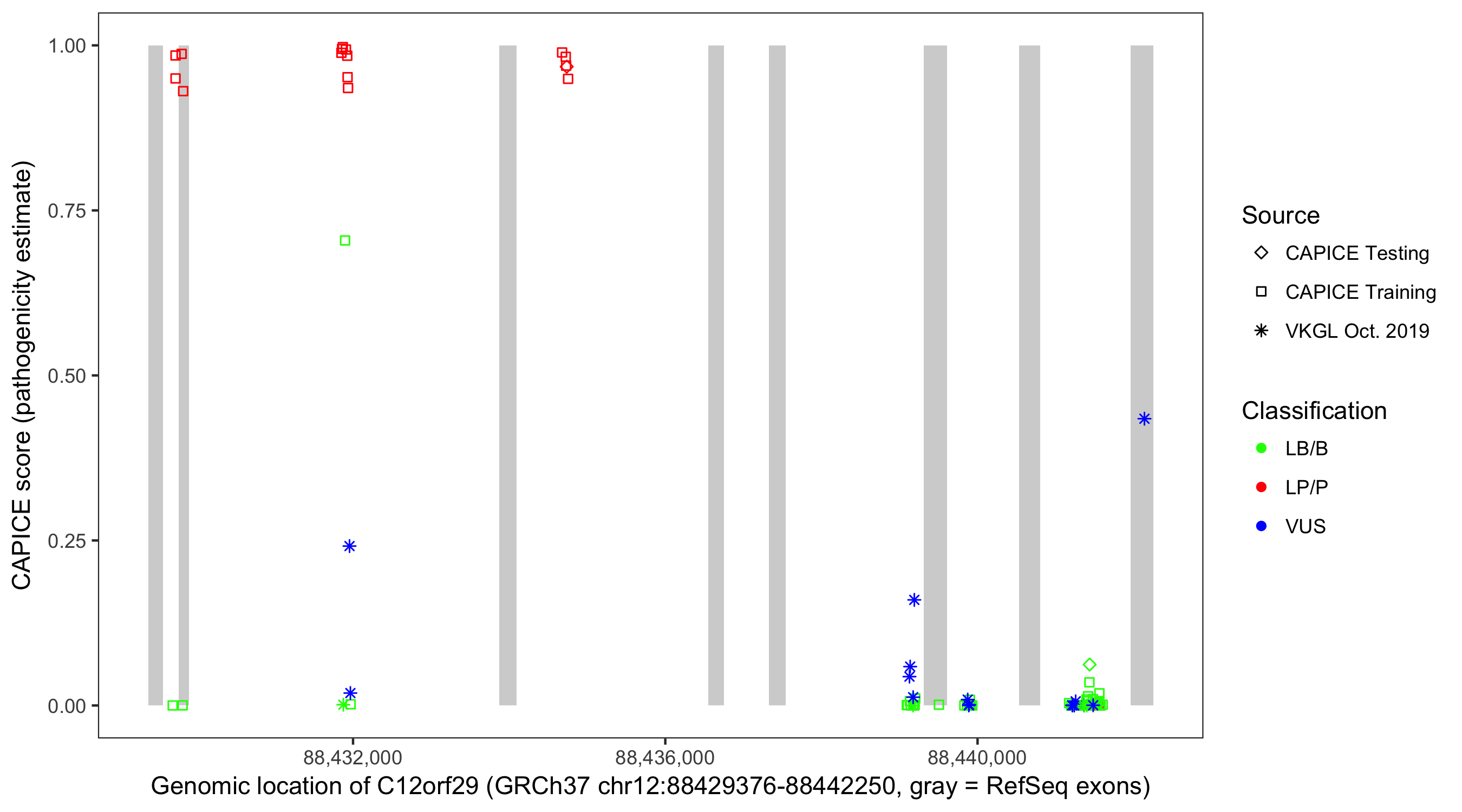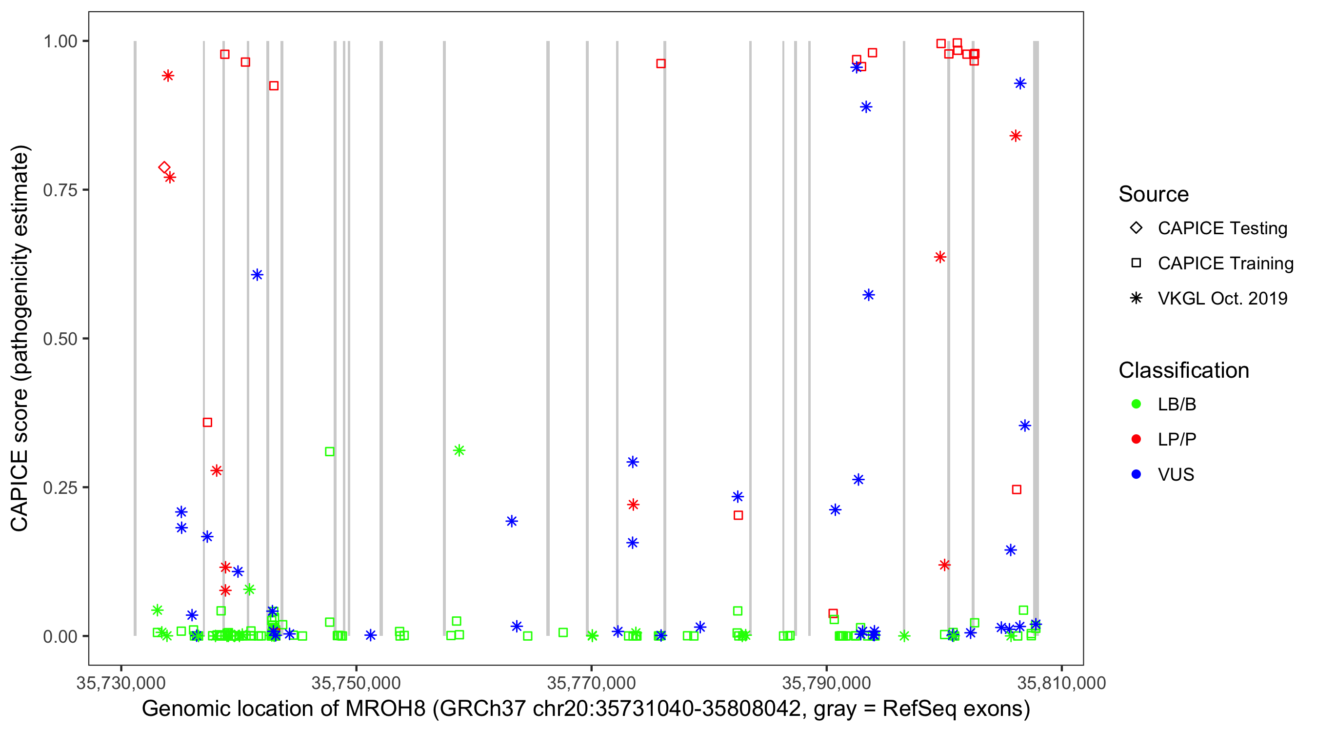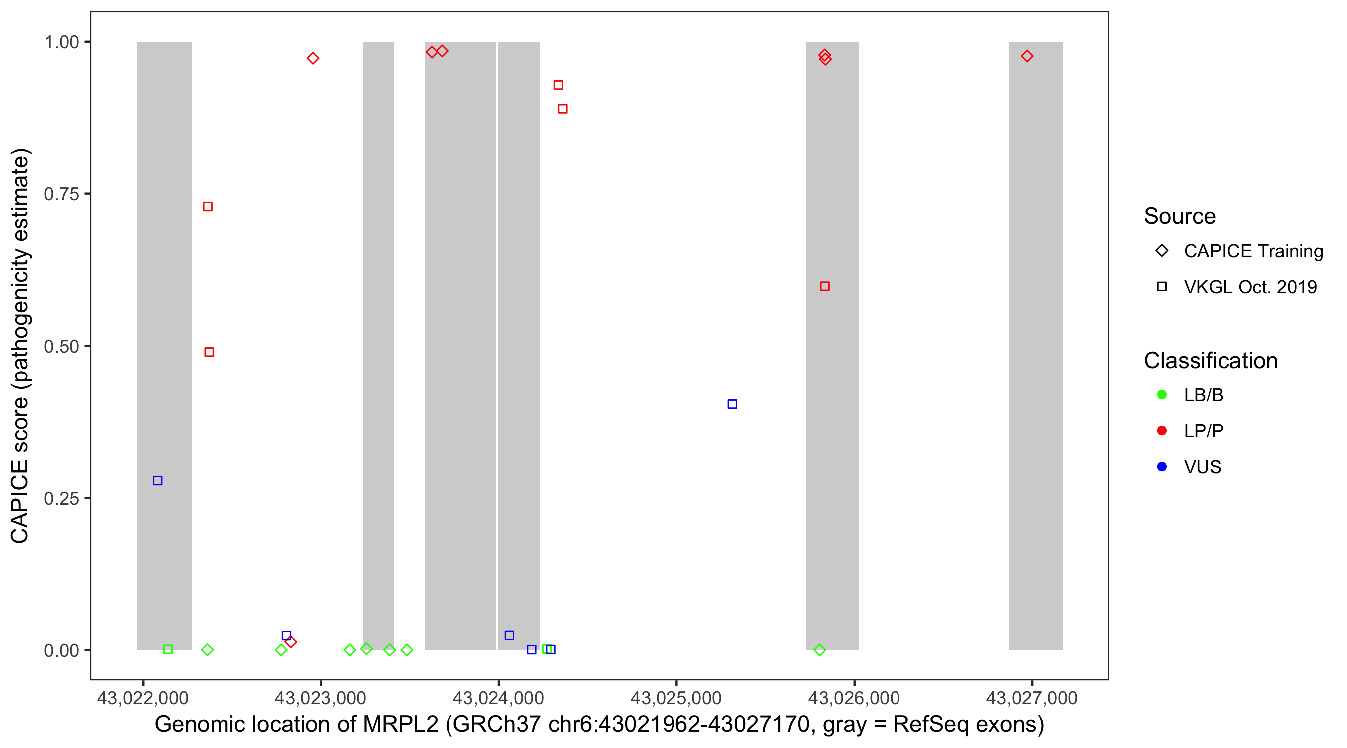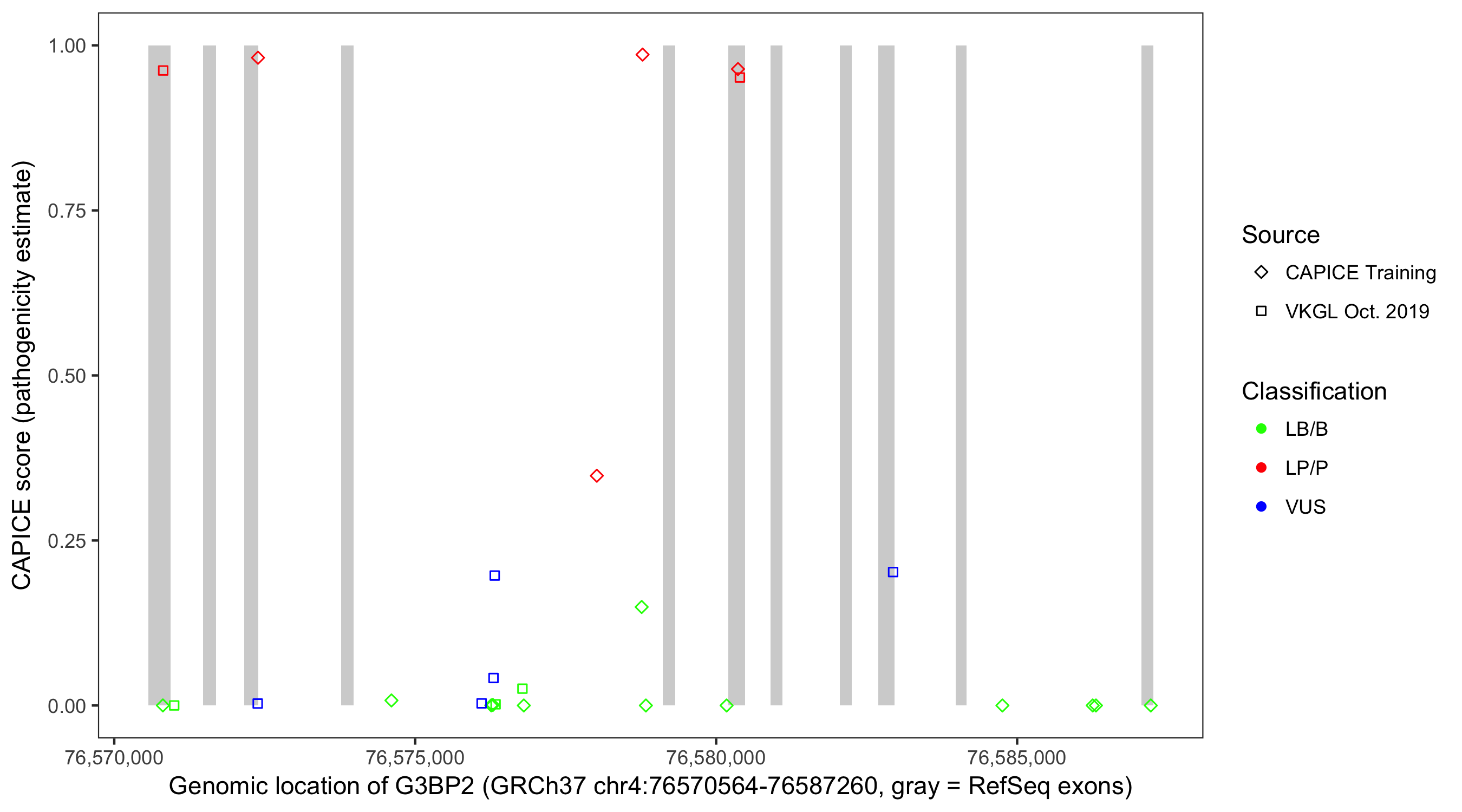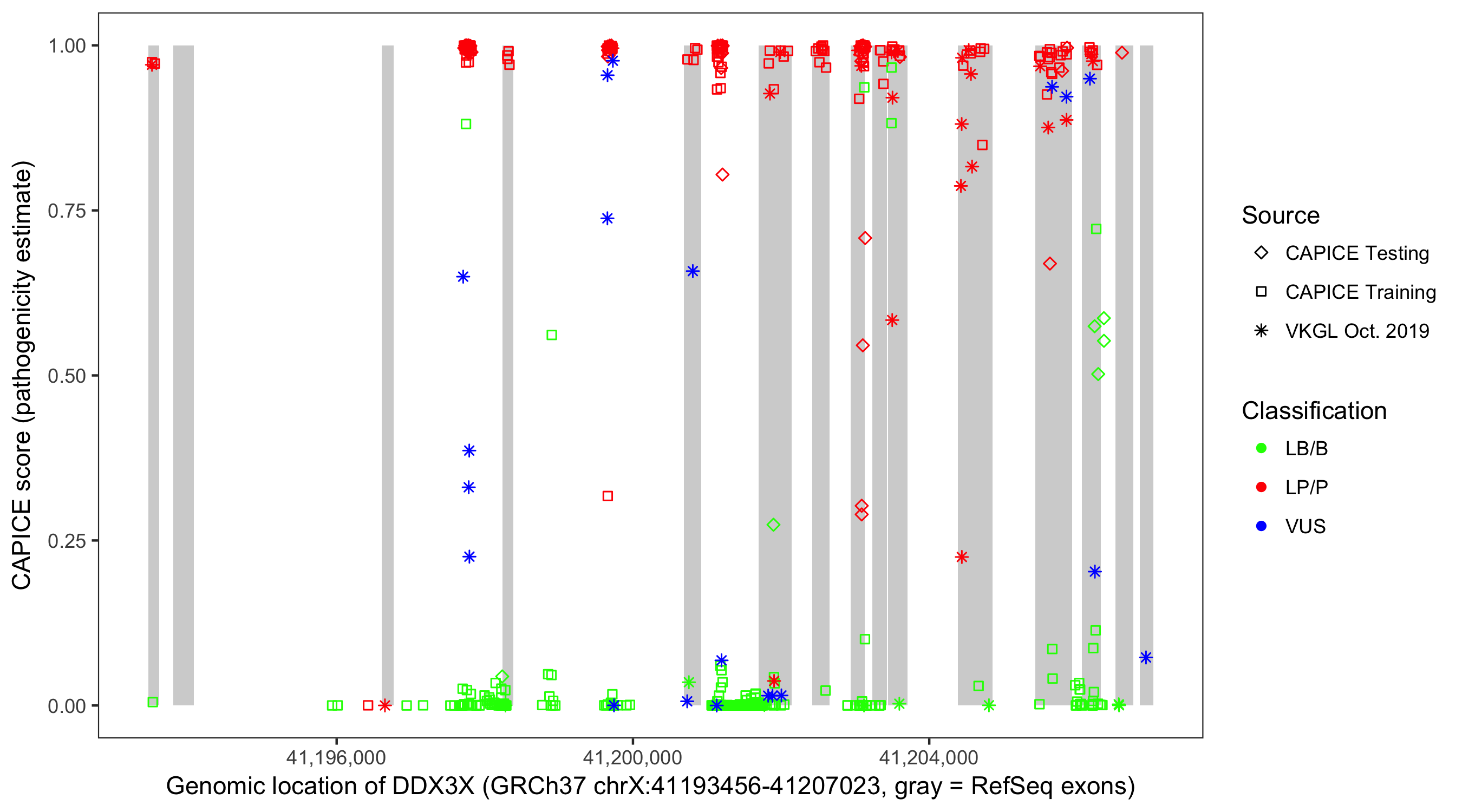 Shown are CAPICE train/test variants plus VKGL Oct 2019.