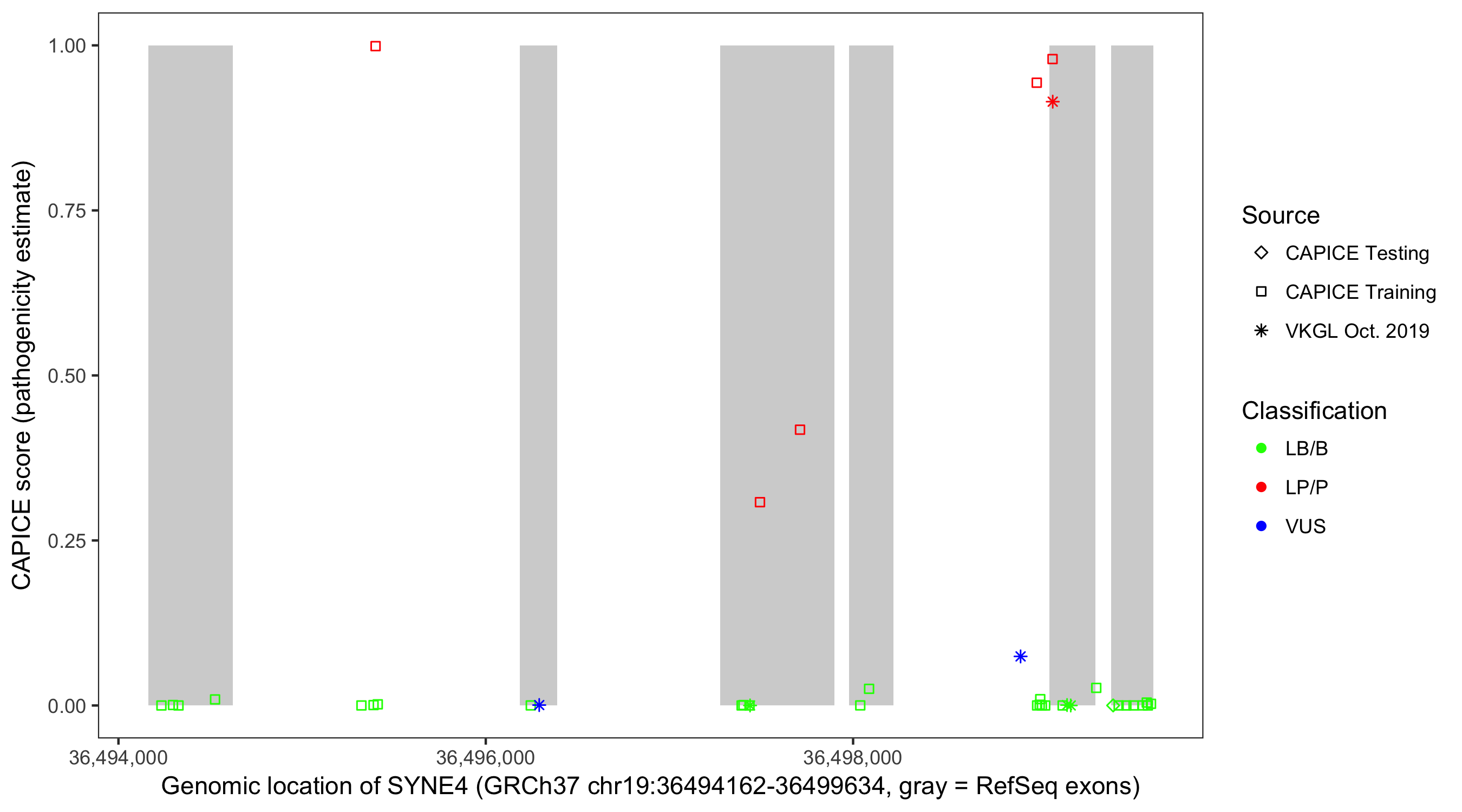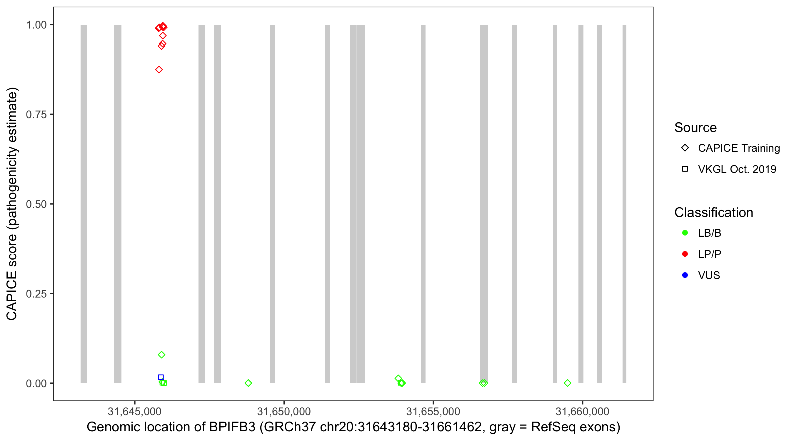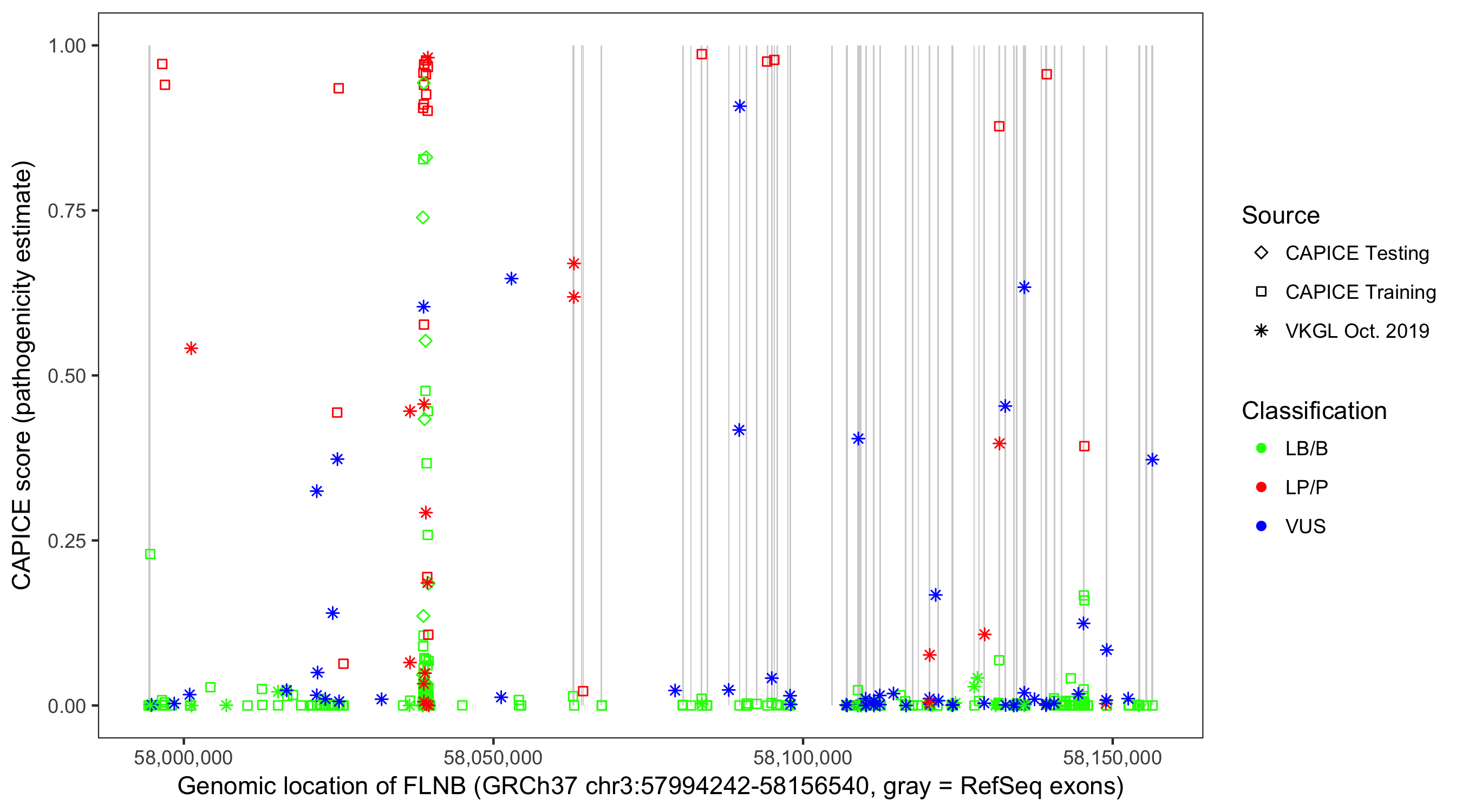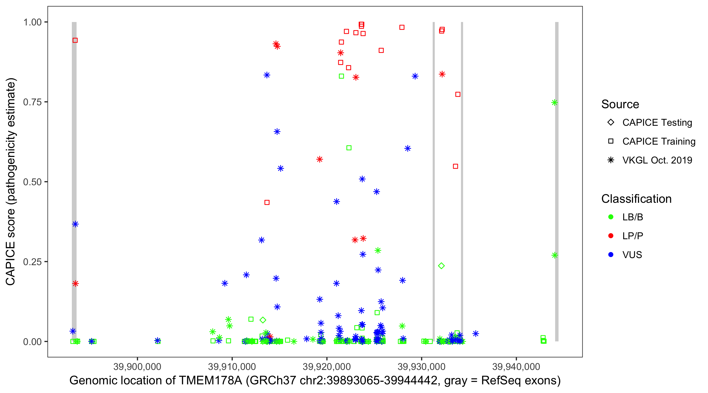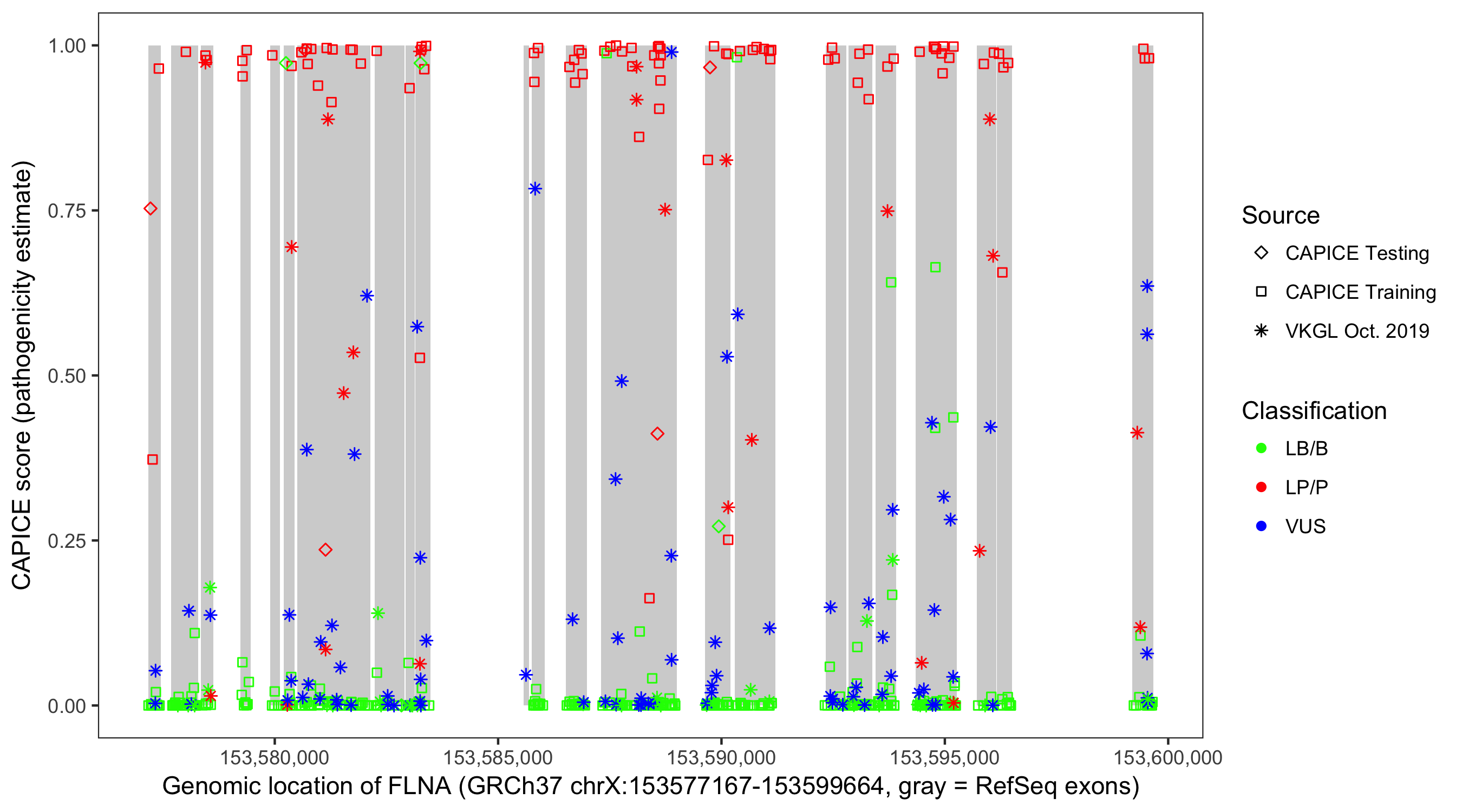 Shown are CAPICE train/test variants plus VKGL Oct 2019.