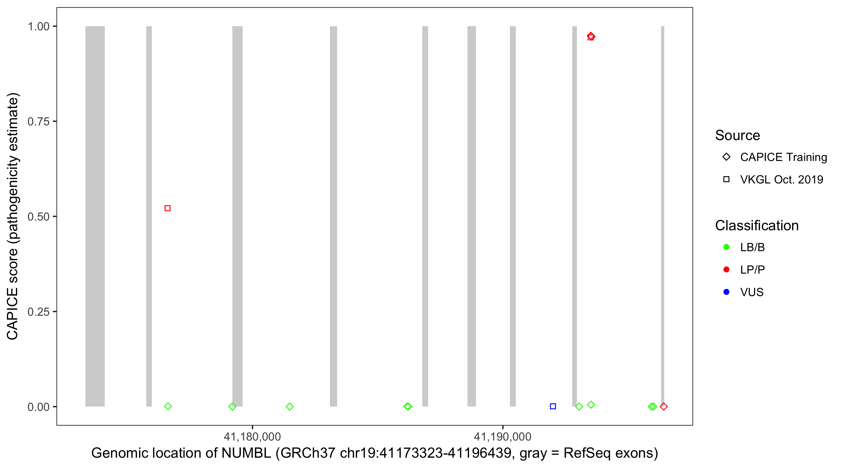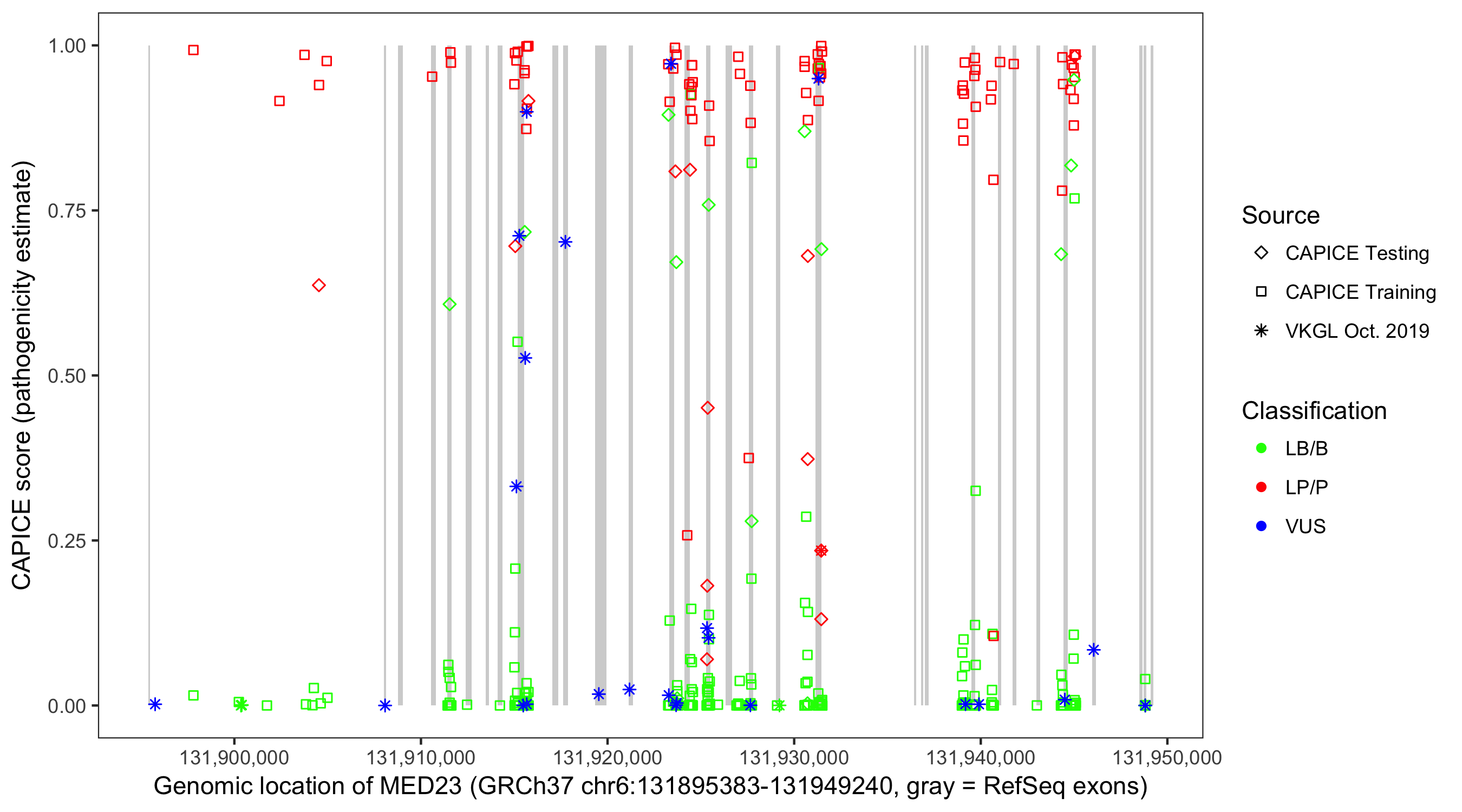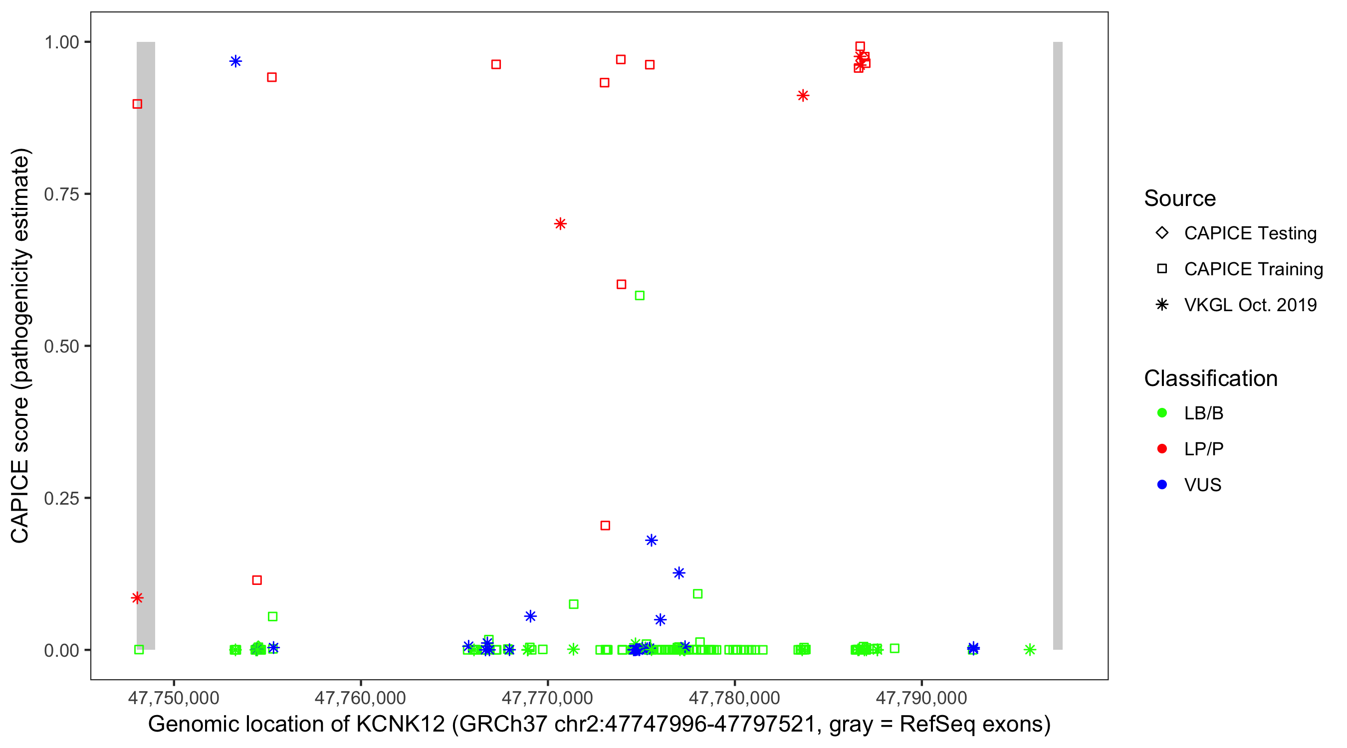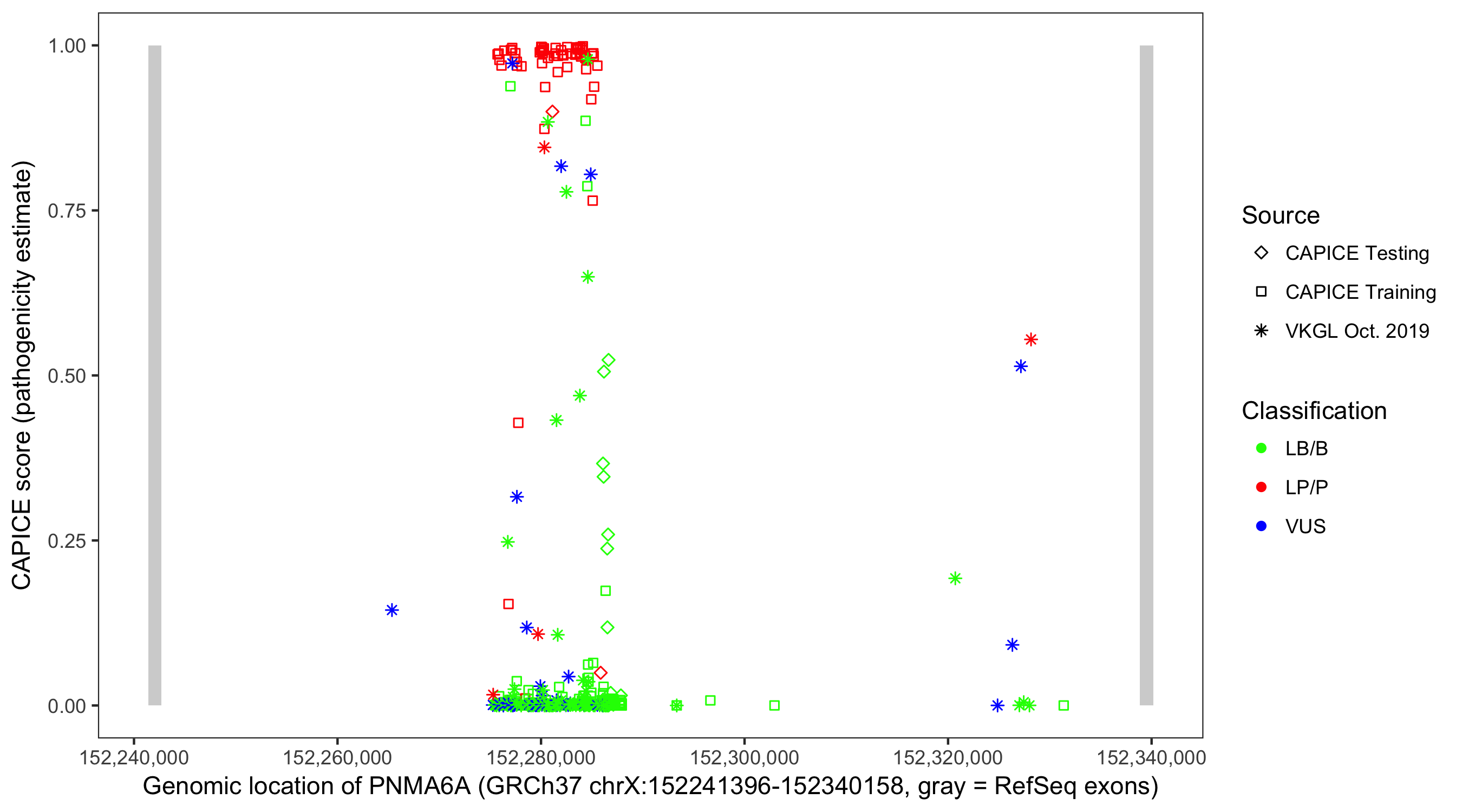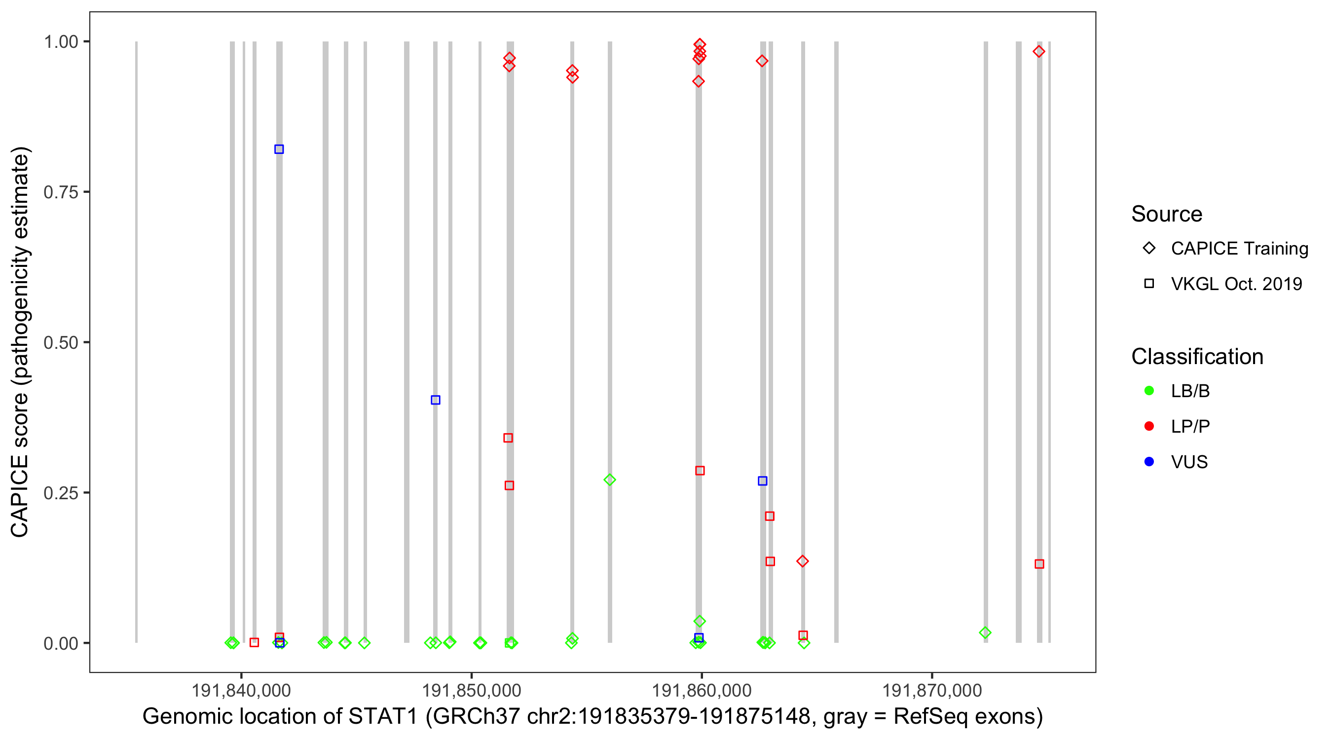 Shown are CAPICE train/test variants plus VKGL Oct 2019.