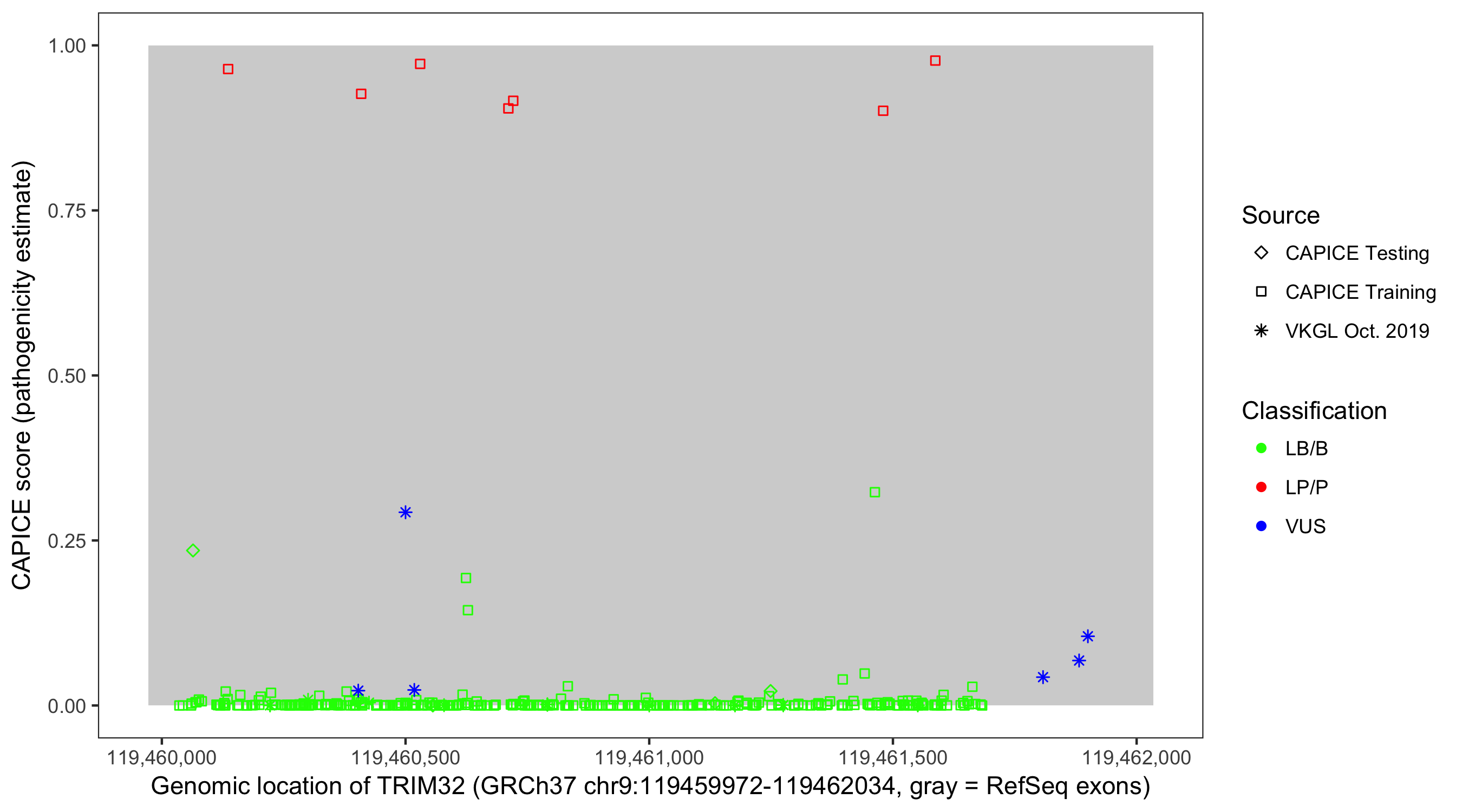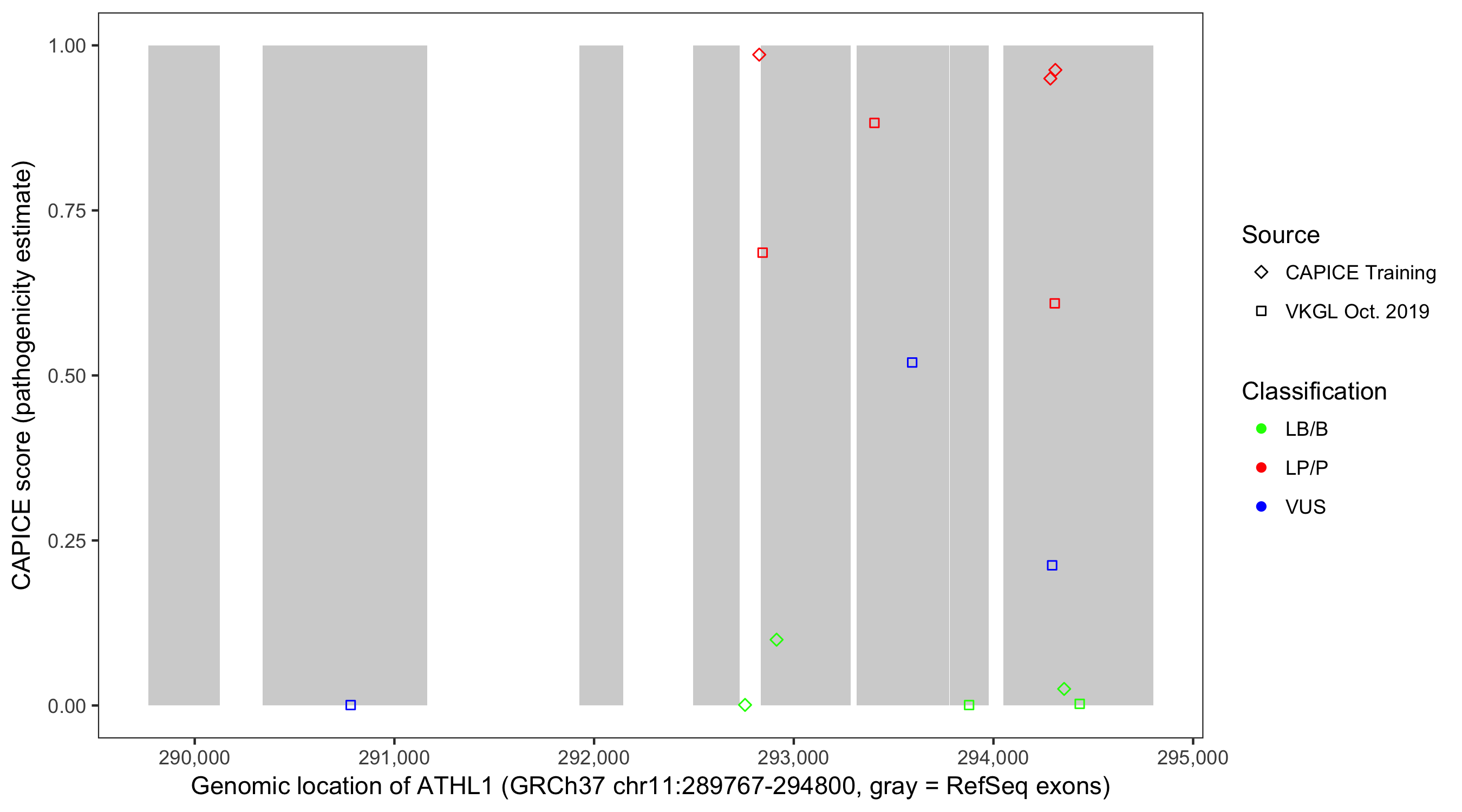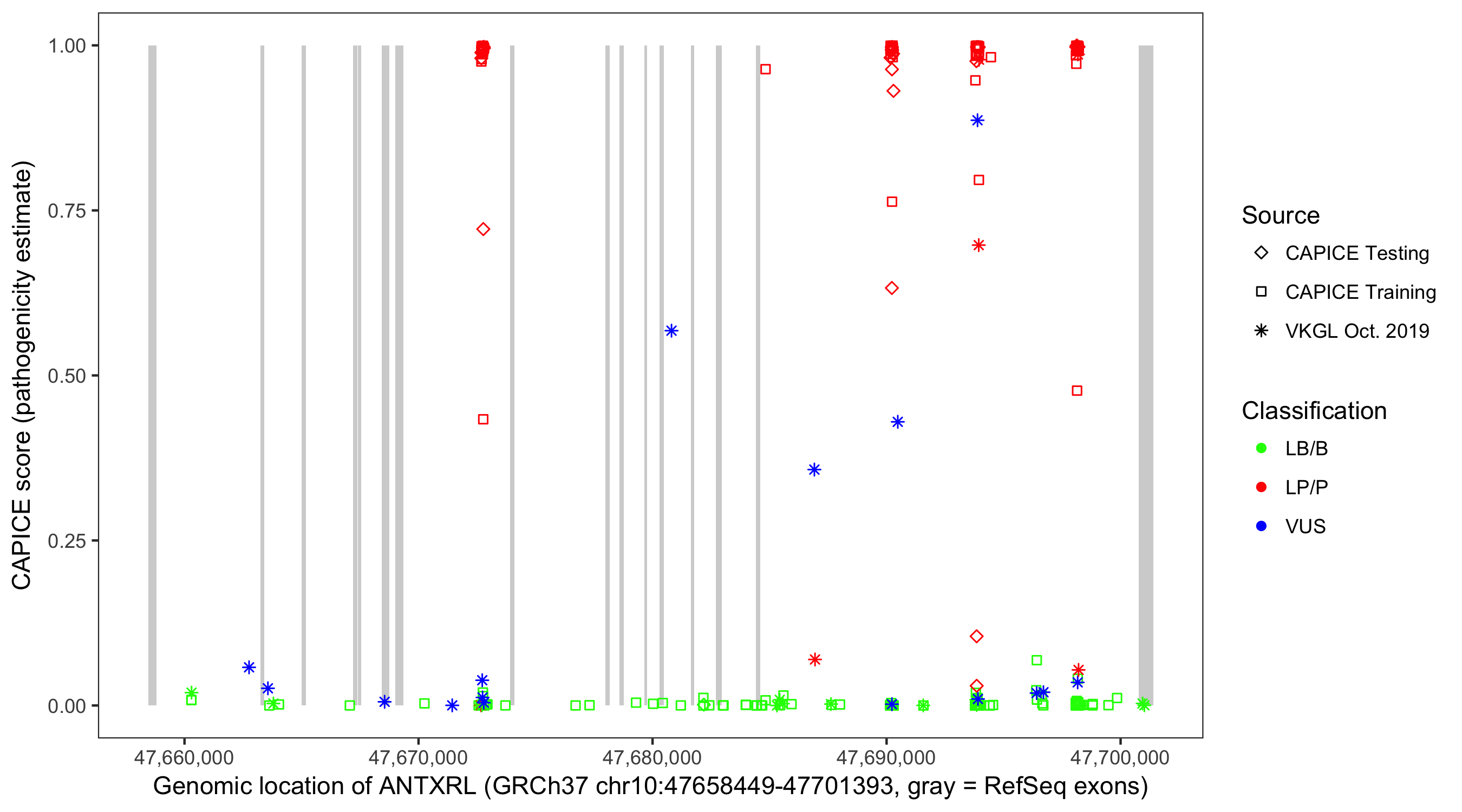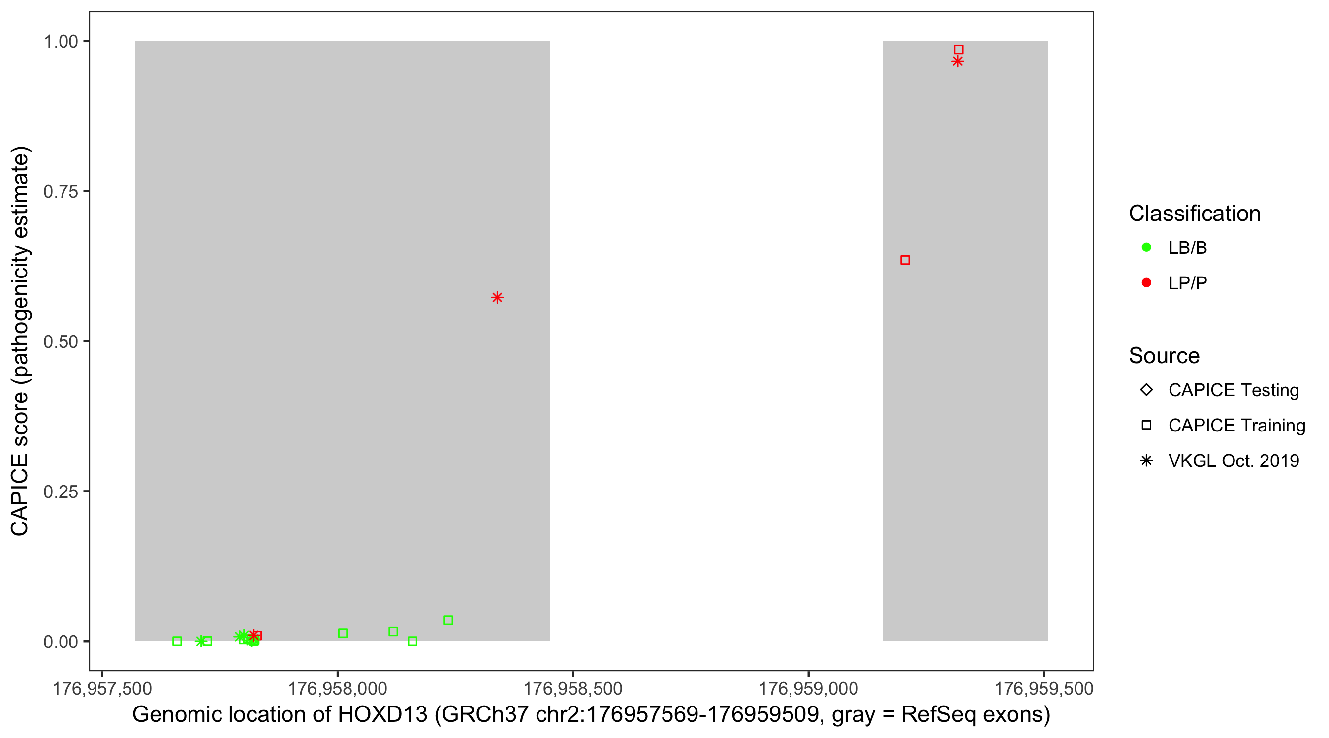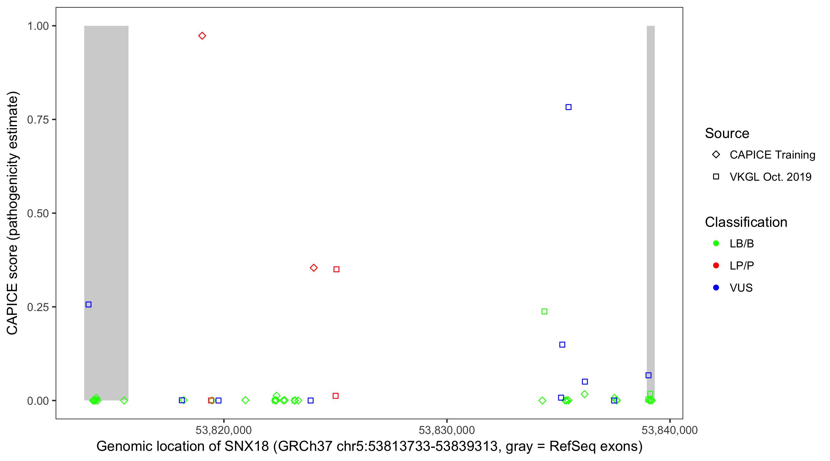 Shown are CAPICE train/test variants plus VKGL Oct 2019.
