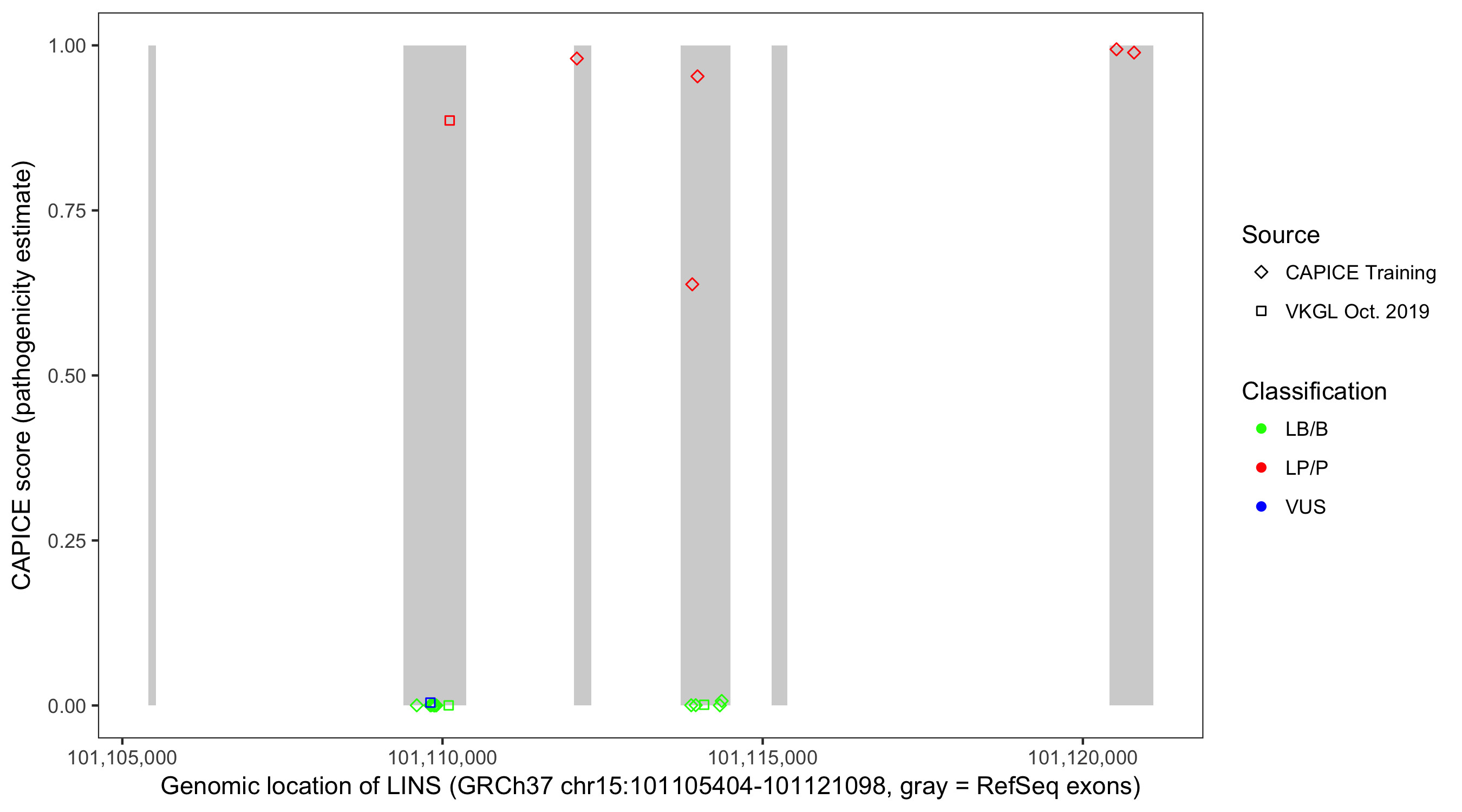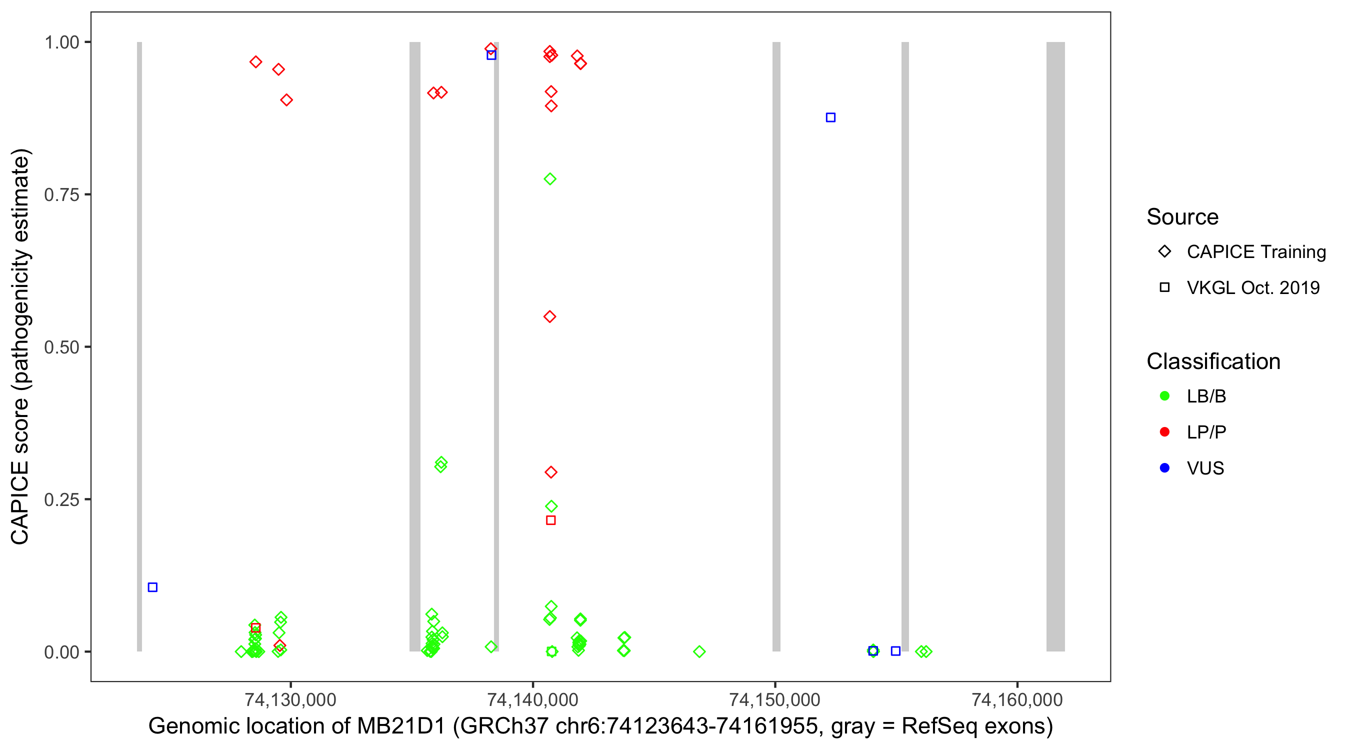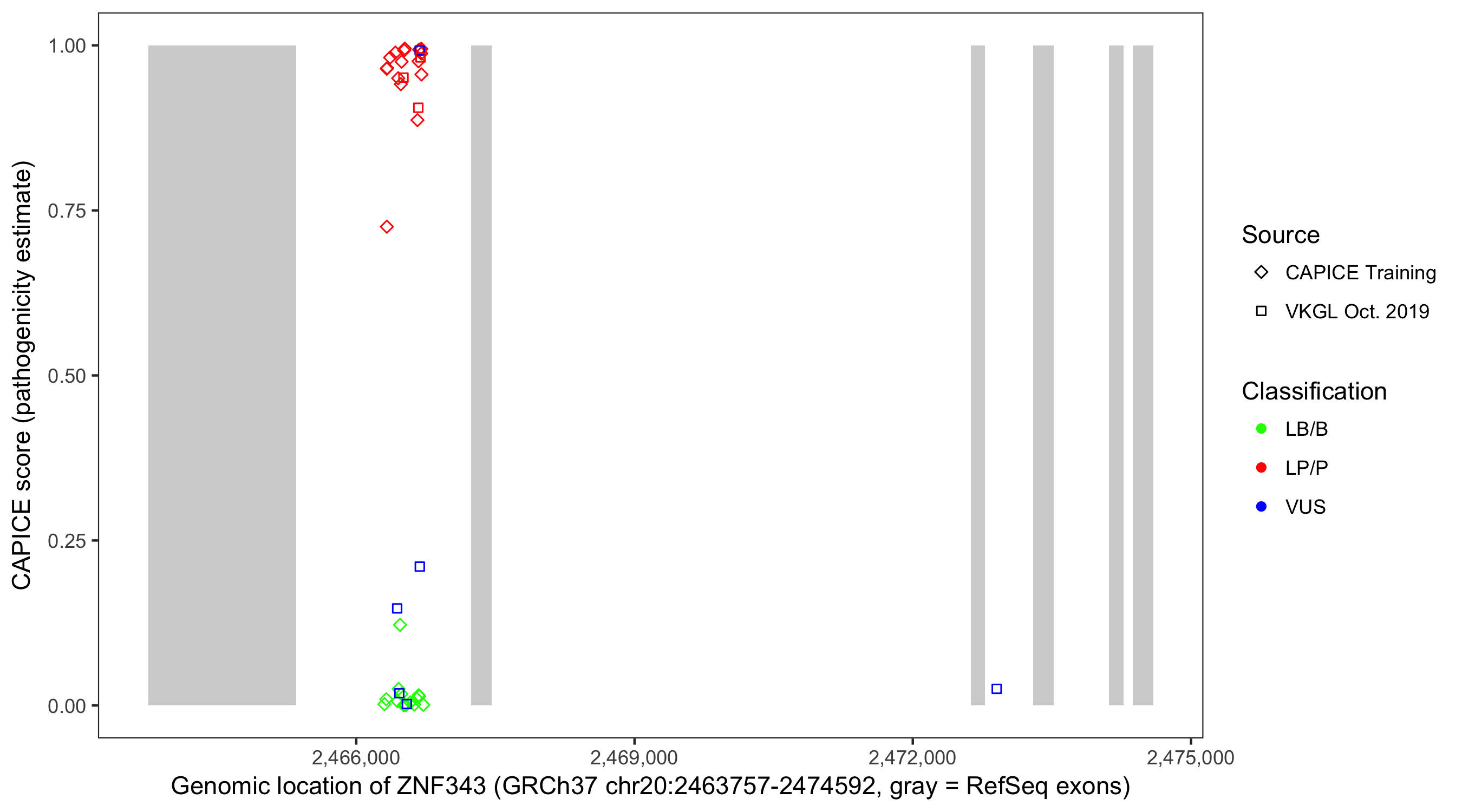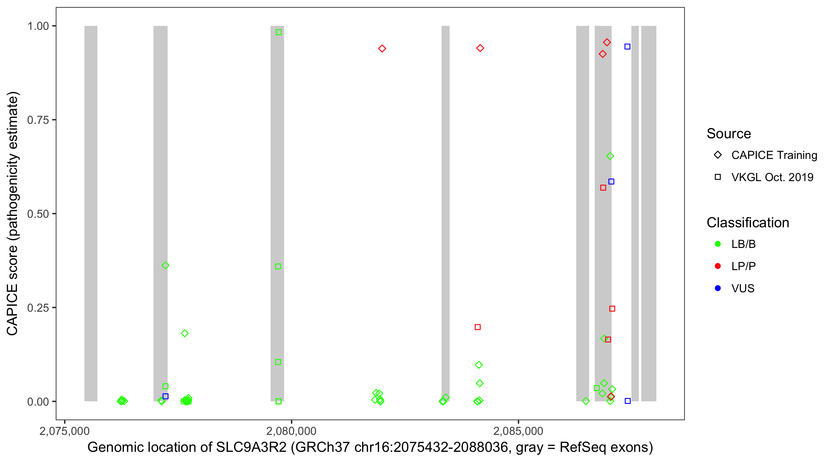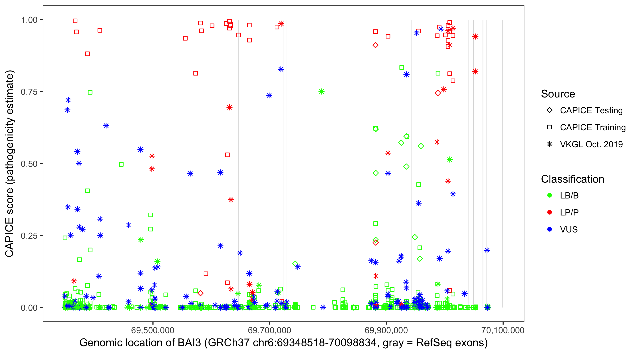 Shown are CAPICE train/test variants plus VKGL Oct 2019.